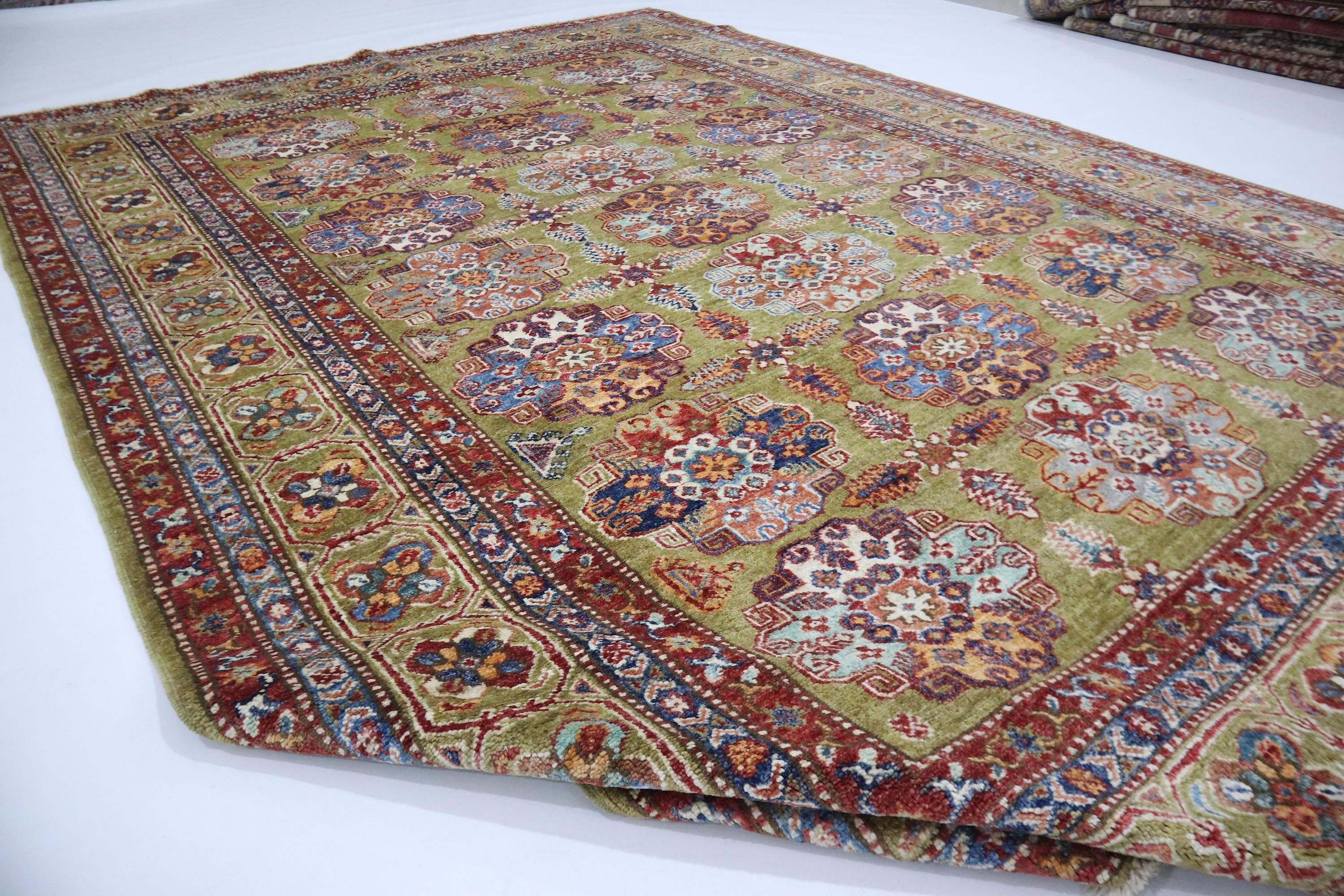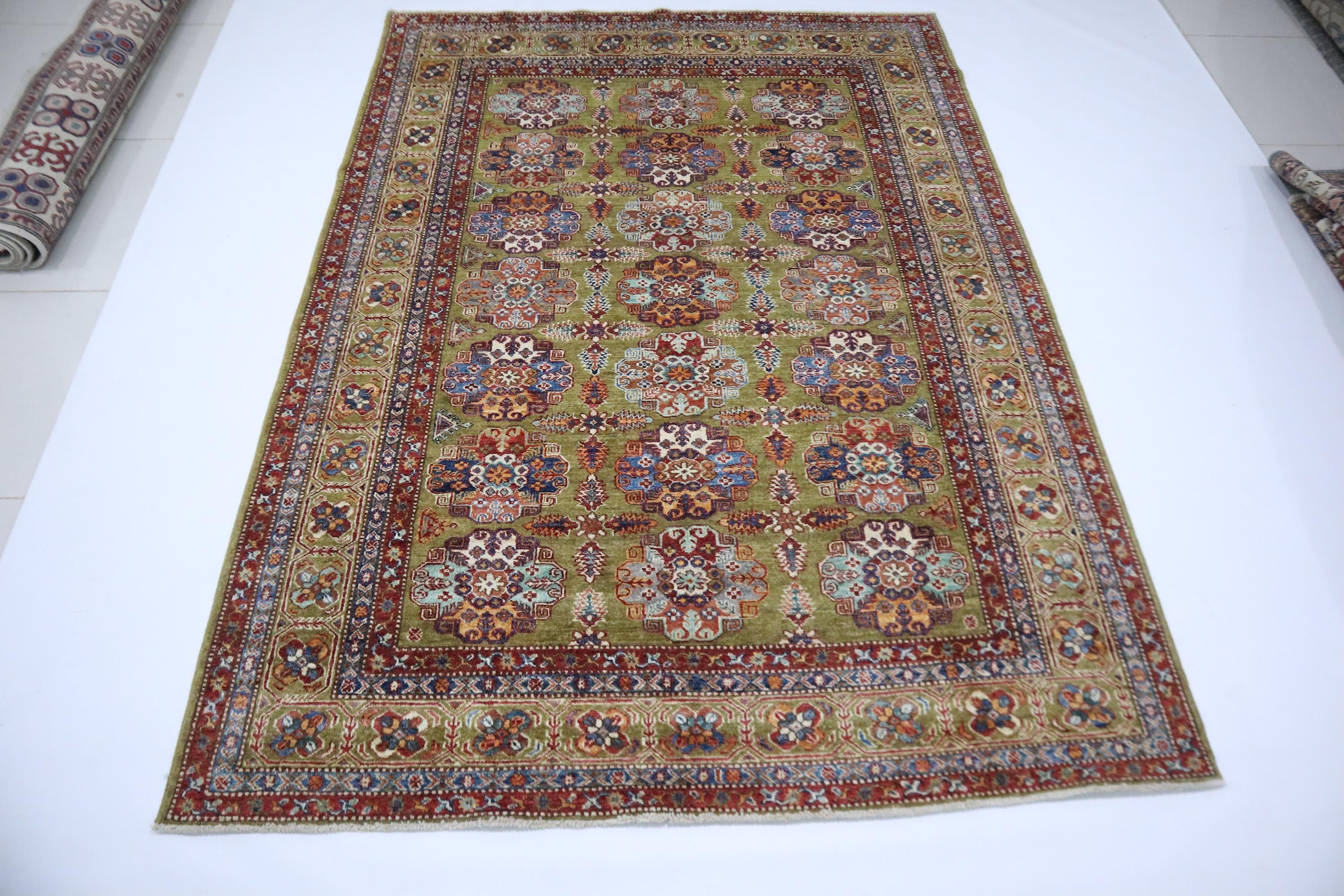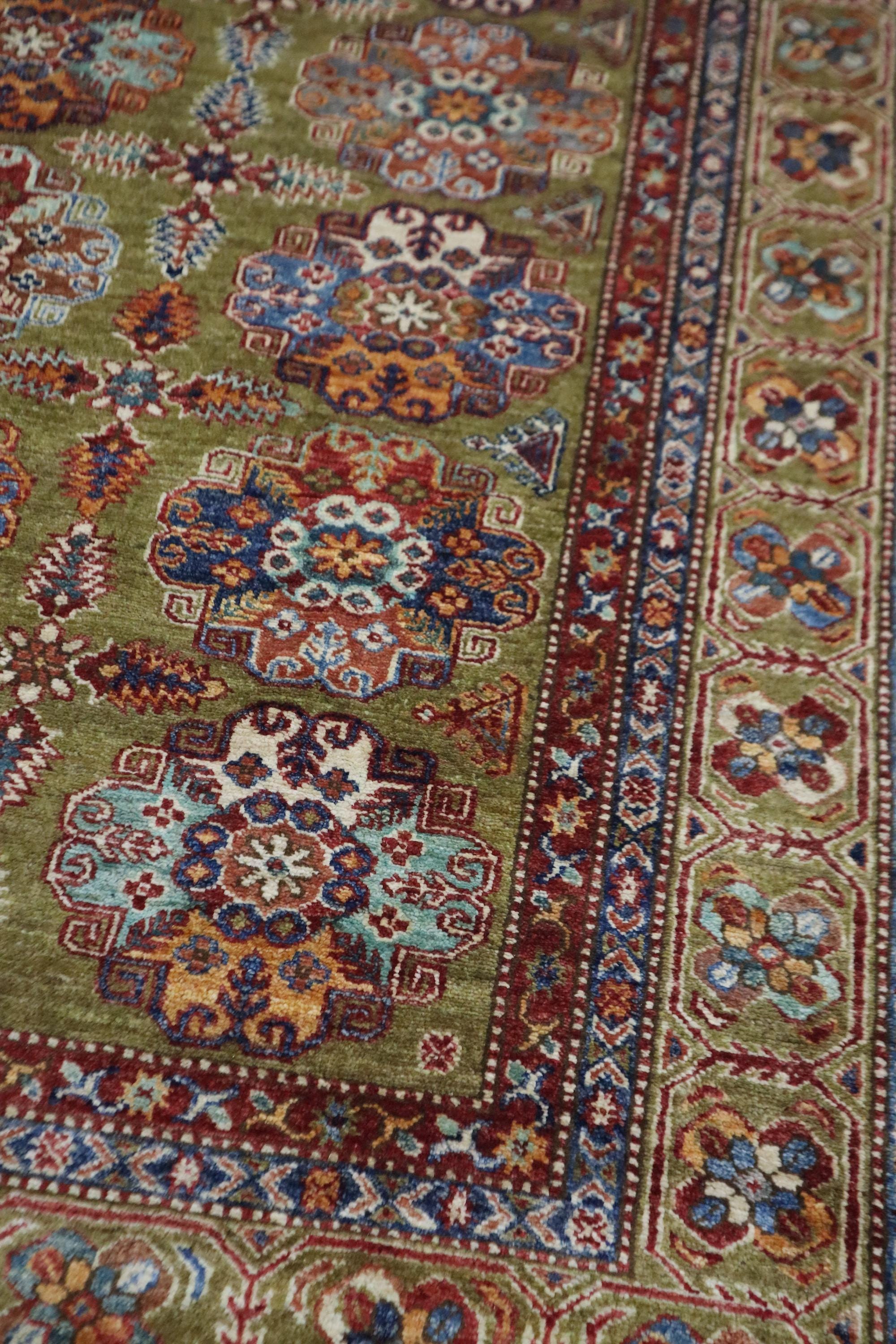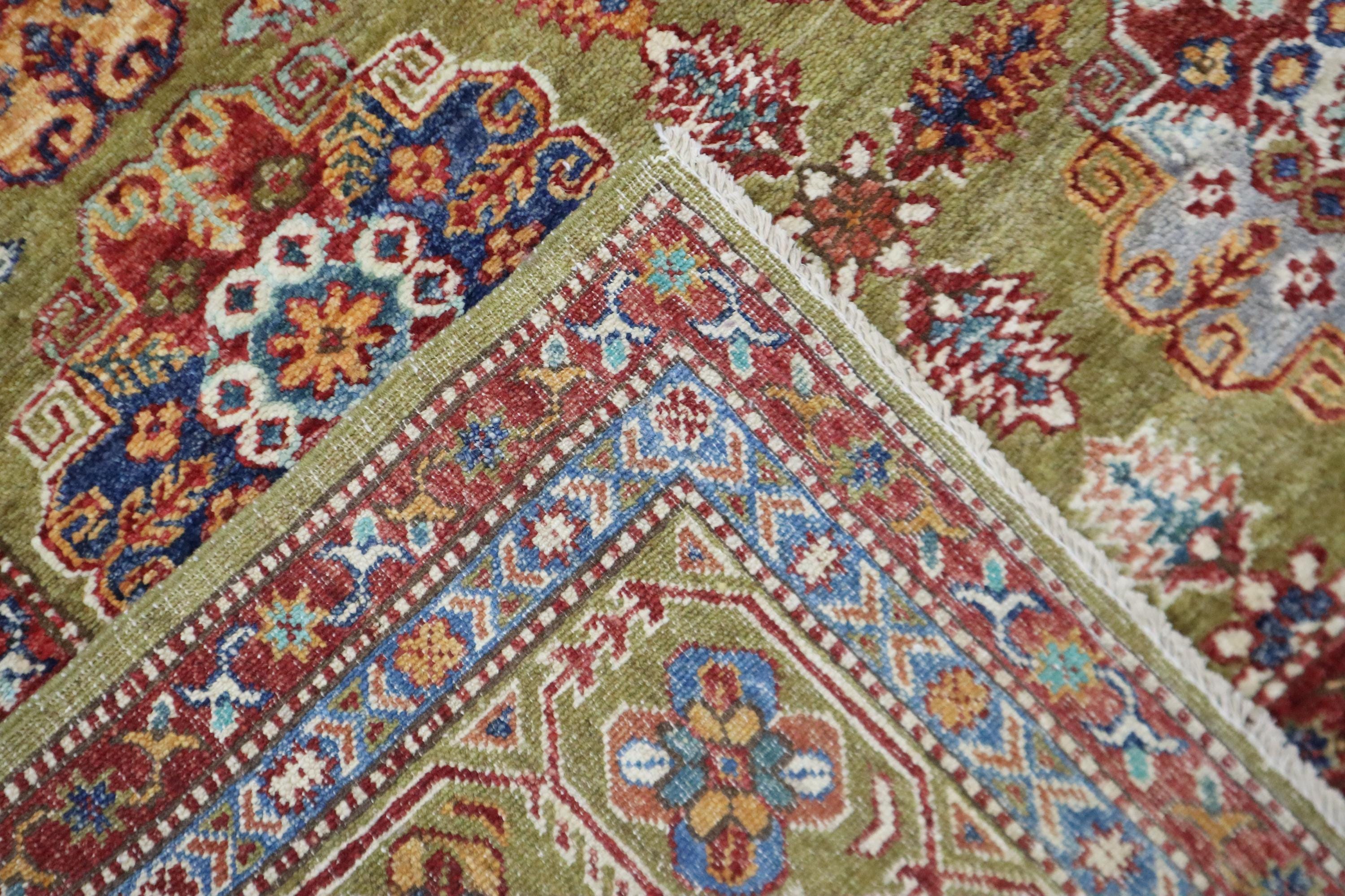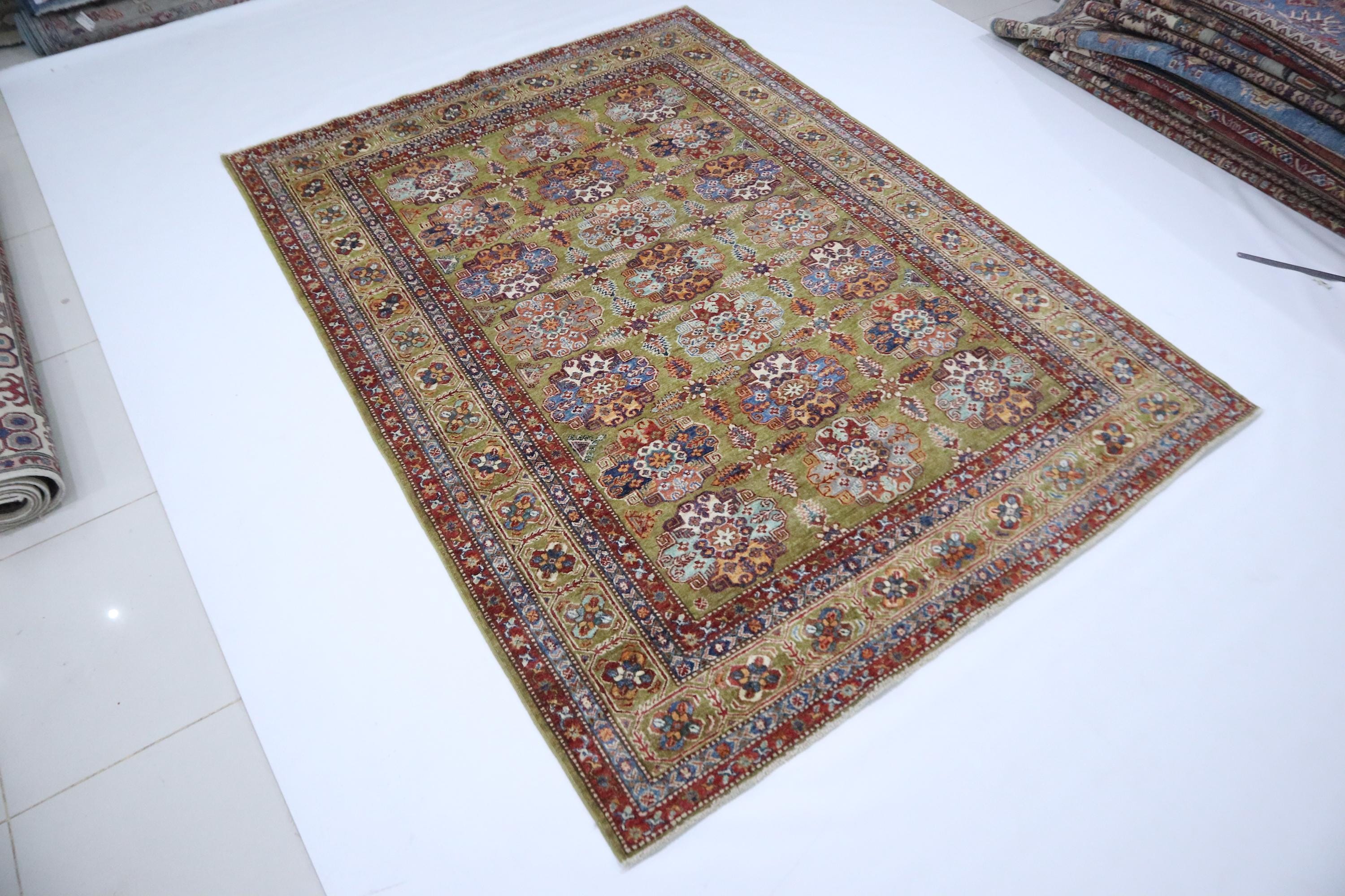 6x9 Feet Kazak Area Rug - Green Afghan Hand Knotted Geometric Organic Dye Wool Rug - Traditional Rug - Bedroom Rug - Living Room Rug
