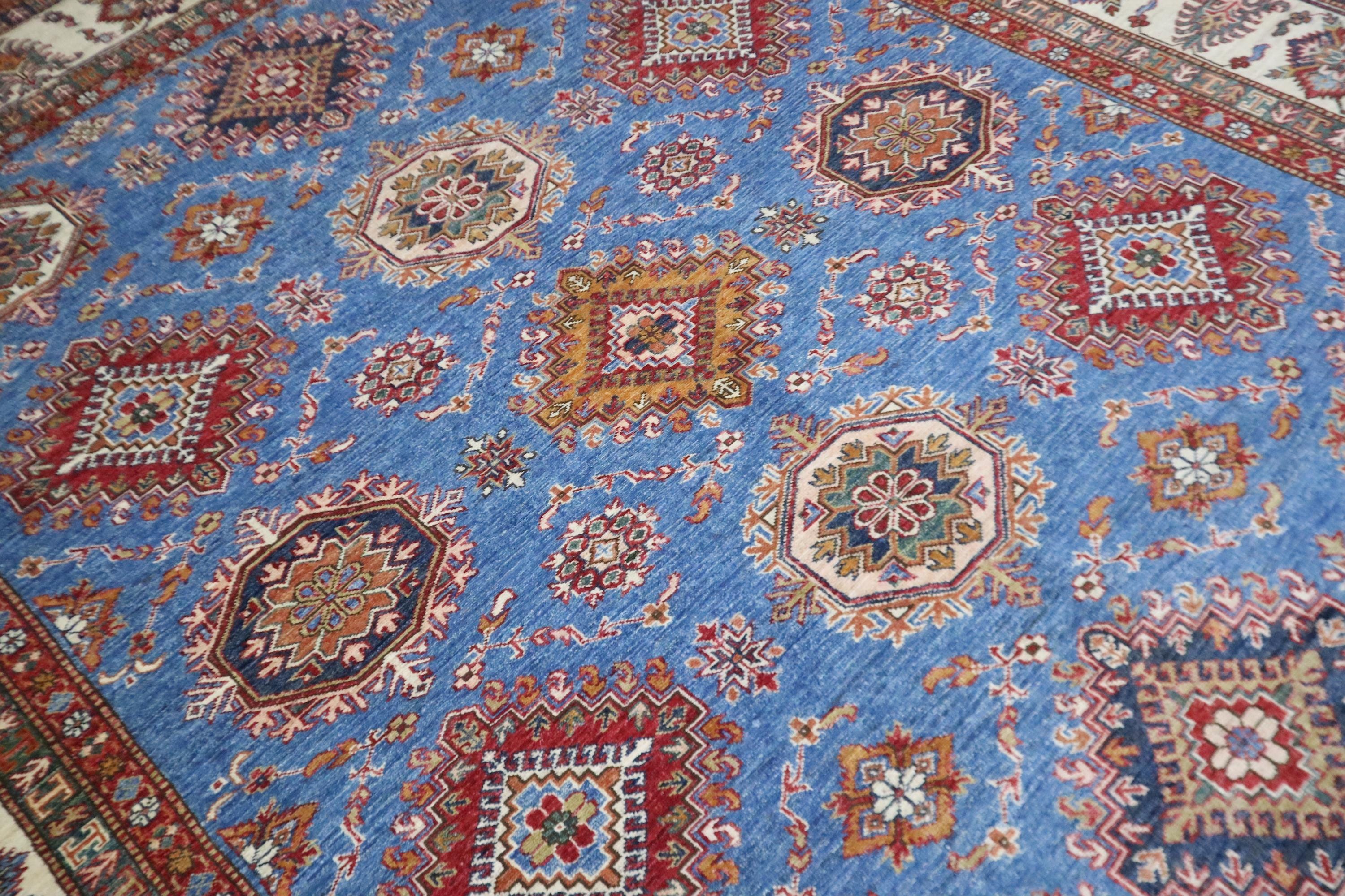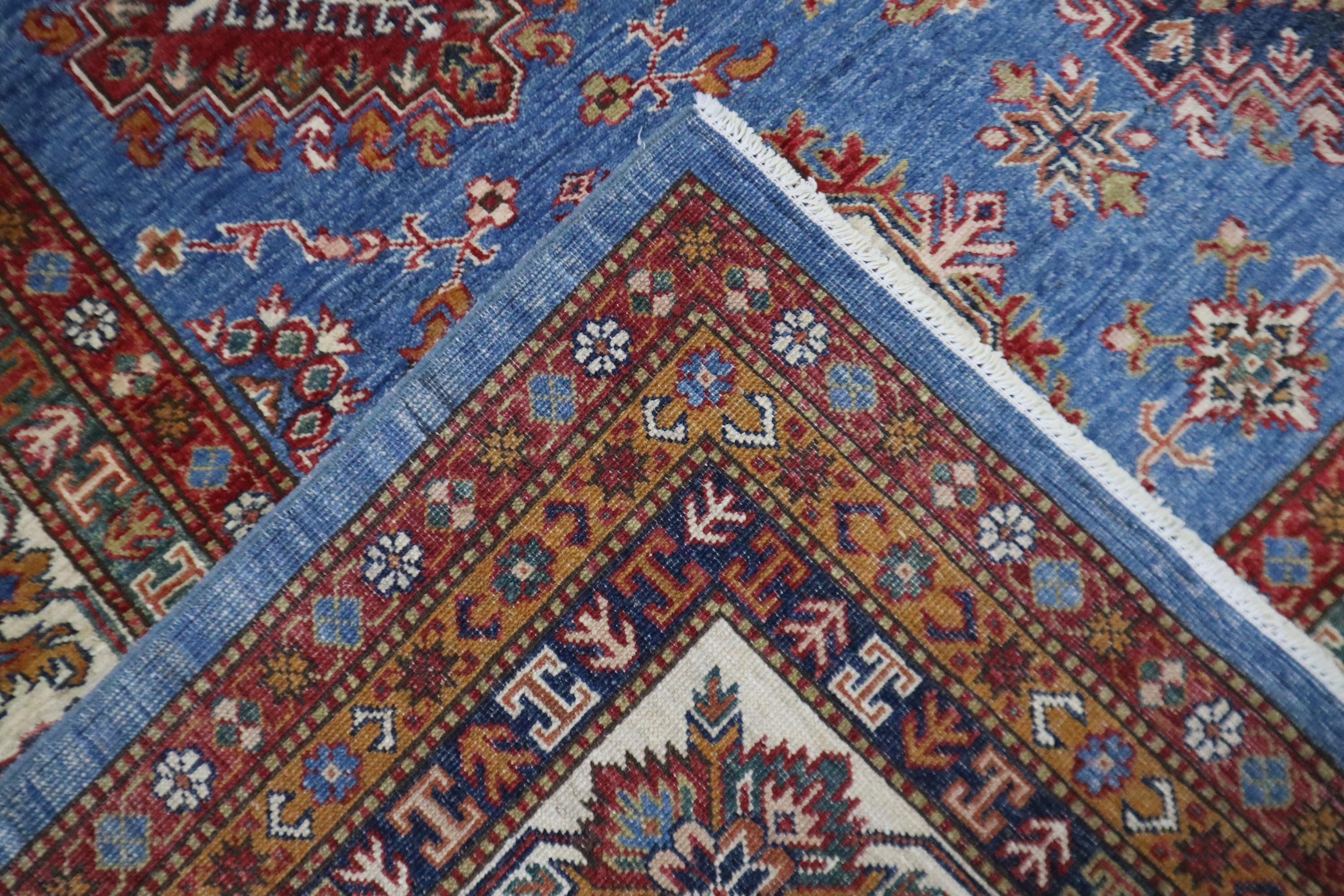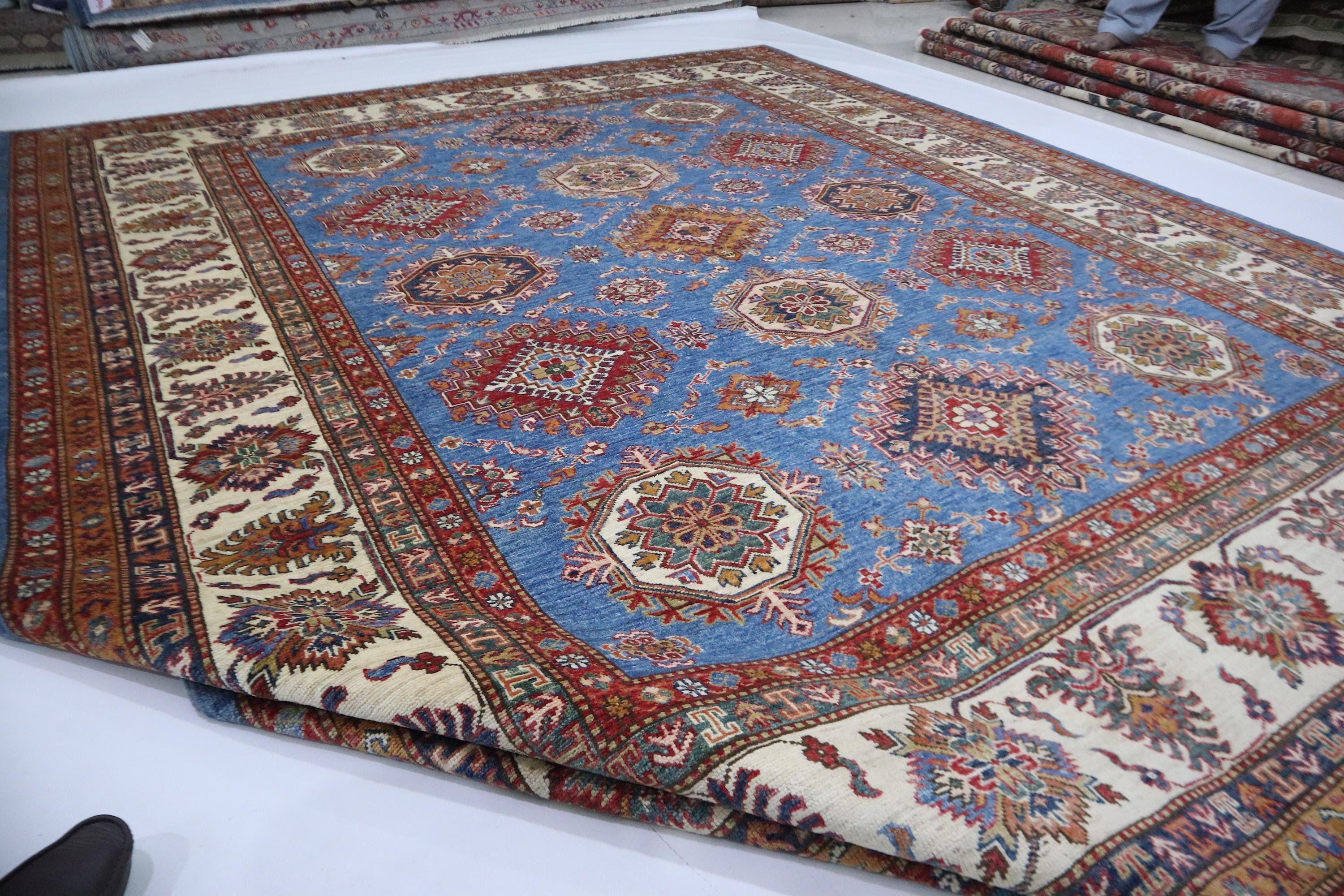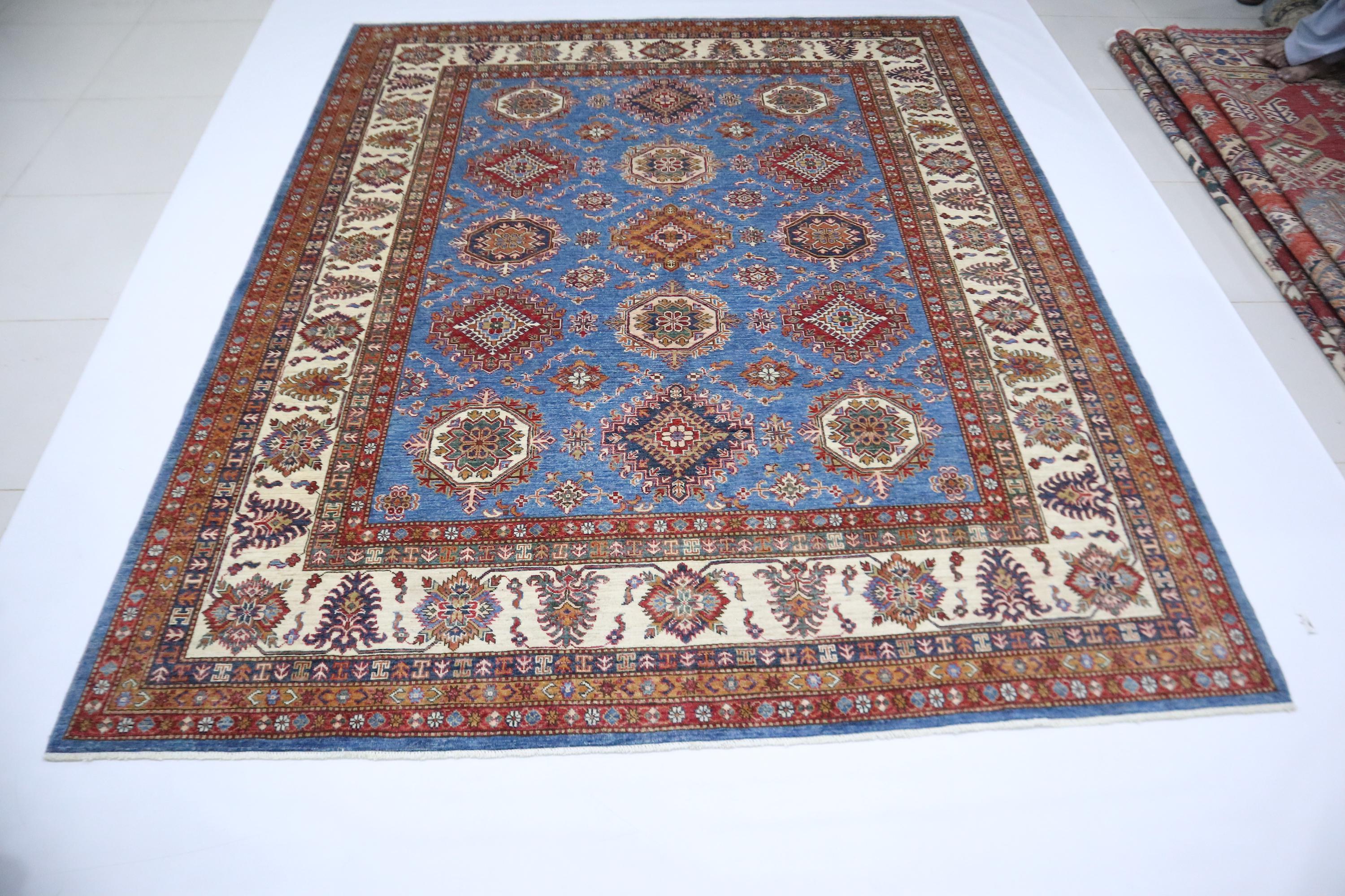 8x10 Kazak Area Rug - Blue Afghan Handmade Geometric Veg Dye Wool Rug - Traditional Rug - Bedroom Rug - Living Room Rug - Dining Room Rug
