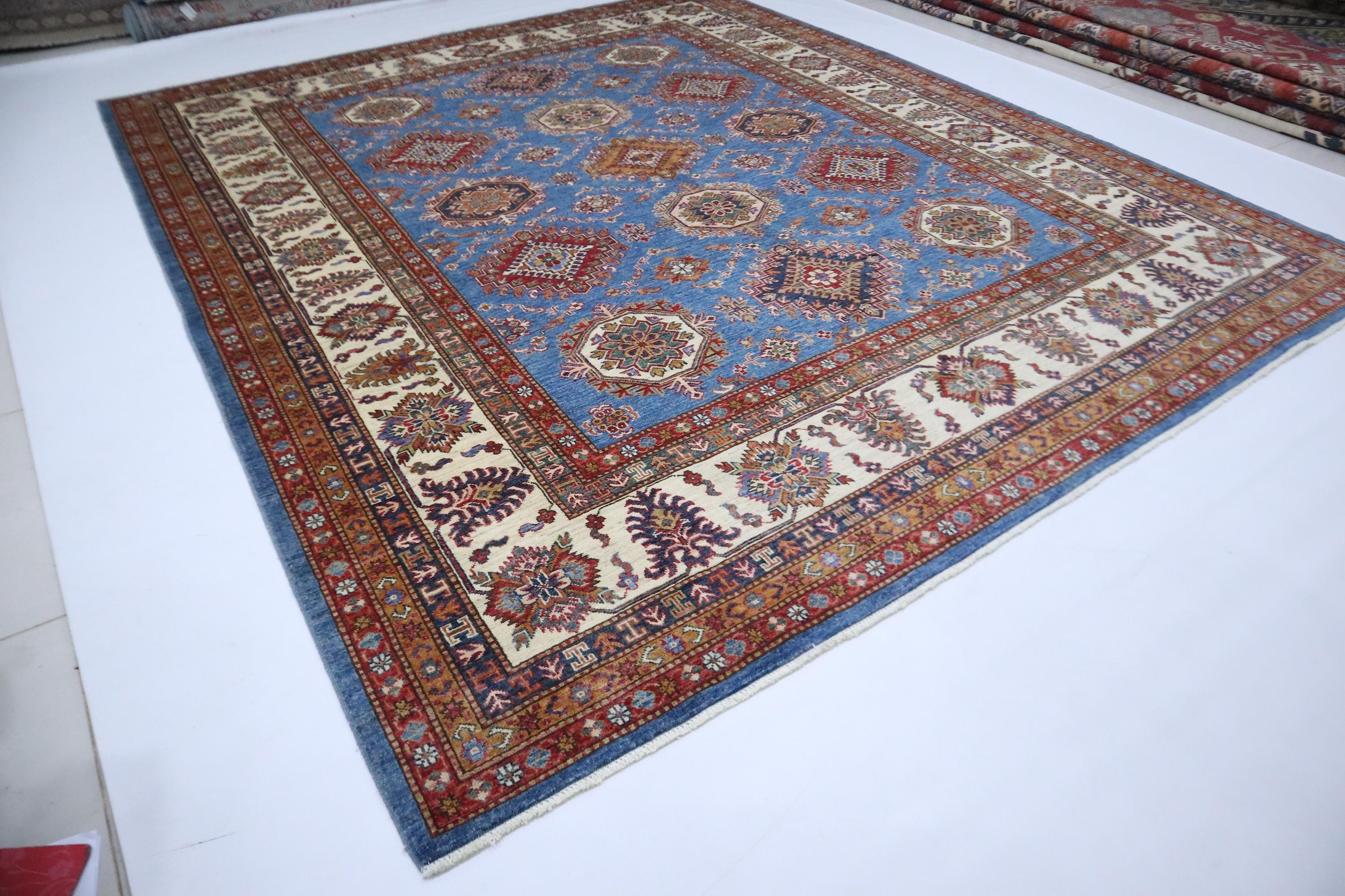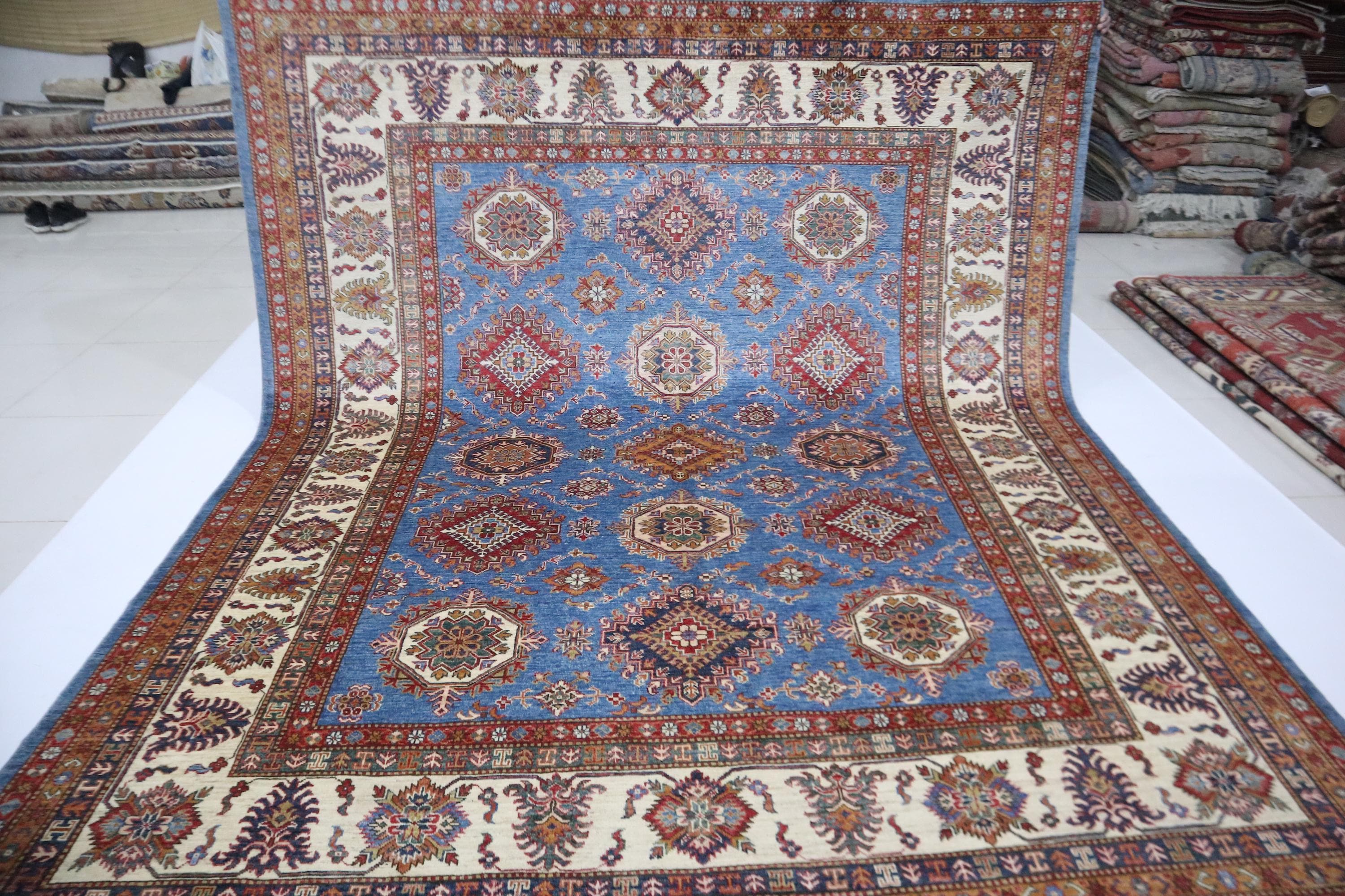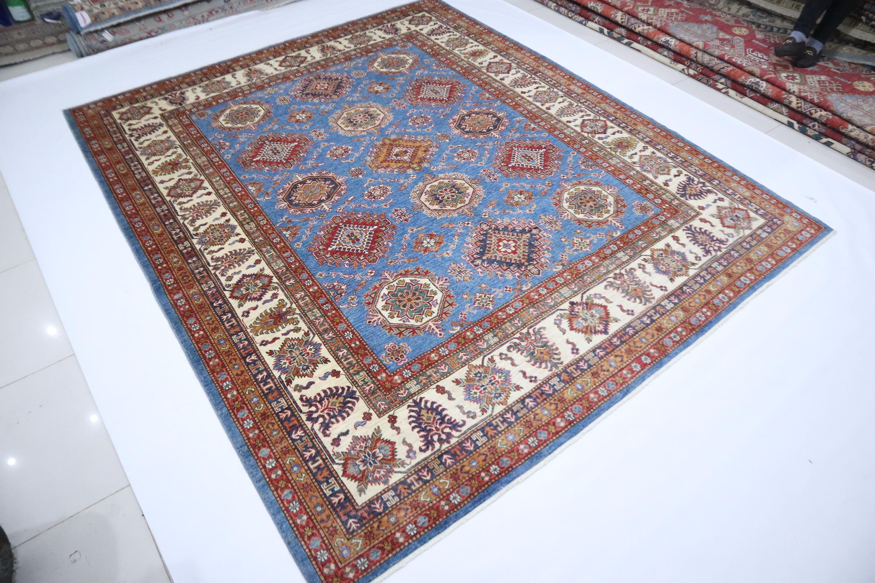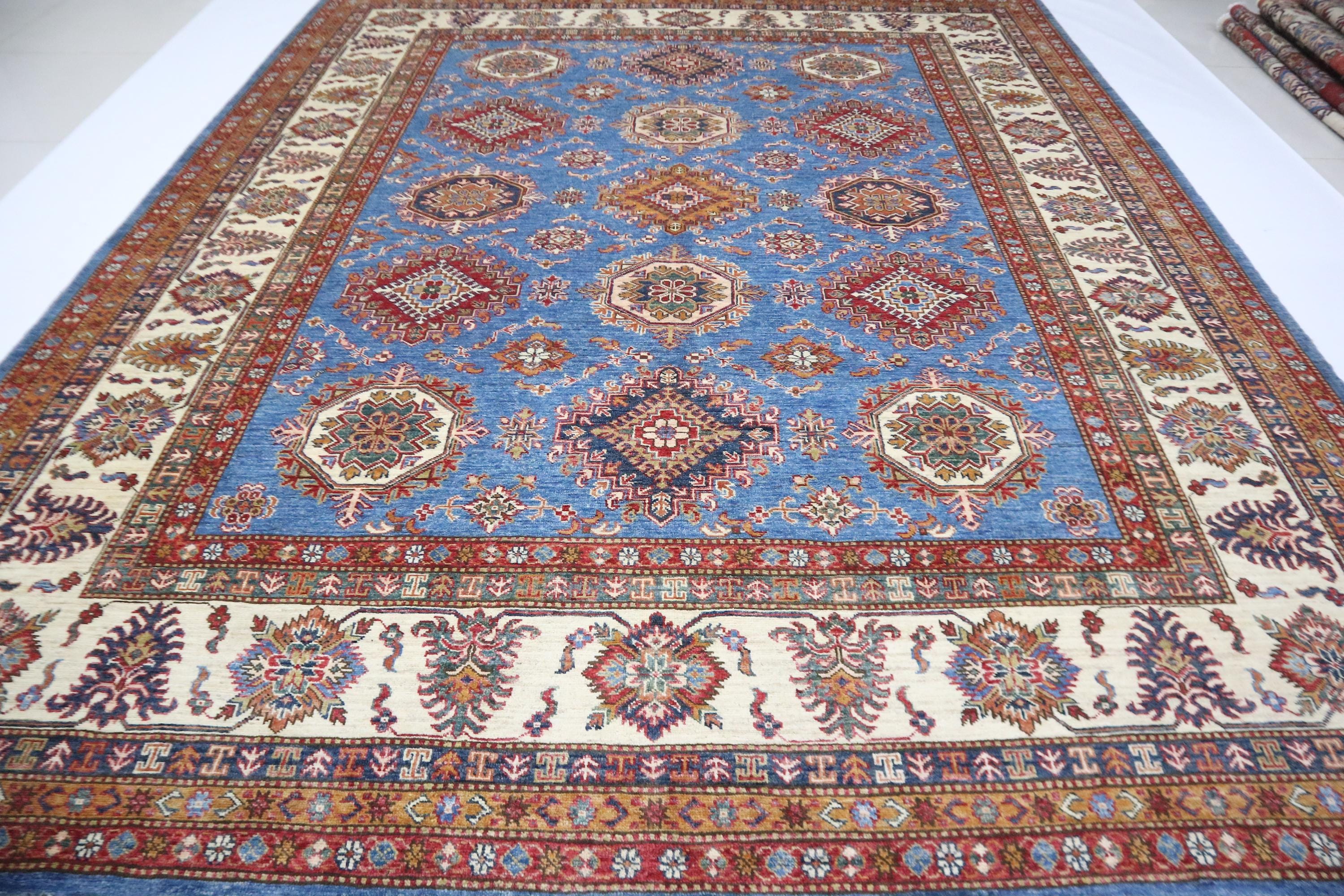8x10 Kazak Area Rug - Blue Afghan Handmade Geometric Veg Dye Wool Rug - Traditional Rug - Bedroom Rug - Living Room Rug - Dining Room Rug