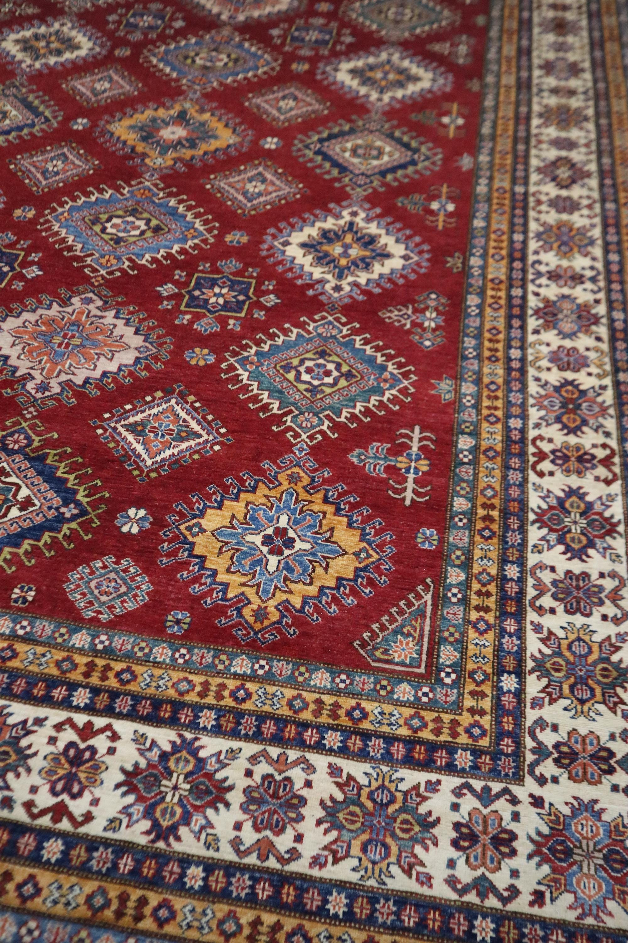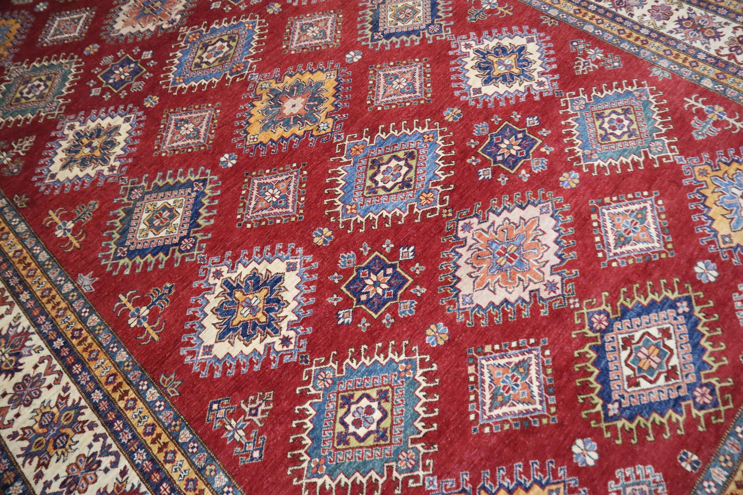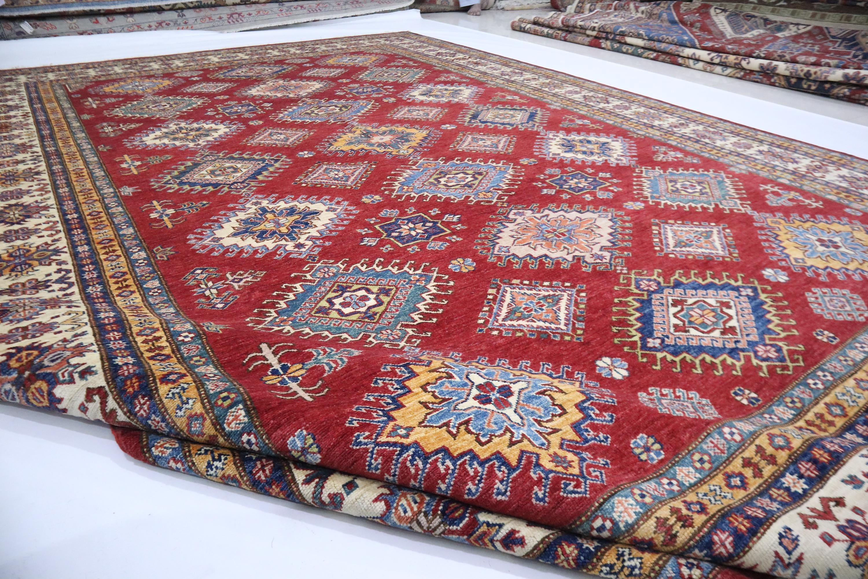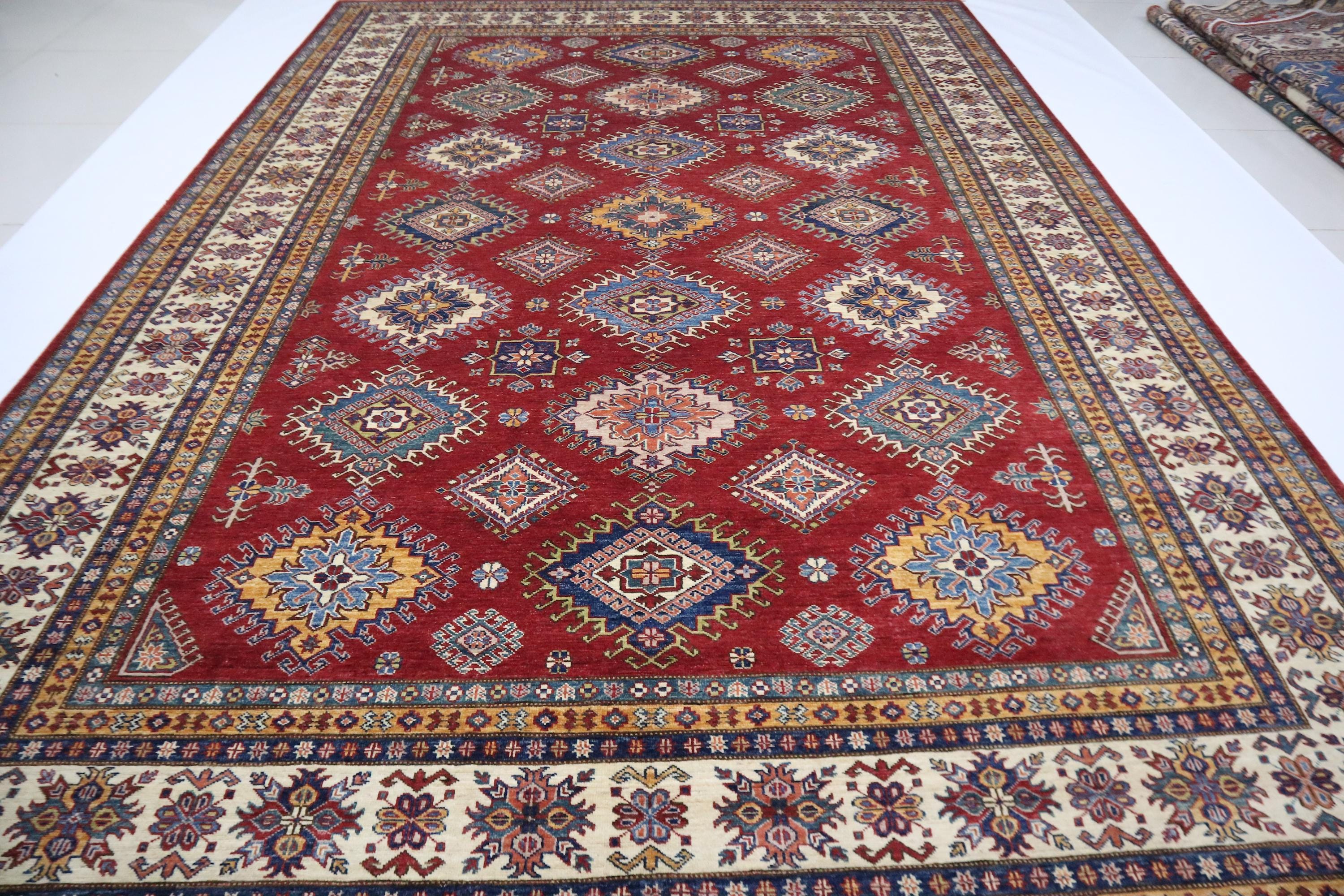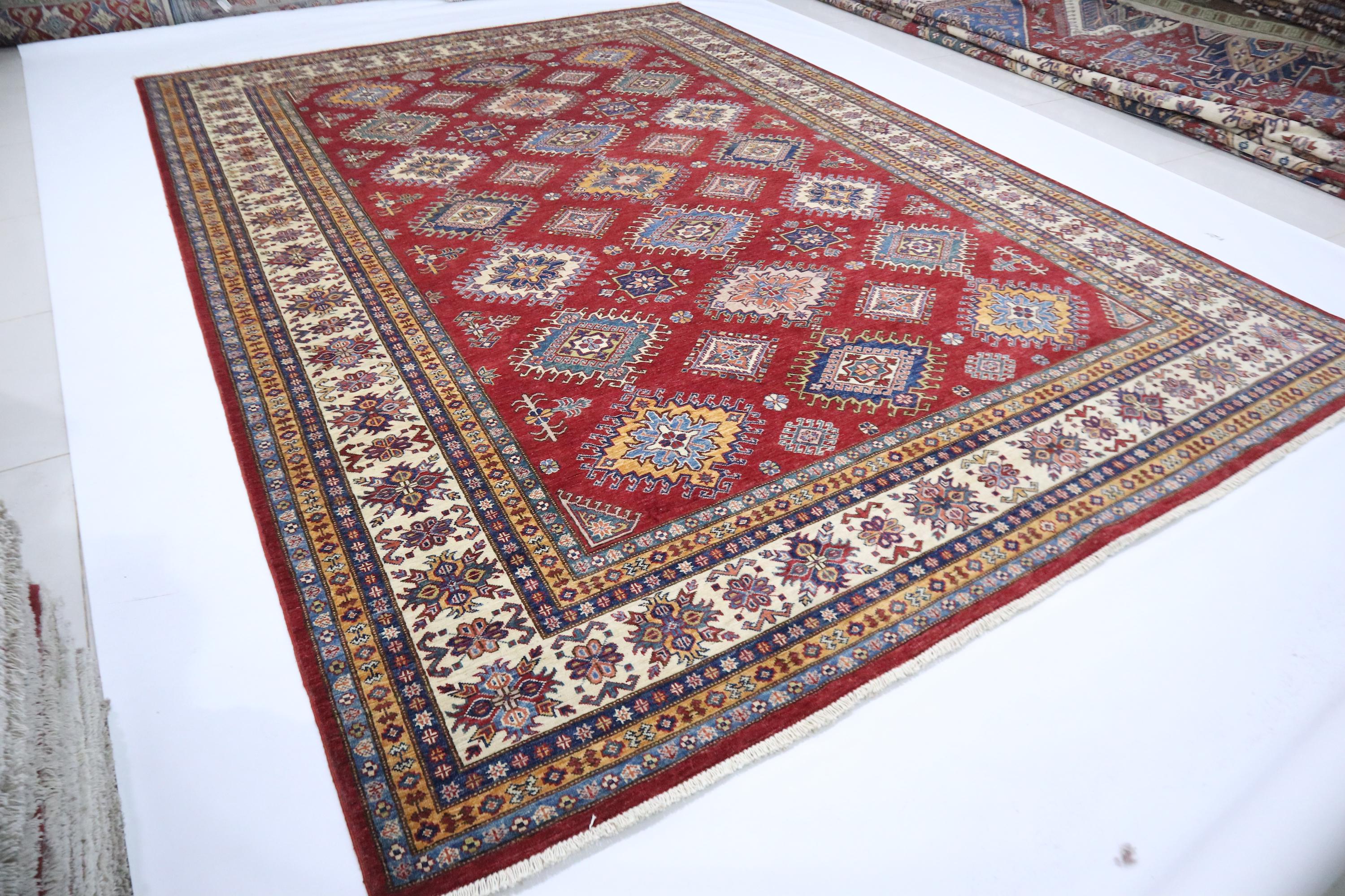 8x12 Kazak Area Rug - Red Afghan Hand Knotted Traditional Natural Dye Wool Rug - Geometric Rug - Dining Room Rug - Living Room Rug - Rugs