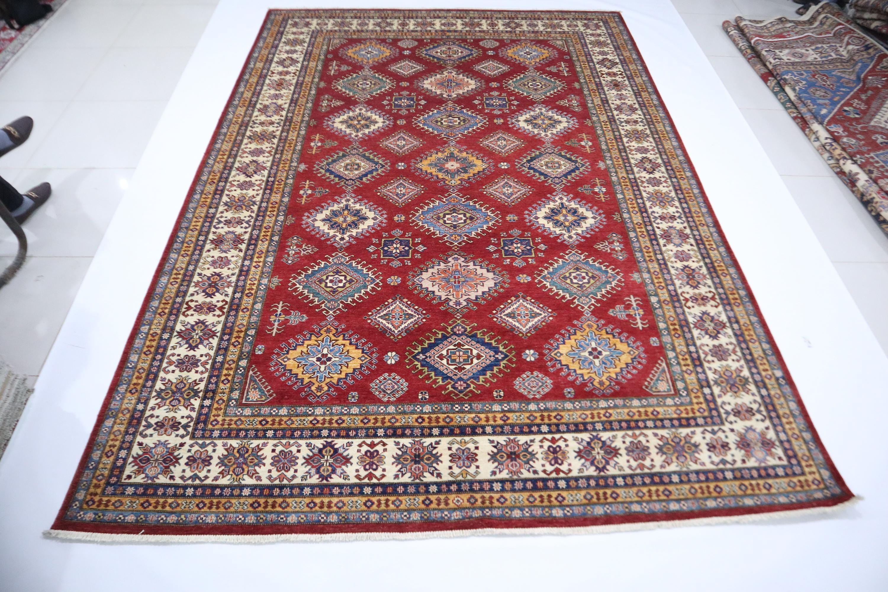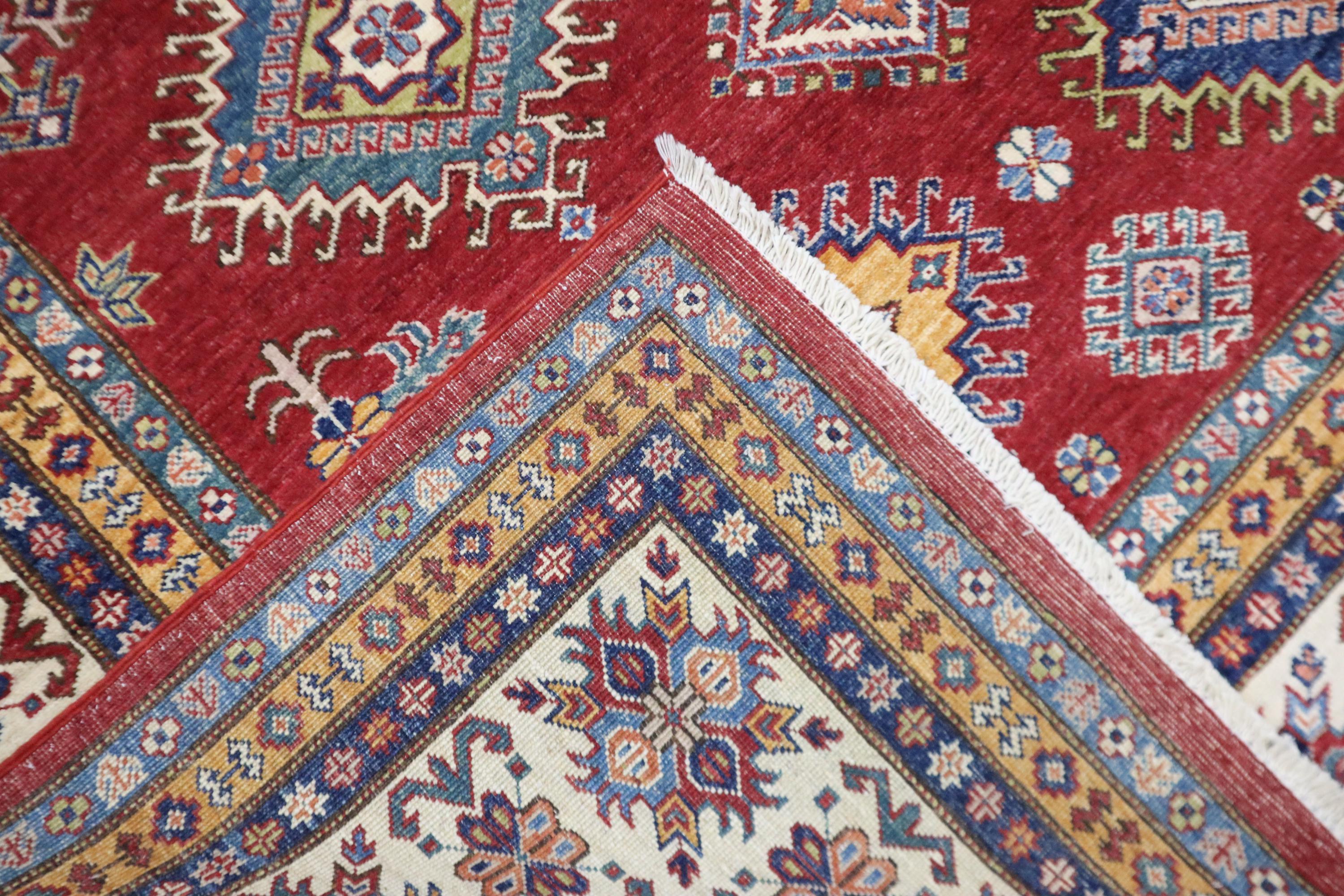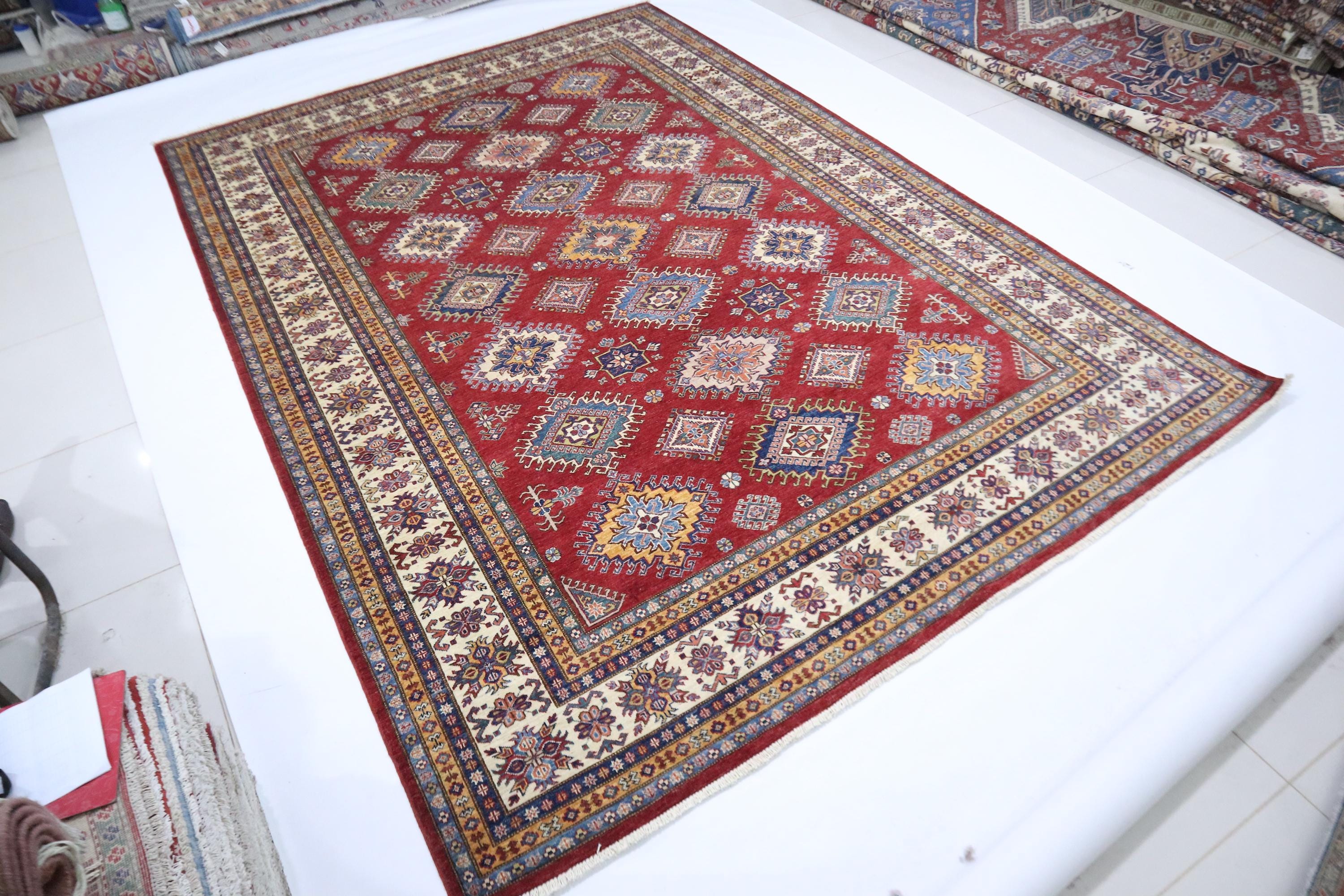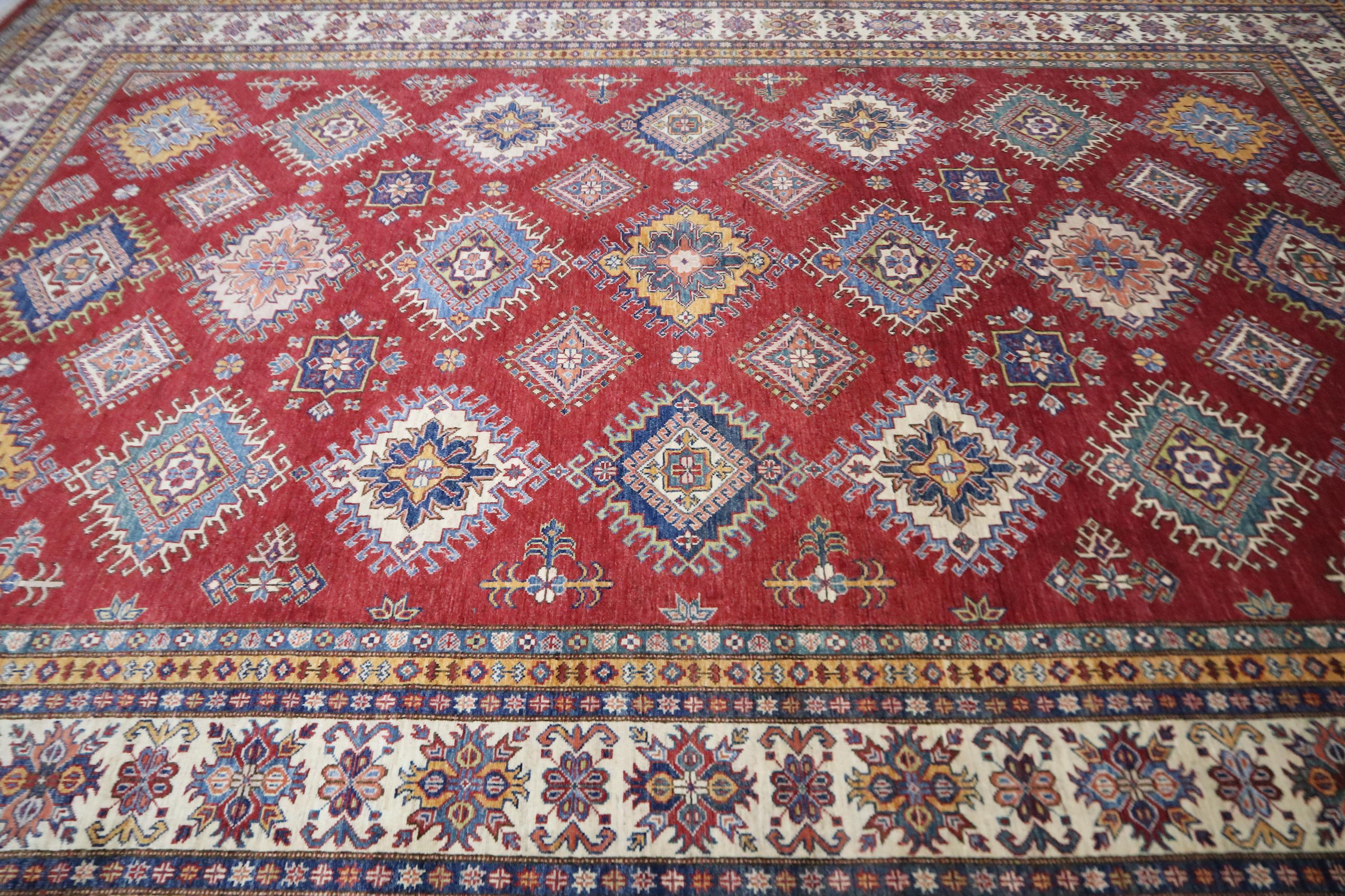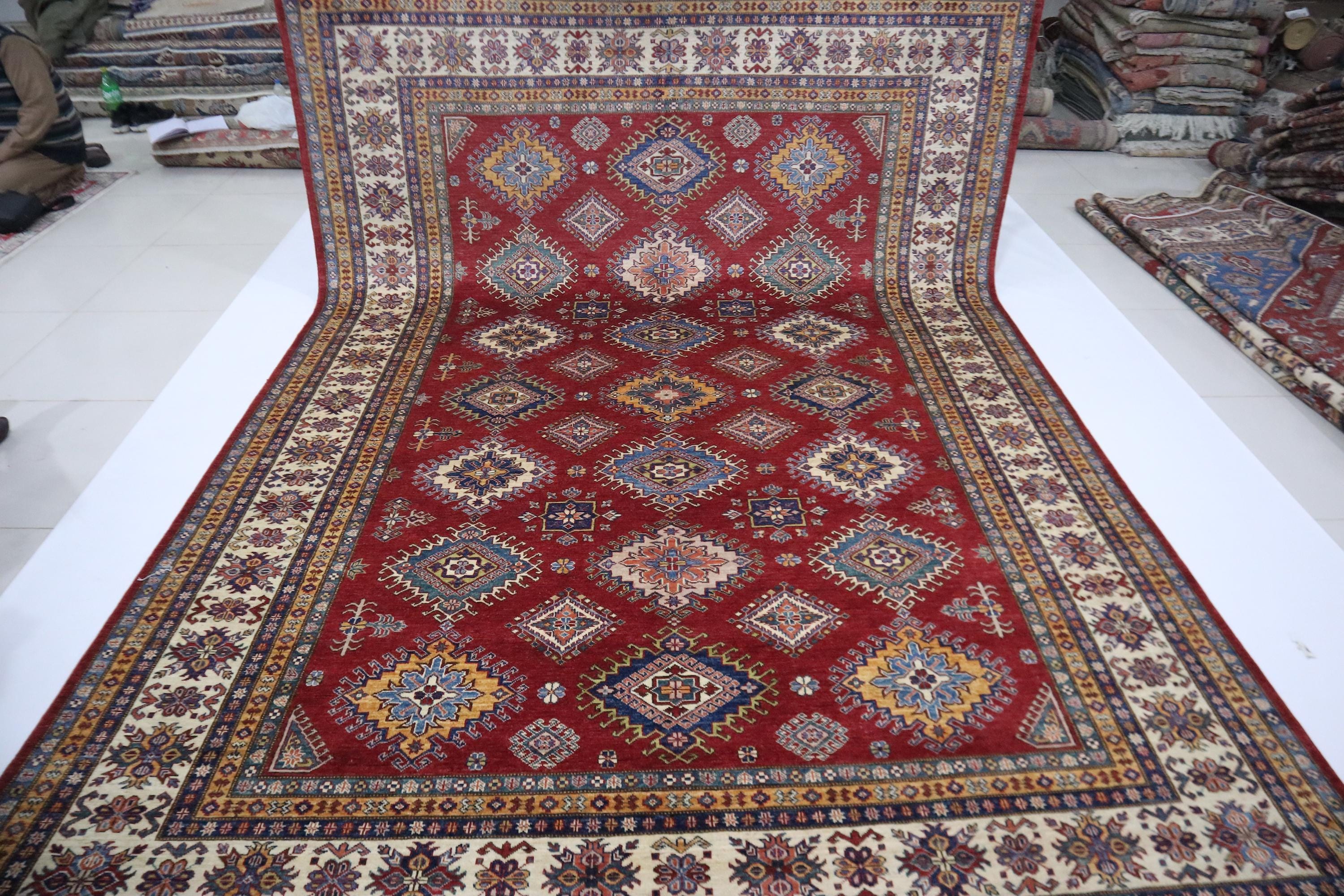 8x12 Kazak Area Rug - Red Afghan Hand Knotted Traditional Natural Dye Wool Rug - Geometric Rug - Dining Room Rug - Living Room Rug - Rugs