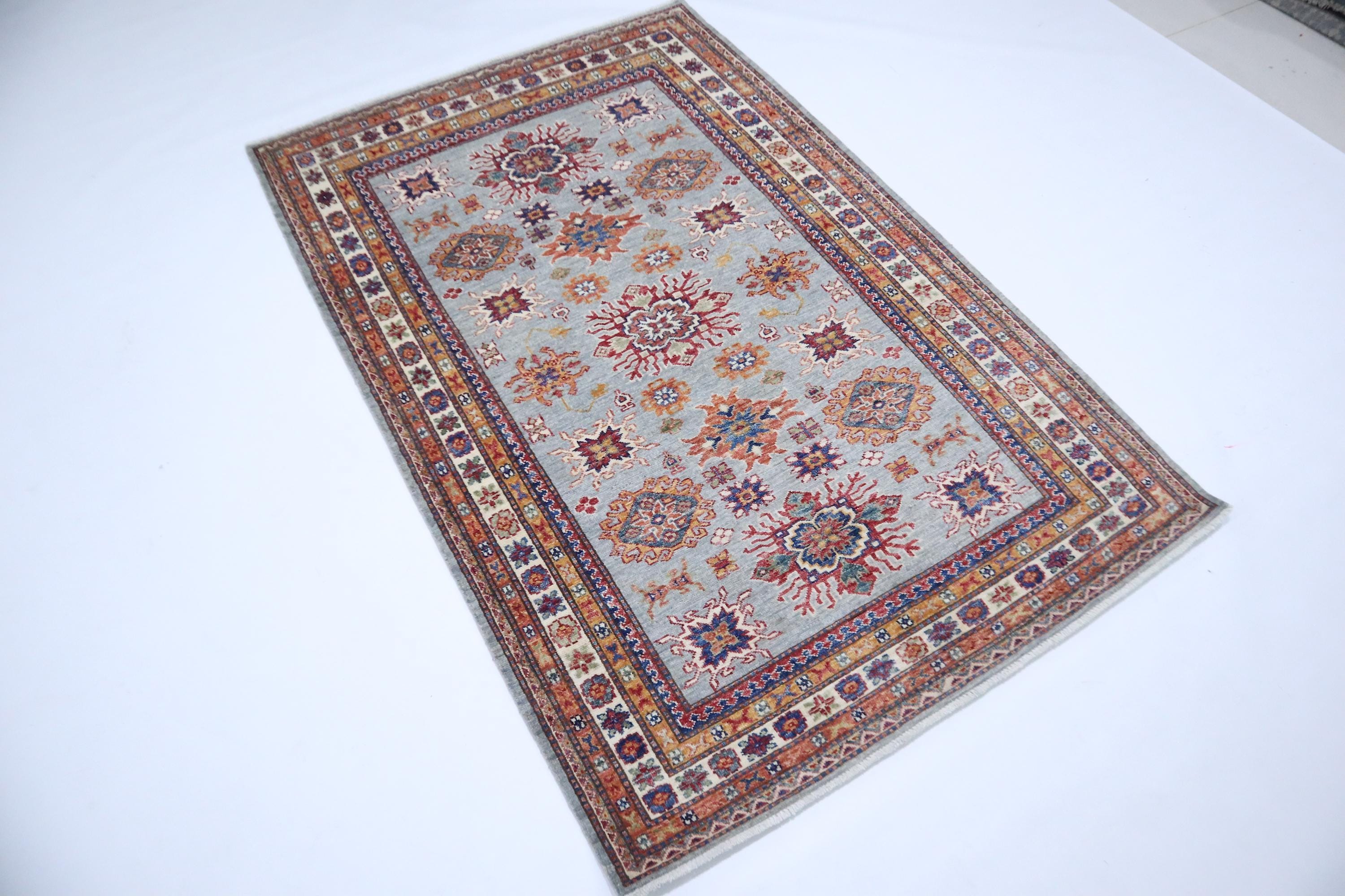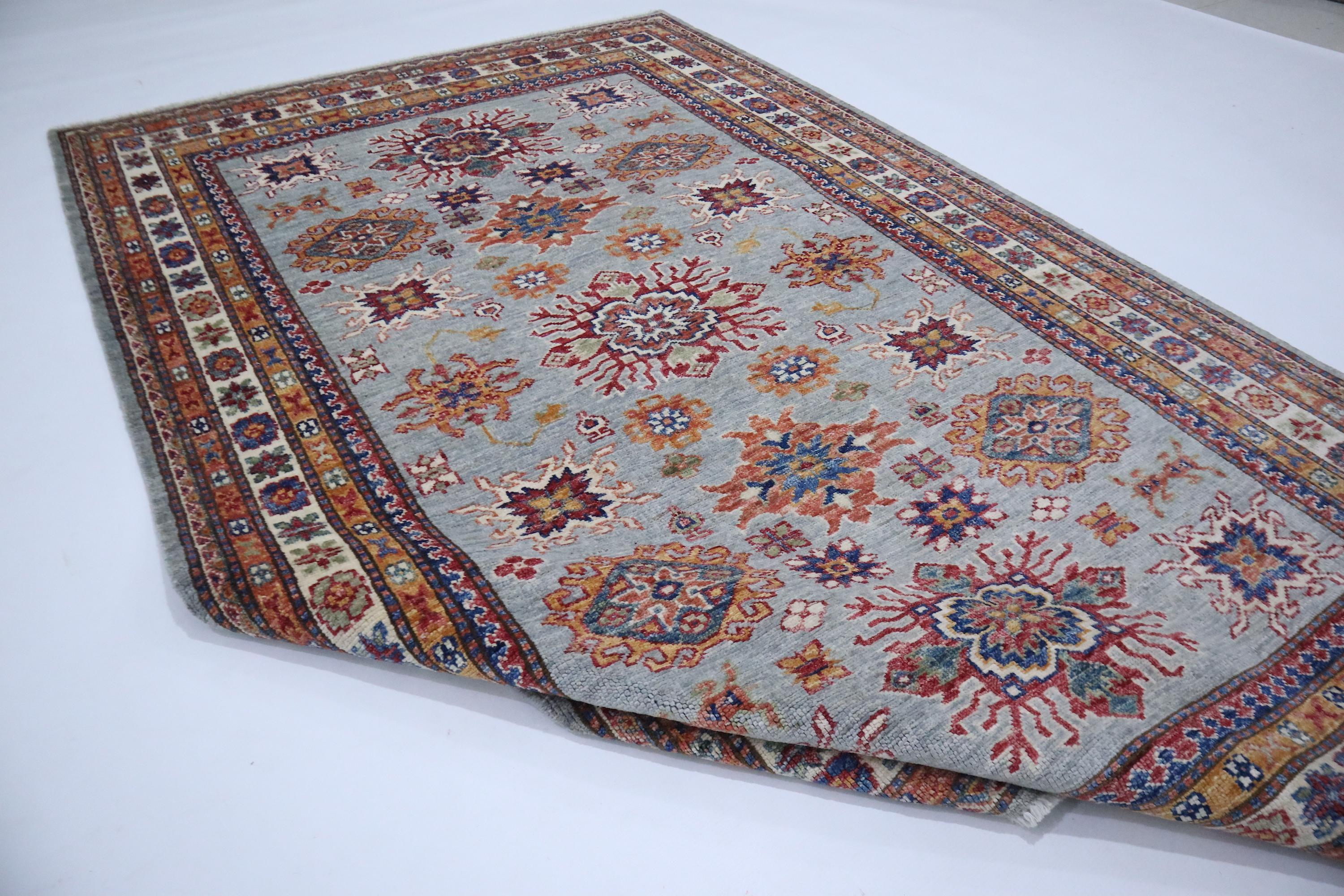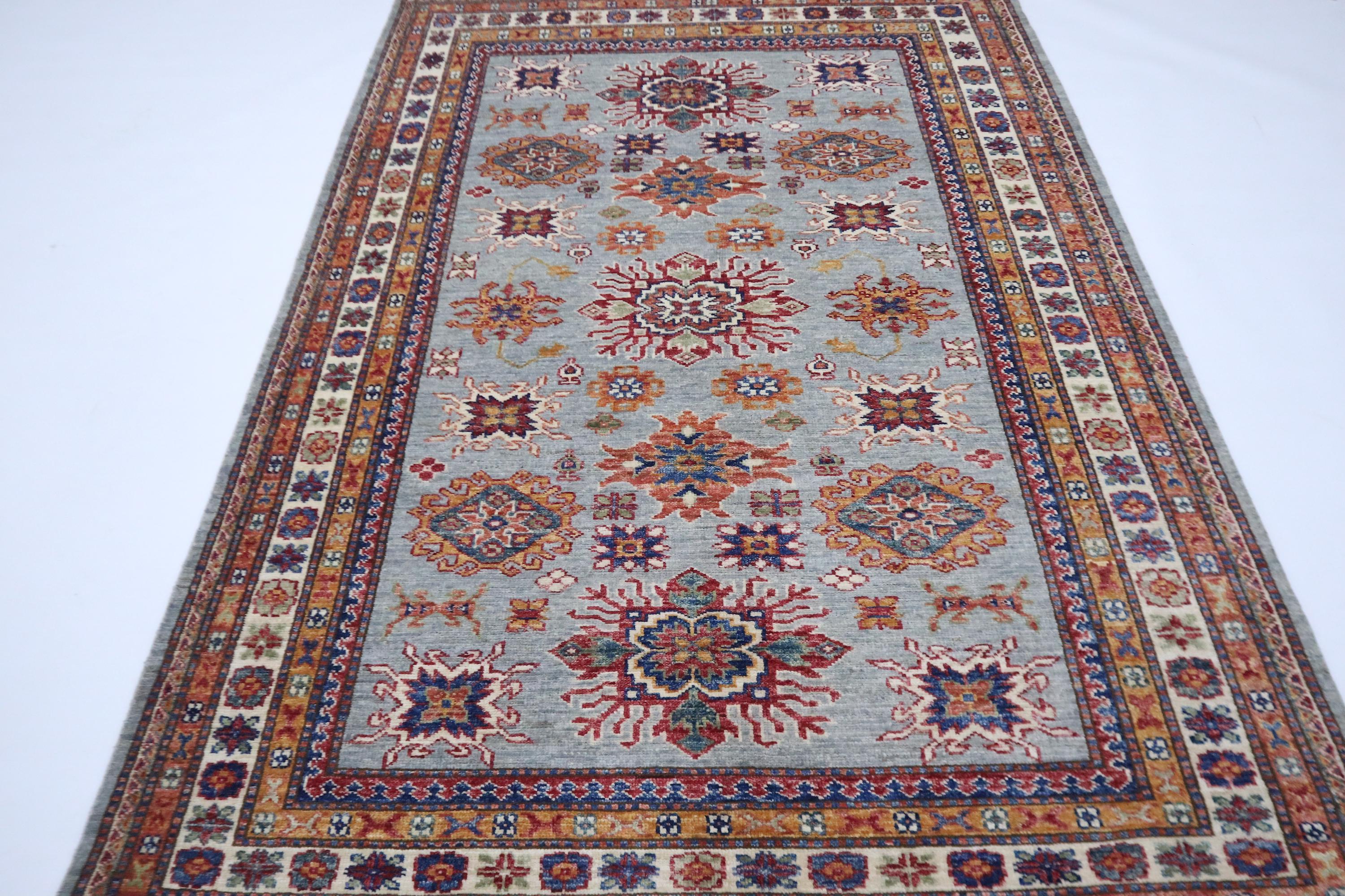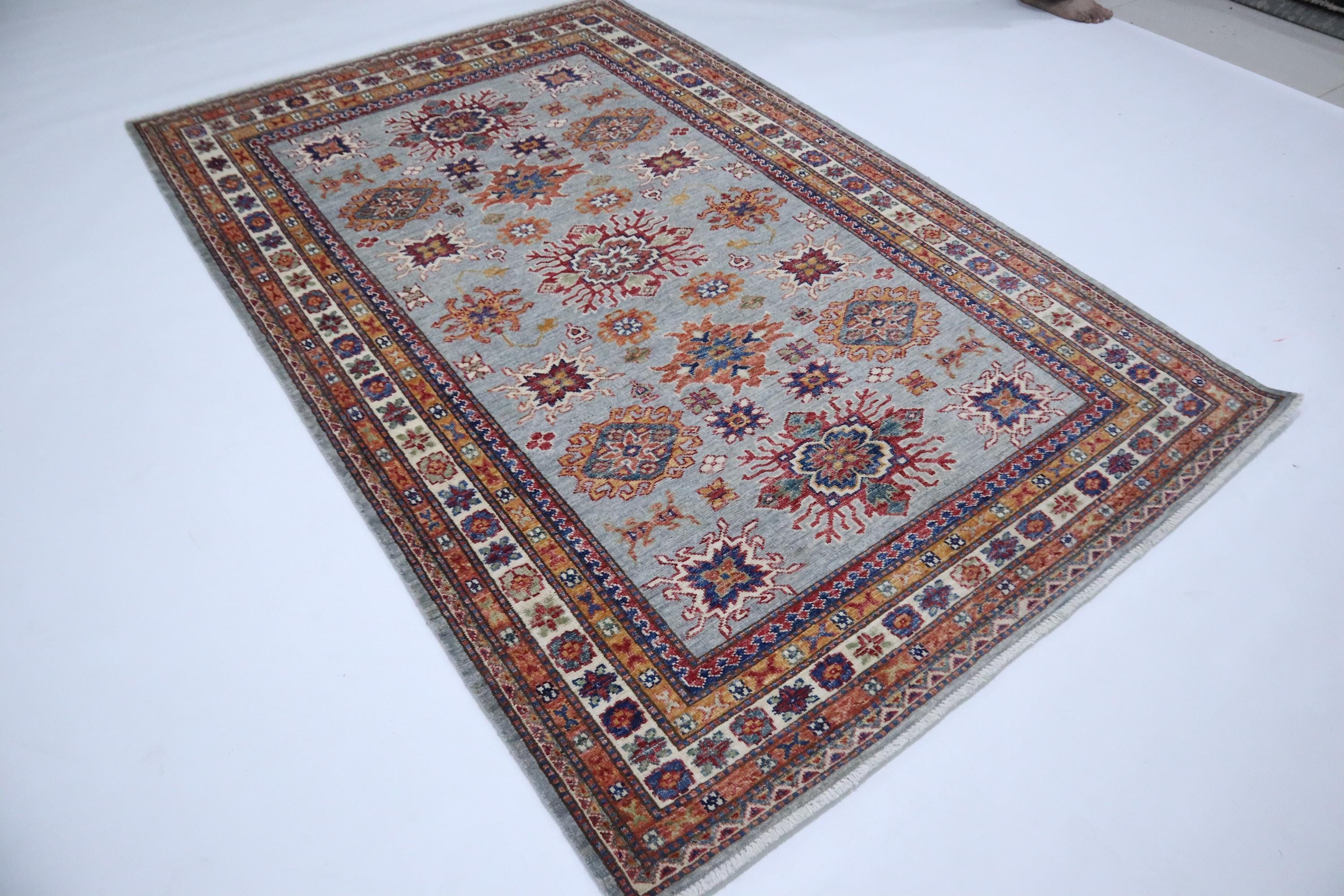 Gray 4x6 Kazak Area Rug - Afghan Hand Knotted Geometric Natural Dye Wool Rug - Traditional Rug - Kitchen Rug - Bedroom Rug - Foyer Rug