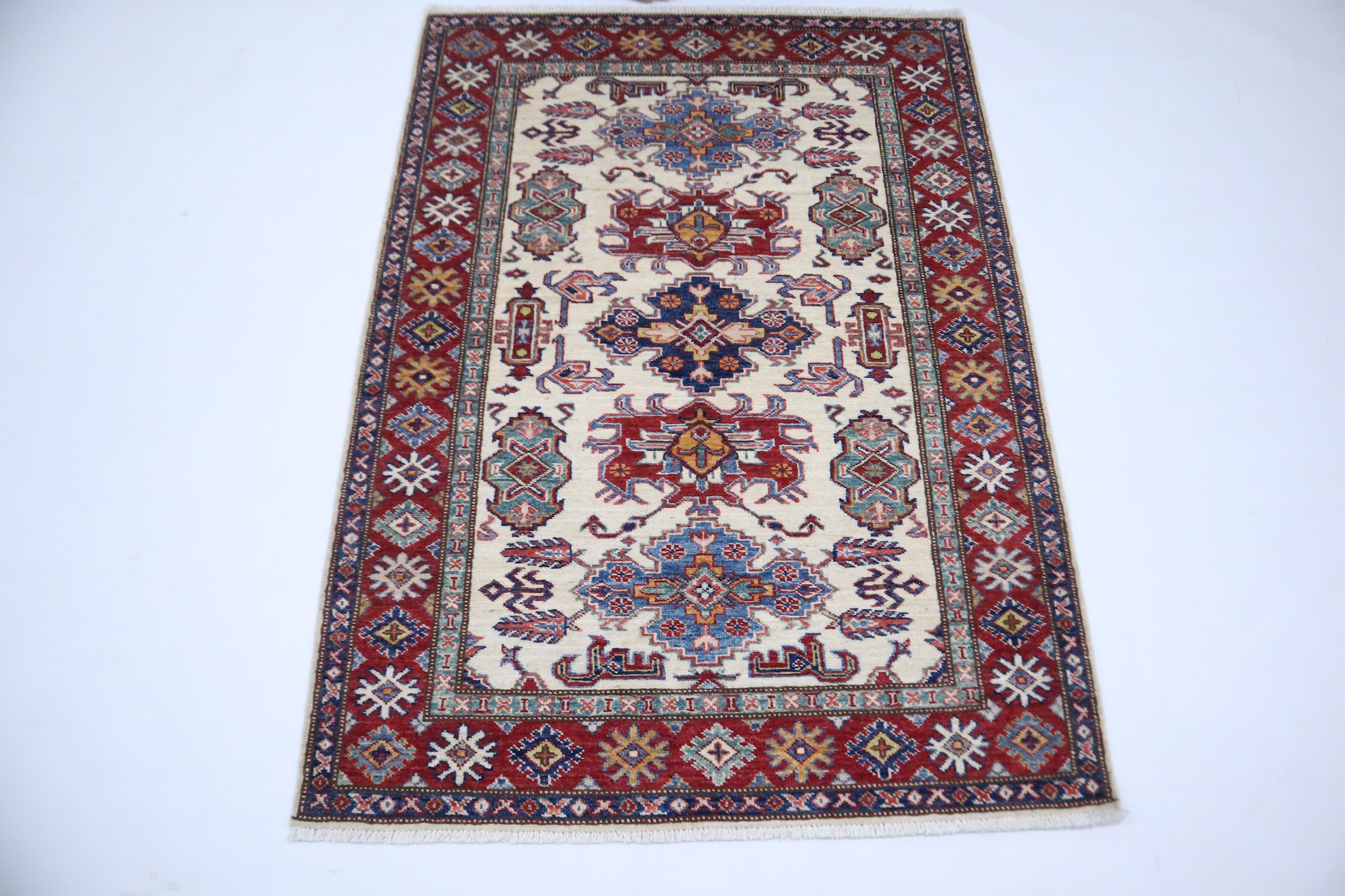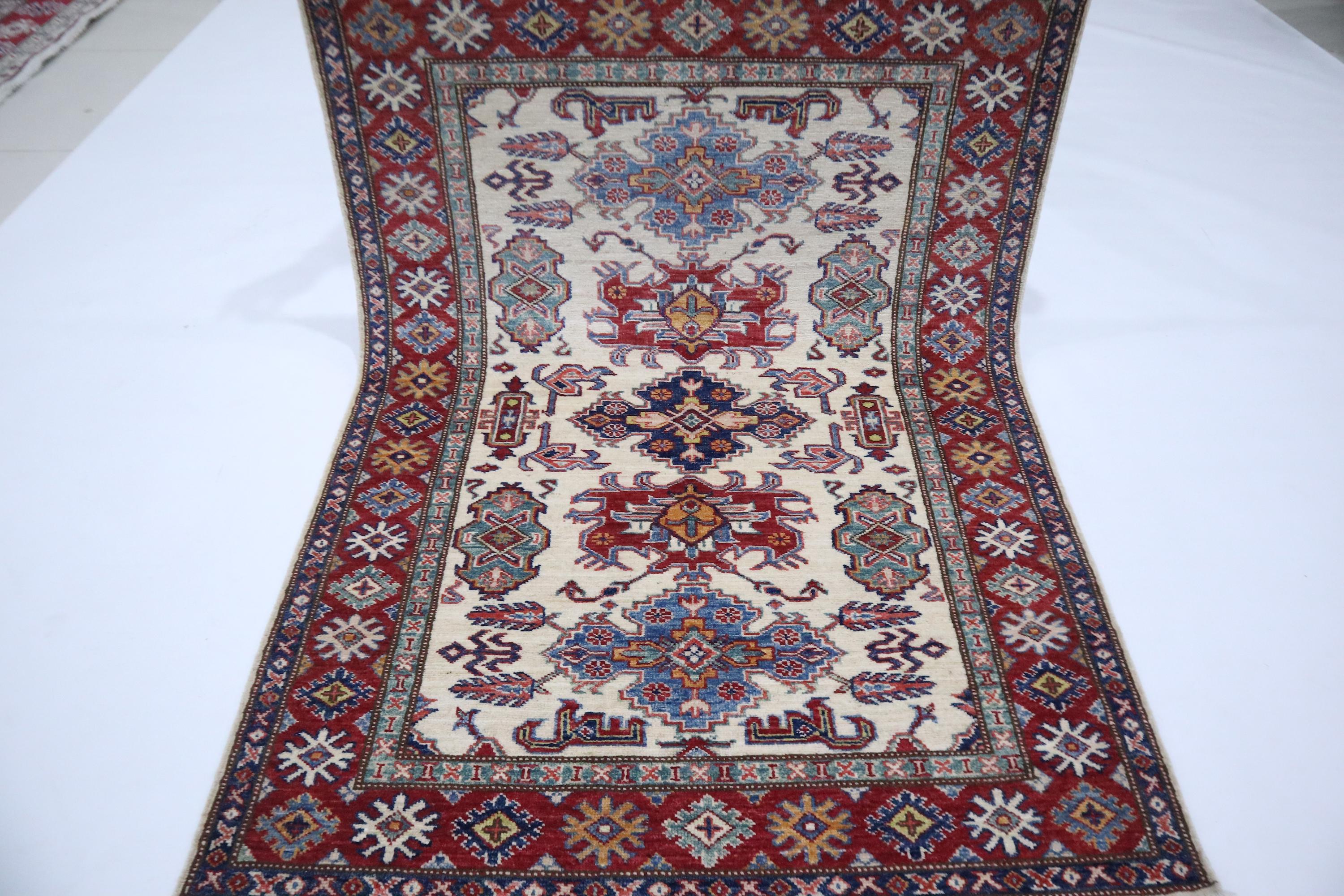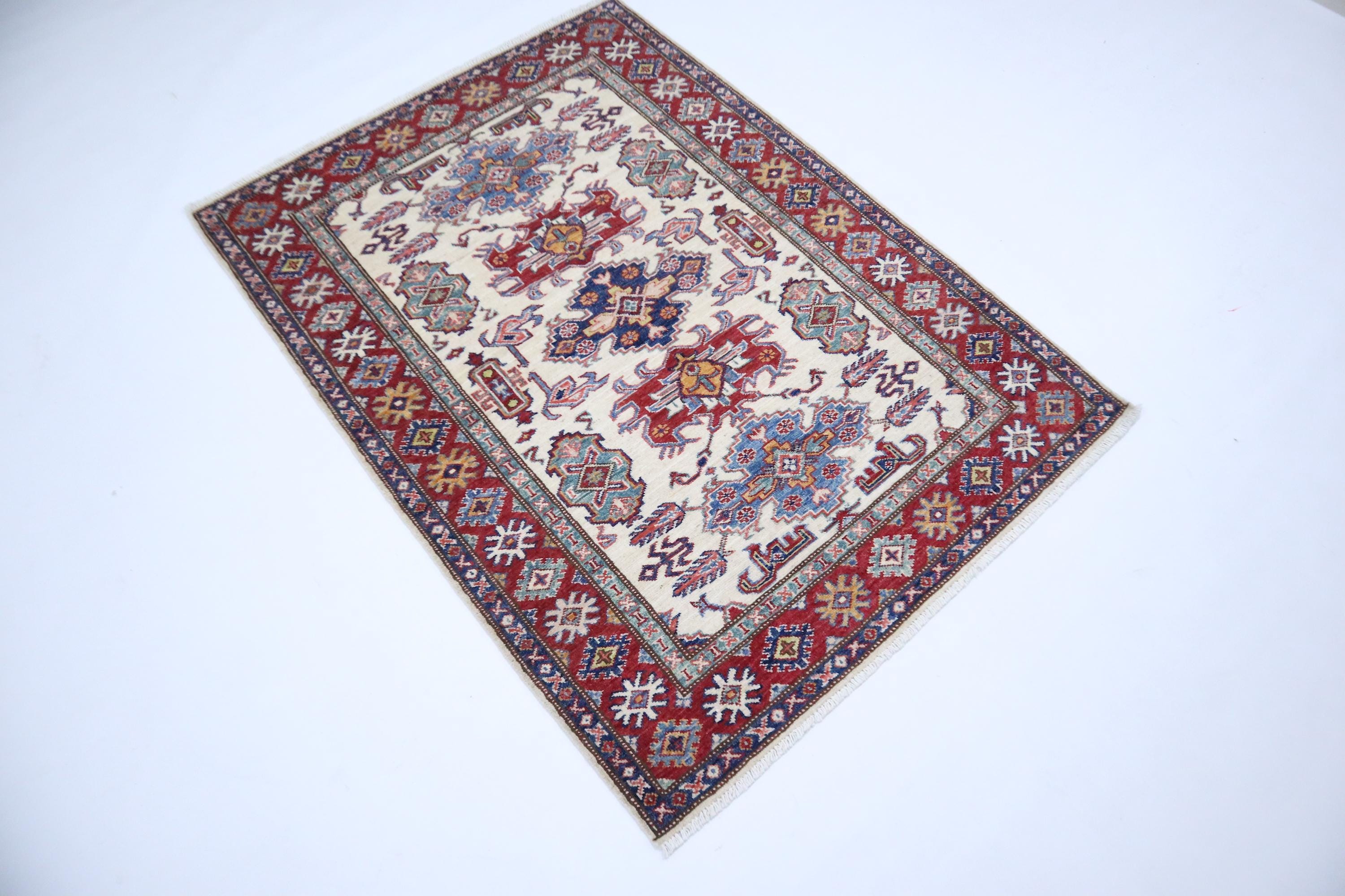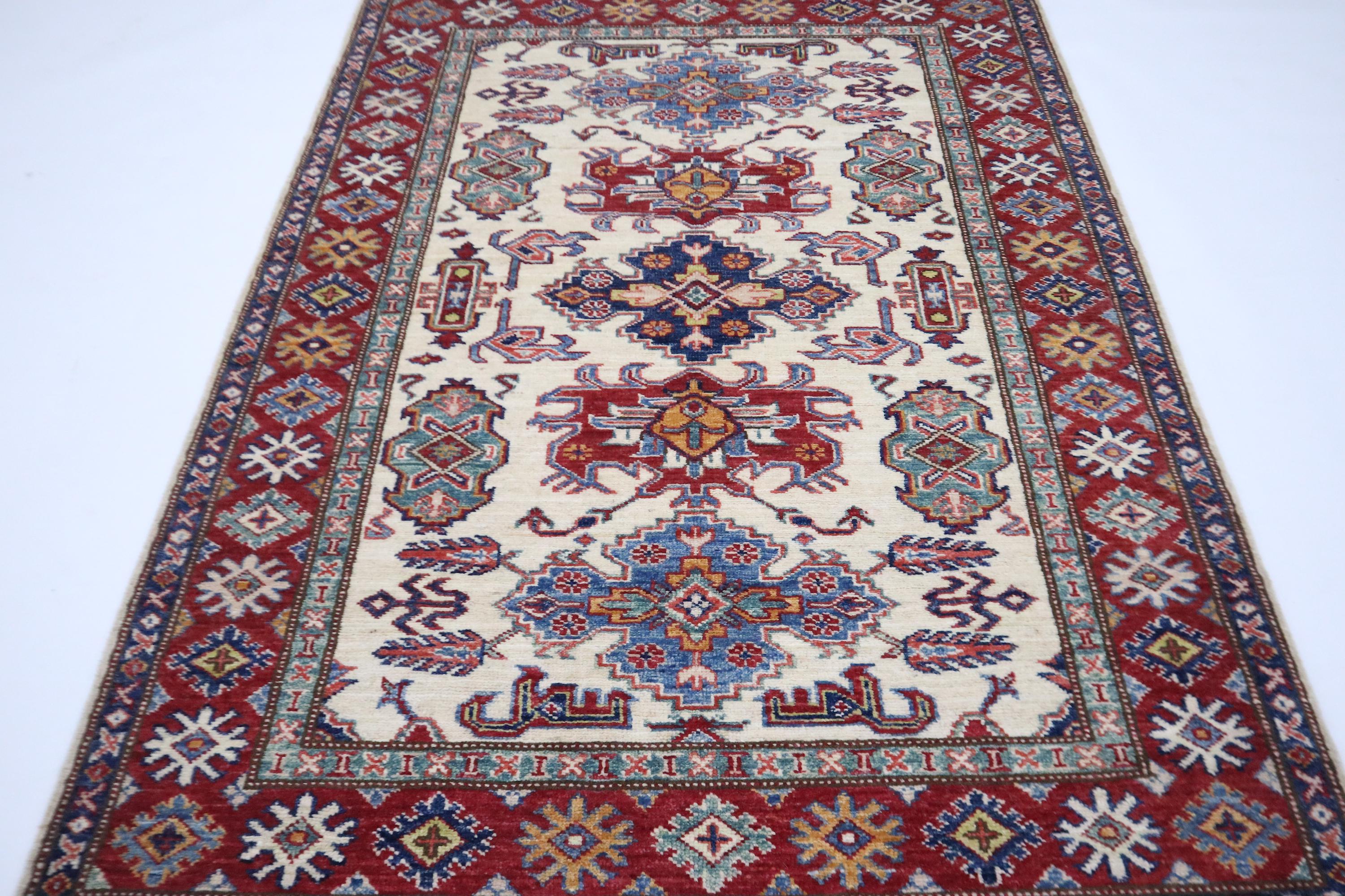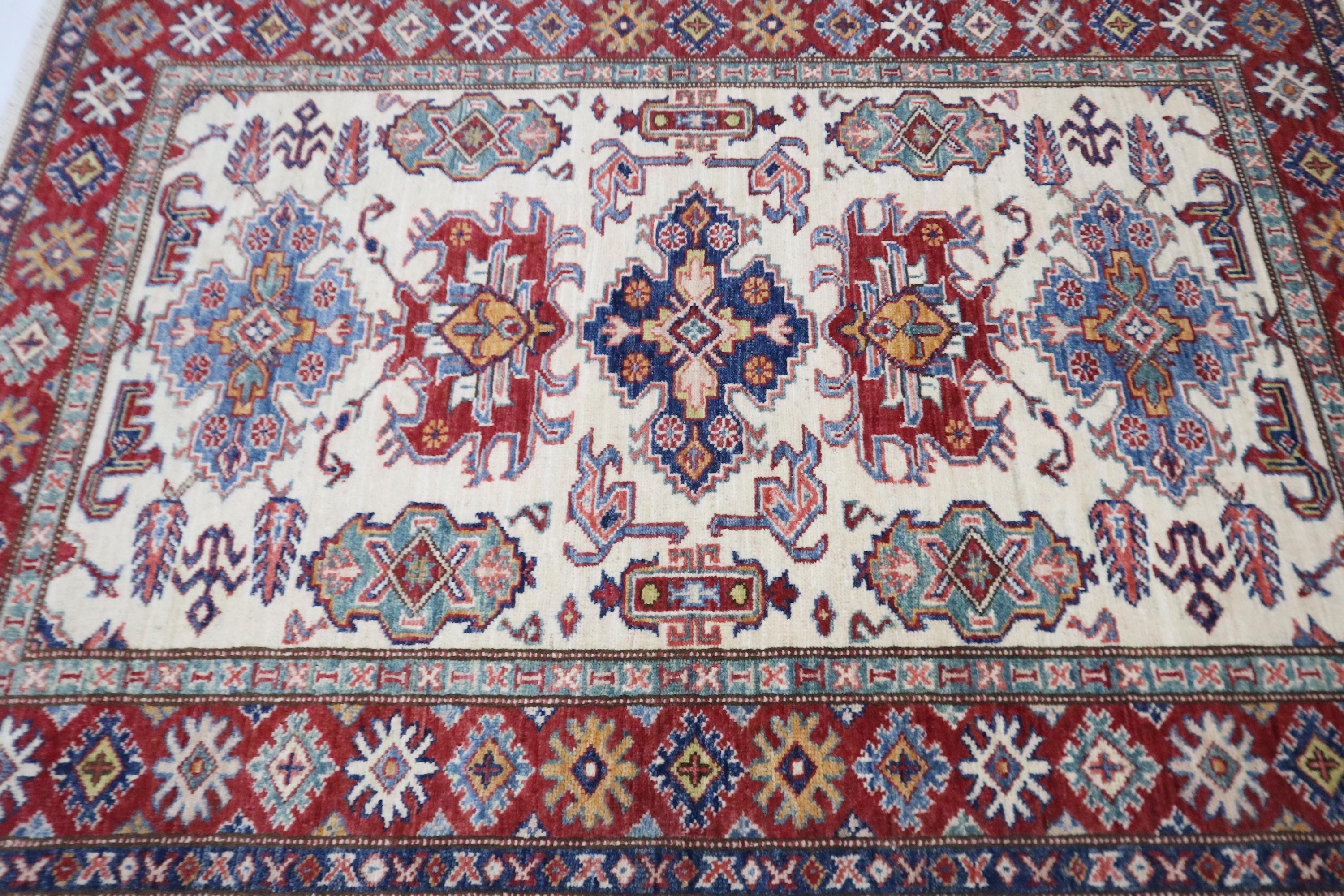 3x5 Kazak Area Rug - Fine Quality Wool Rug - Beige Red Rug - Afghan Handmade Rug - Geometric Design Rug - Foyer Rug - Kitchen Rug - Dorm Rug