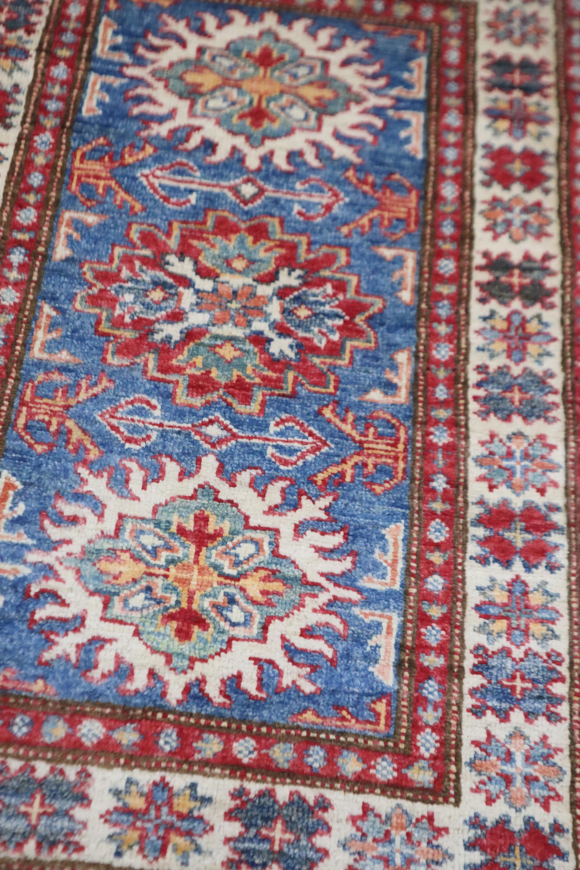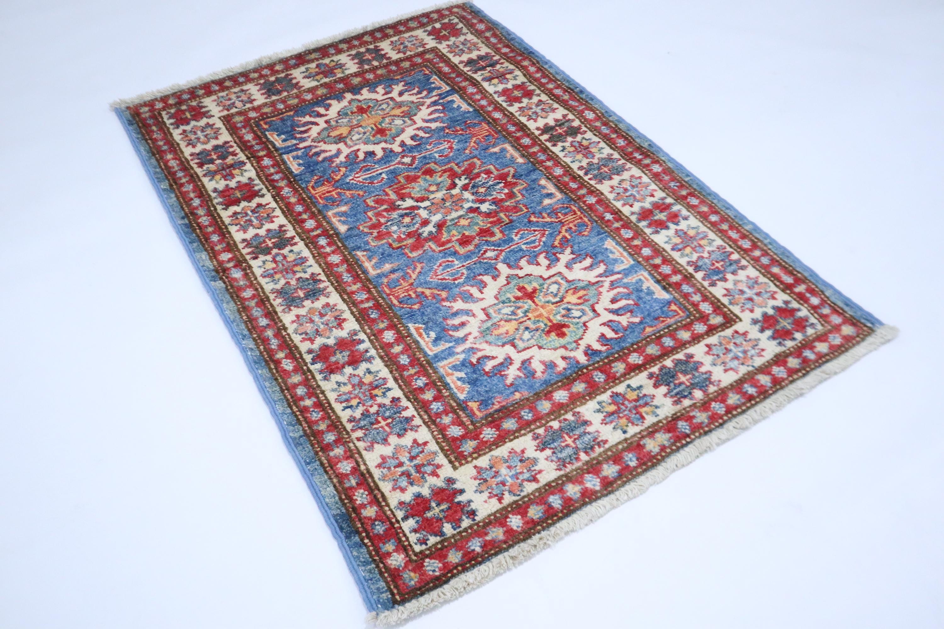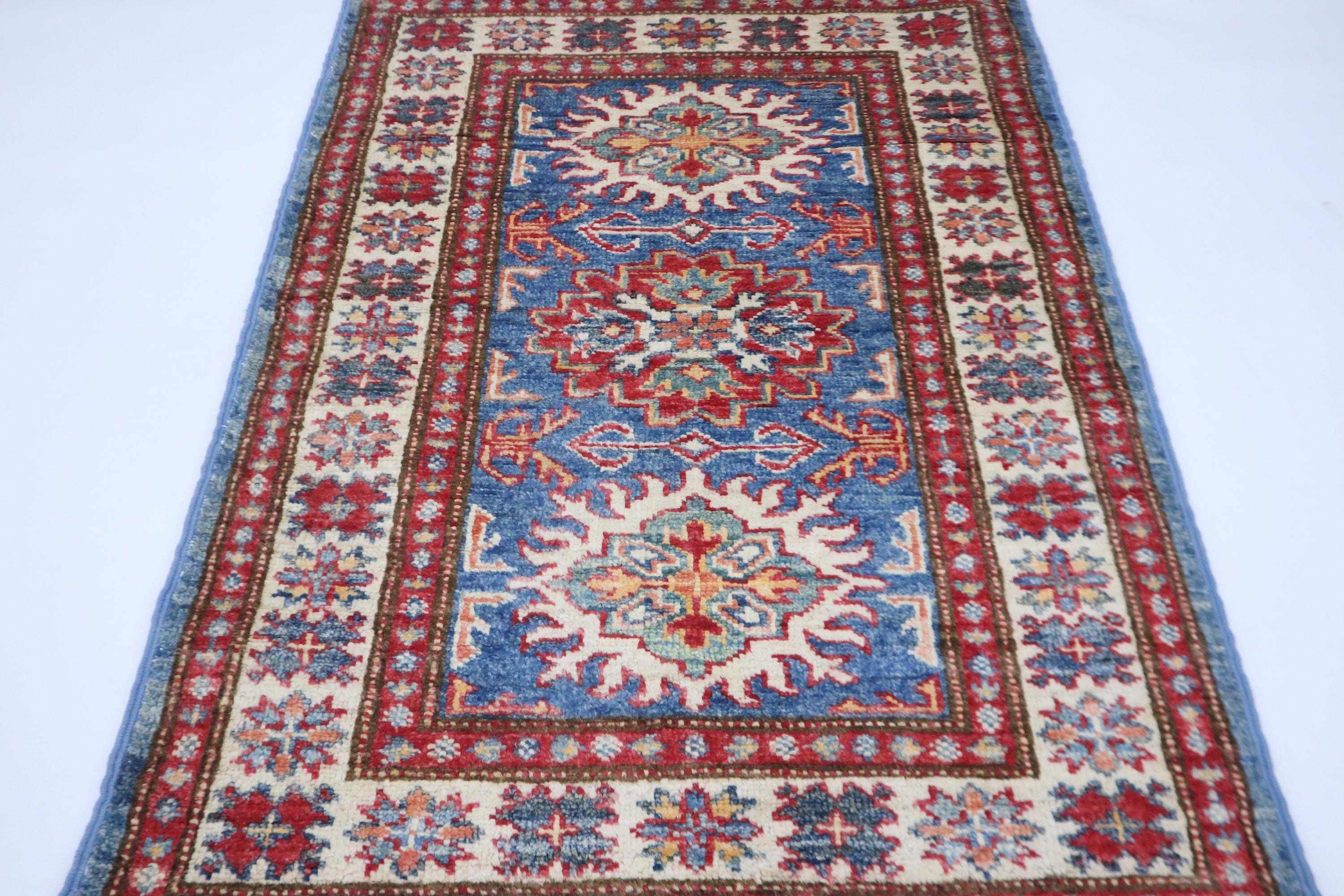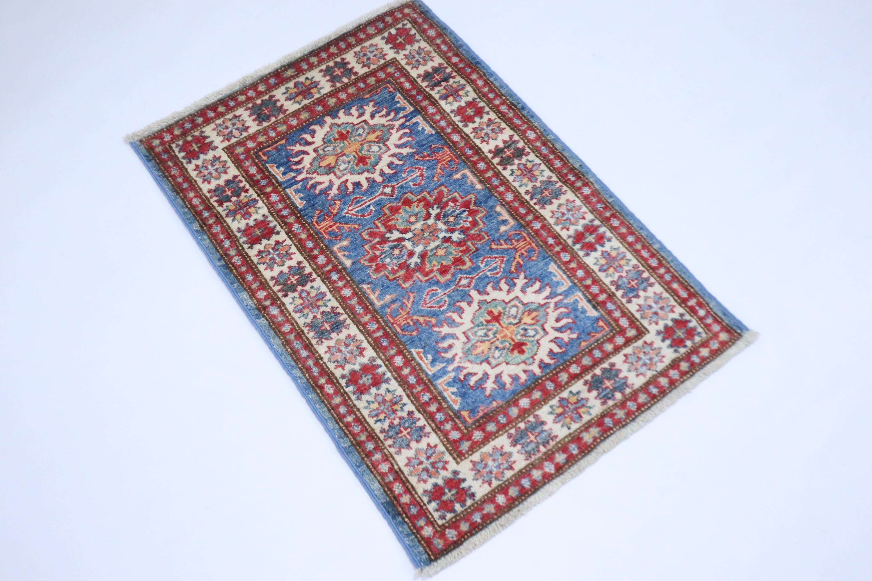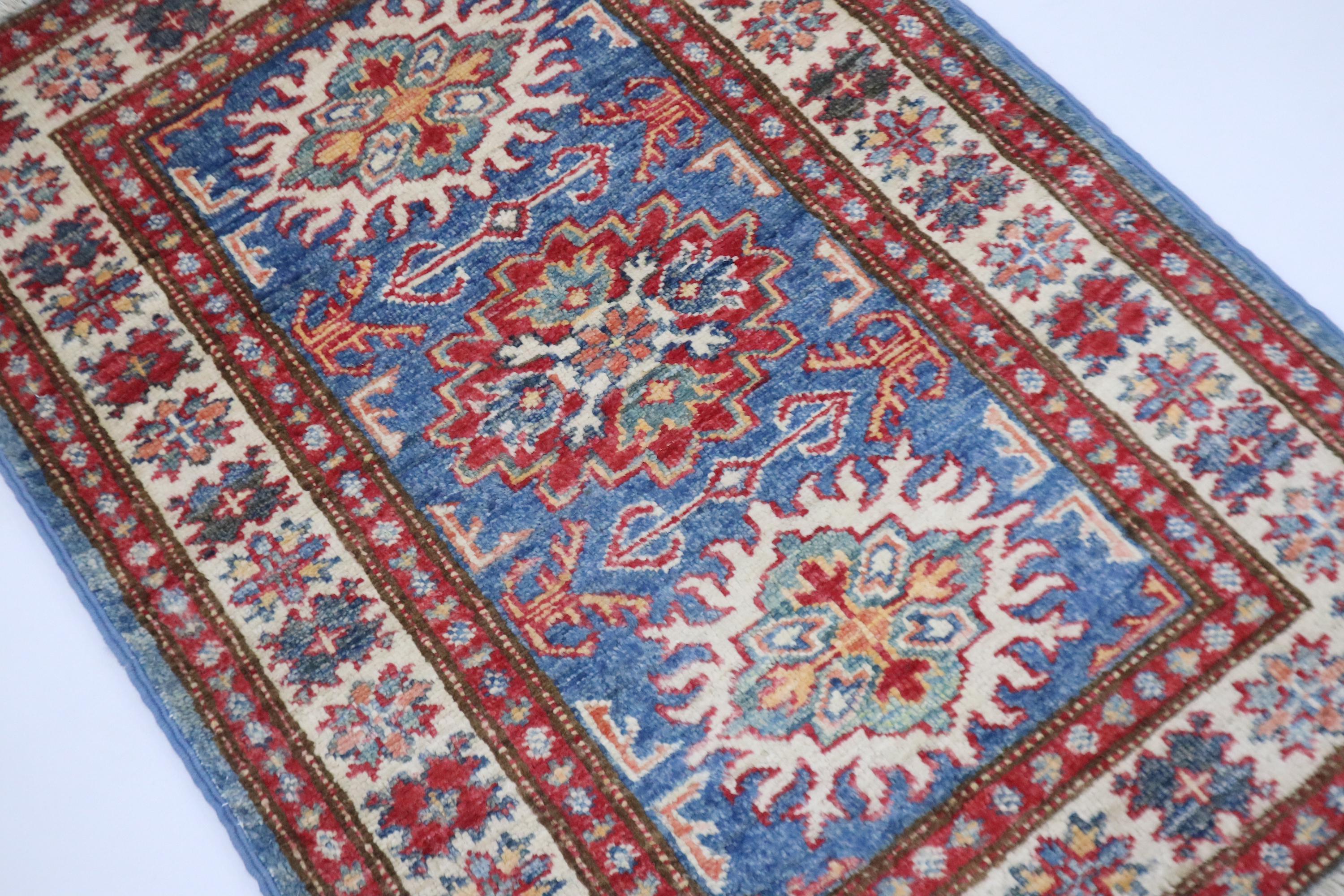 2x3 Kazak Area Rug - Blue Afghan Hand Knotted Geometric Natural Dye Wool Rug - Accent Rug - Traditional Rug - Door Mat - Foyer Rug - Rugs