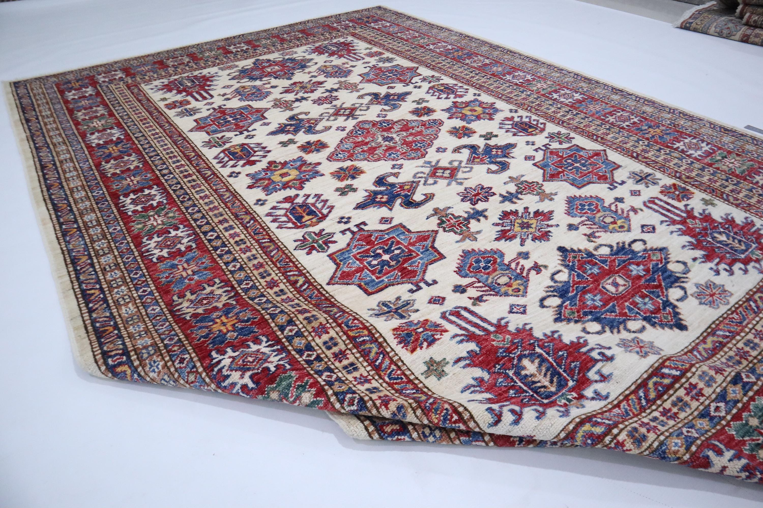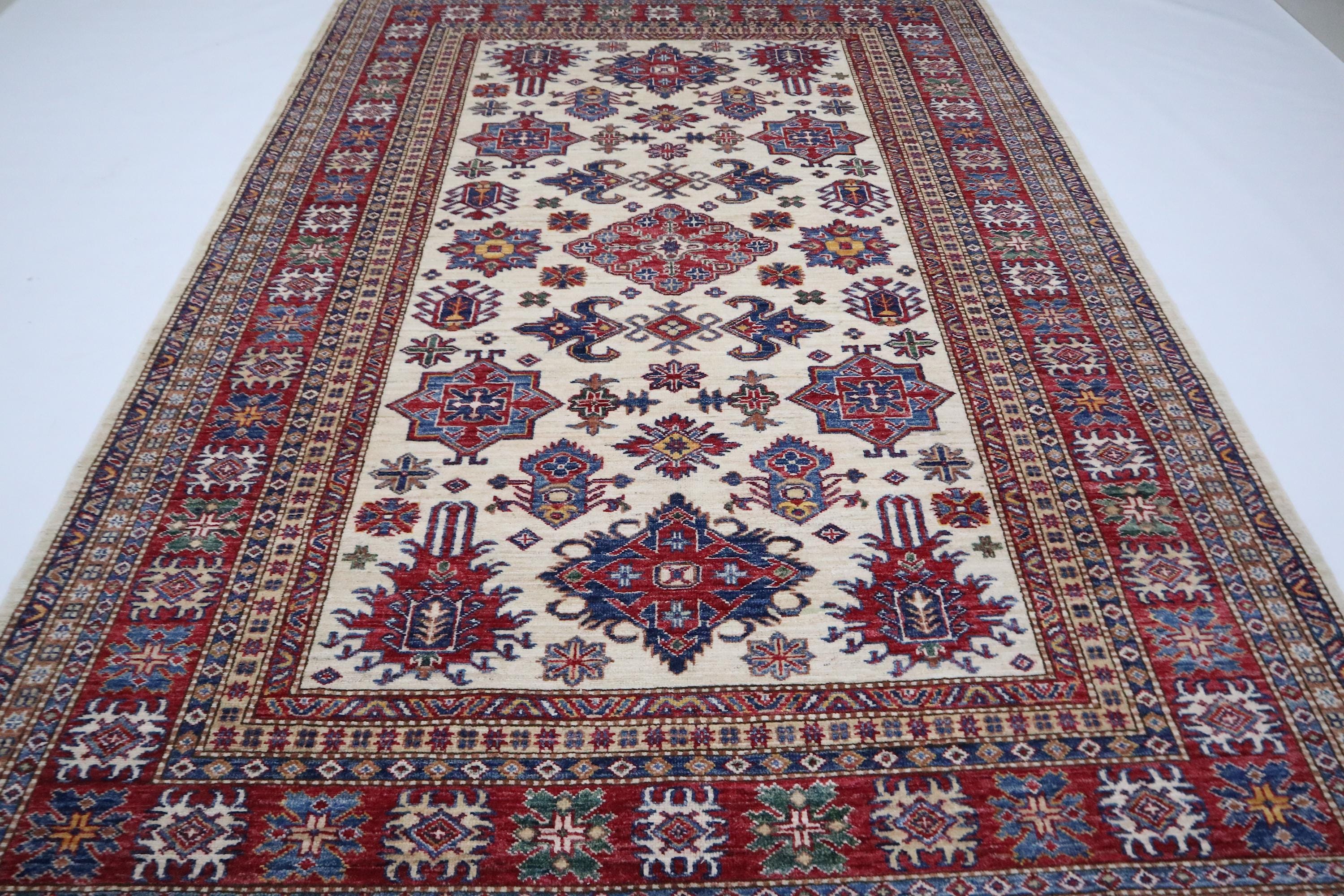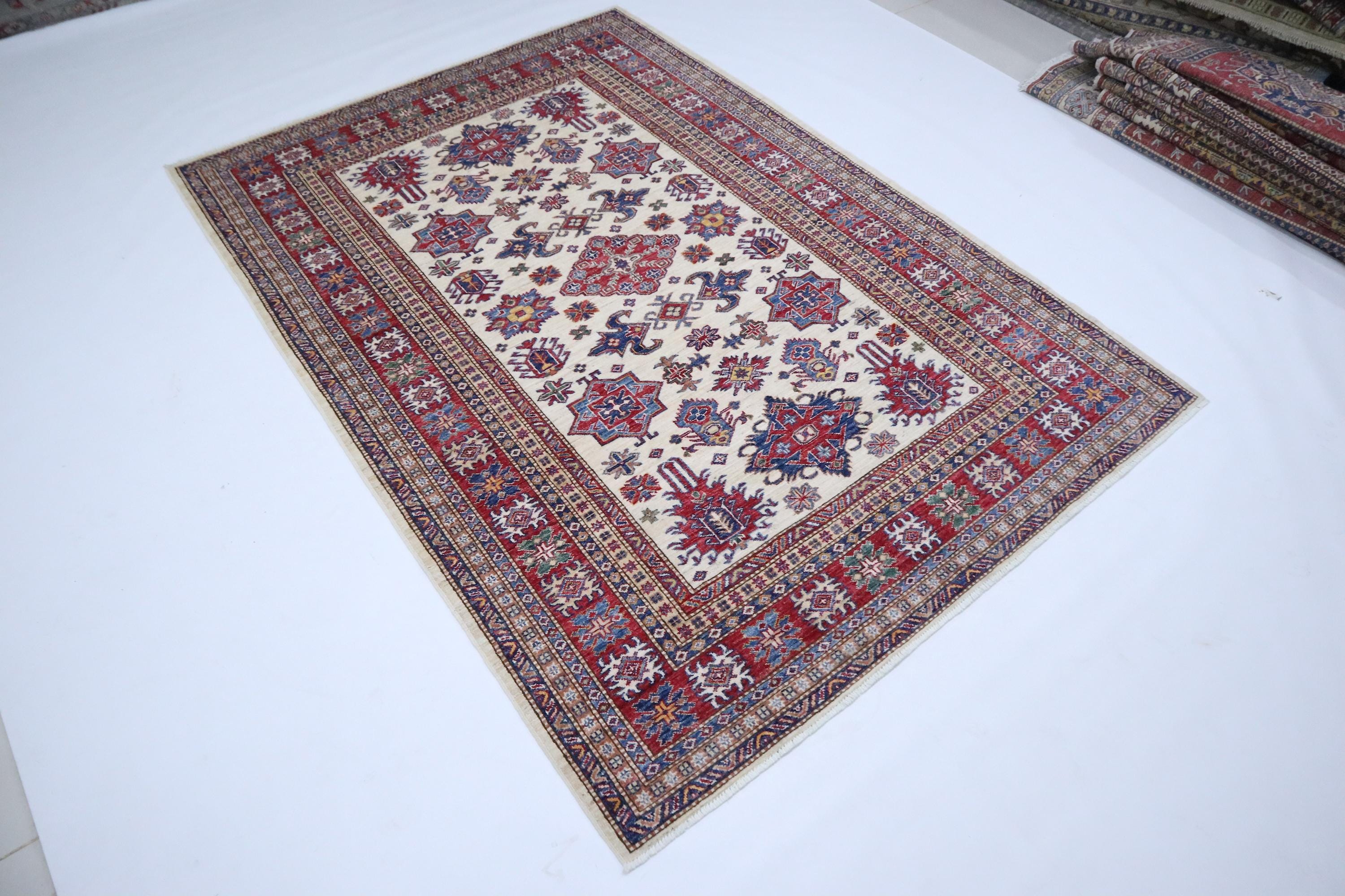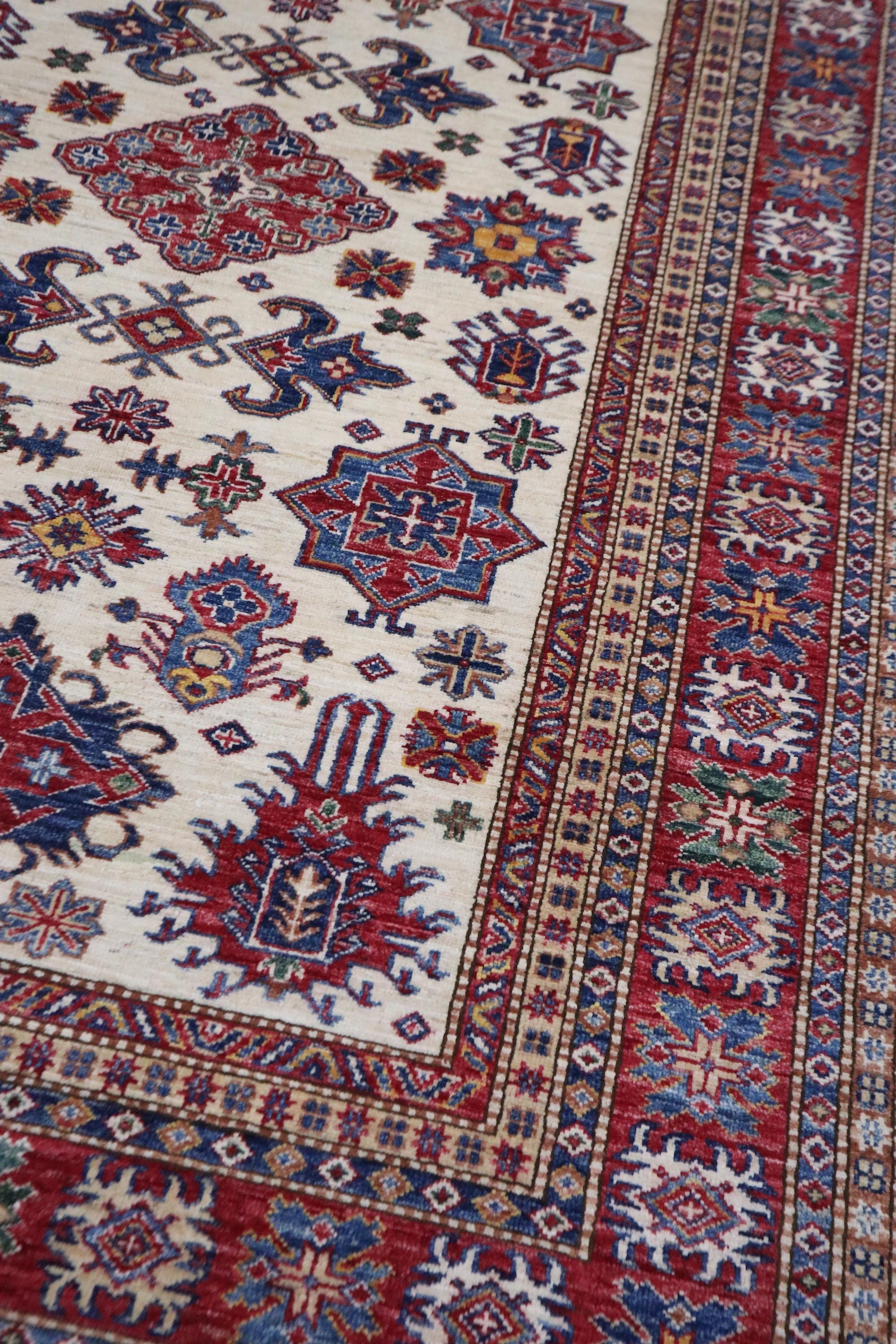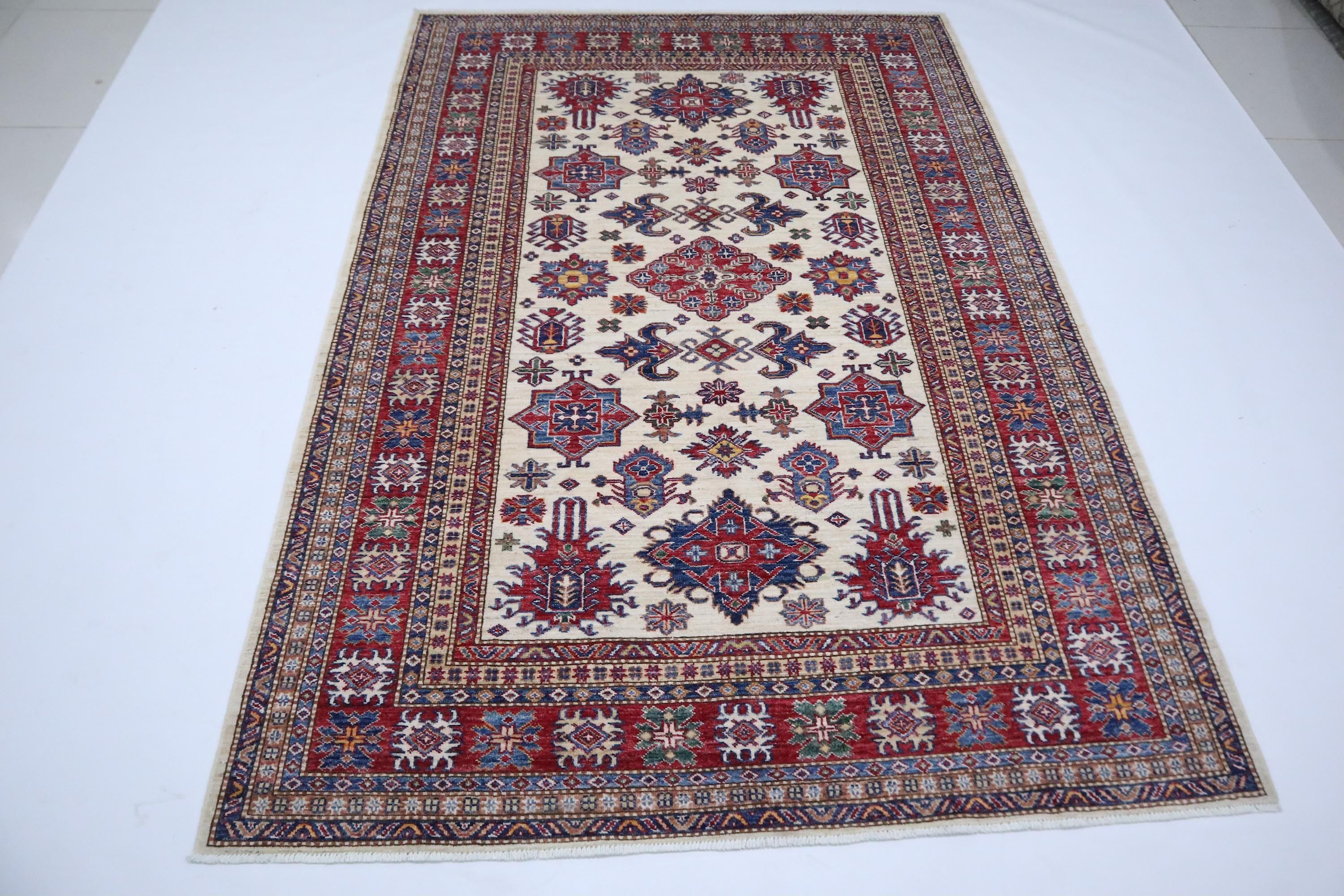 6x8 Kazak Area Rug - Beige Red Afghan Hand Knotted Geometric Design Veg Dye Wool Rug - Traditional Rug - Bedroom Rug - Office Rug - Wool Rug