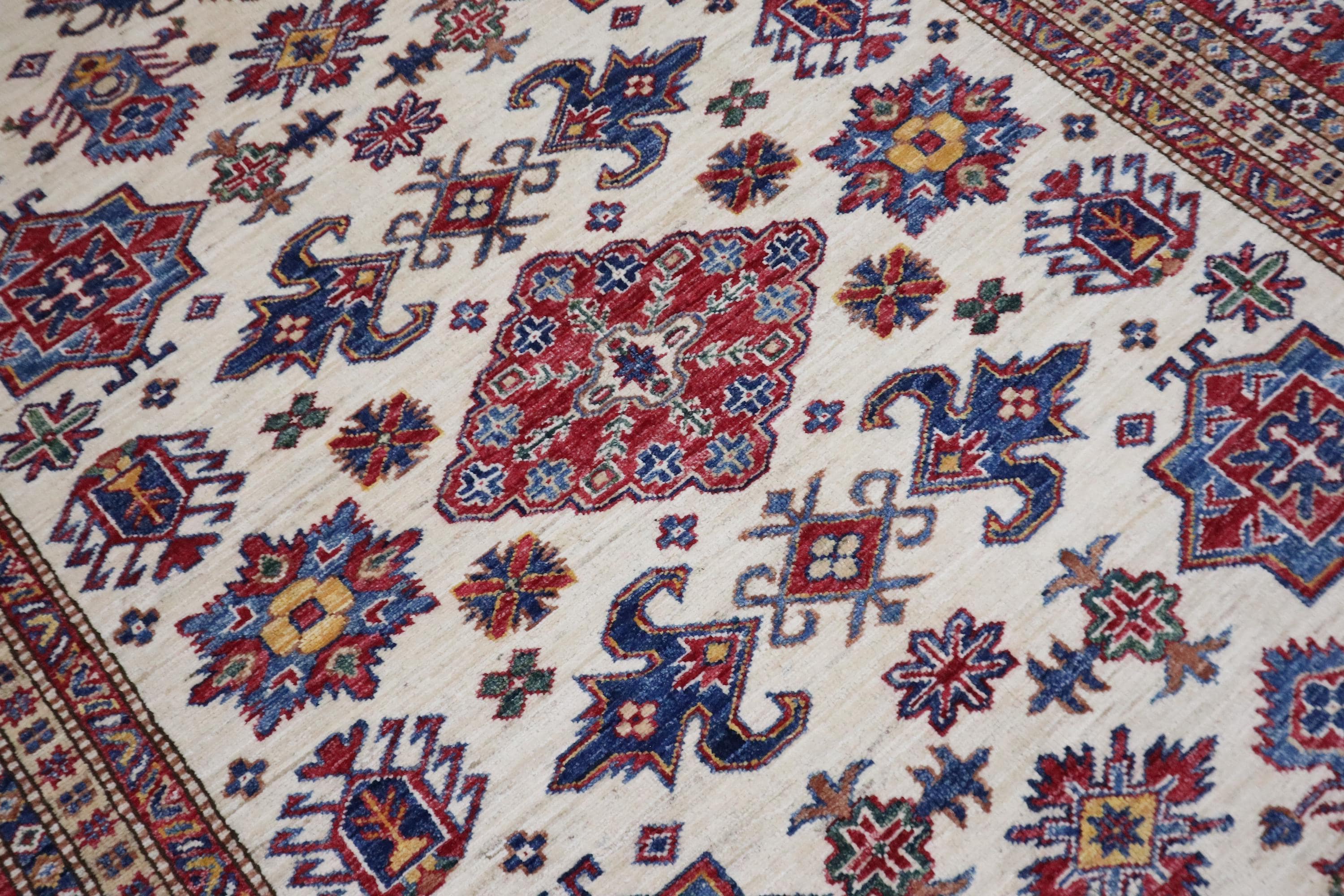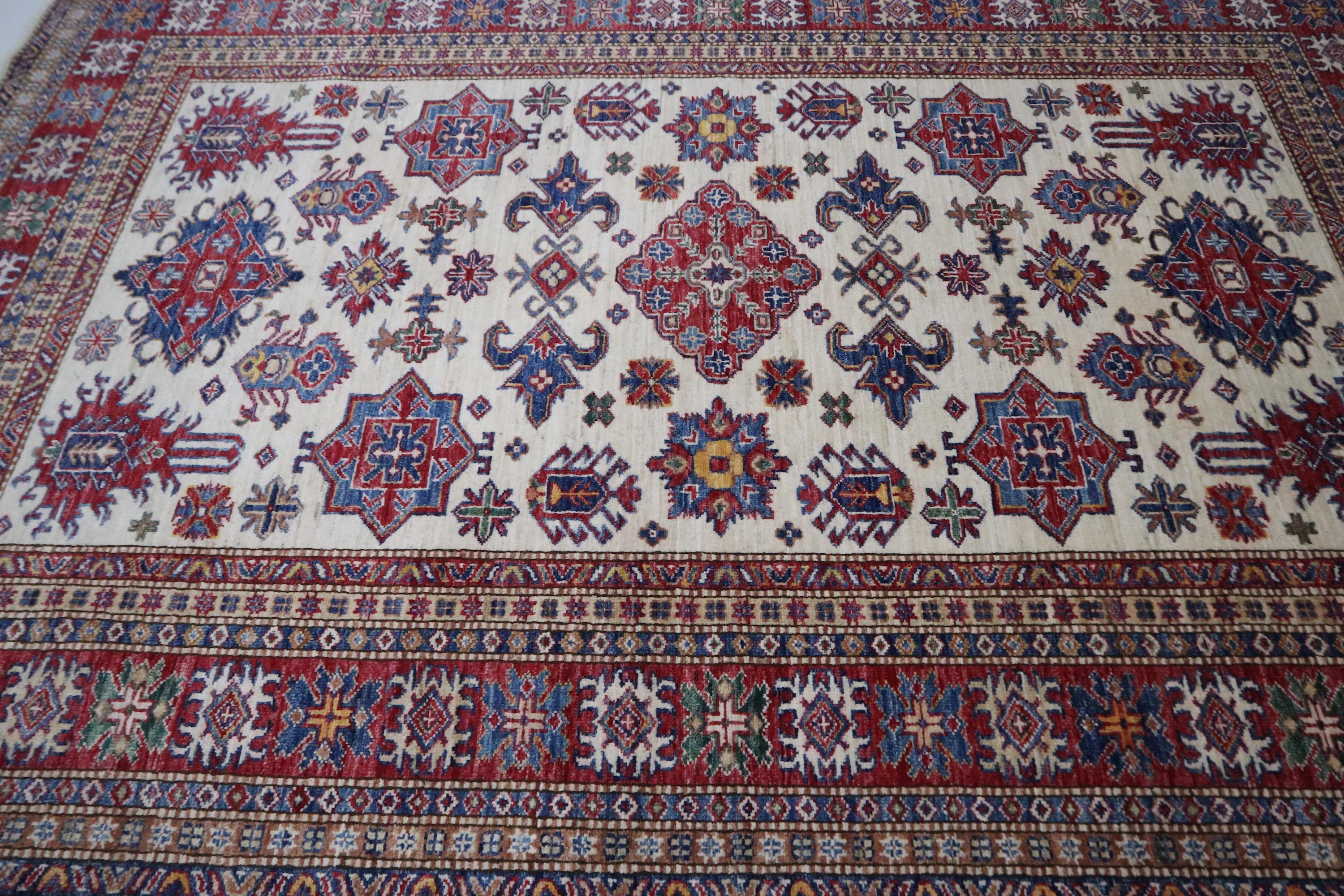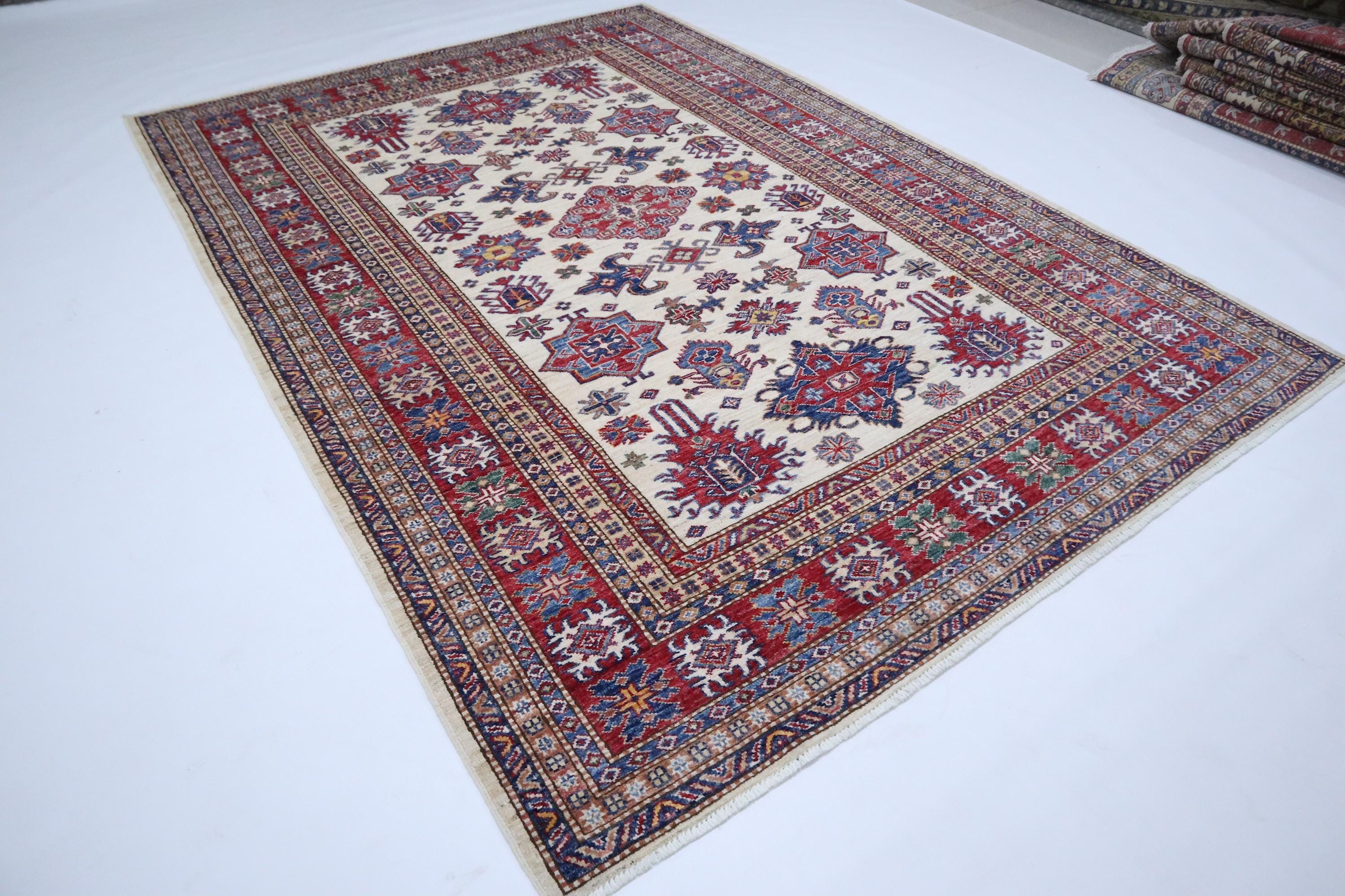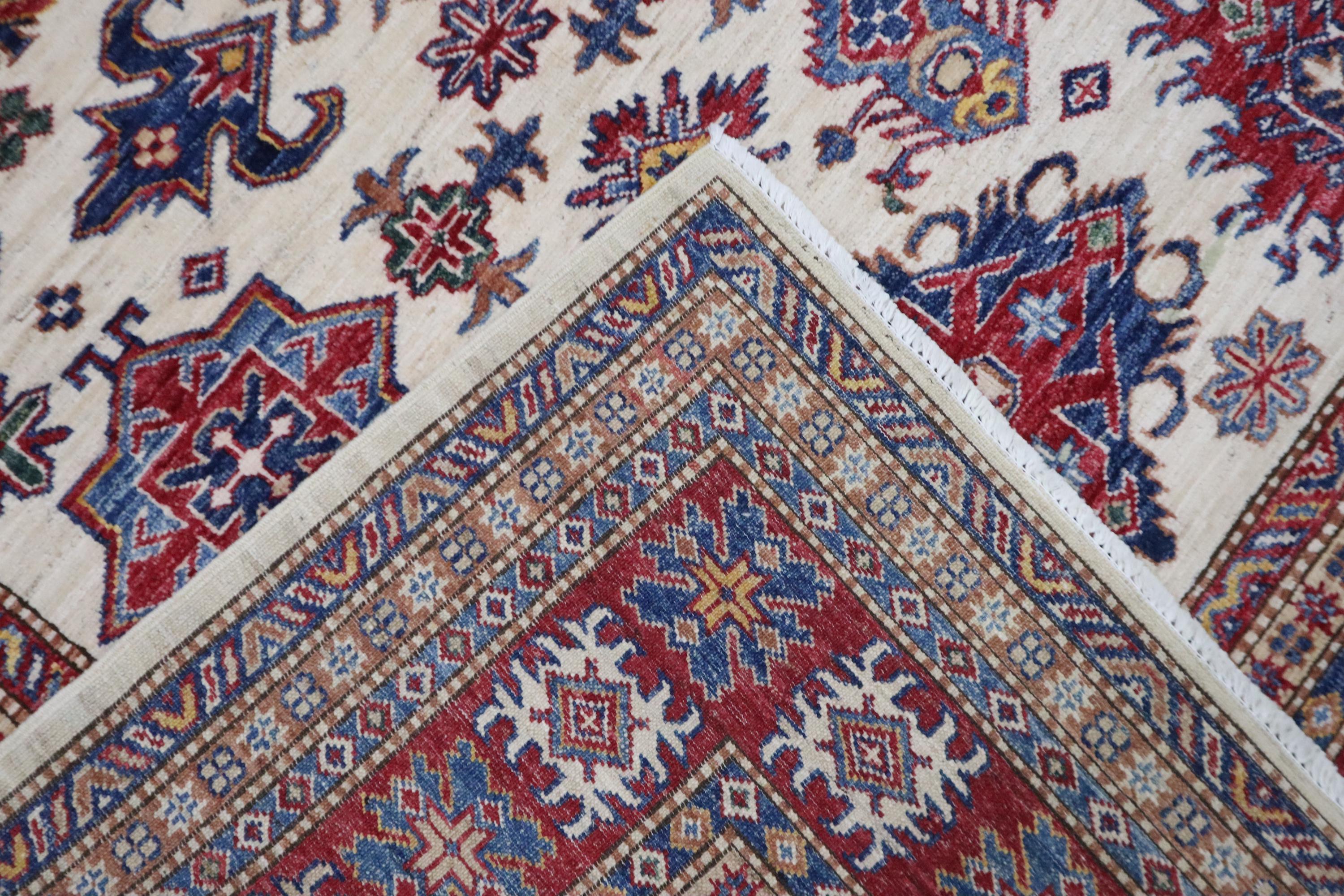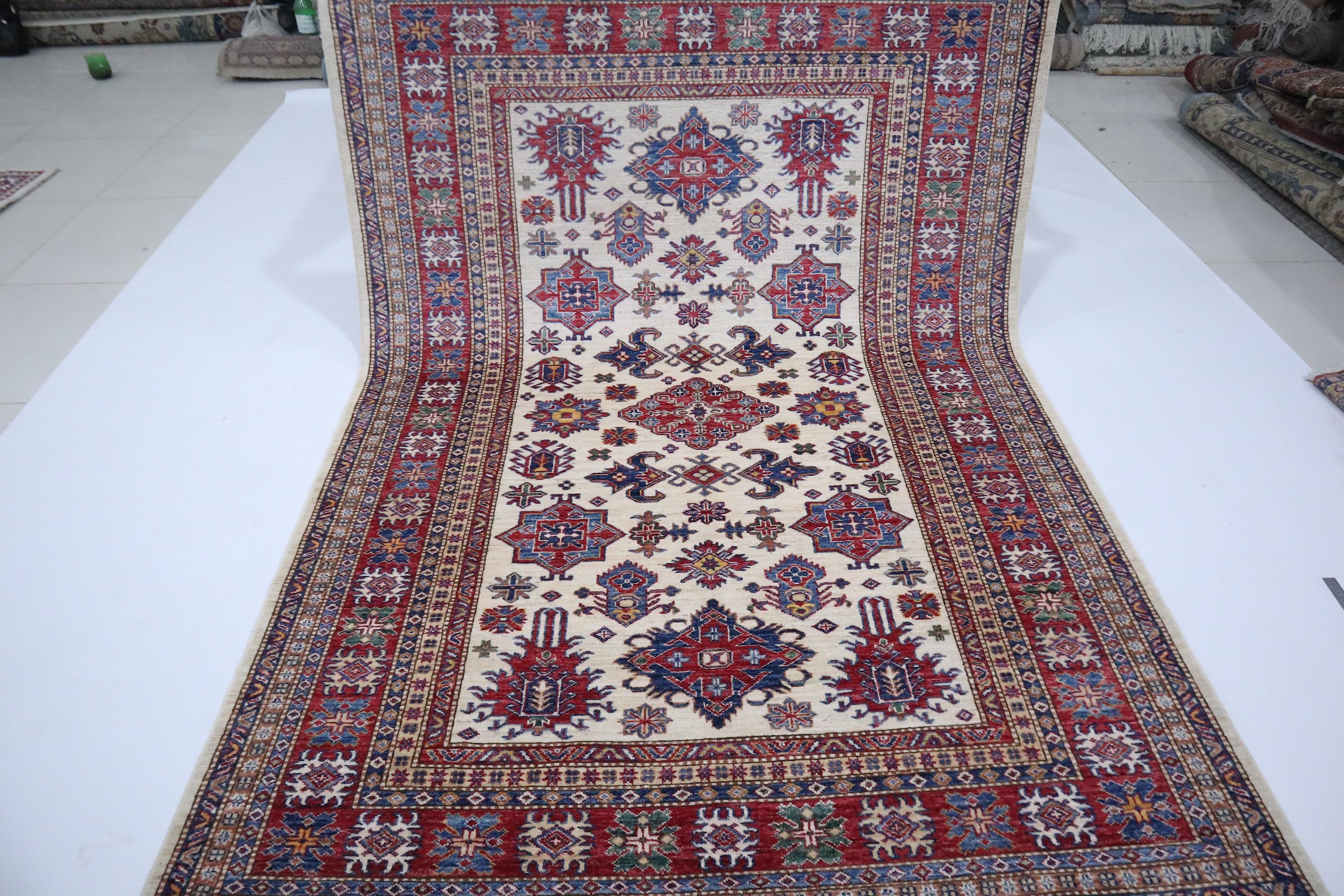 6x8 Kazak Area Rug - Beige Red Afghan Hand Knotted Geometric Design Veg Dye Wool Rug - Traditional Rug - Bedroom Rug - Office Rug - Wool Rug