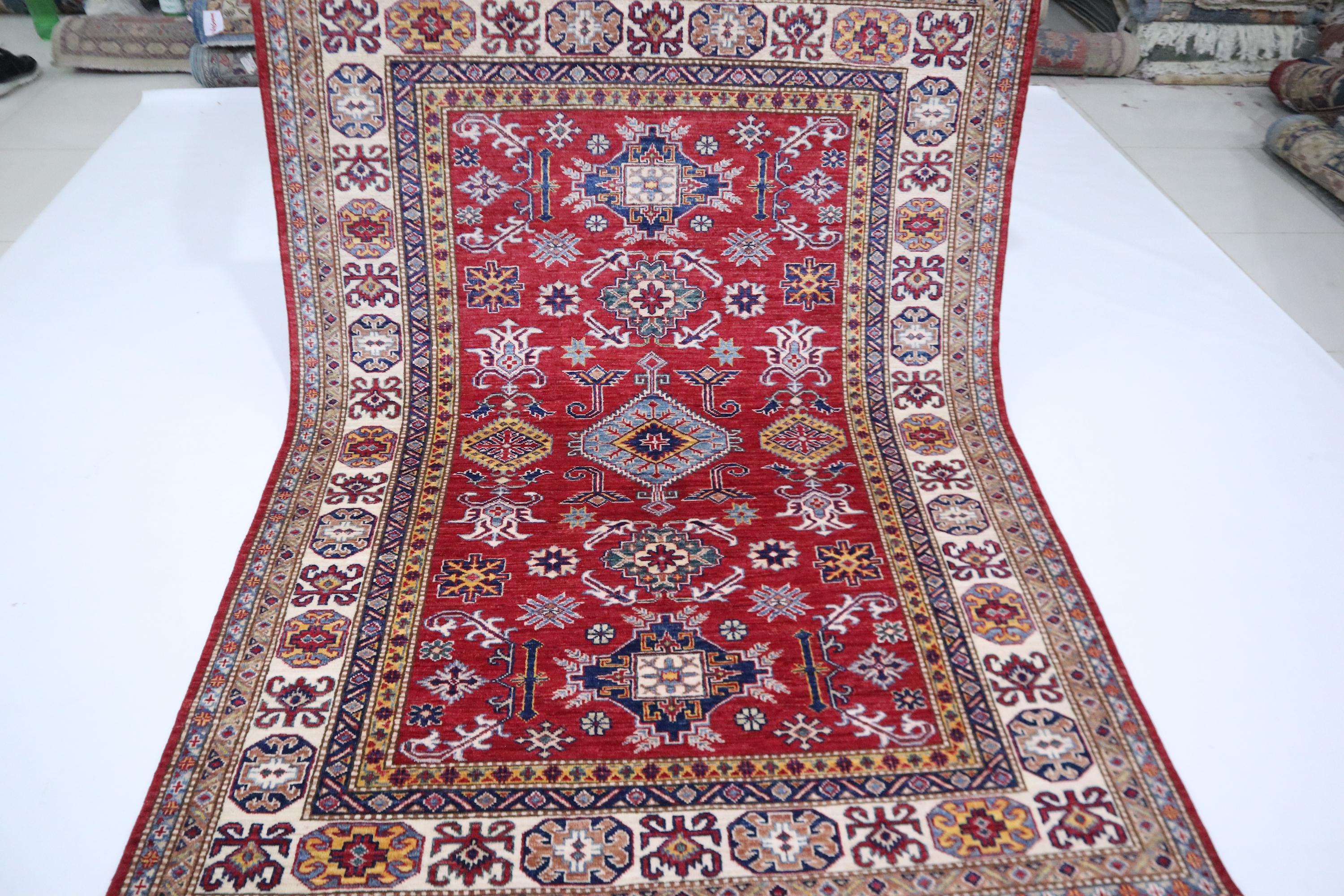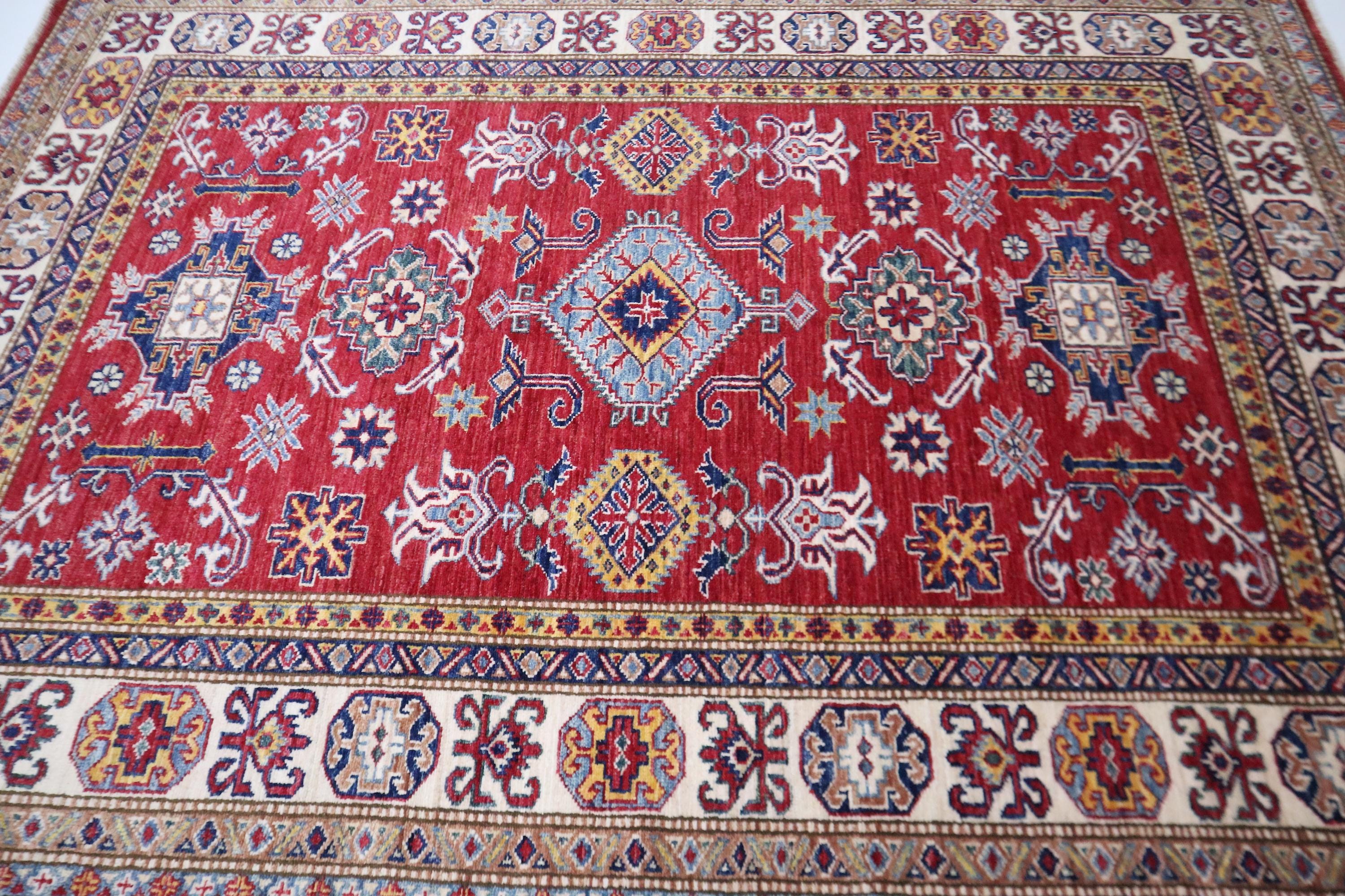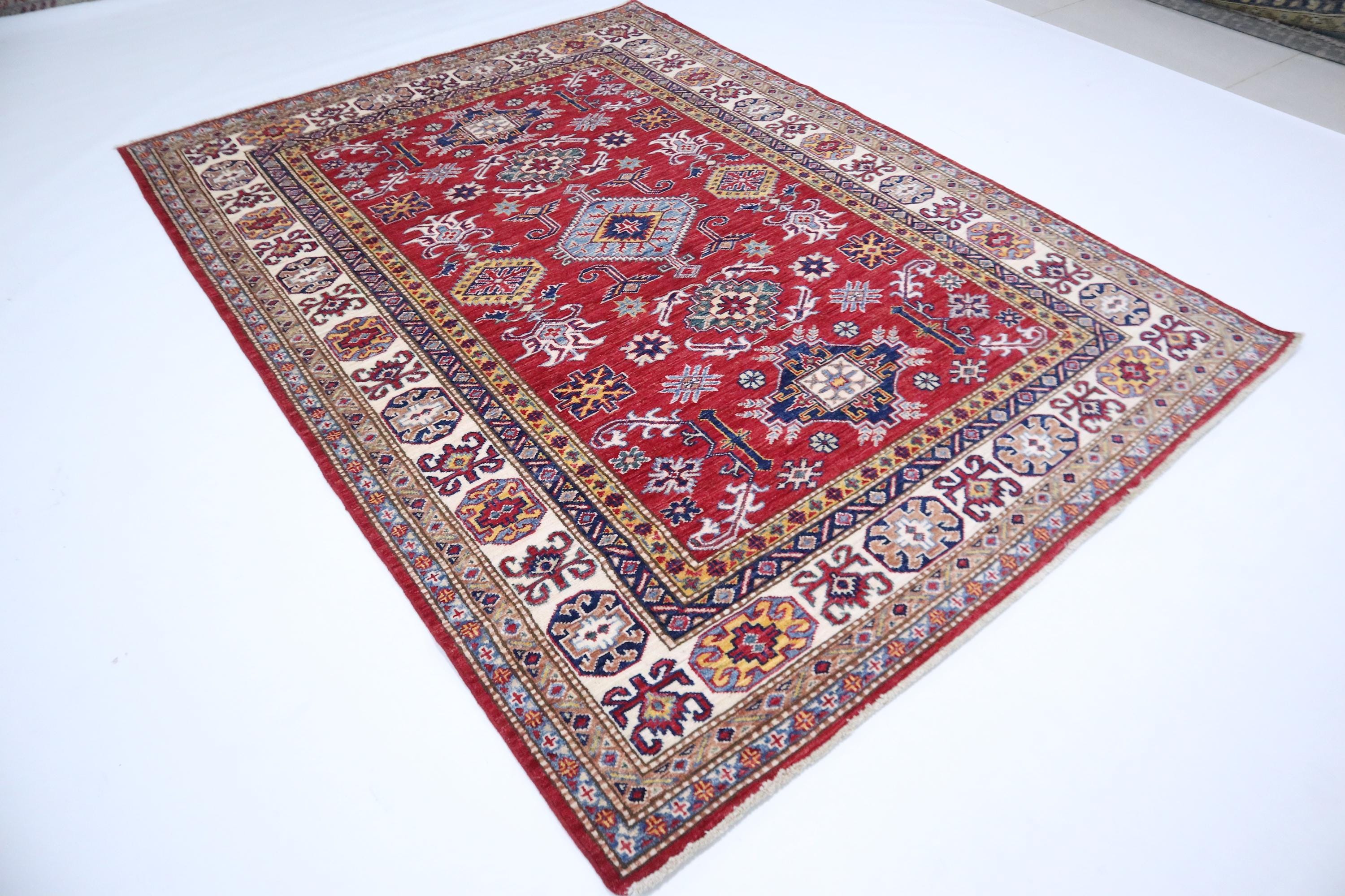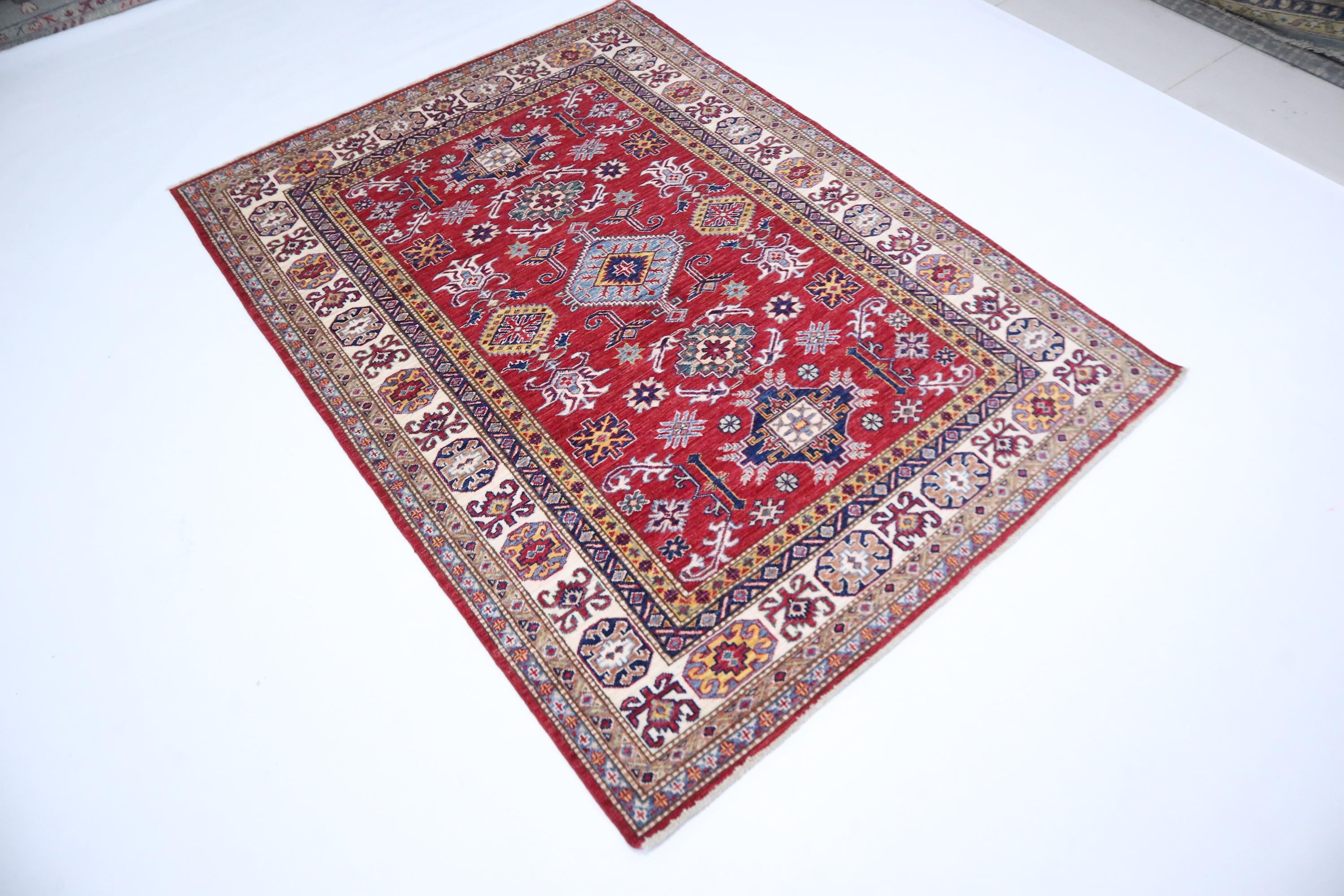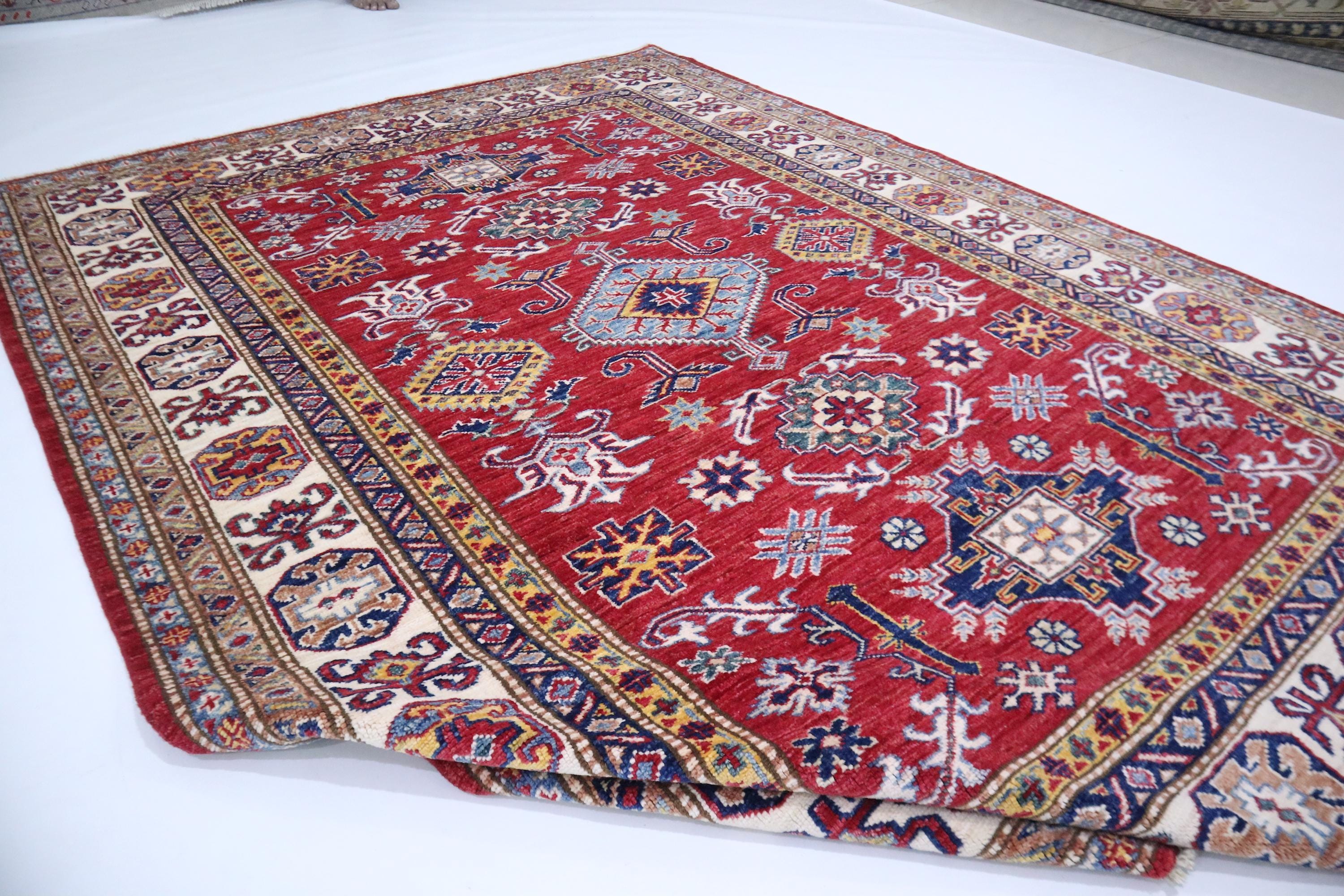 5x7 Kazak Area Rug- Red Afghan Hand Knotted Traditional Natural Dye Wool Rug - Geometric Rug - Bedroom Rug - Kitchen Rug - Living Room Rug