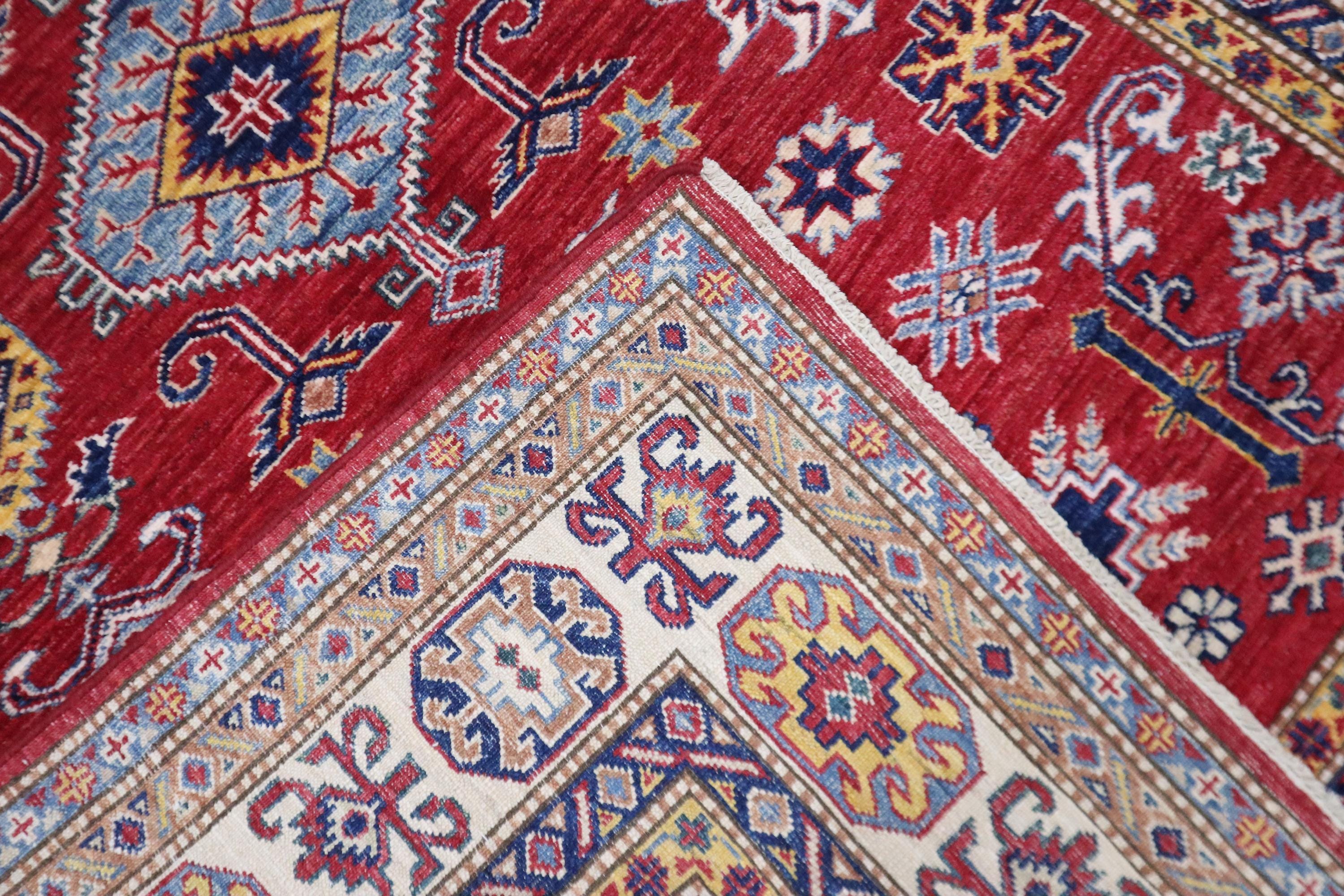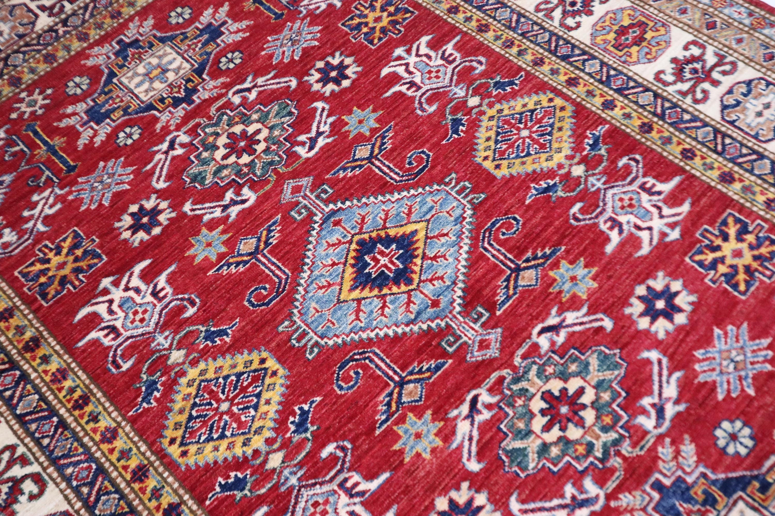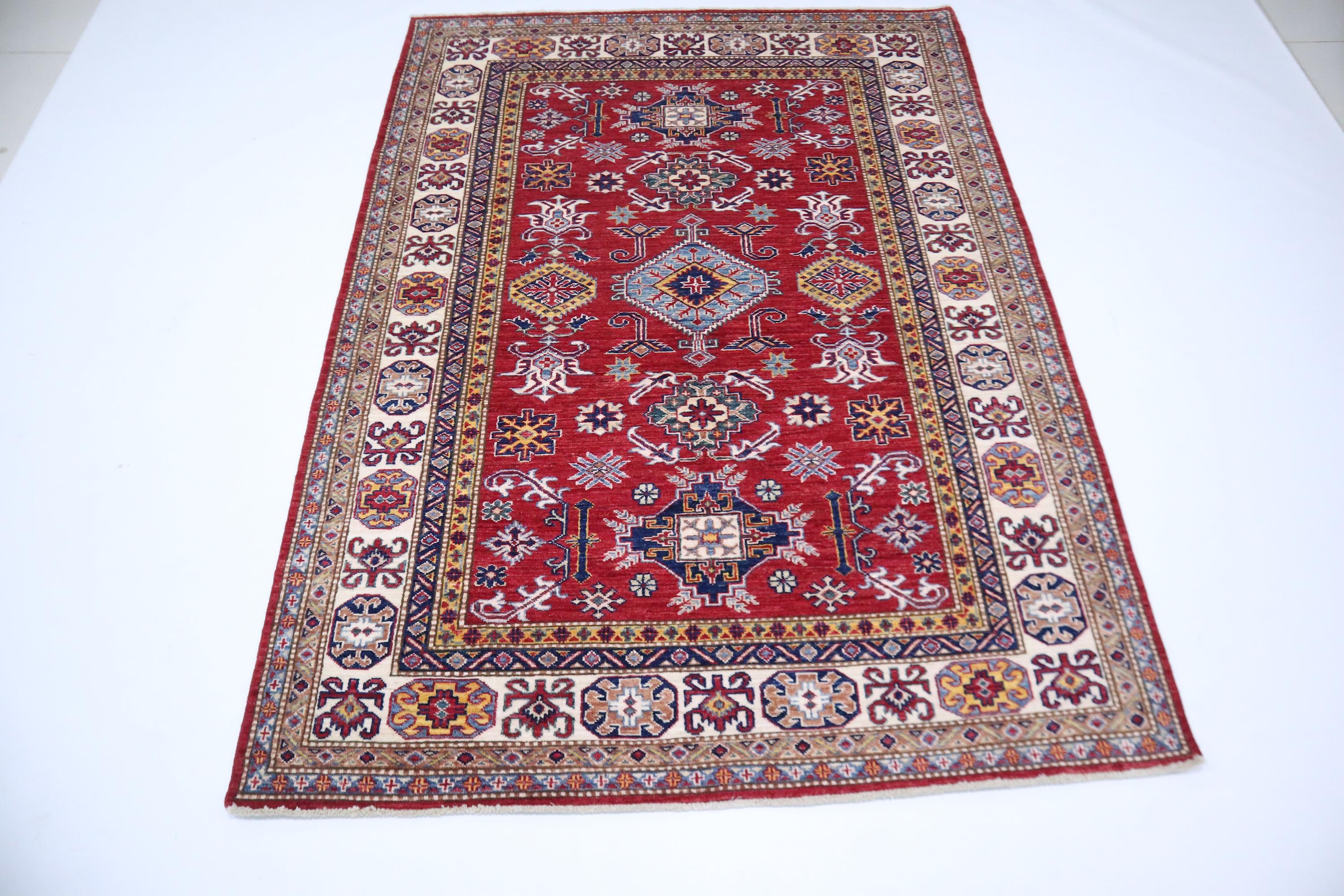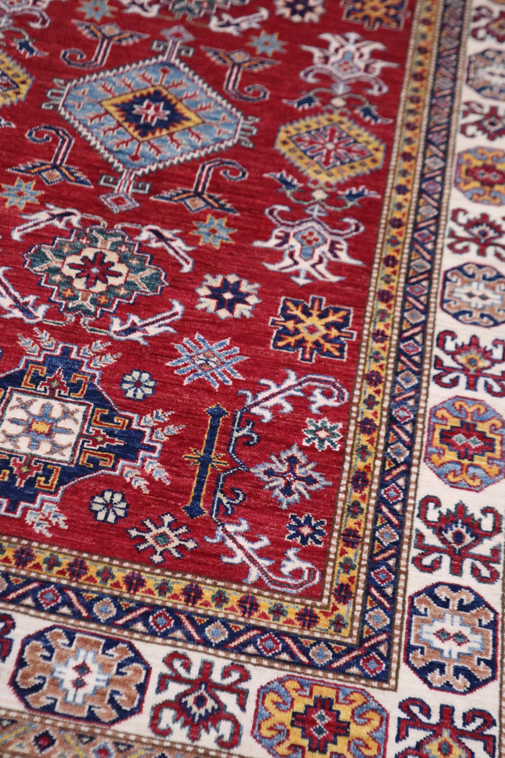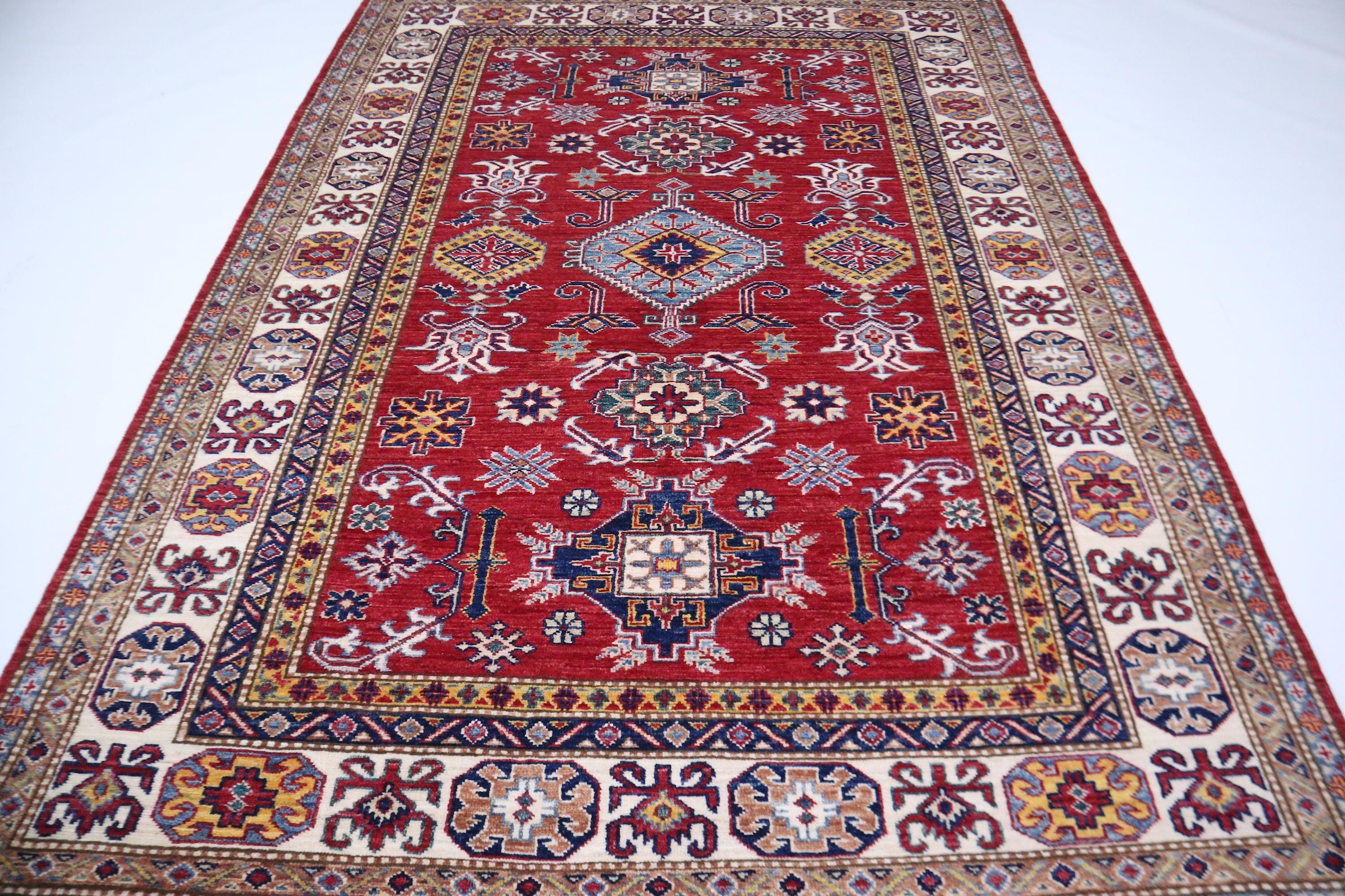 5x7 Kazak Area Rug- Red Afghan Hand Knotted Traditional Natural Dye Wool Rug - Geometric Rug - Bedroom Rug - Kitchen Rug - Living Room Rug