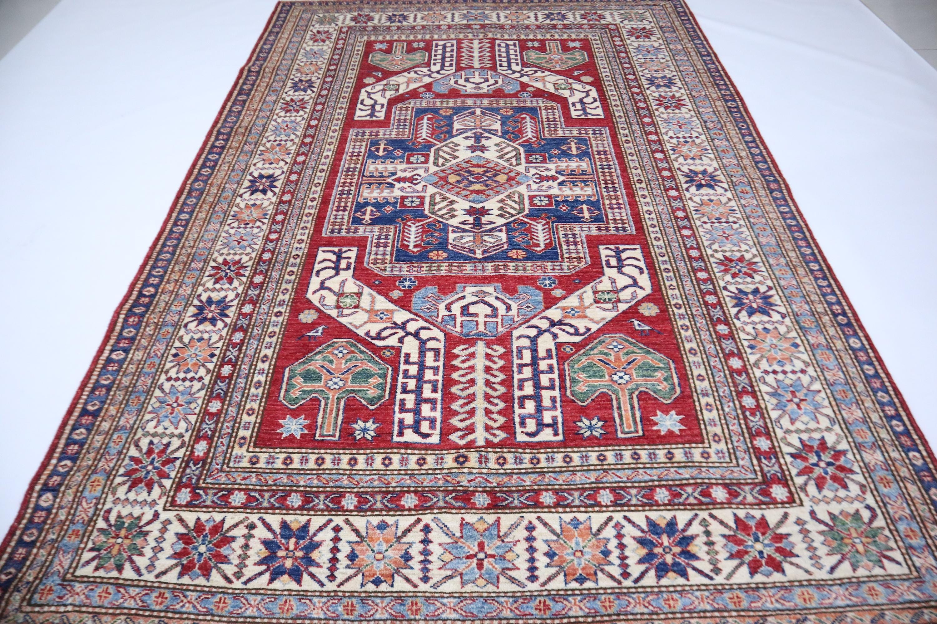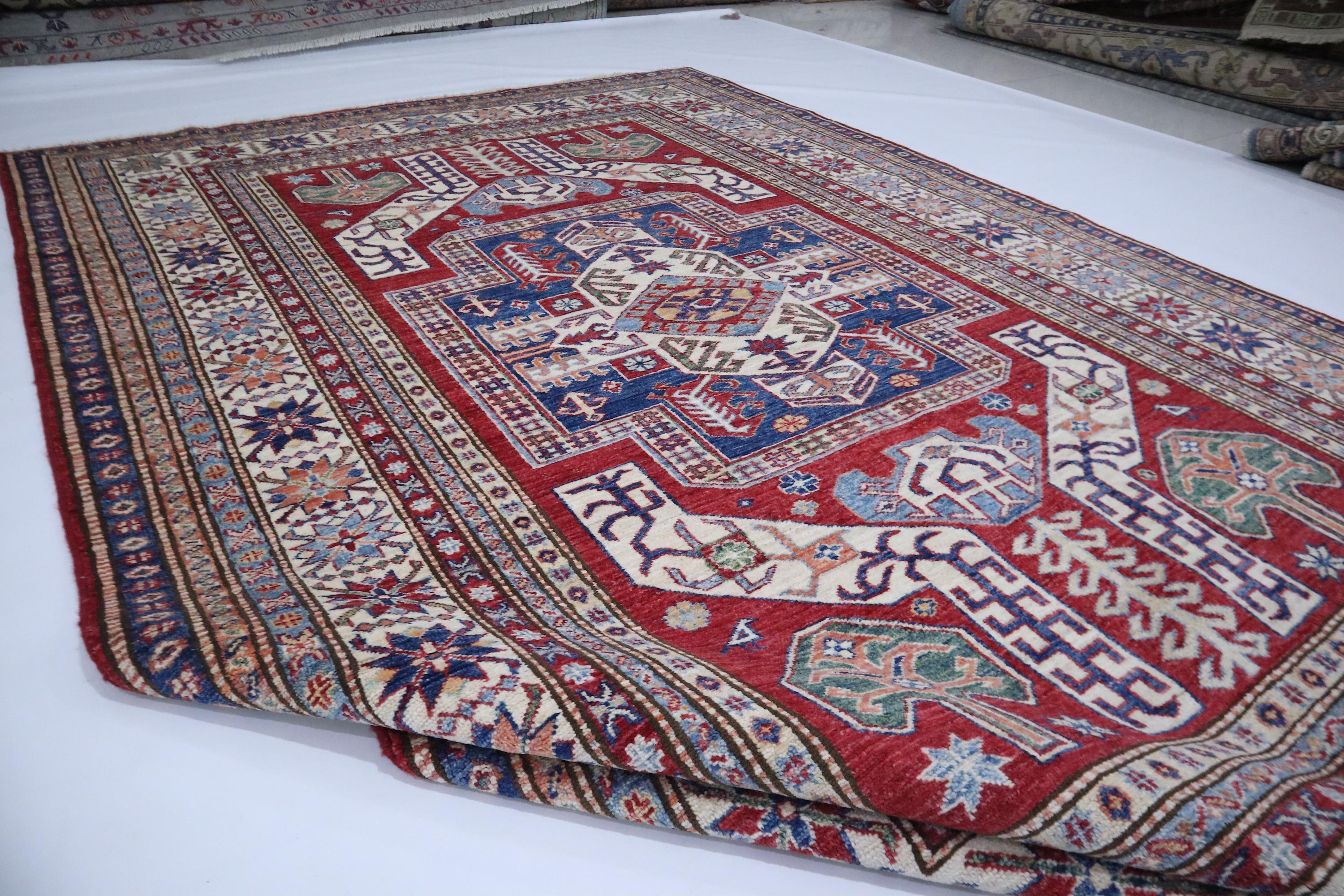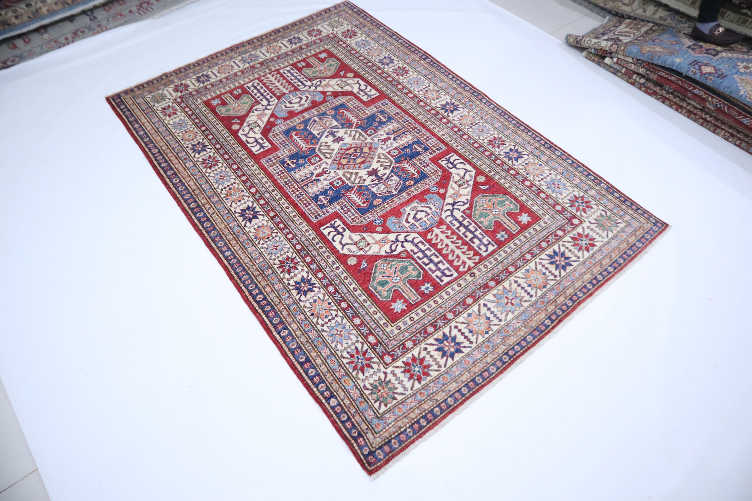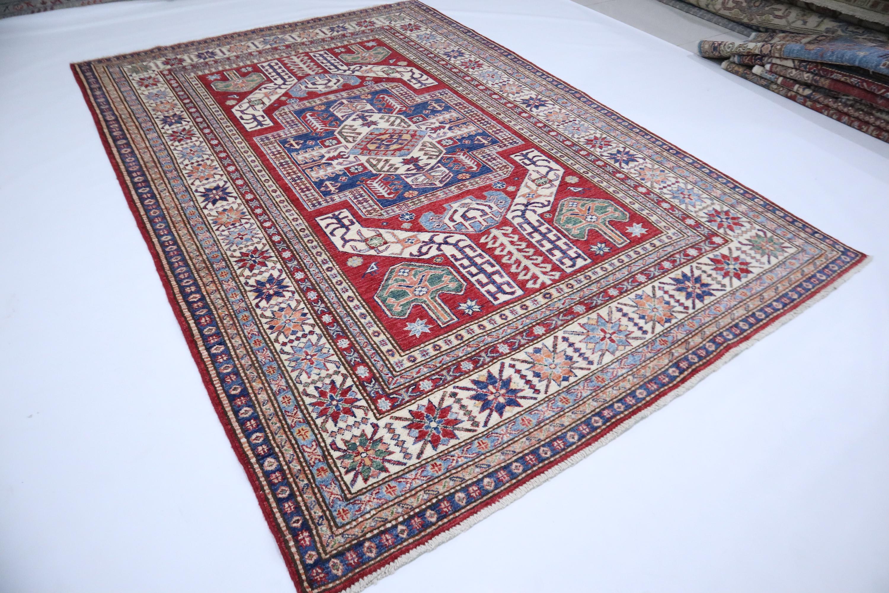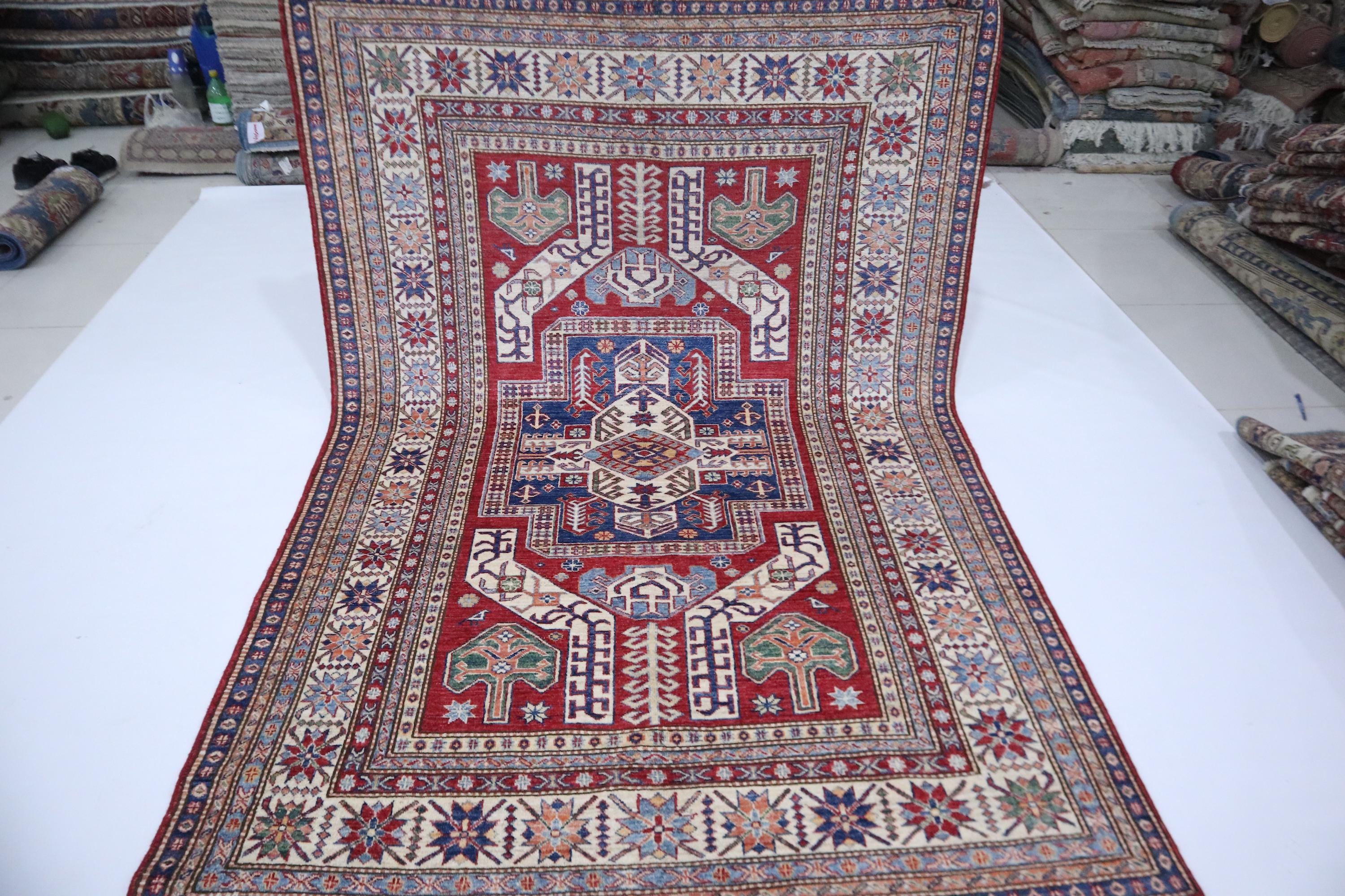 5x8 Kazak Area Rug - Red Afghan Handmade Geometric Pattern Veg Dye Wool Rug - Traditional Rug - Oriental Rug - Bedroom Rug - Living Room Rug