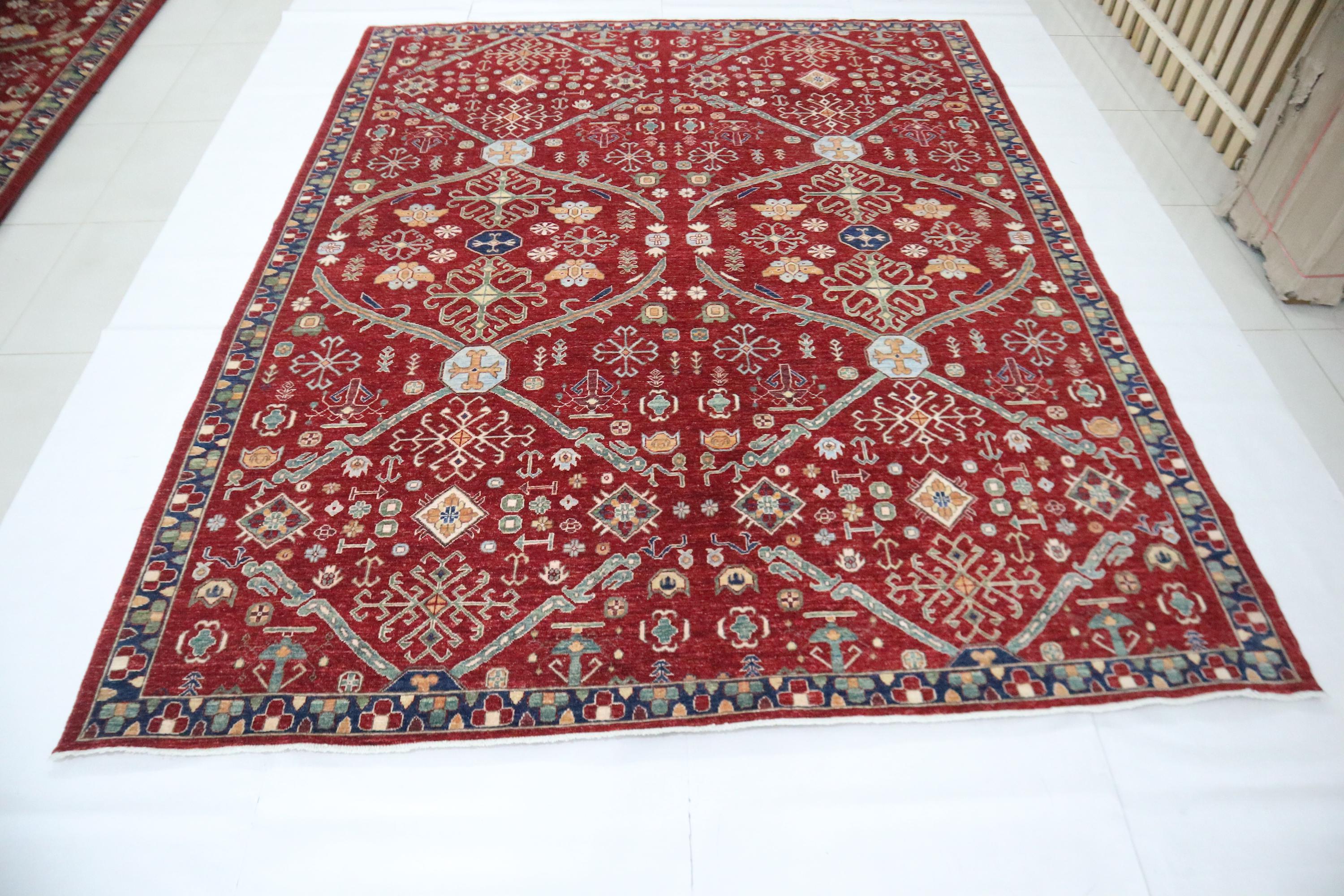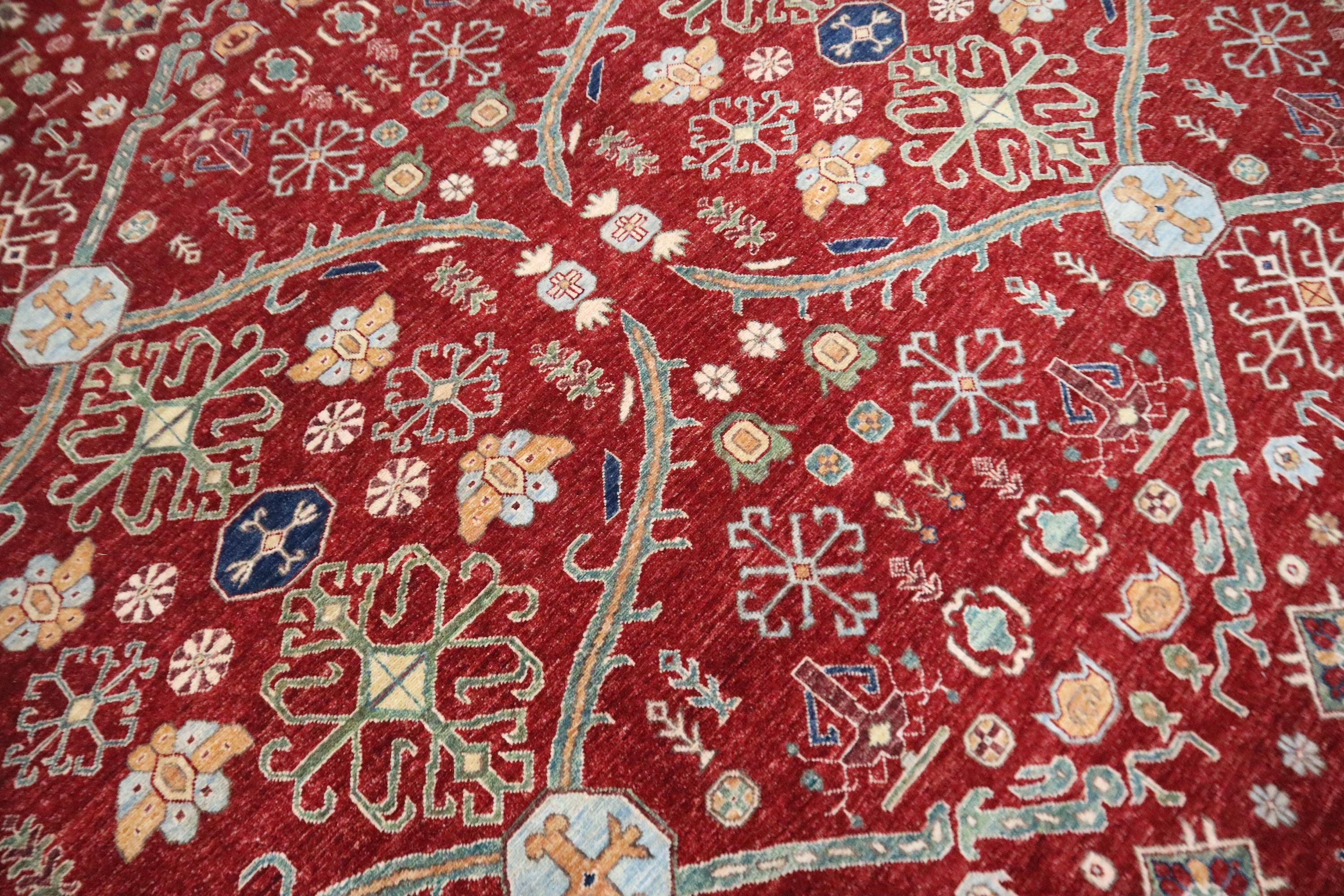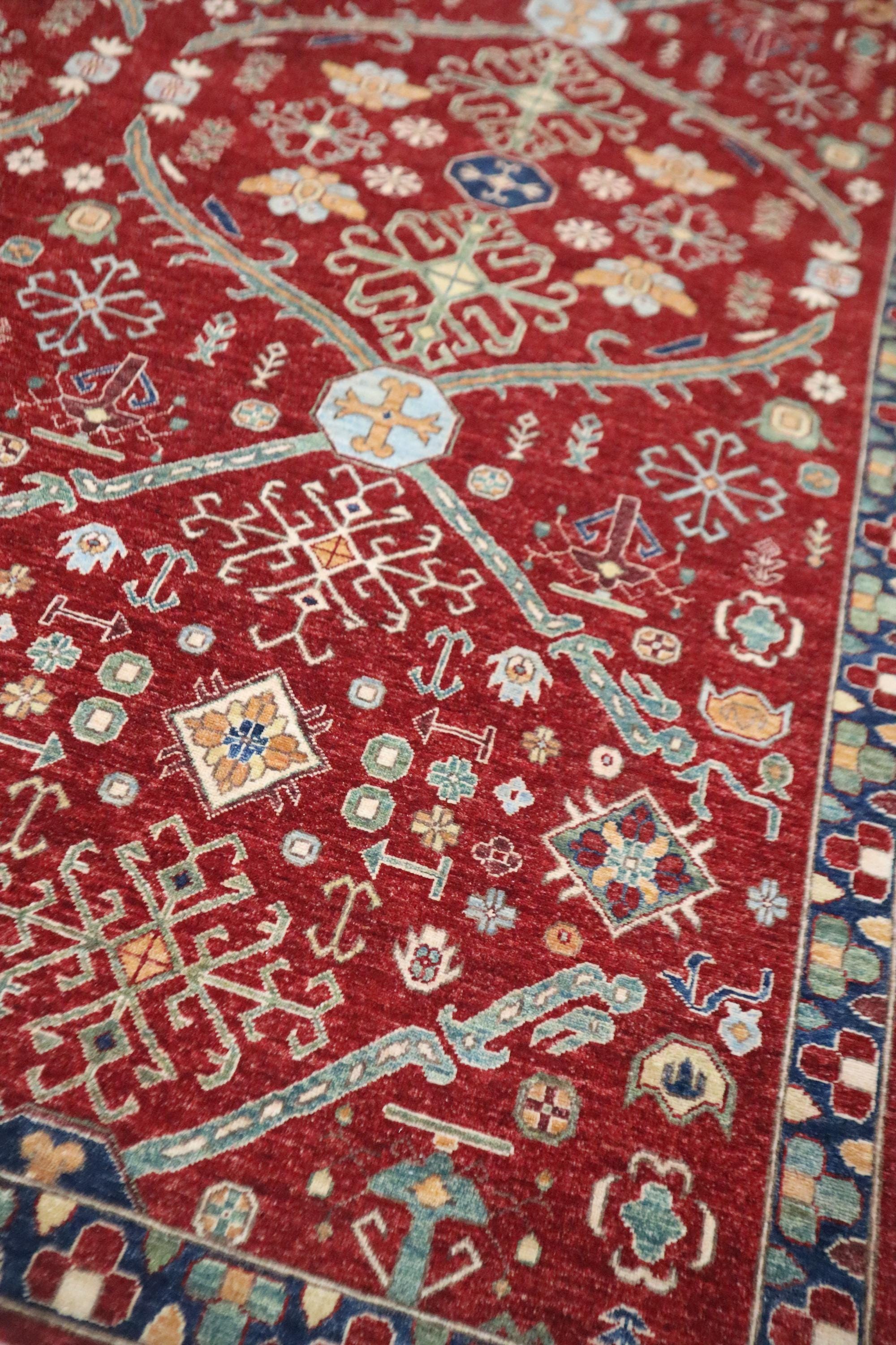 This hand-knotted pile rug is crafted using 100% natural dyes and handspun wool, giving it a rich texture and vibrant colors.