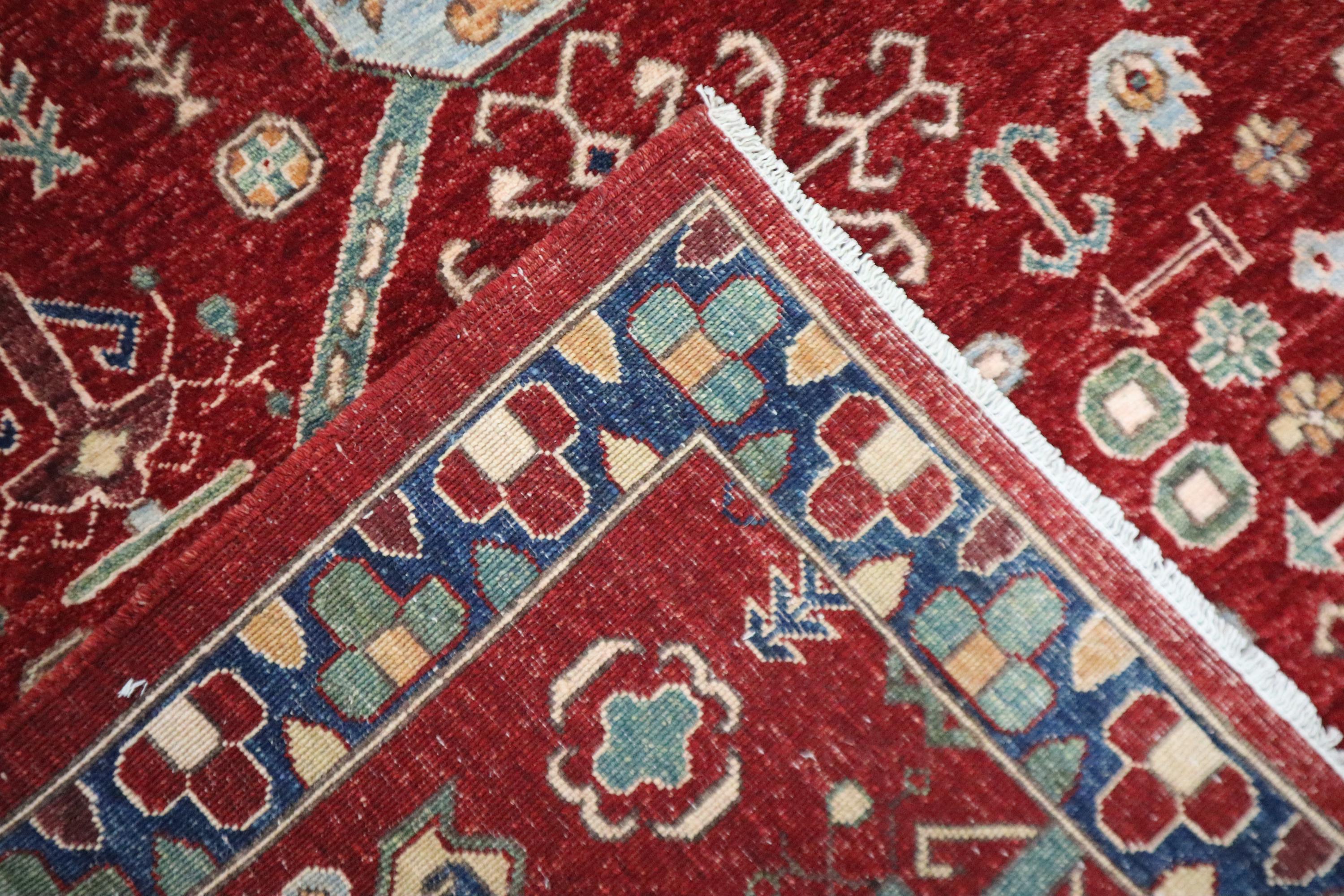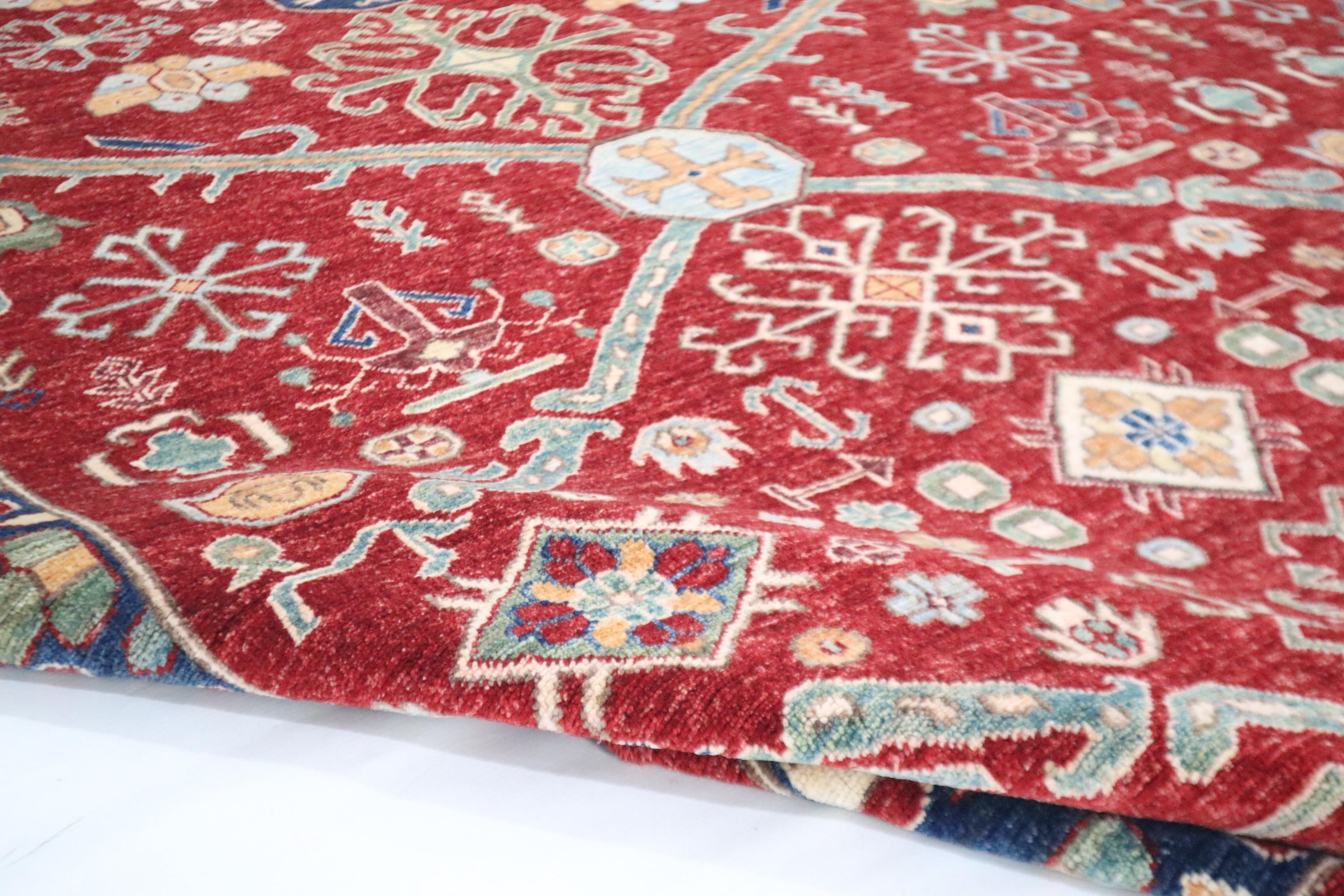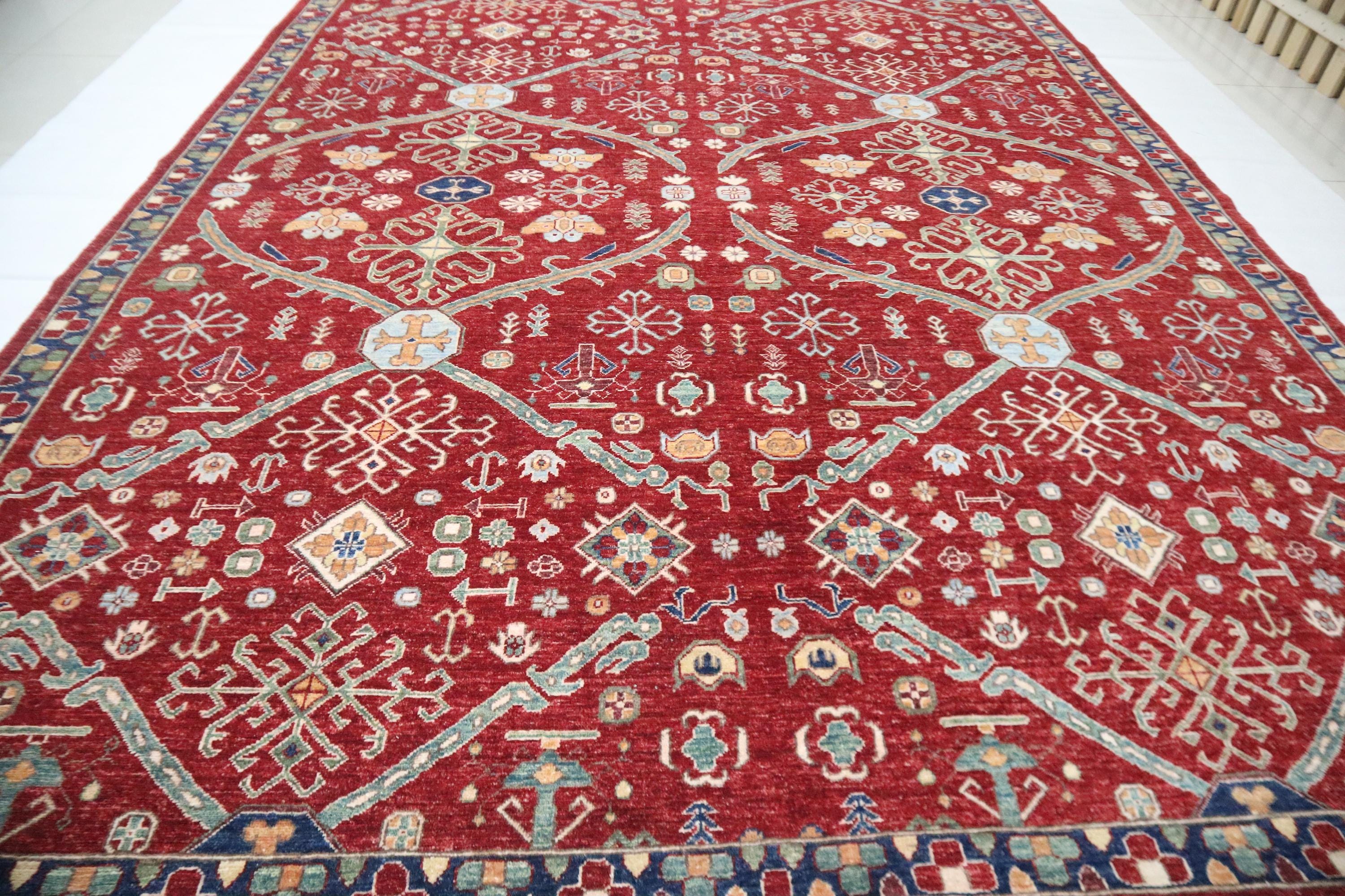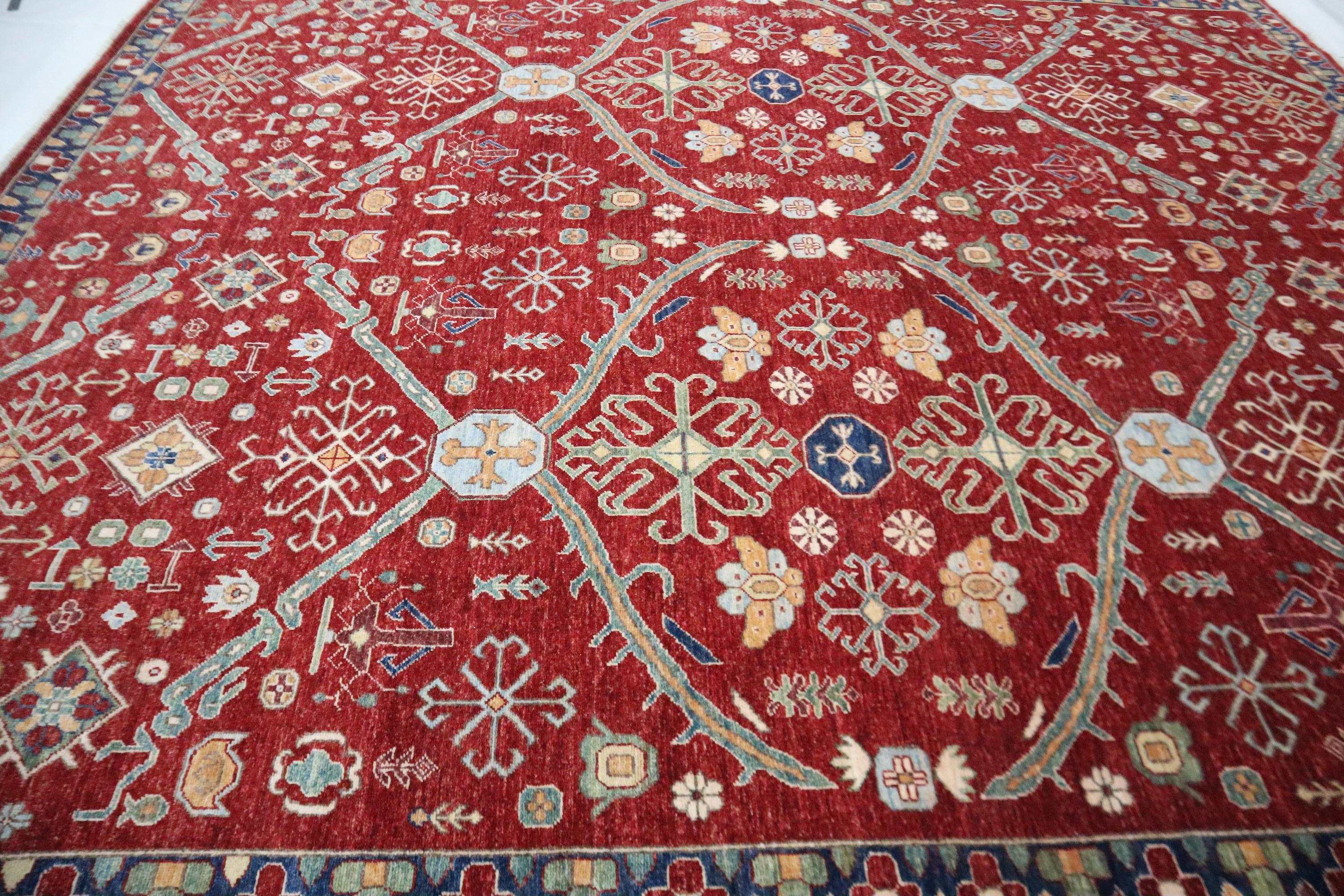 This hand-knotted pile rug is crafted using 100% natural dyes and handspun wool, giving it a rich texture and vibrant colors.
