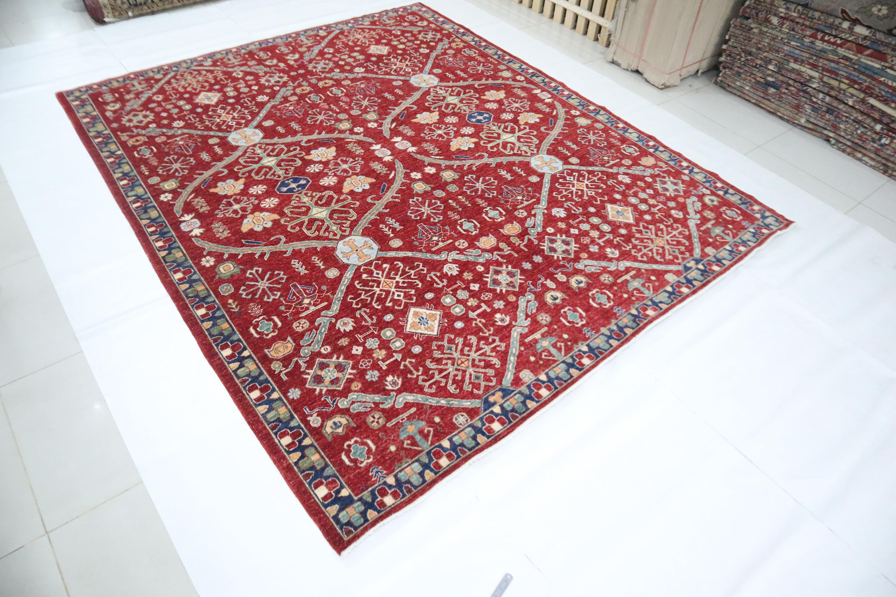 8x10 Chobi Fine Quality Area Rug - Deep Red Afghan Hand Knotted Traditional Organic Dye Wool Rug - Oriental Rug - Living Room Rug - Wool Rug