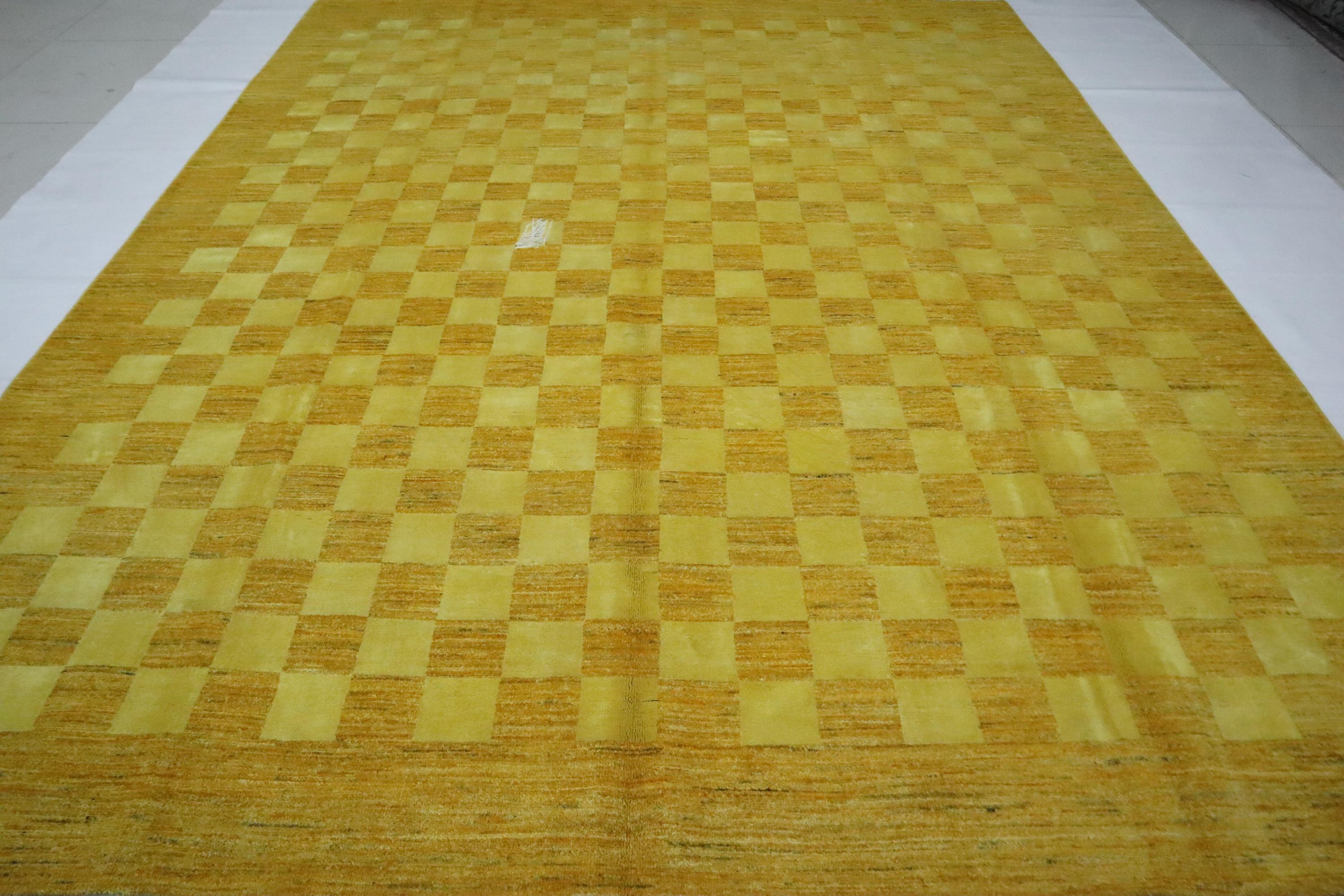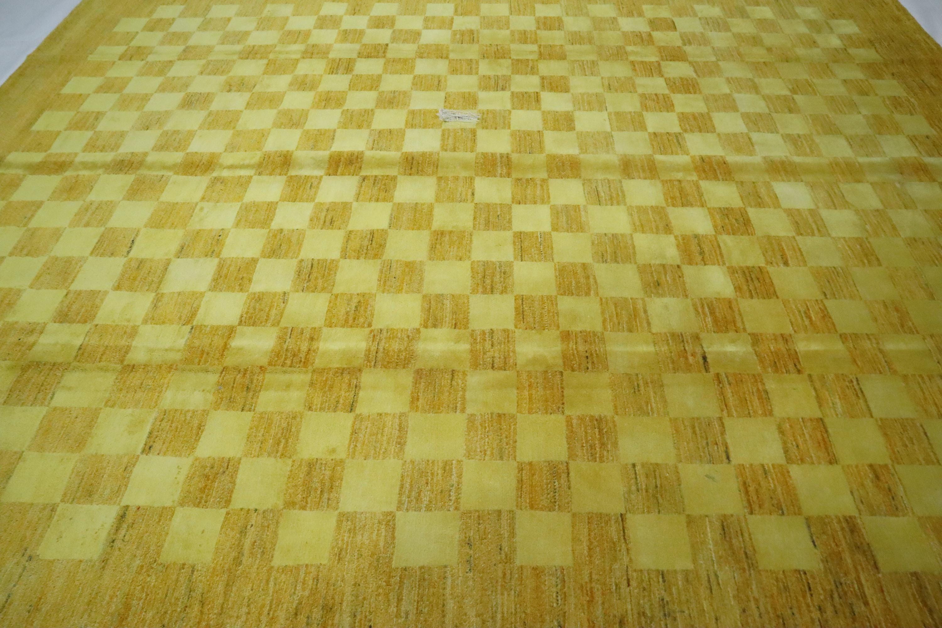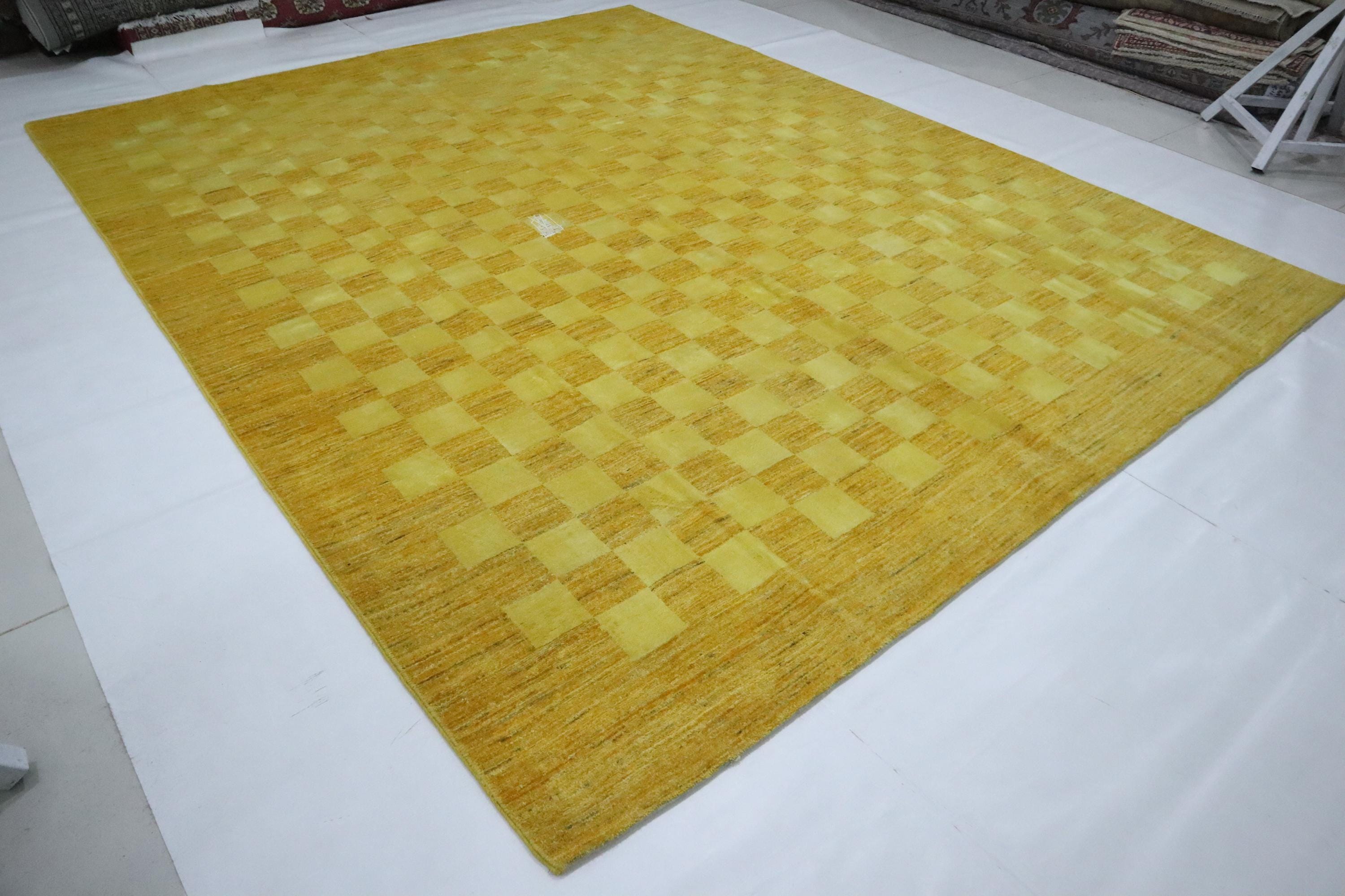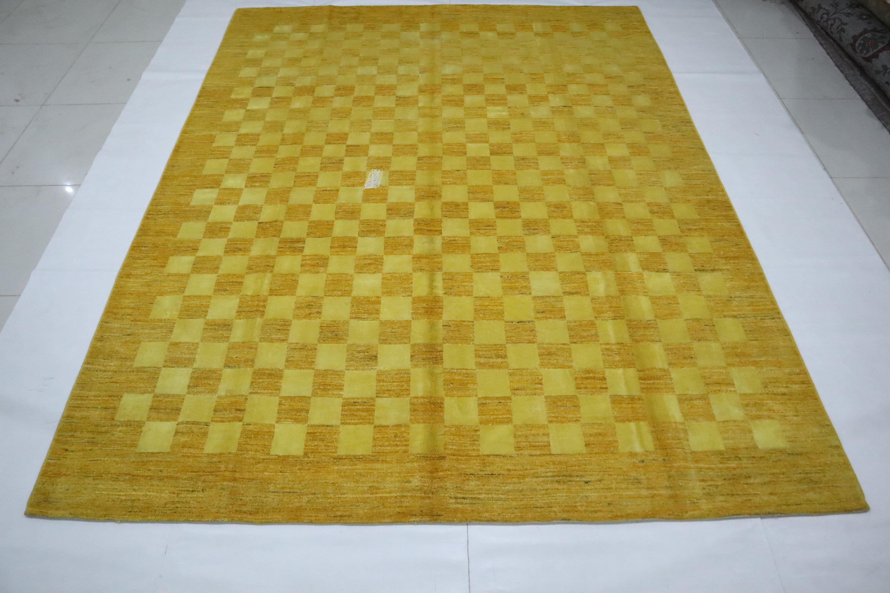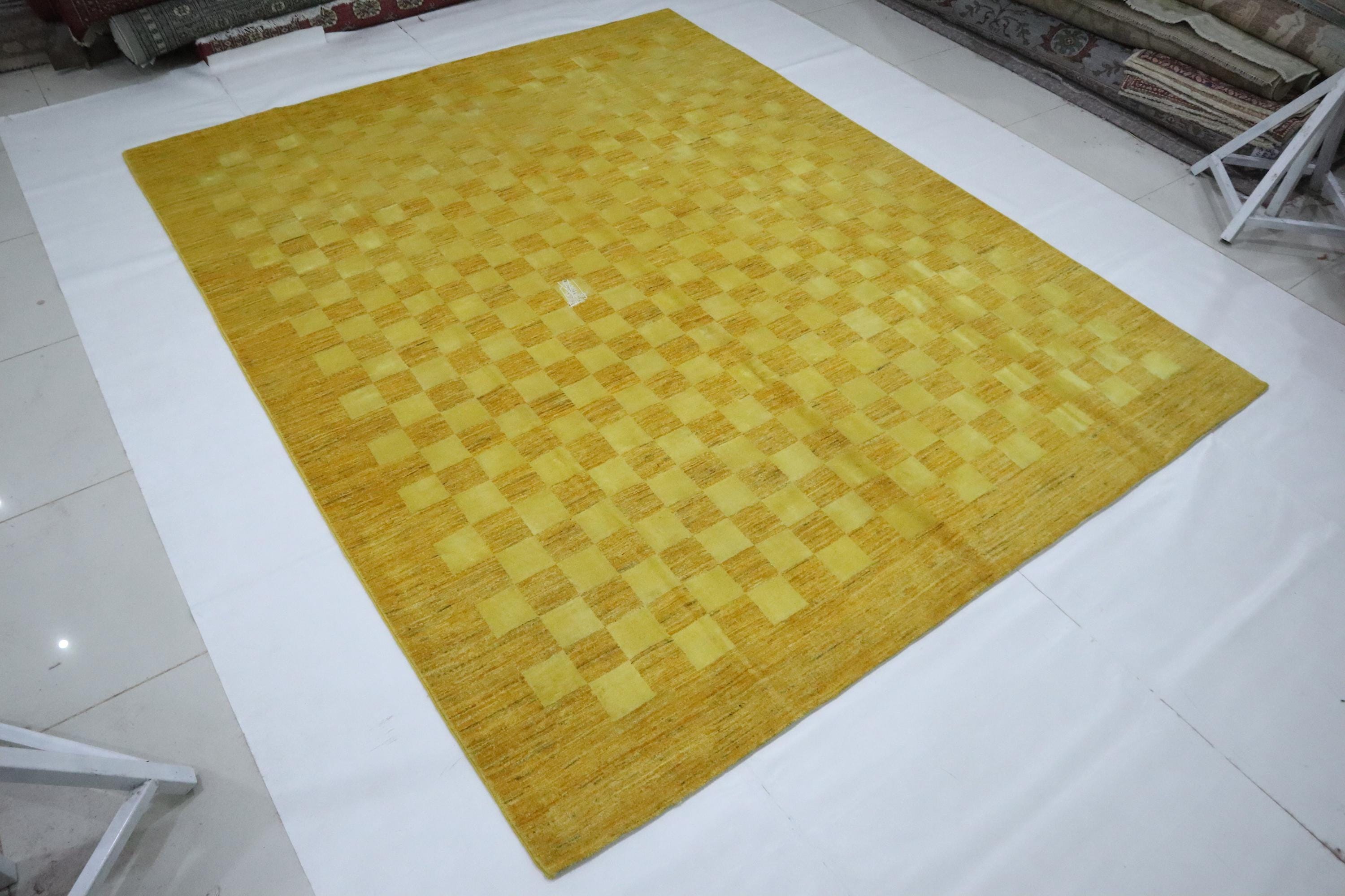 8x10 Gabbeh Area Rug - Golden Yellow Afghan Handmade Checkered Lori Baft Wool Rug - Check Design Rug - Living Room Rug - Dining Room Rug