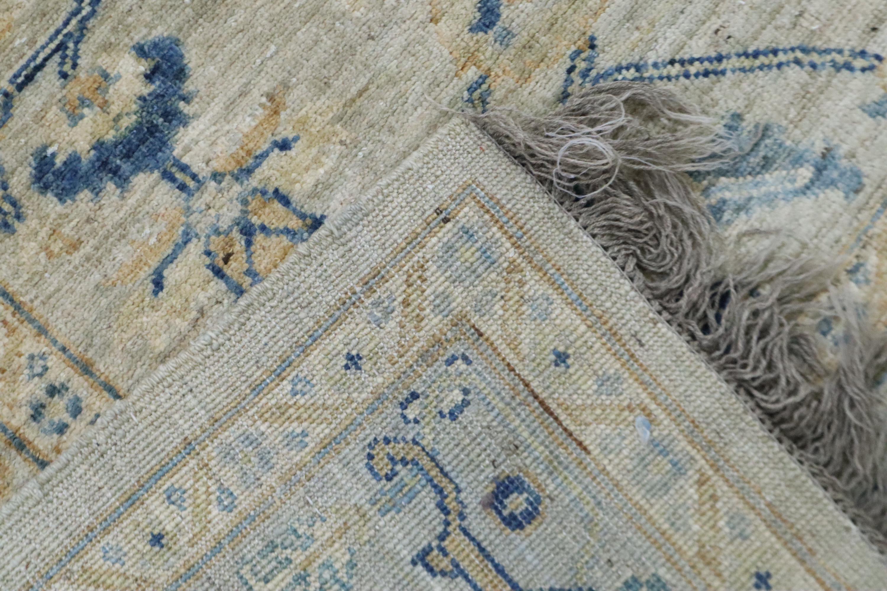 This hand-knotted pile rug is crafted using 100% natural dyes and handspun wool, giving it a rich texture and vibrant colors.