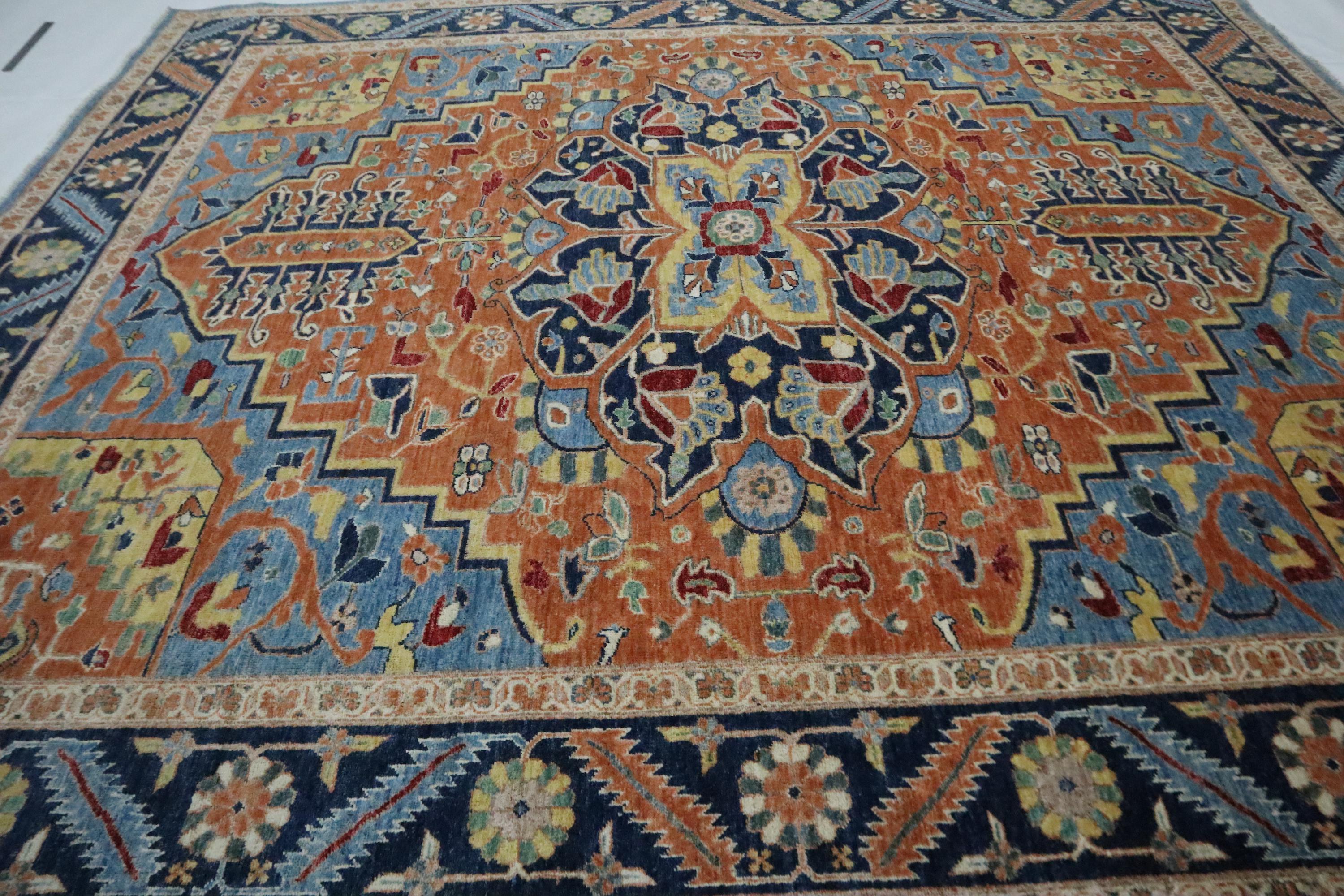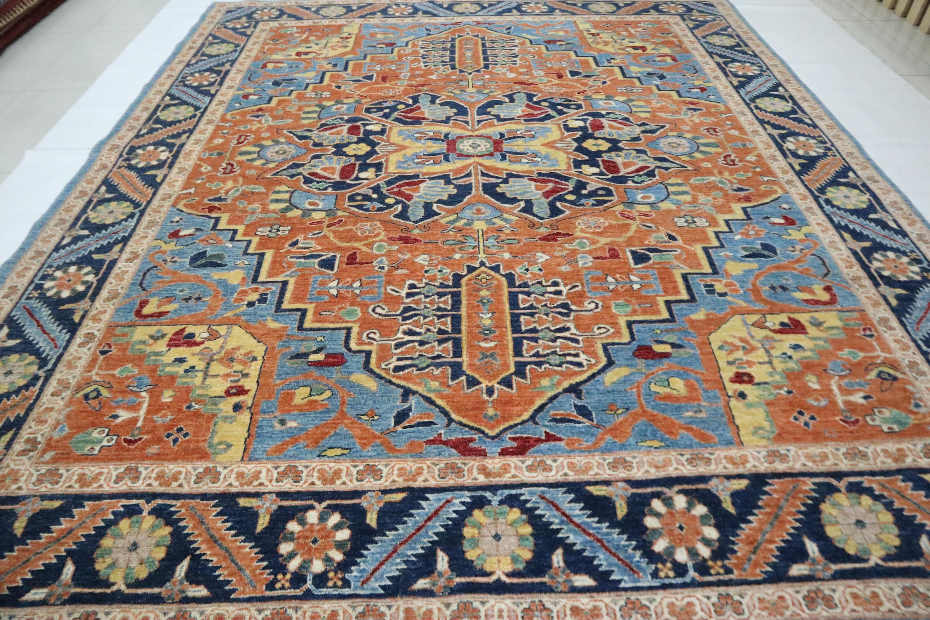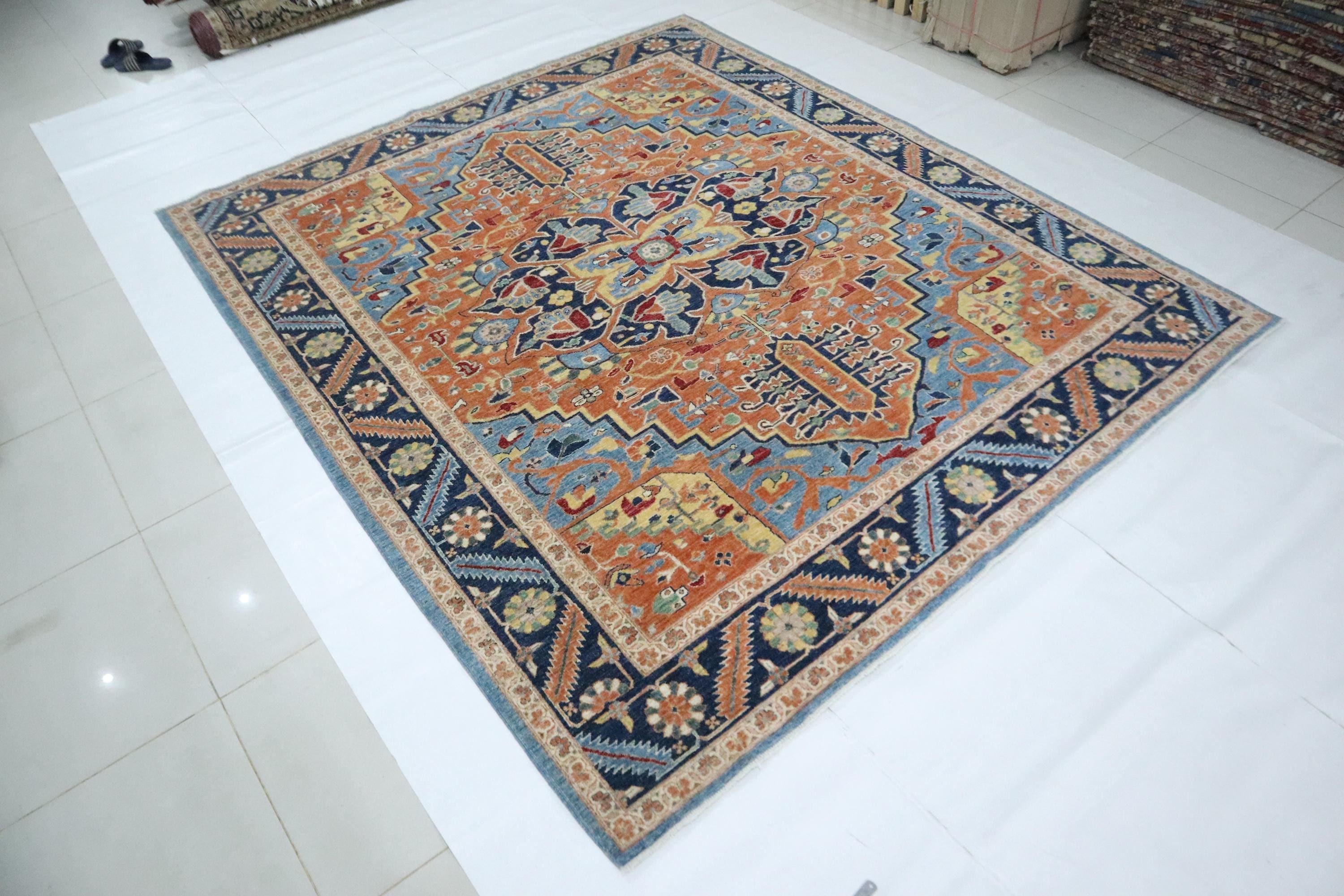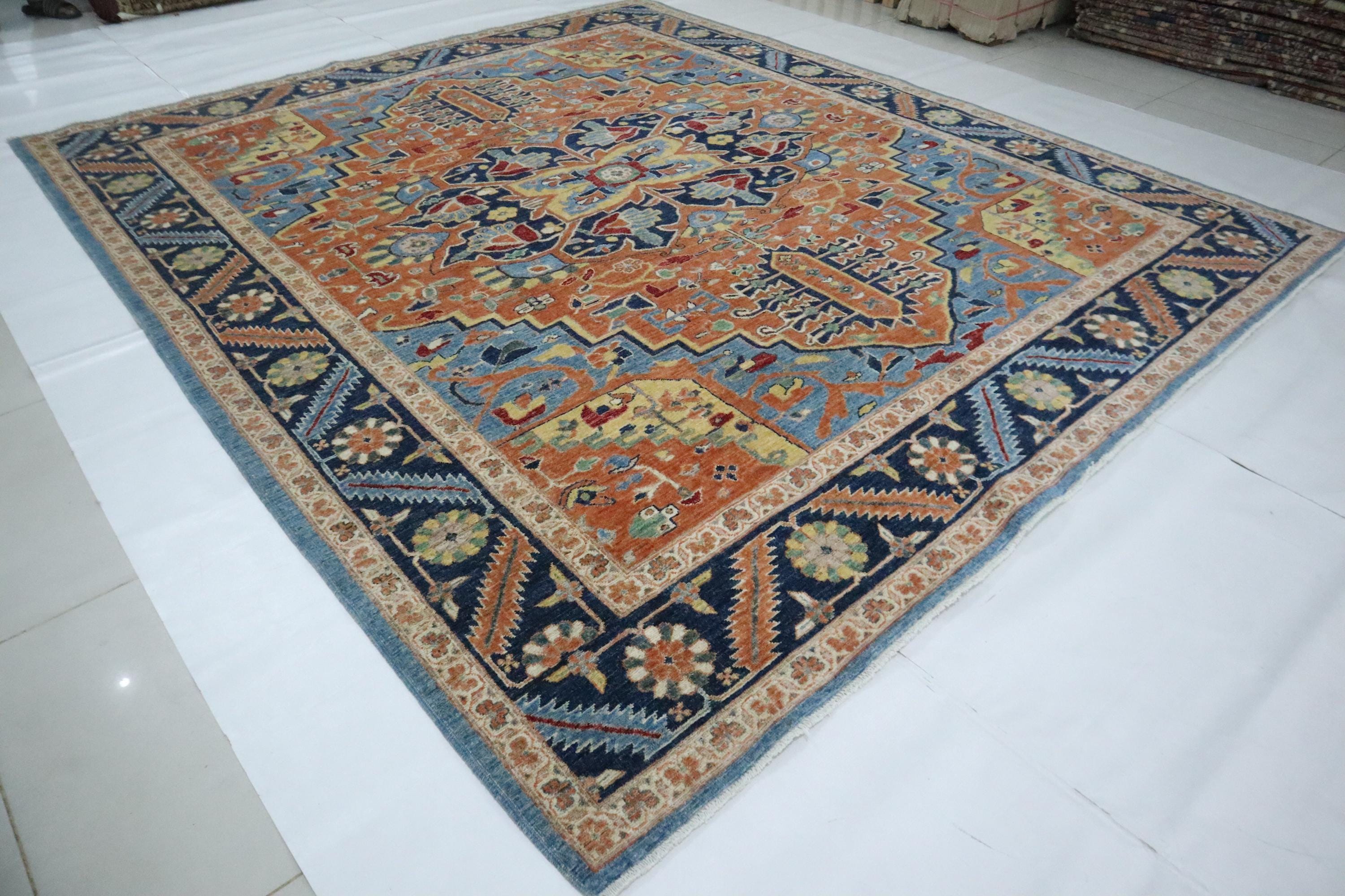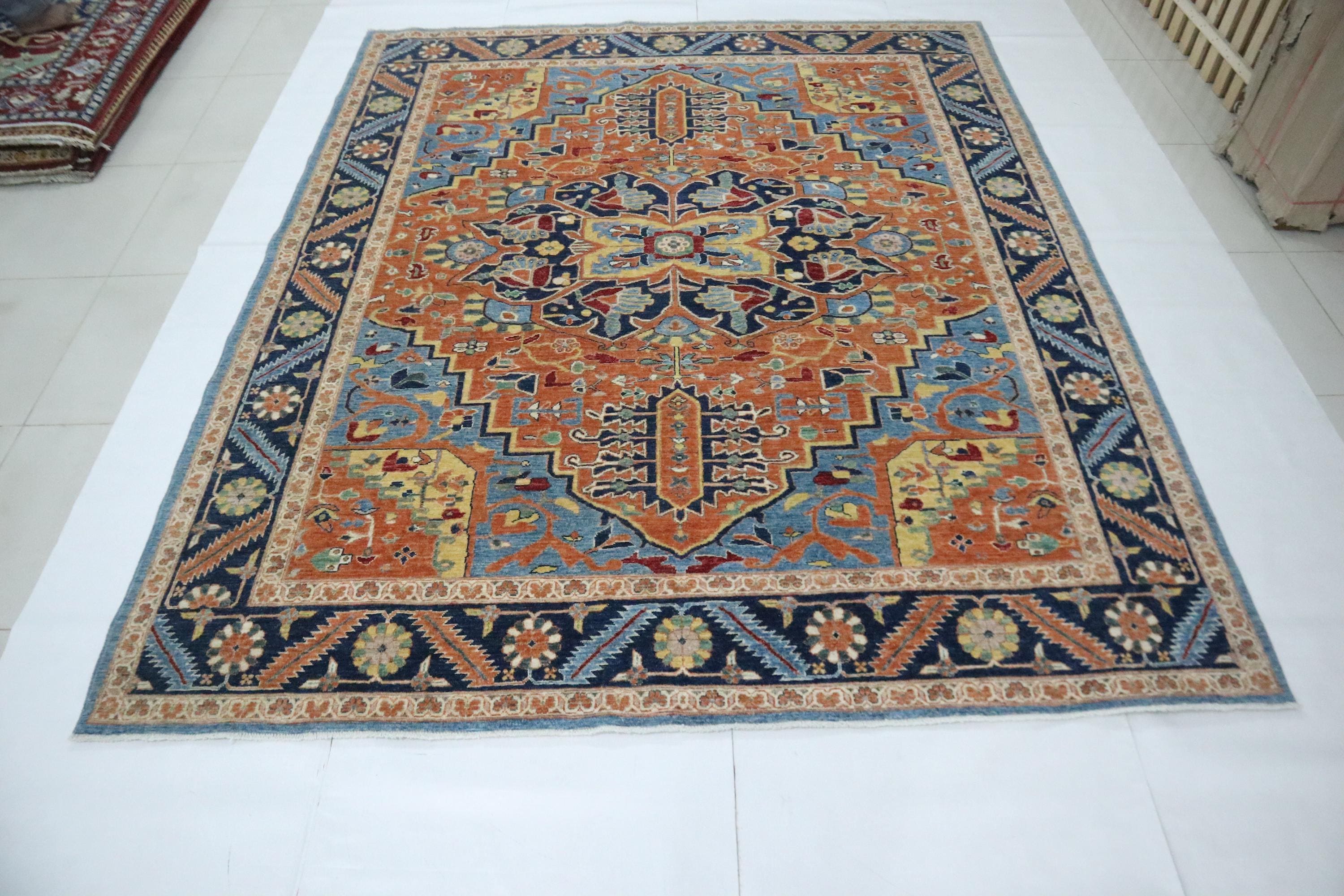 8x10 Ft Heriz Area Rug - Rust Blue Persian Style Afghan Hand Knotted Geometric Veg Dye Wool Rug - Traditional Rug - Bedroom Rug - Office Rug