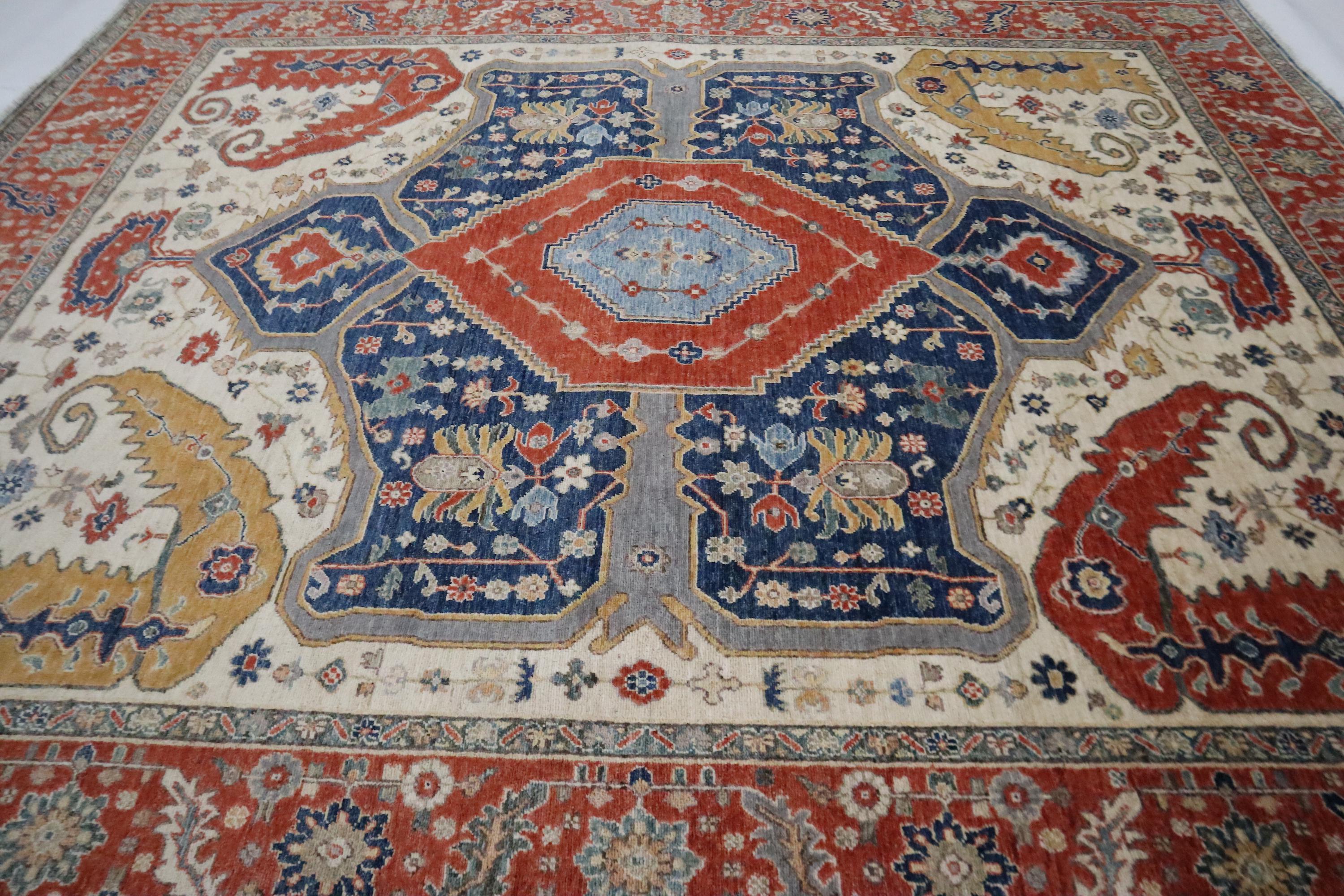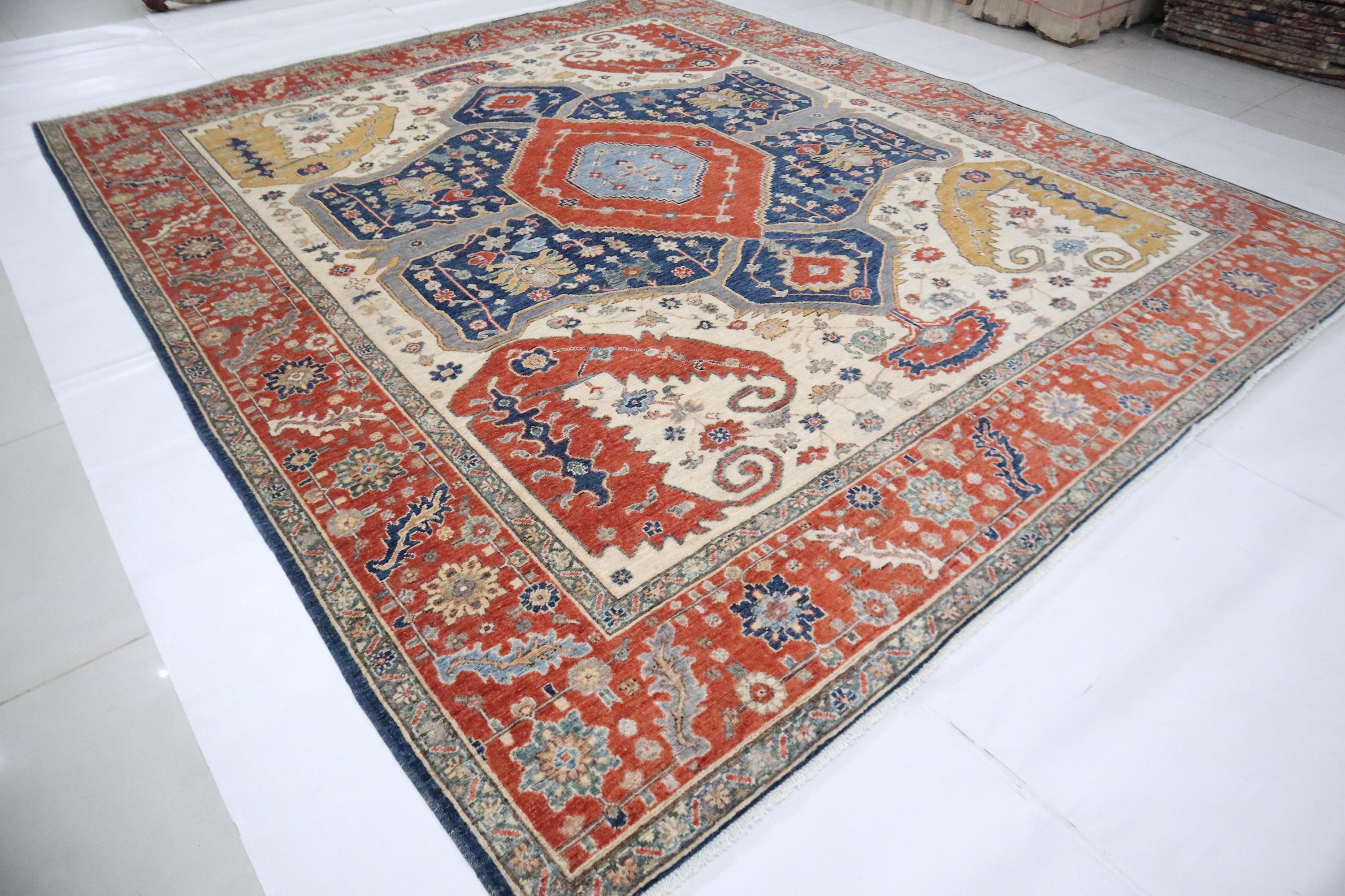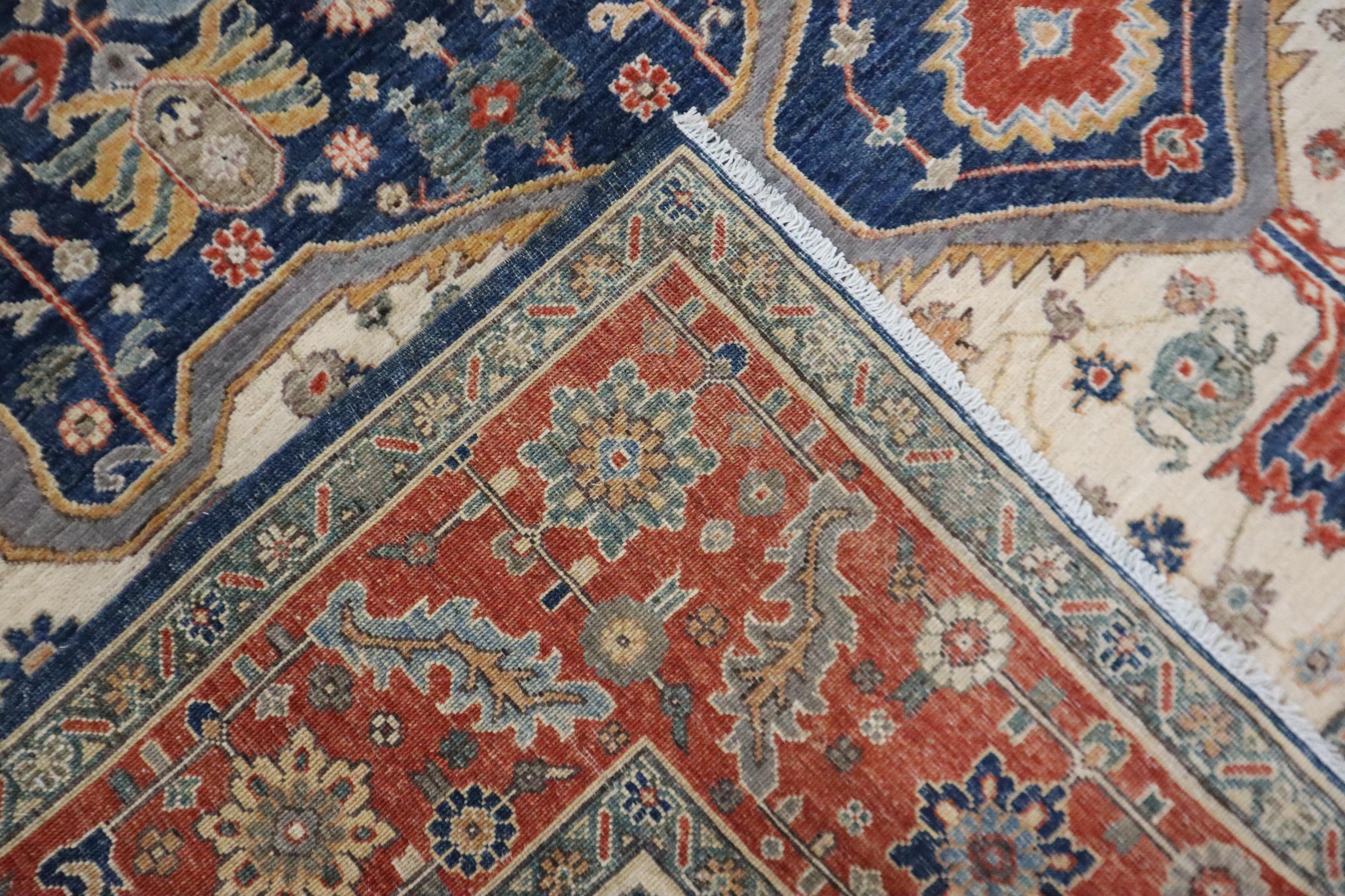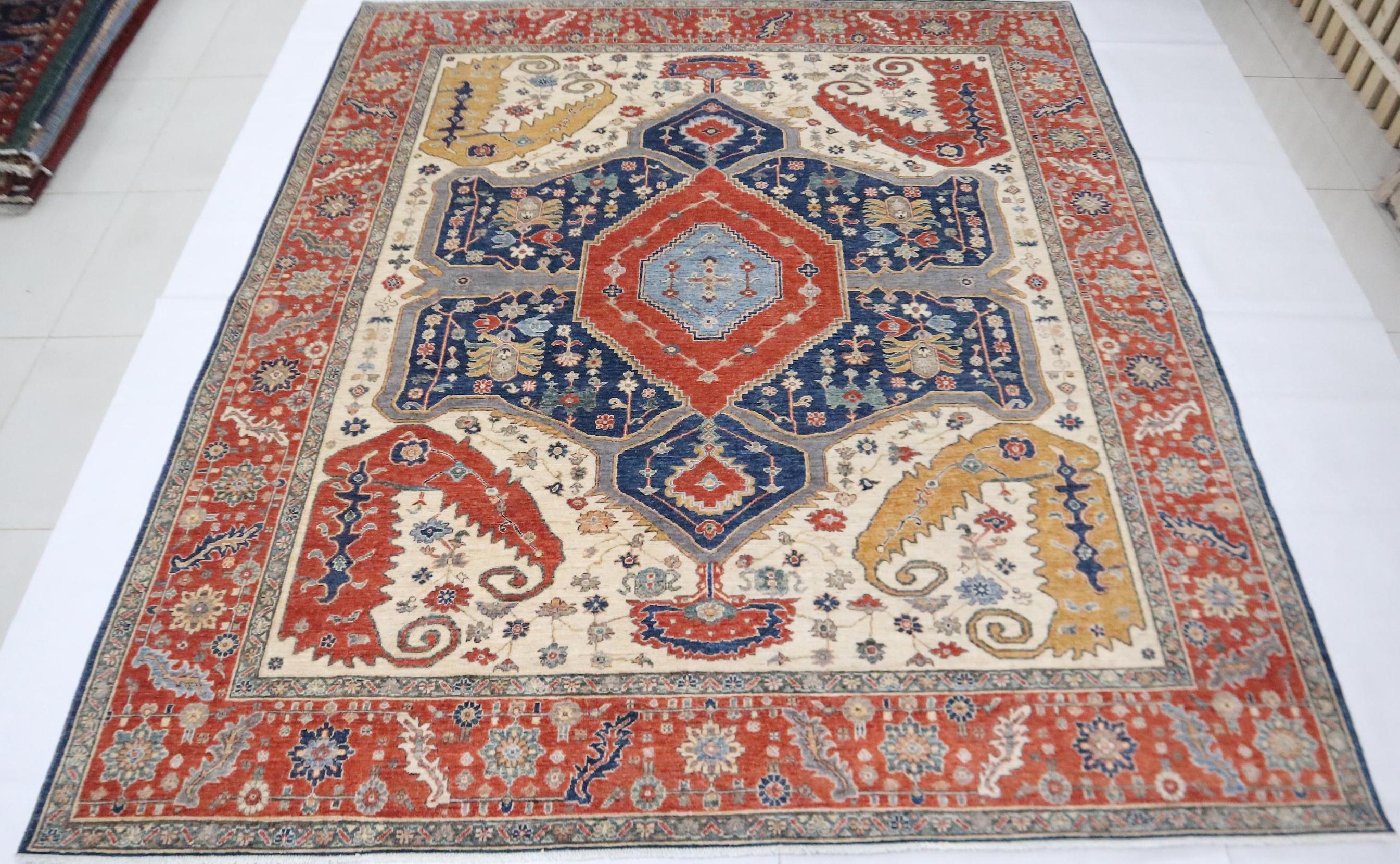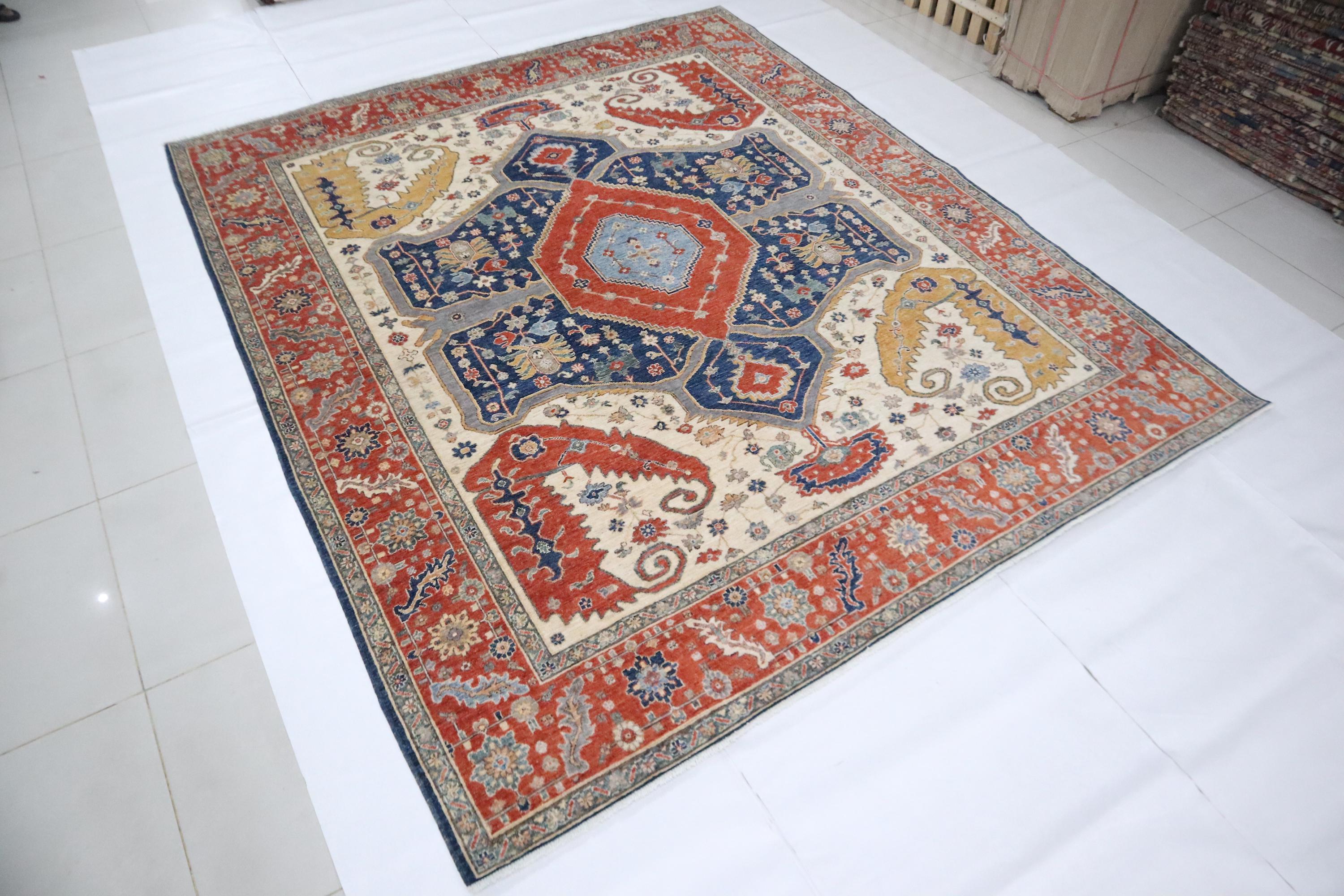 8x10 Ft Heriz Area Rug - Red Blue Persian Style Afghan Handmade Traditional Veg Dye Wool Rug - Geometric Rug - Living Room Rug - Bedroom Rug