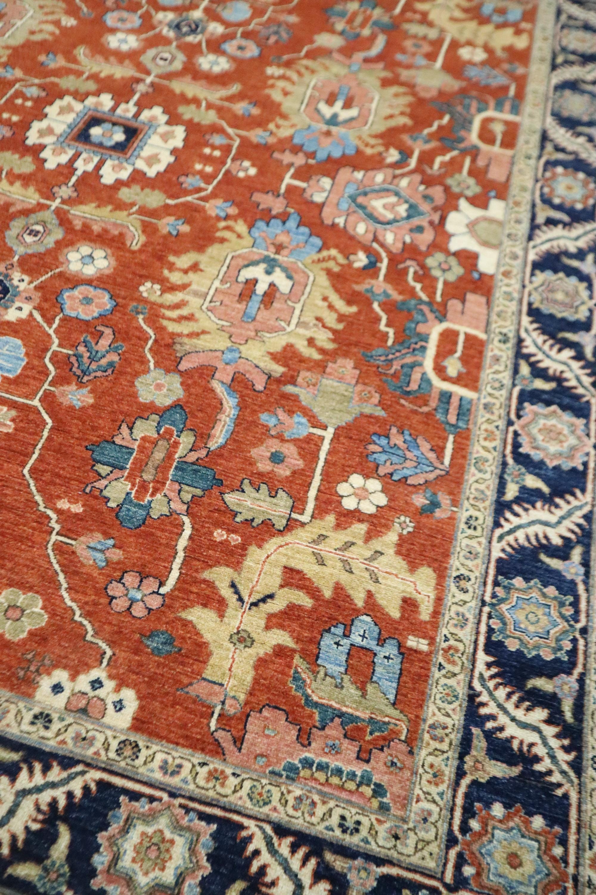 This hand-knotted pile rug is crafted using 100% natural dyes and handspun wool, giving it a rich texture and vibrant colors.