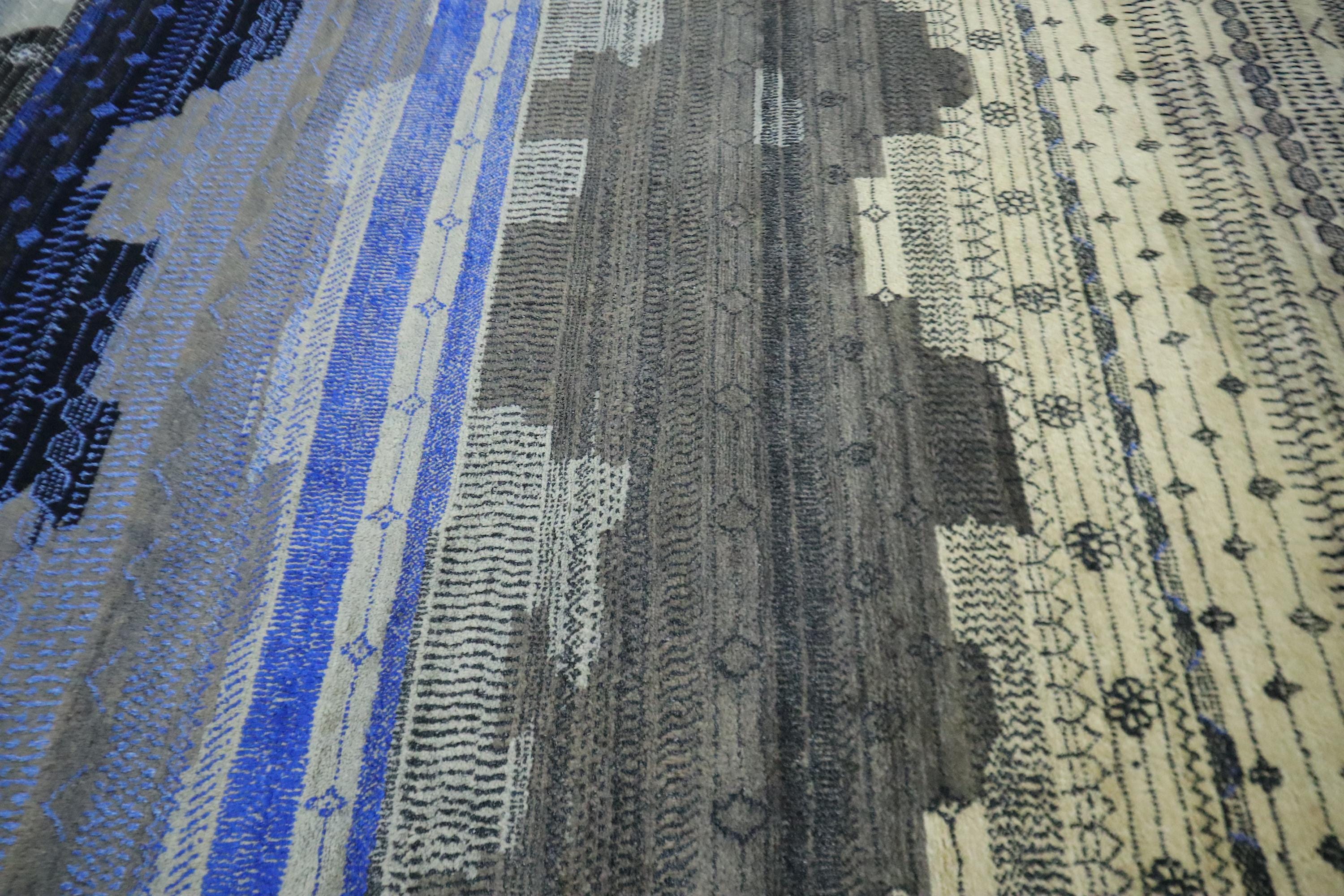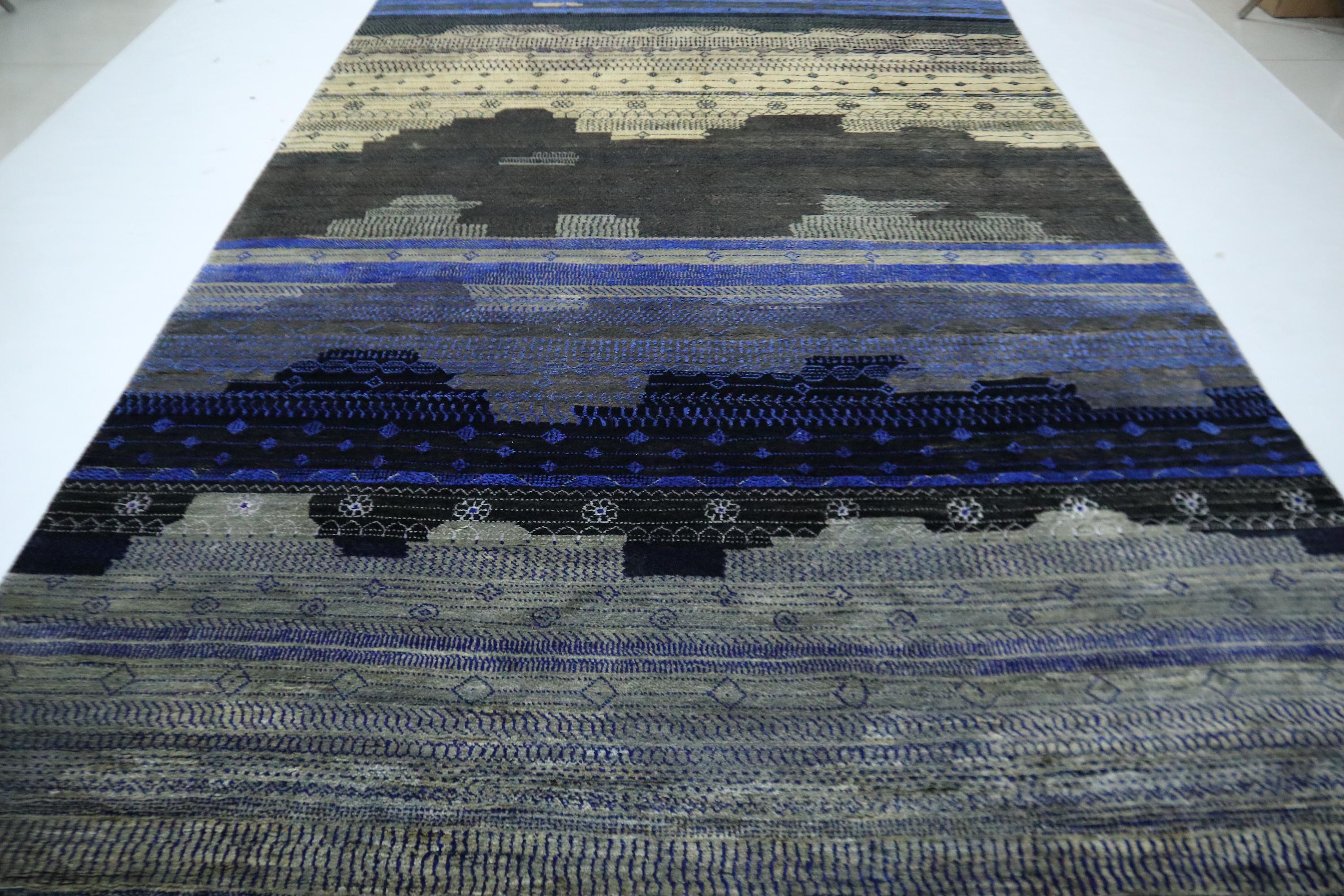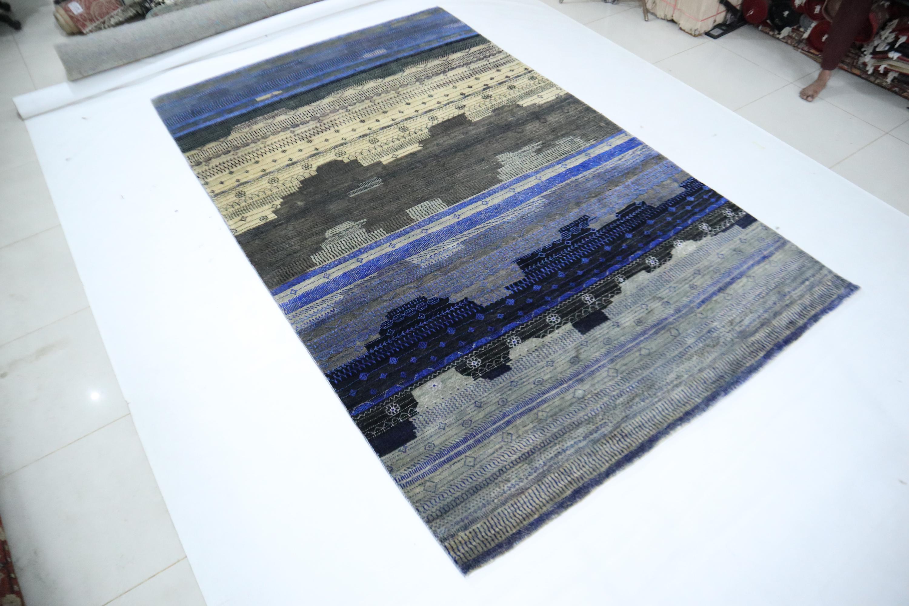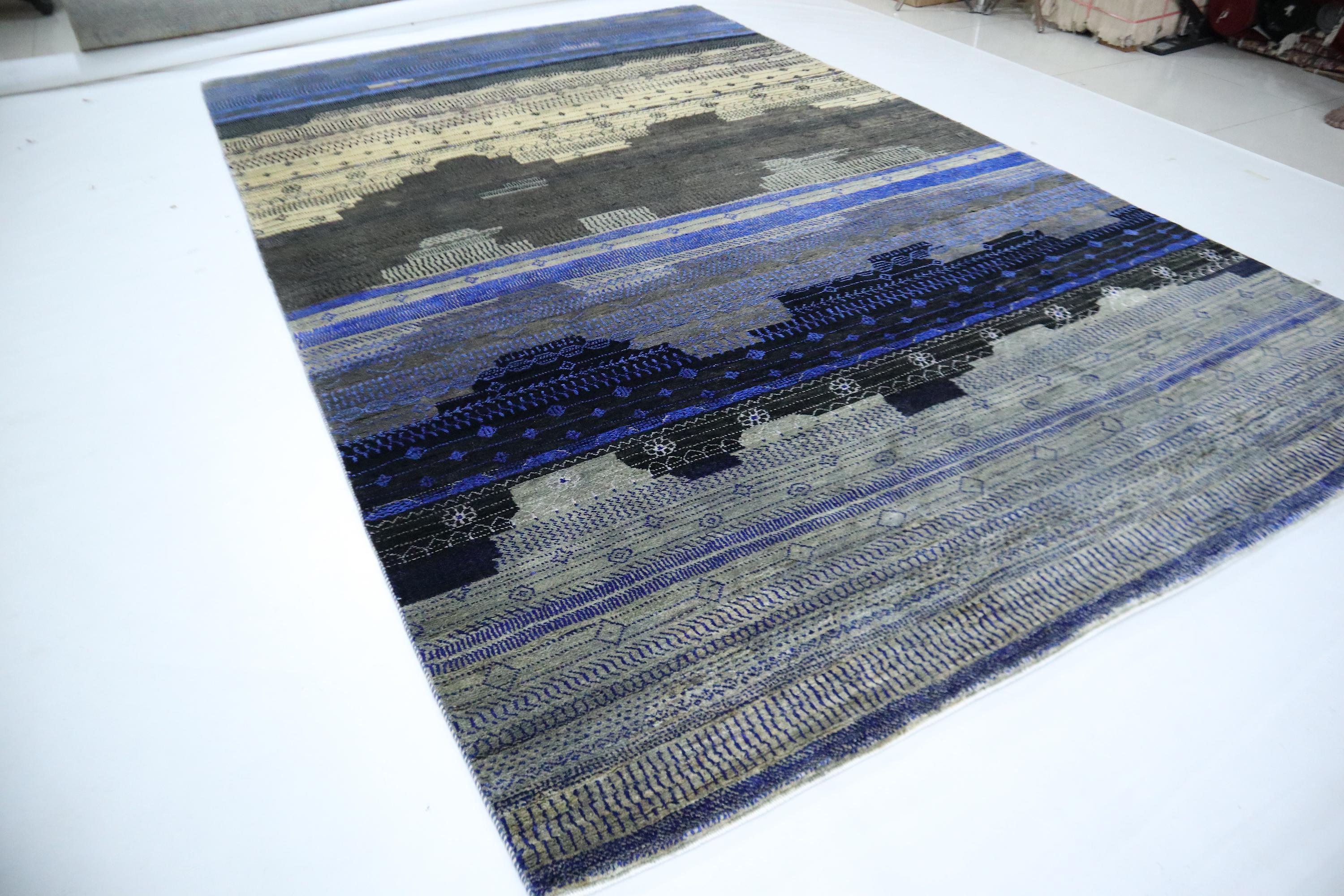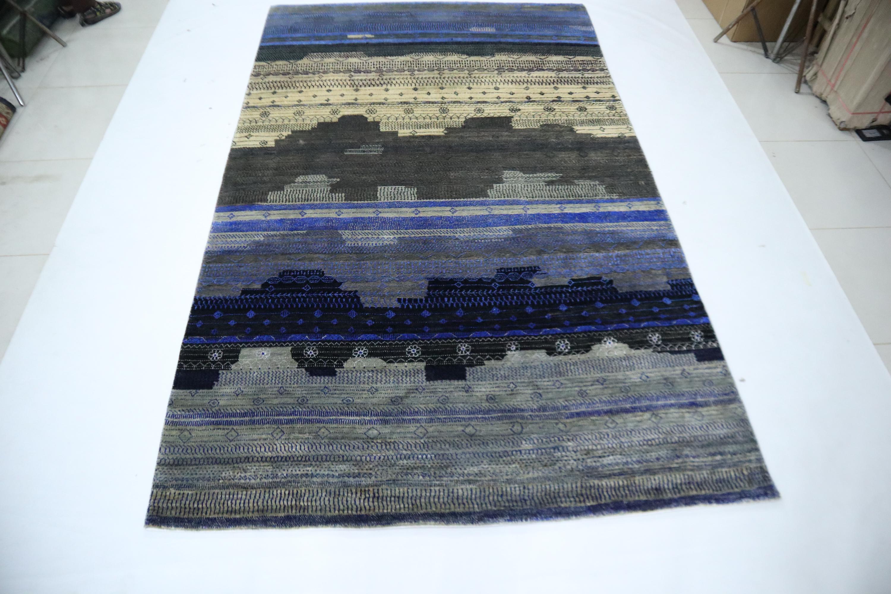 7x10 Abstract Area Rug - Blue Gray Rug - Afghan Hand Knotted Striped Silk Touch Wool Rug - Boho Rug - Bedroom Rug - Living Room Rug - Rugs