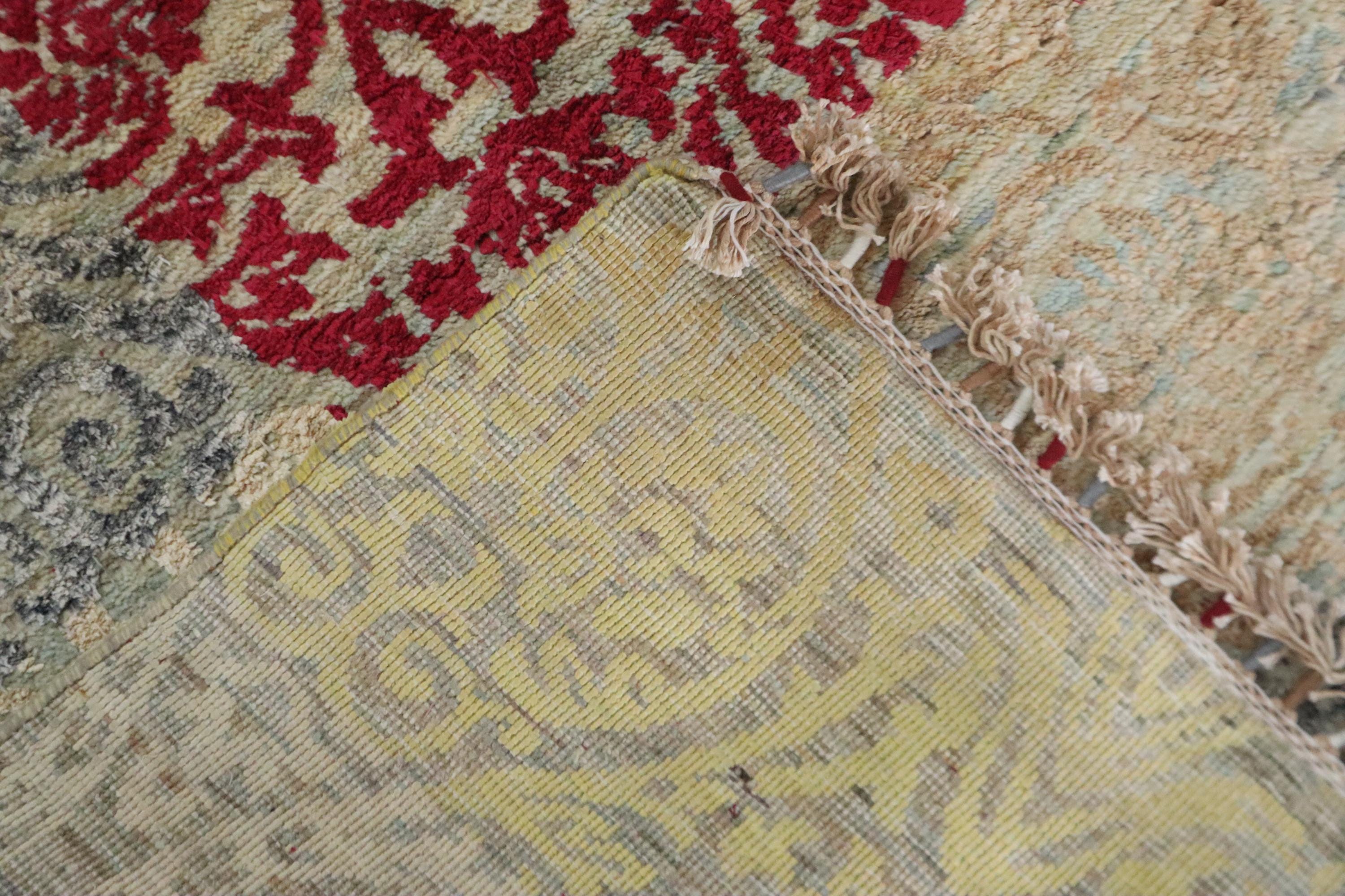 This hand-knotted pile rug is crafted using 100% natural dyes and handspun wool, giving it a rich texture and vibrant colors.
