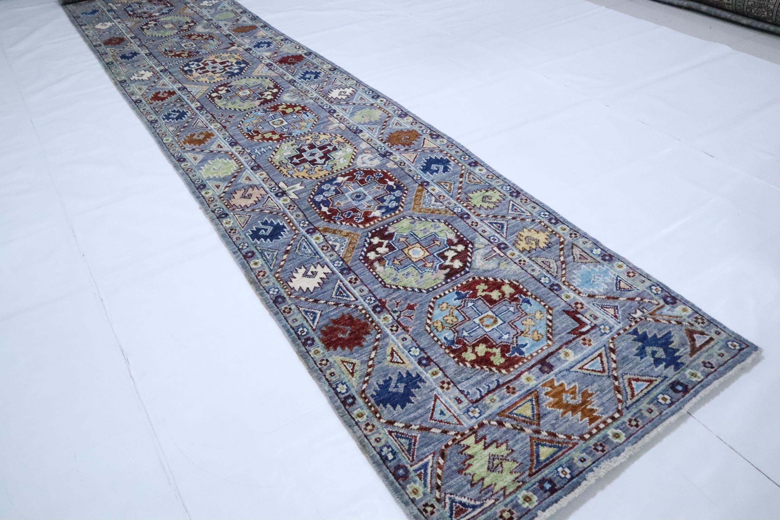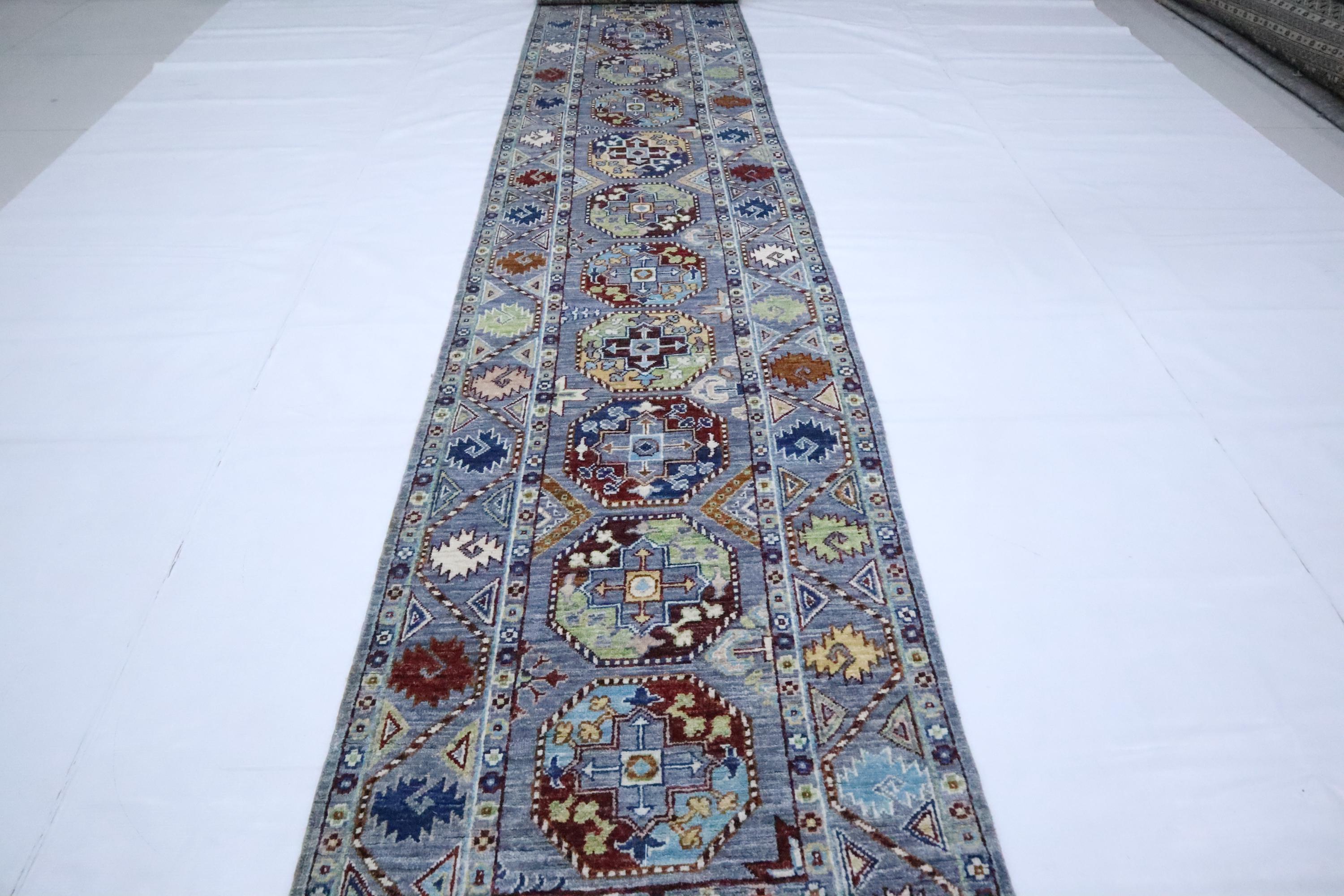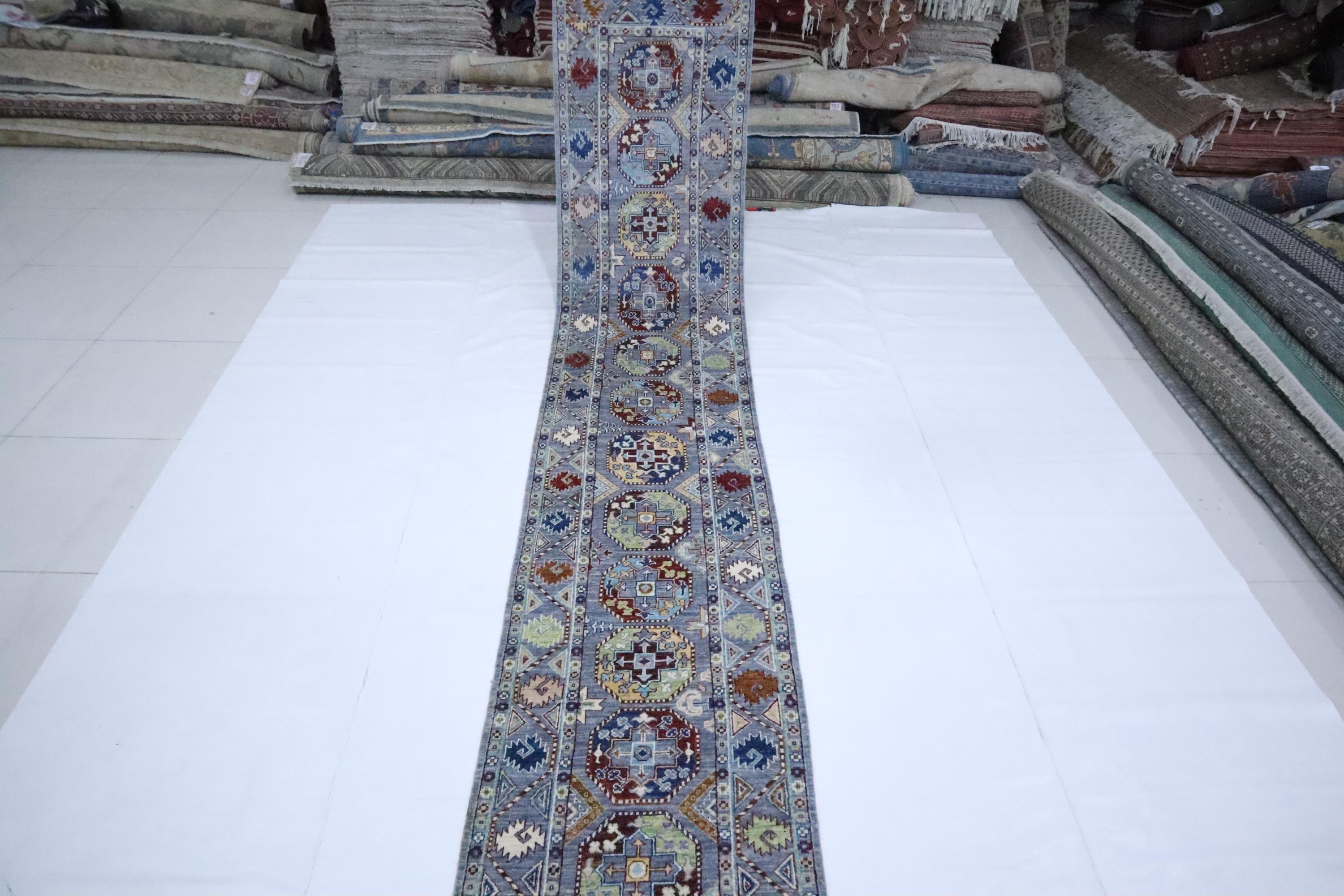 14 Ft Ersari Runner Rug, Gray Runner, Afghan Hand Knotted Geometric Design Veg Dye Wool Runner, Tribal Runner, Large Runner, Entryway Runner