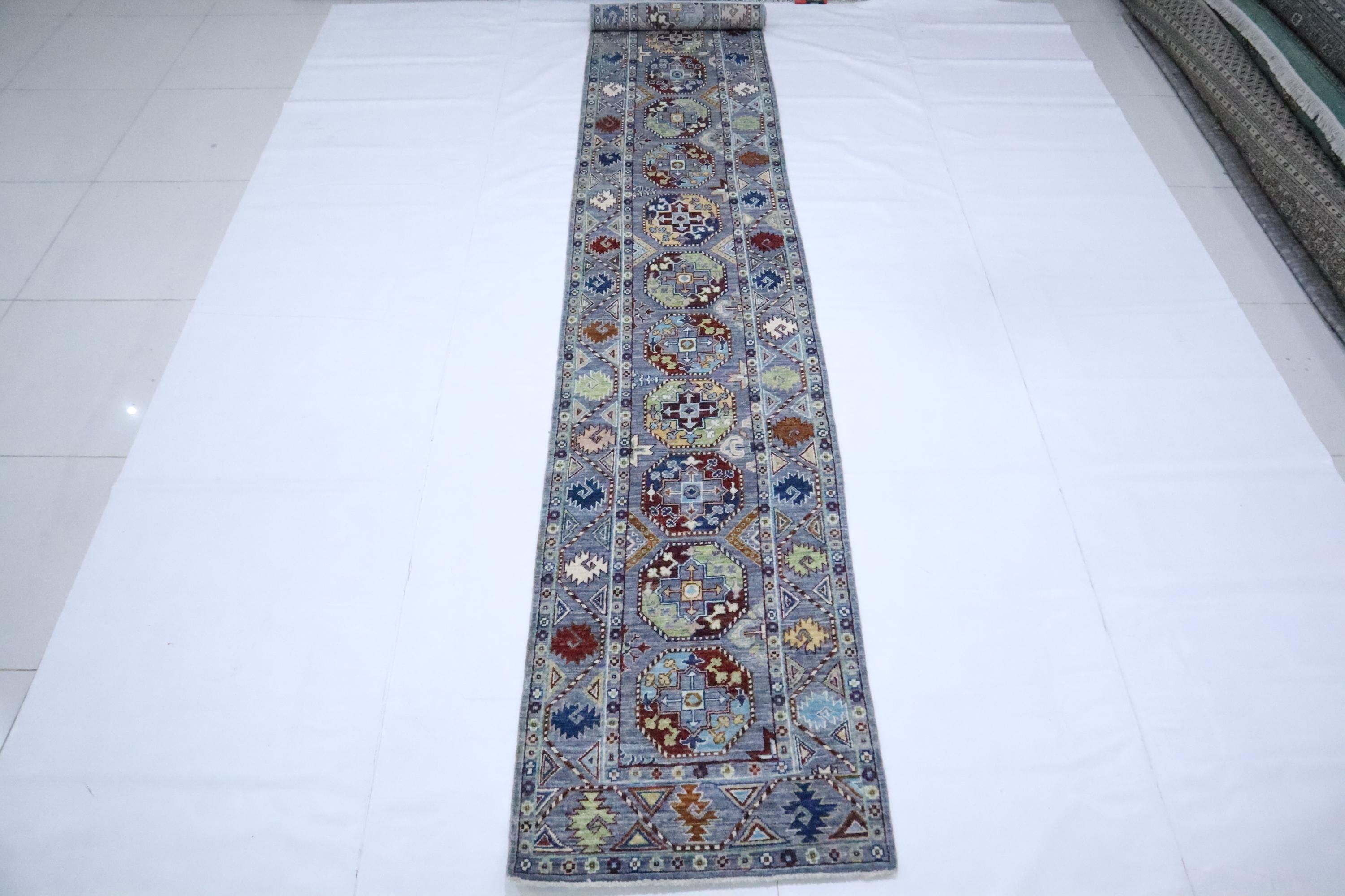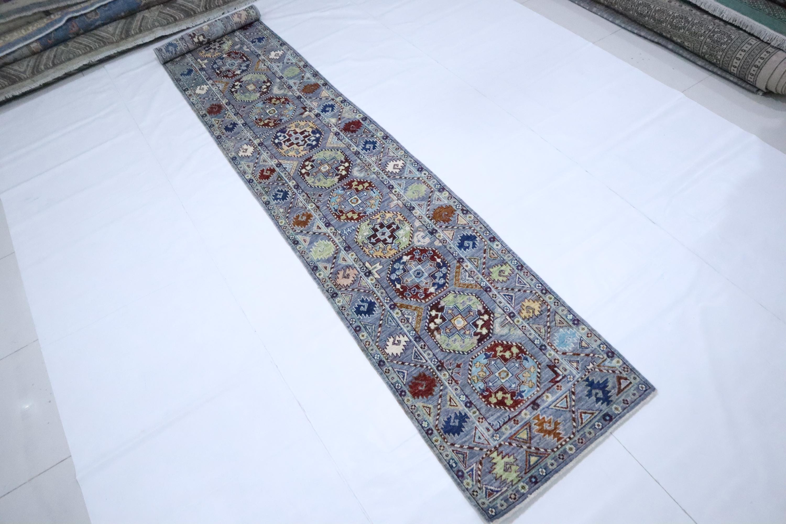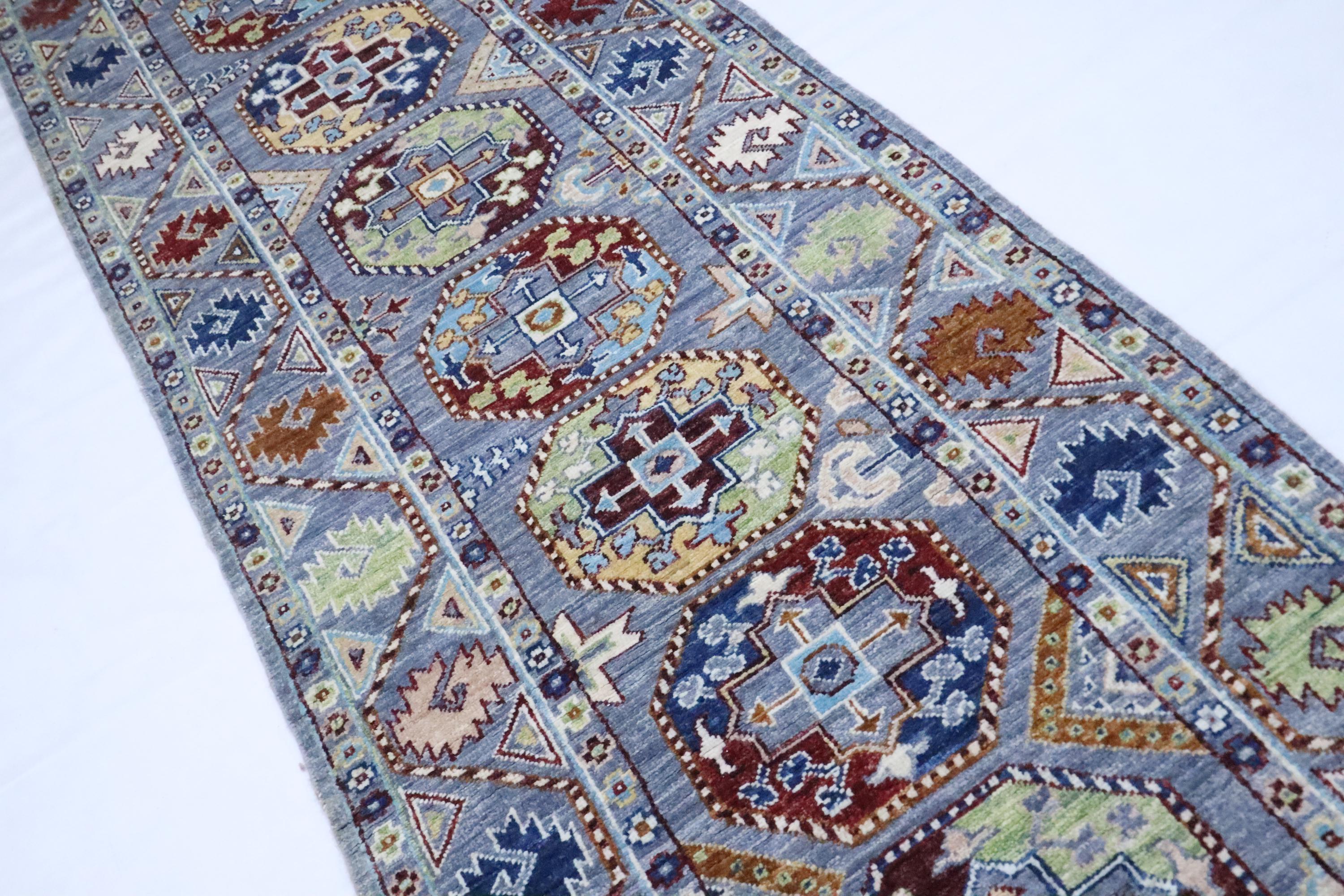 14 Ft Ersari Runner Rug, Gray Runner, Afghan Hand Knotted Geometric Design Veg Dye Wool Runner, Tribal Runner, Large Runner, Entryway Runner