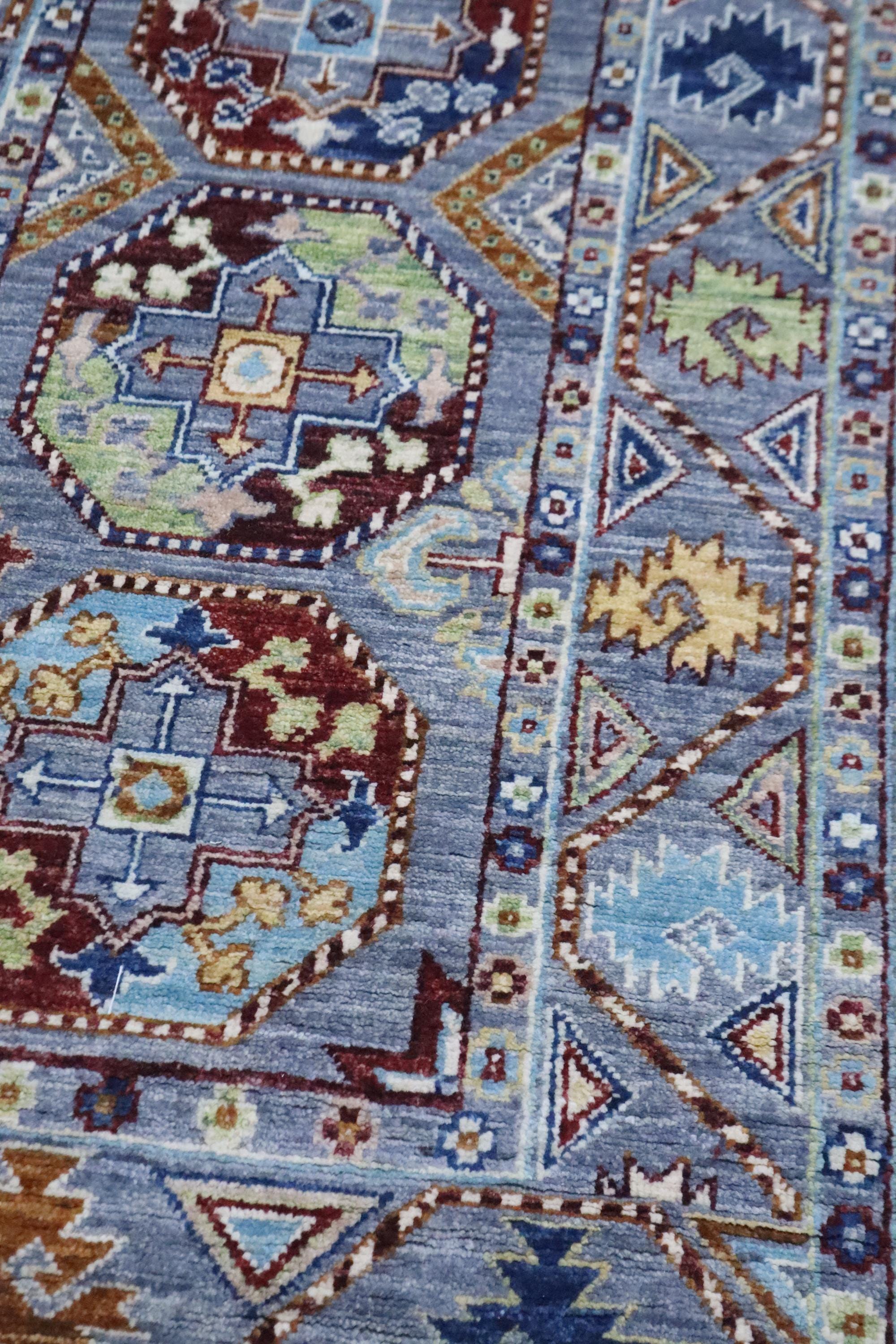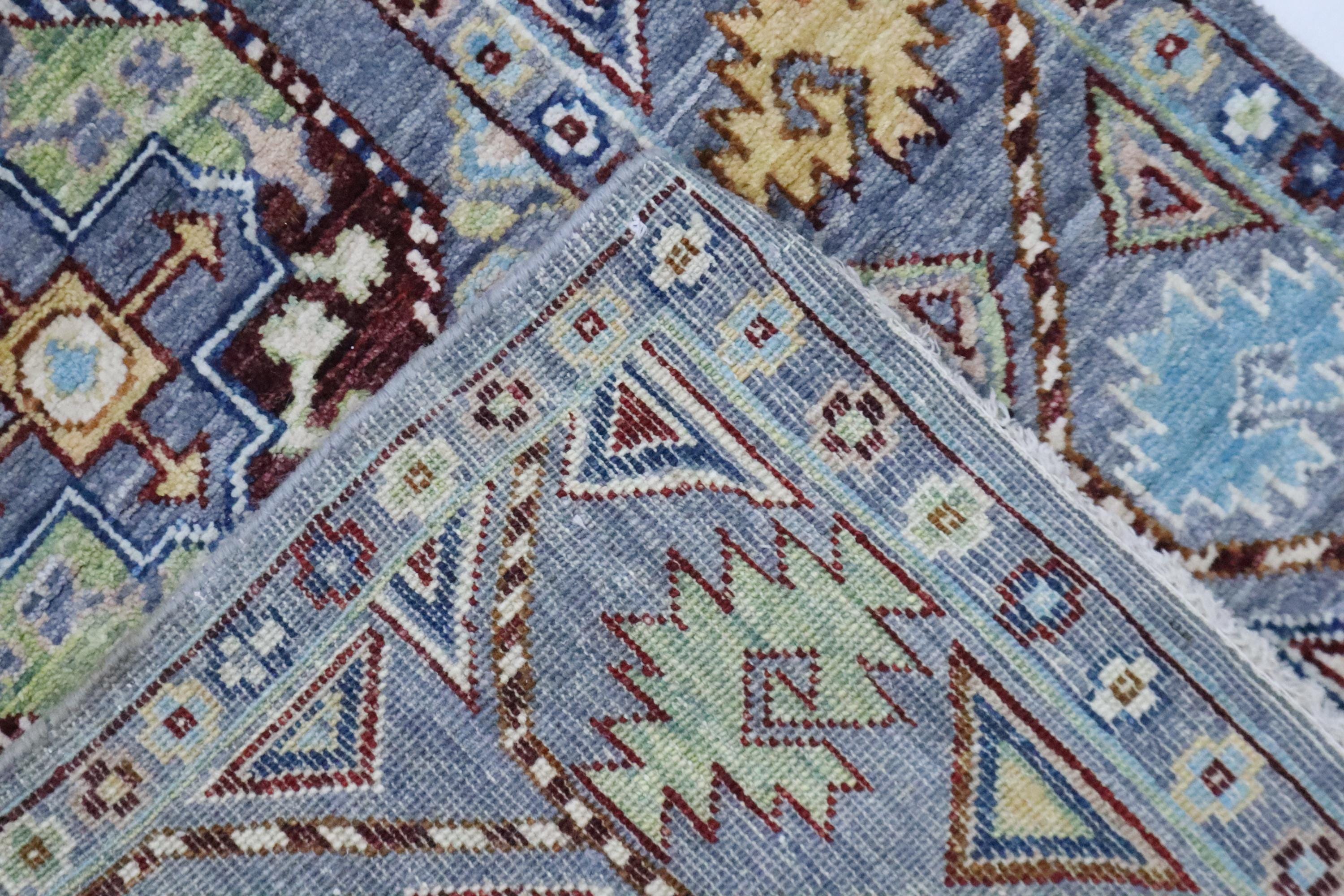 This hand-knotted pile rug is crafted using 100% natural dyes and handspun wool, giving it a rich texture and vibrant colors.