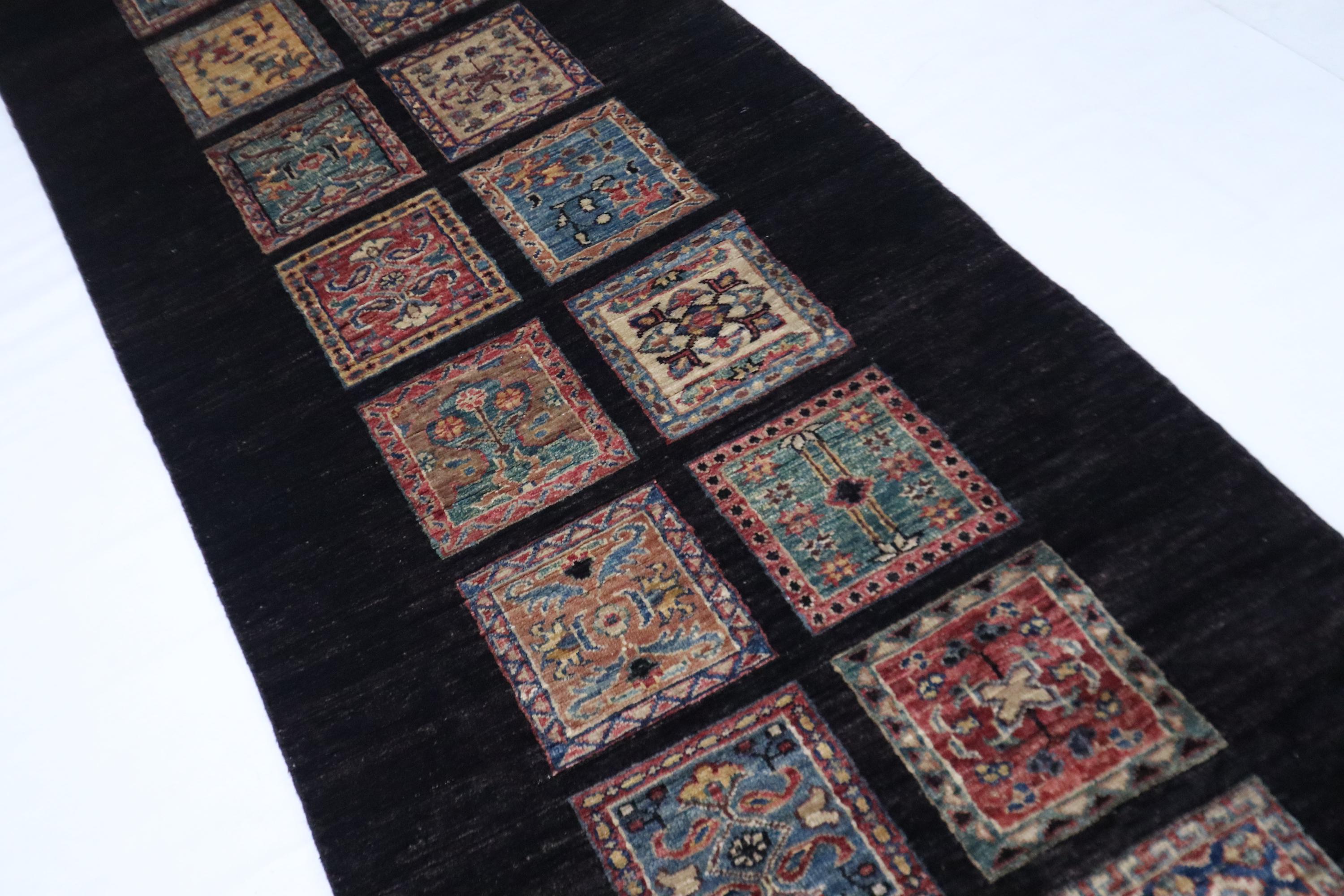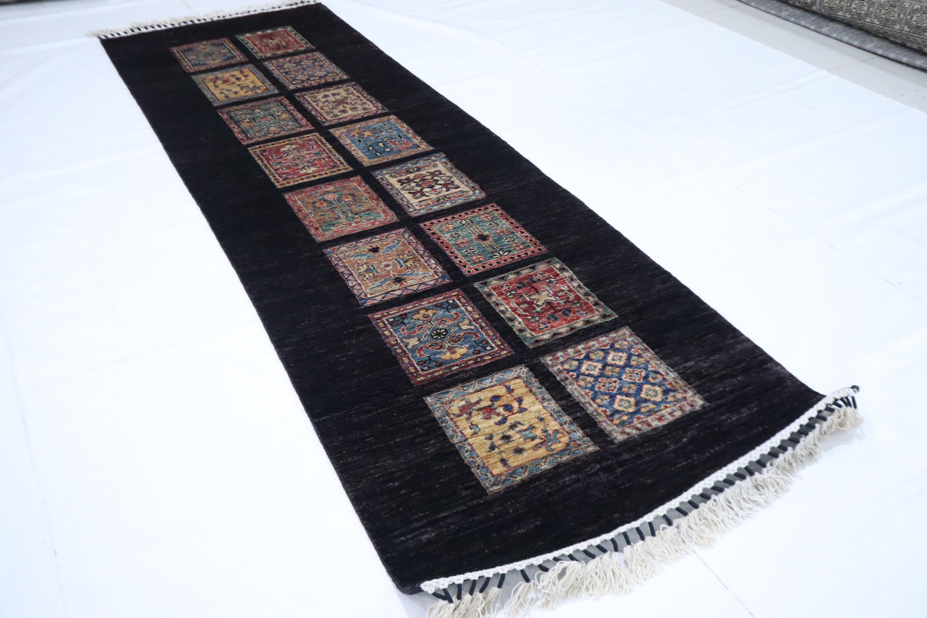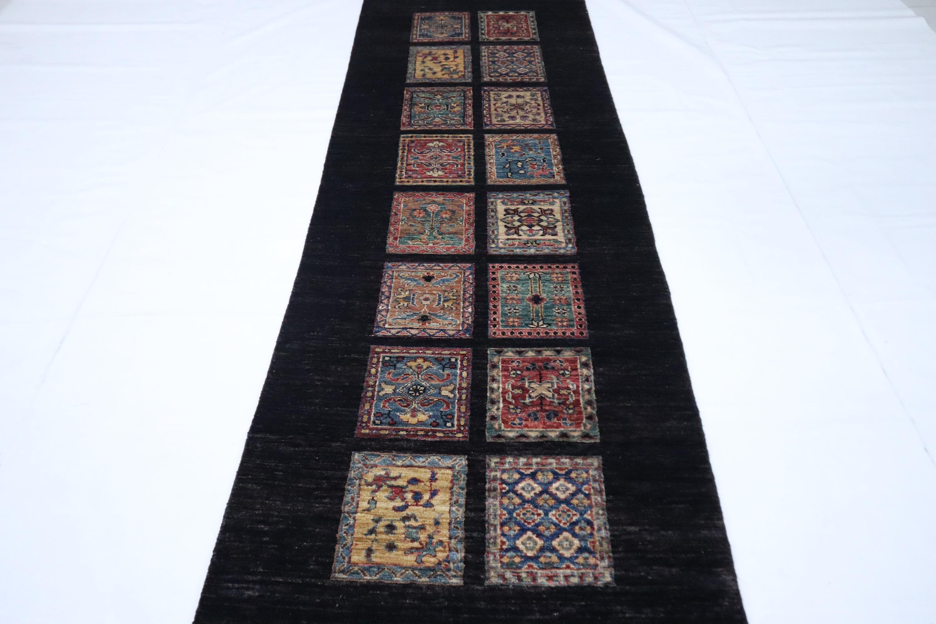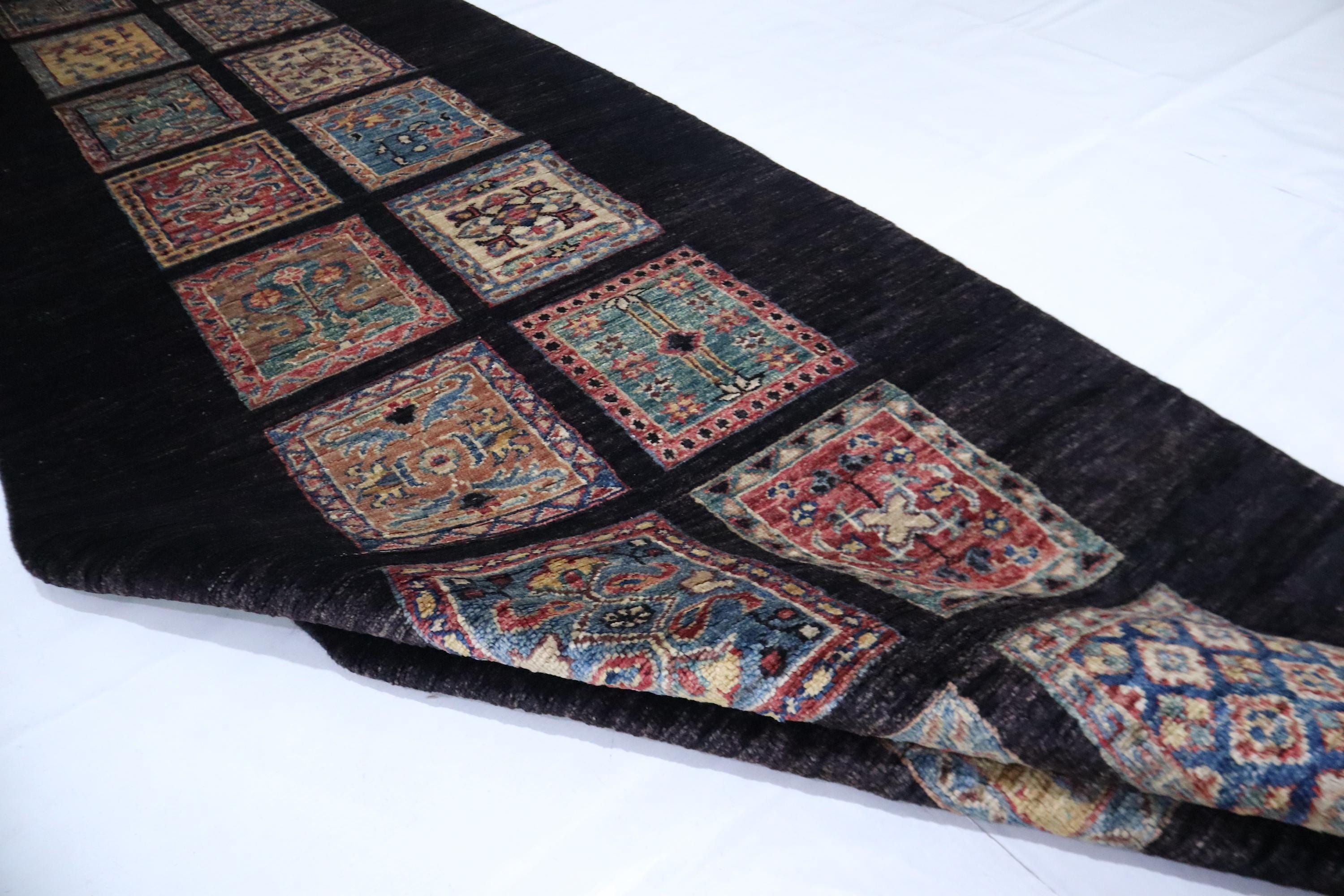 8 Ft Bakhtiari Runner Rug, Black Runner, Persian Style Afghan Hand Knotted Wool Runner, Checkered Runner, Traditional Runner, Woolen Runner