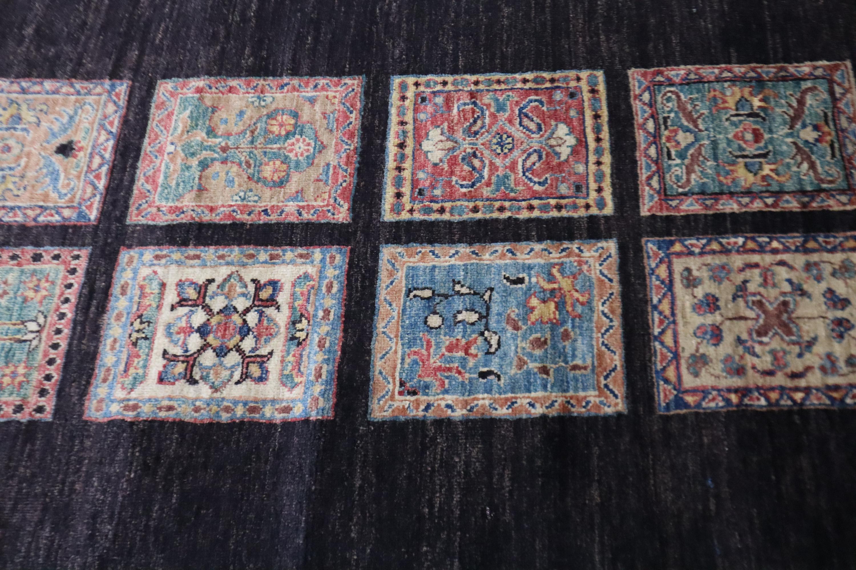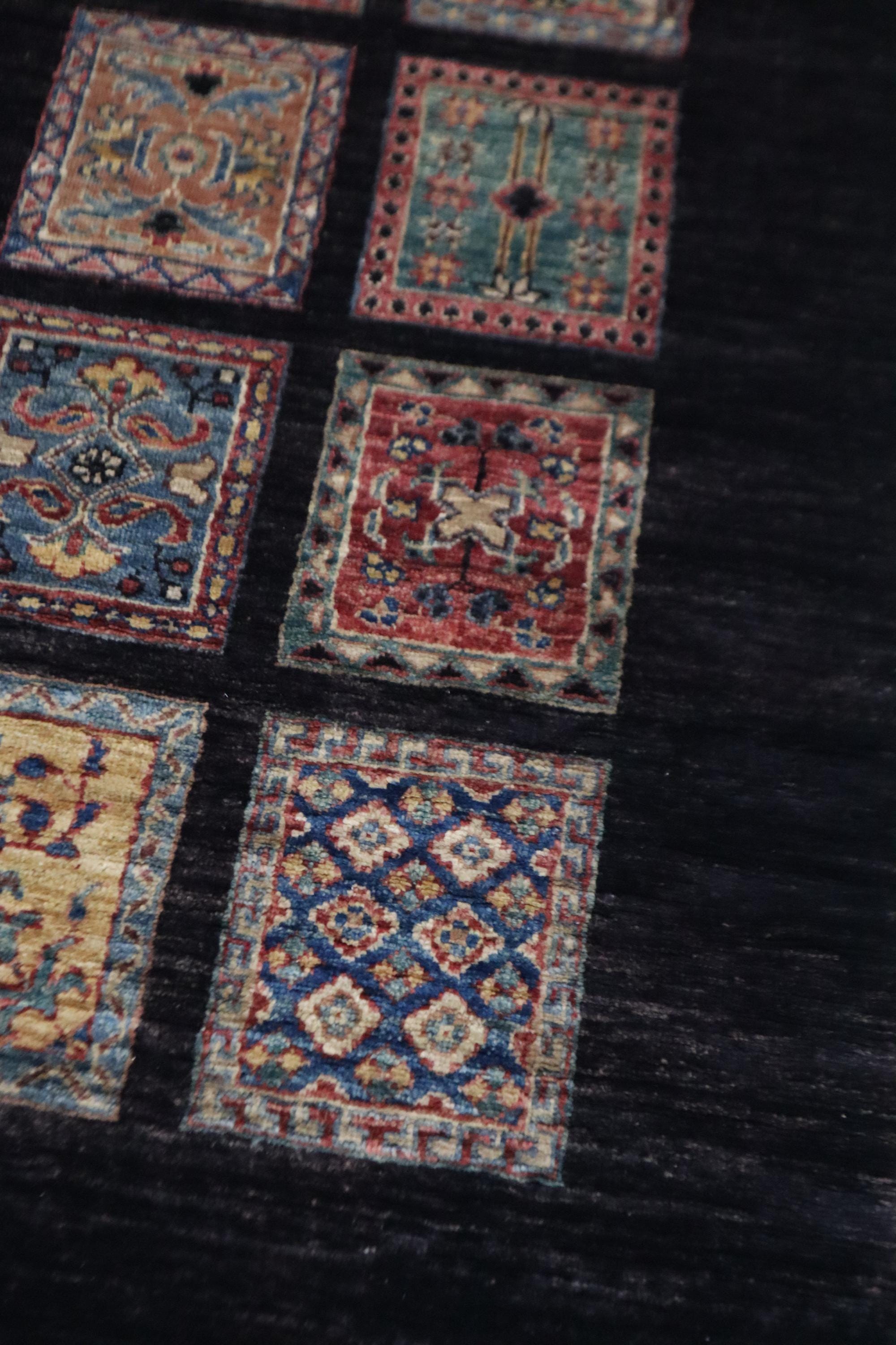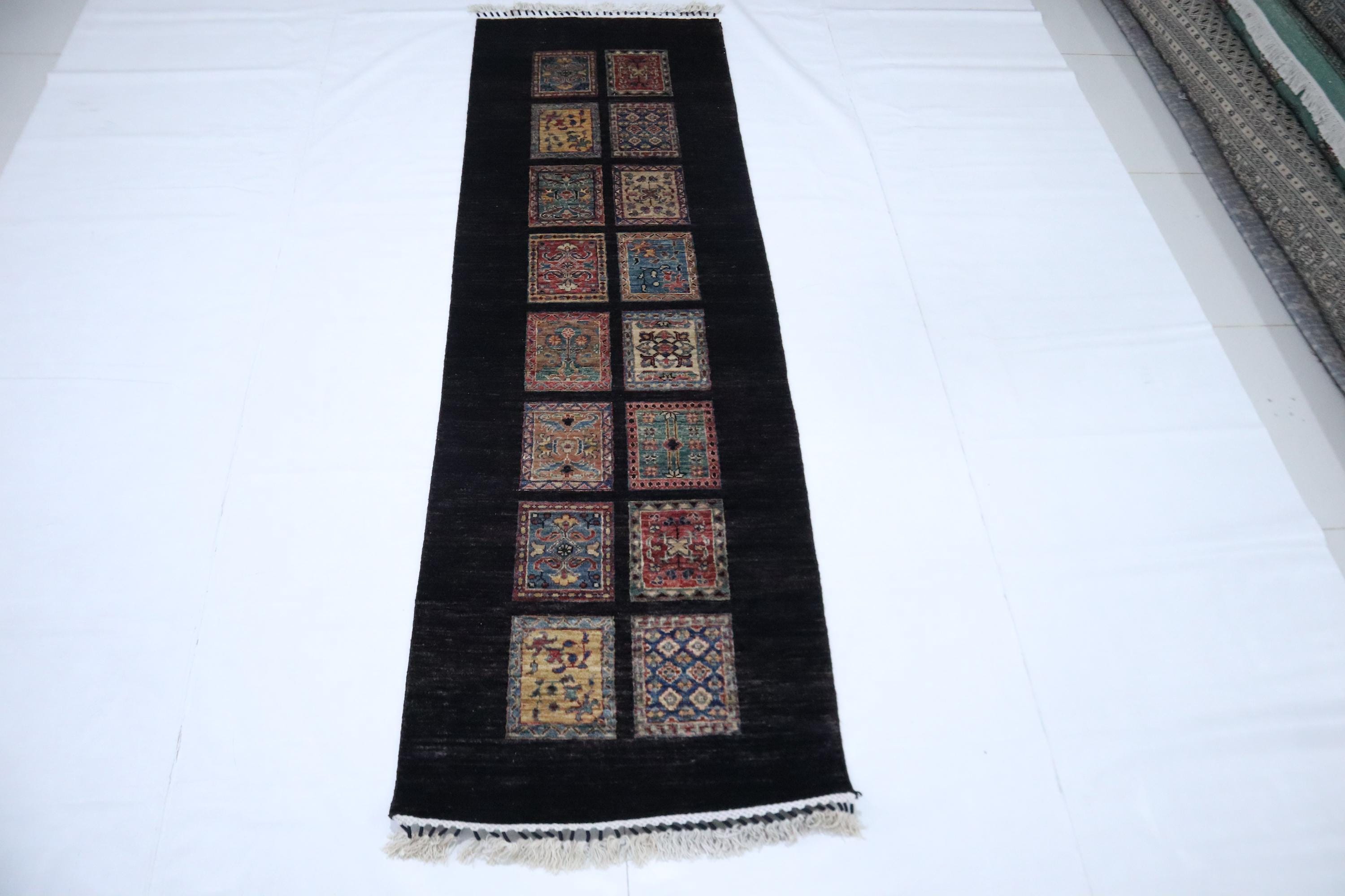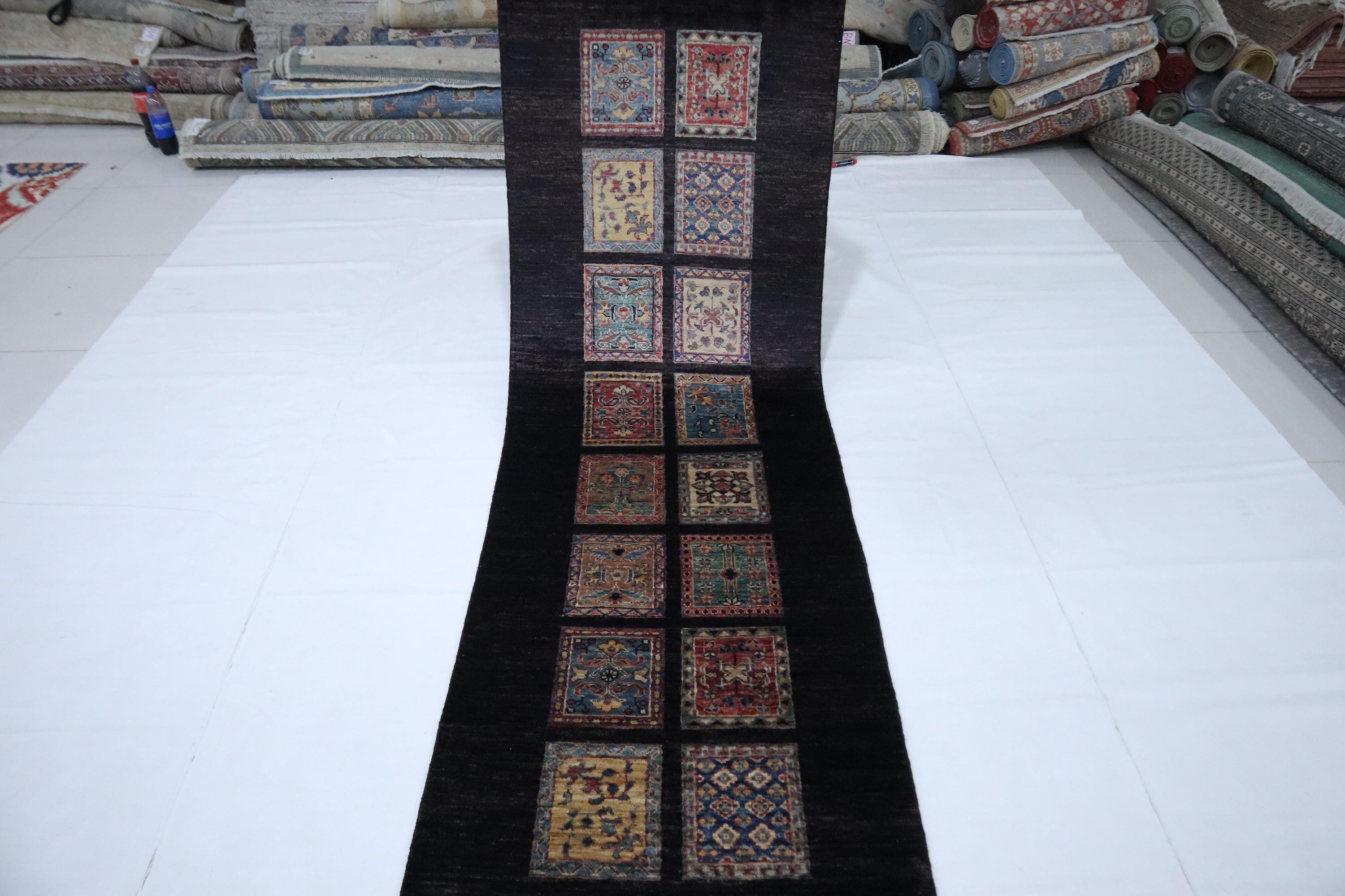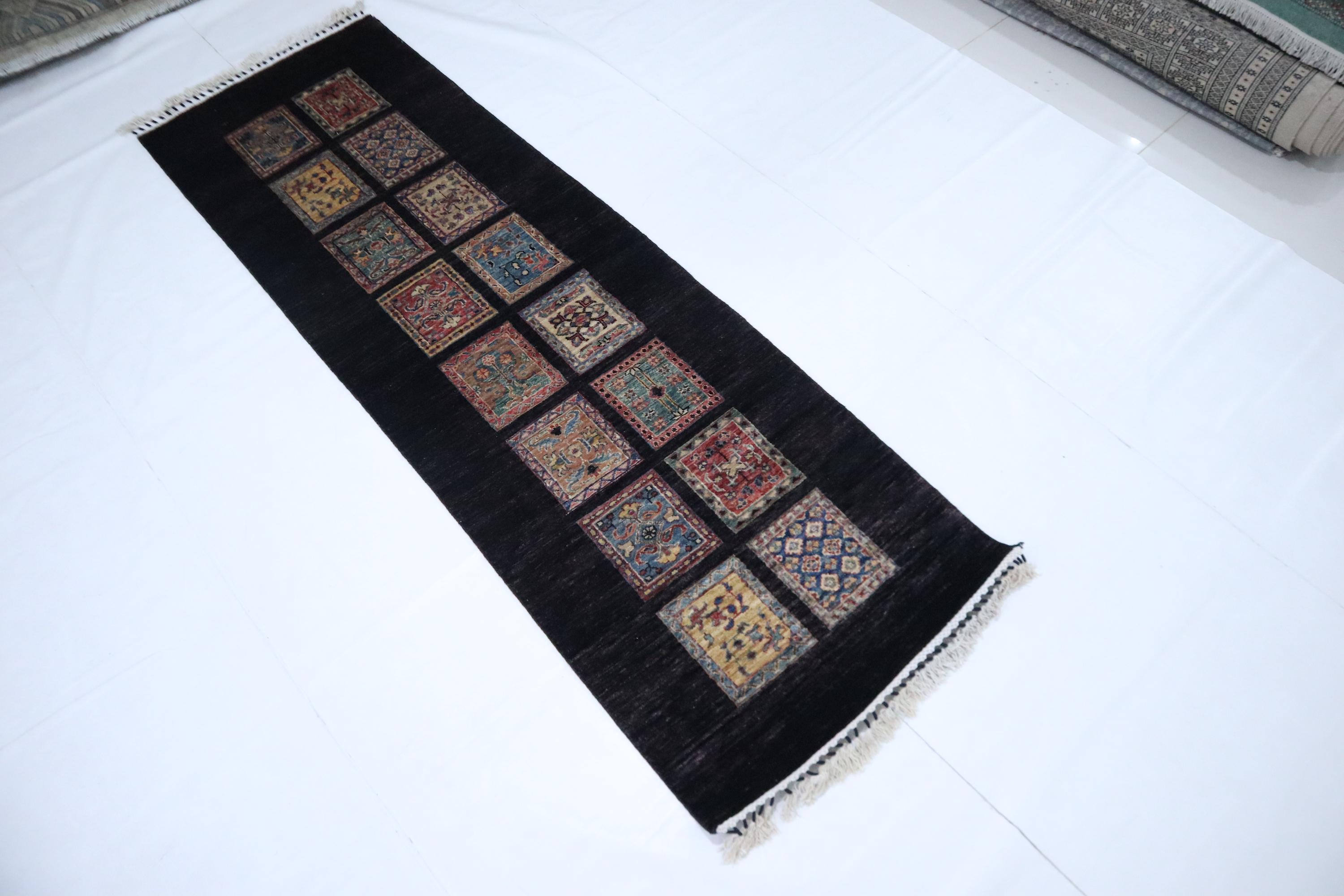 8 Ft Bakhtiari Runner Rug, Black Runner, Persian Style Afghan Hand Knotted Wool Runner, Checkered Runner, Traditional Runner, Woolen Runner