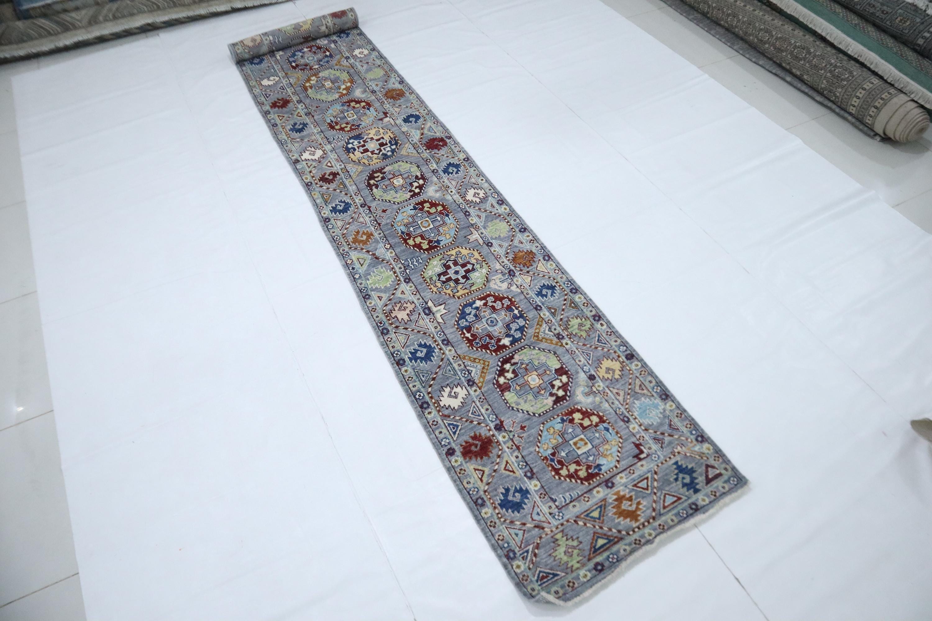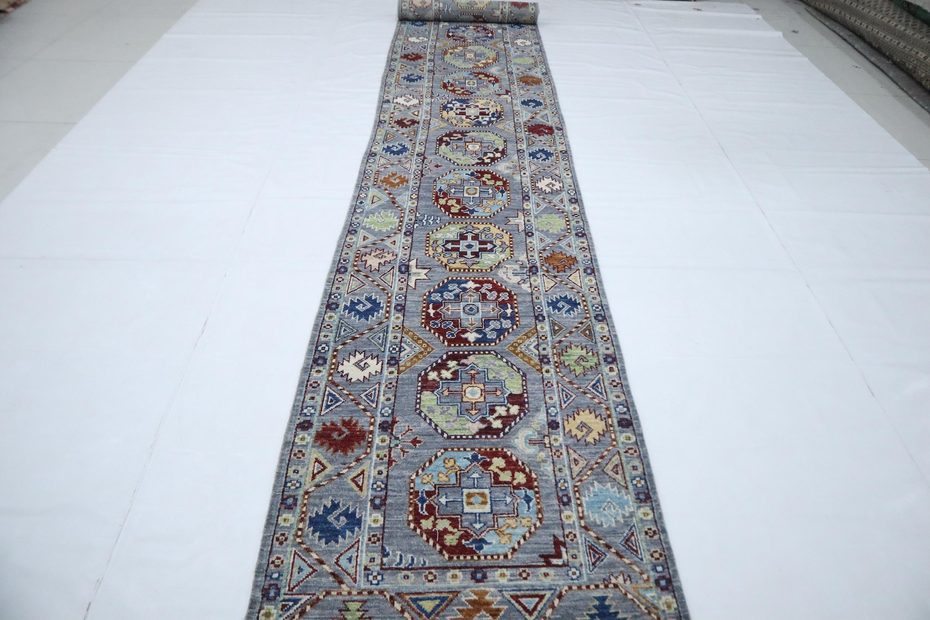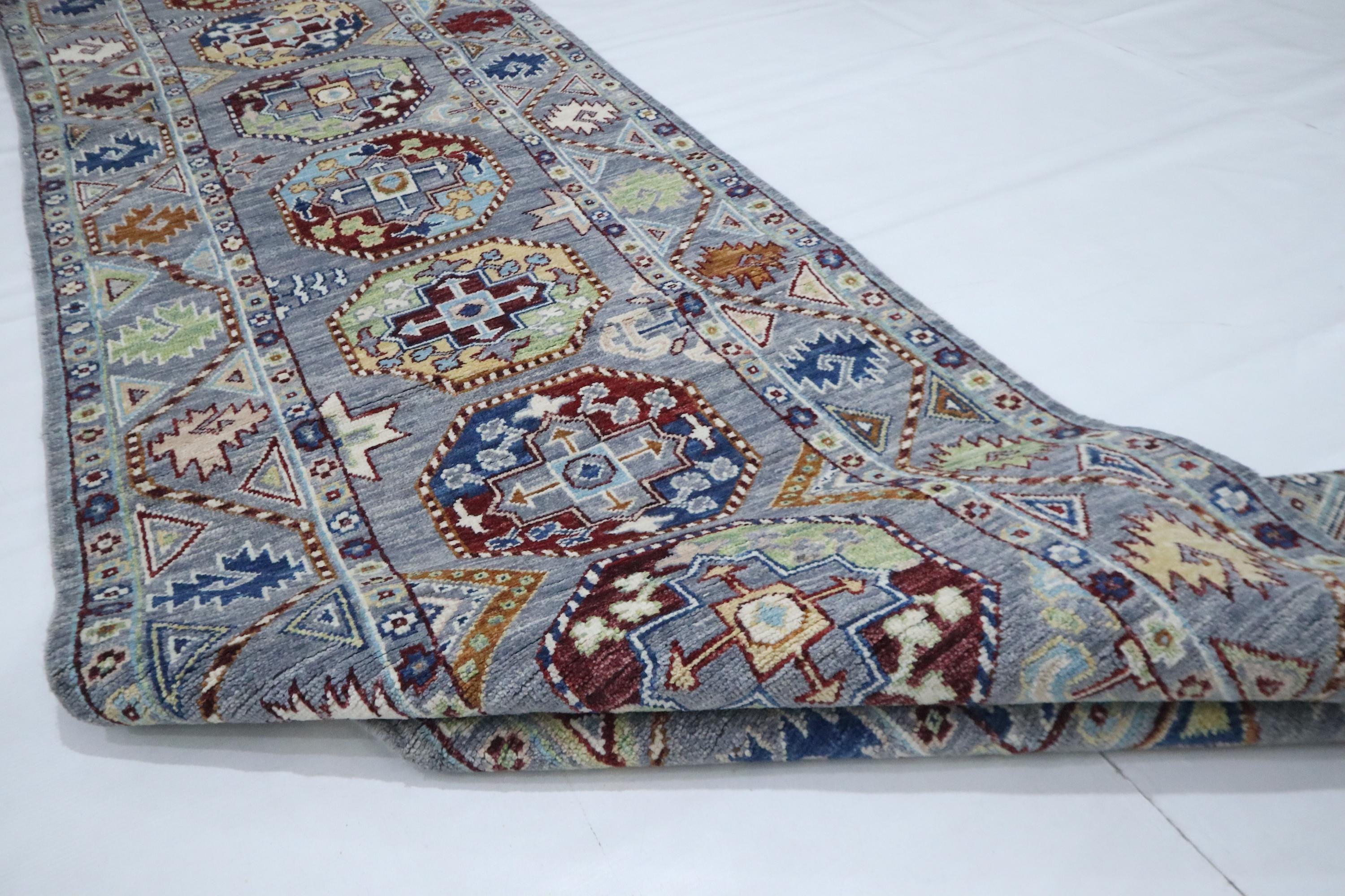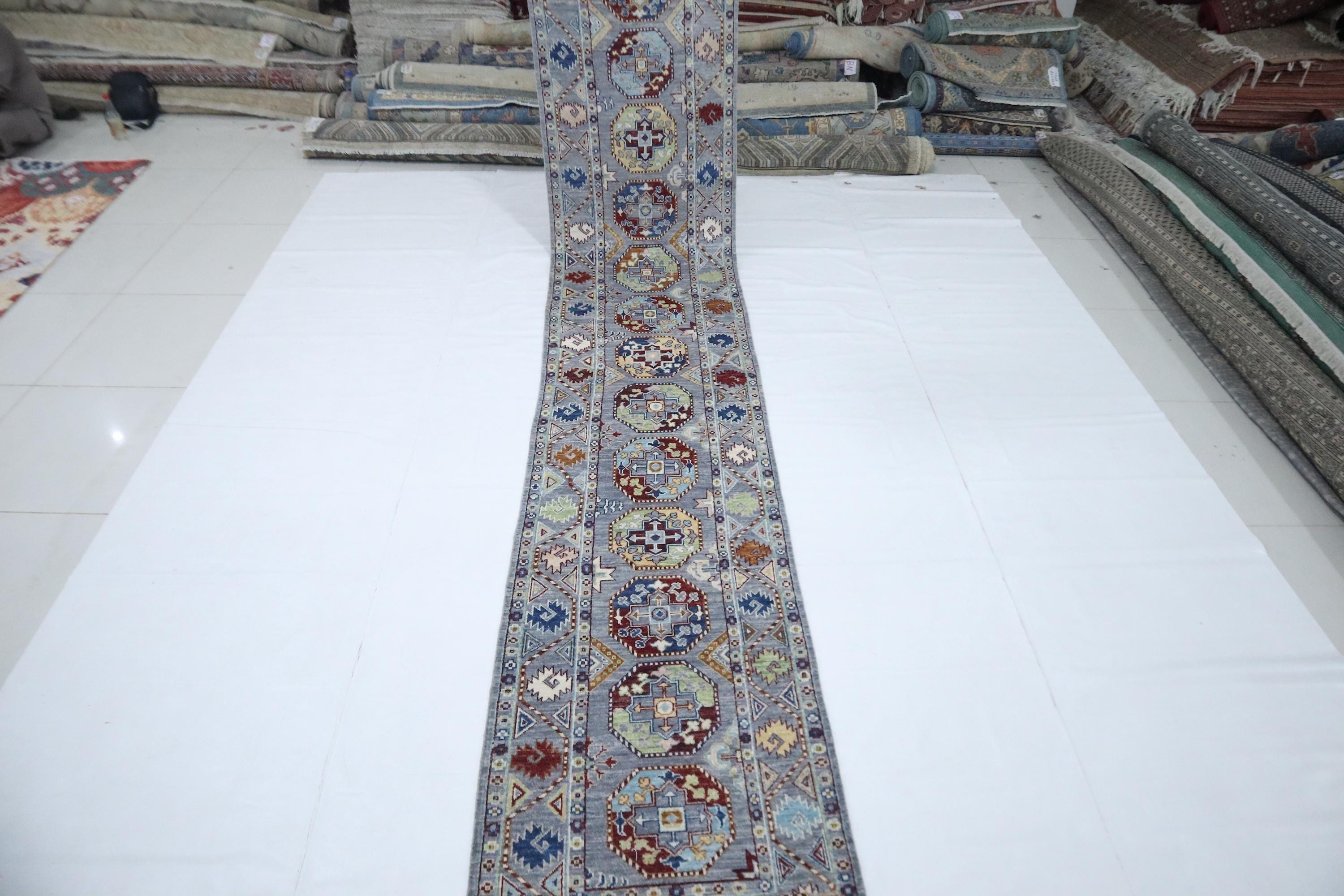 14 Ft Ersari Runner Rug, Gray Afghan Hand Knotted Geometric Organic Dye Wool Runner, Tribal Runner, Entryway Runner, Hallway Runner, Runners