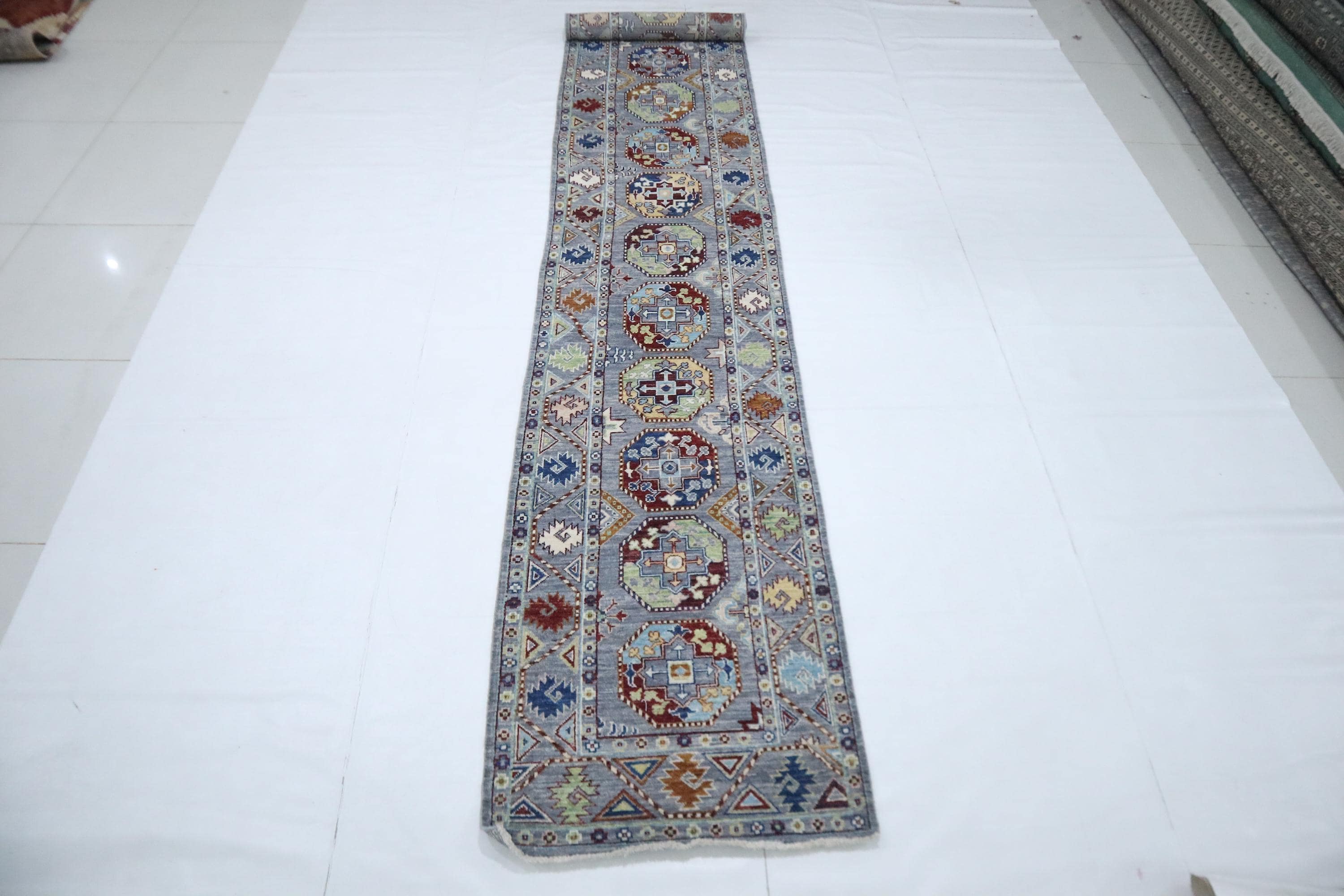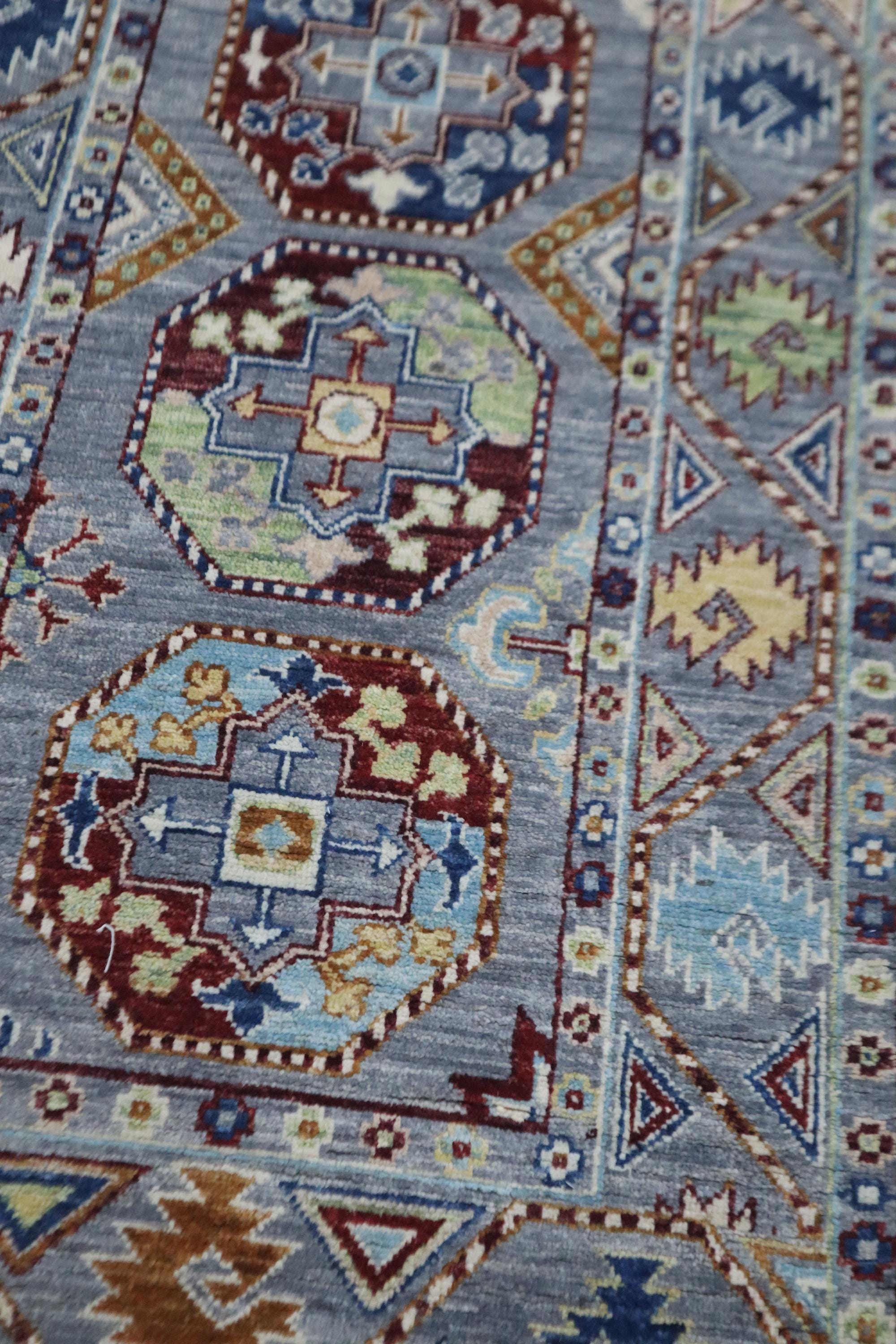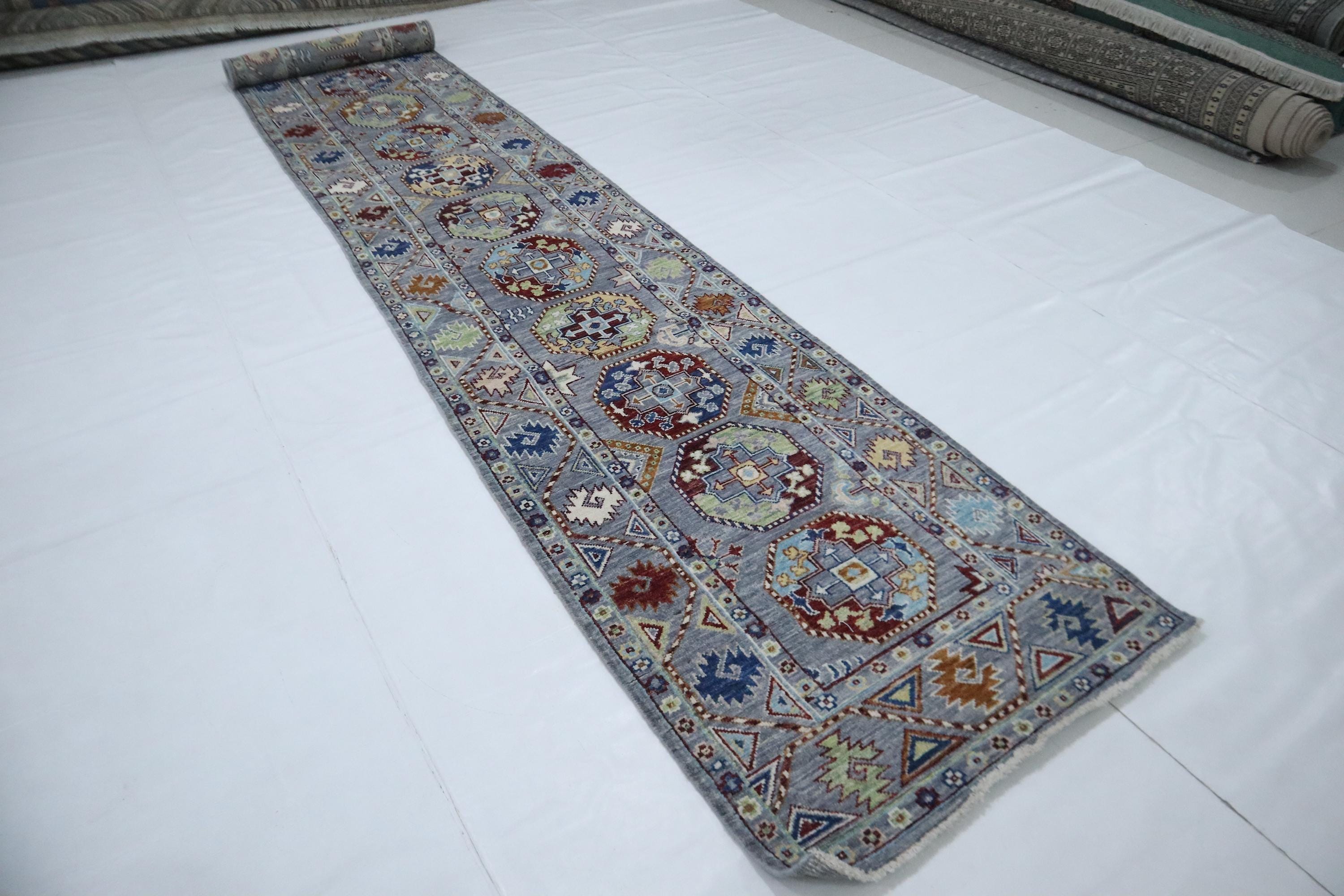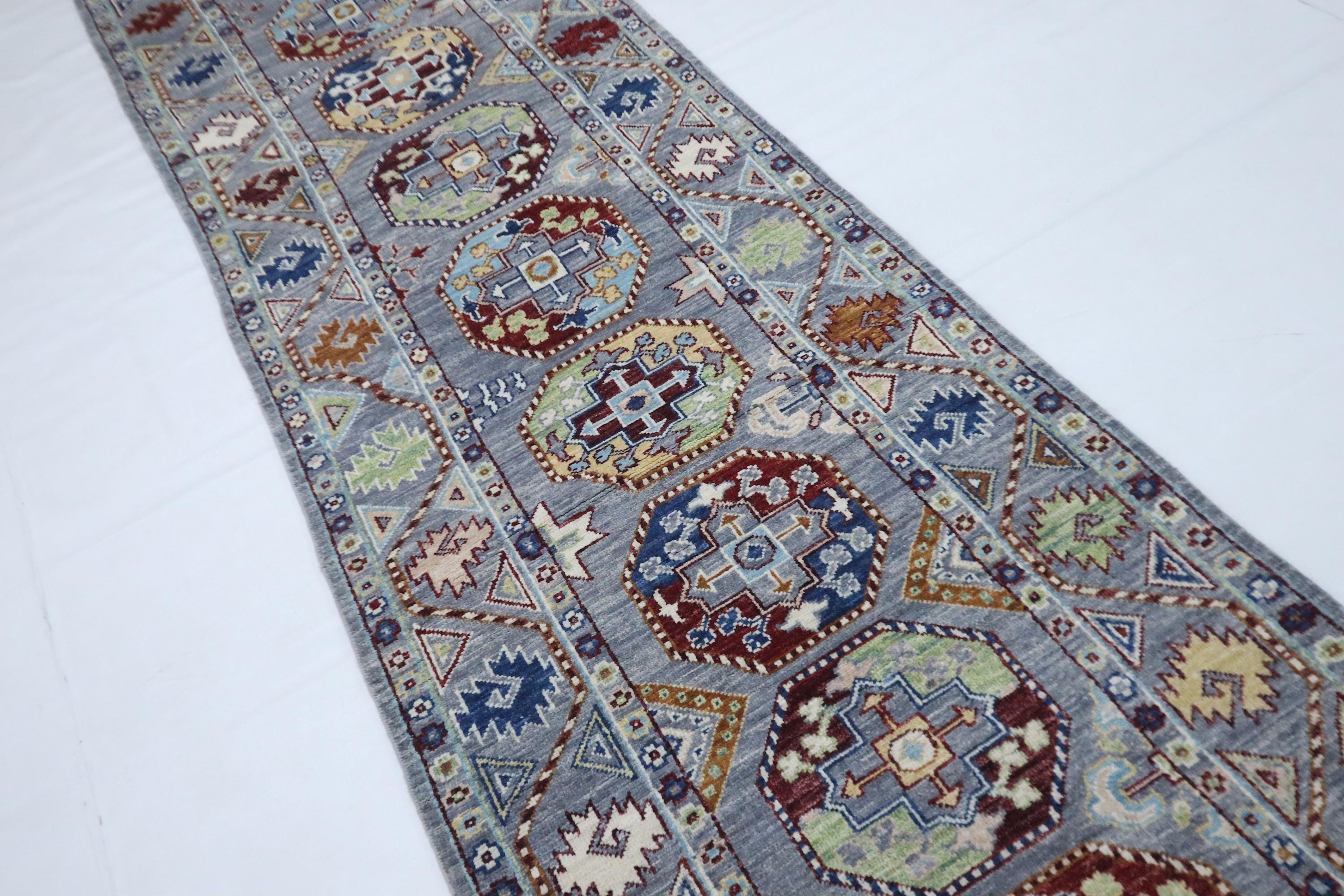 14 Ft Ersari Runner Rug, Gray Afghan Hand Knotted Geometric Organic Dye Wool Runner, Tribal Runner, Entryway Runner, Hallway Runner, Runners