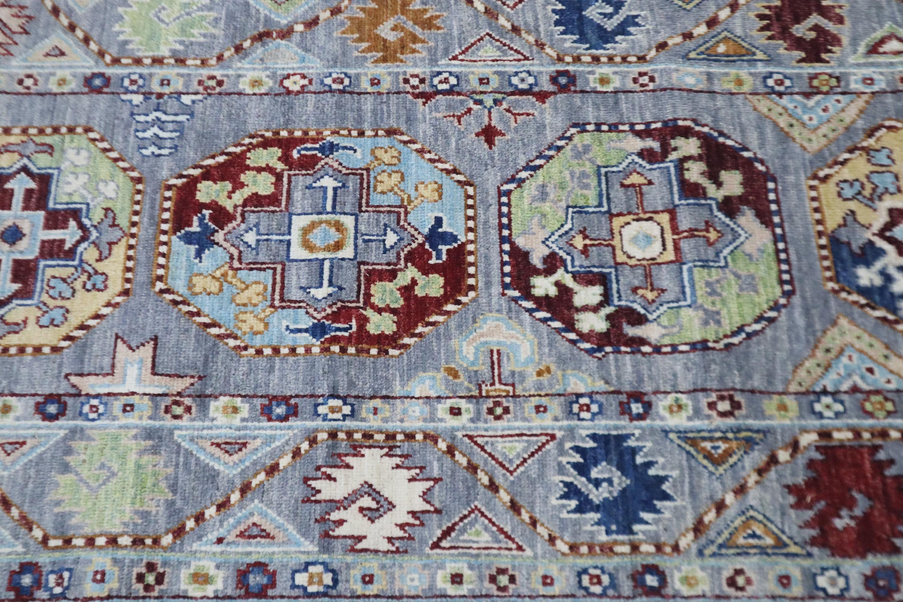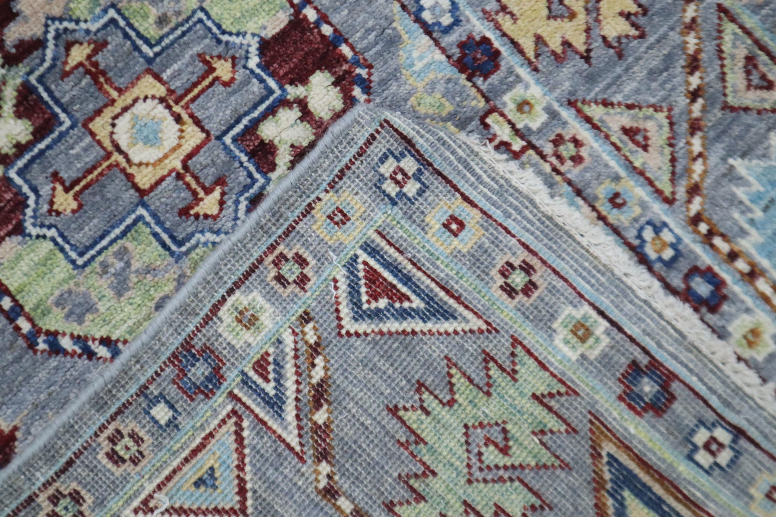 This hand-knotted pile rug is crafted using 100% natural dyes and handspun wool, giving it a rich texture and vibrant colors.