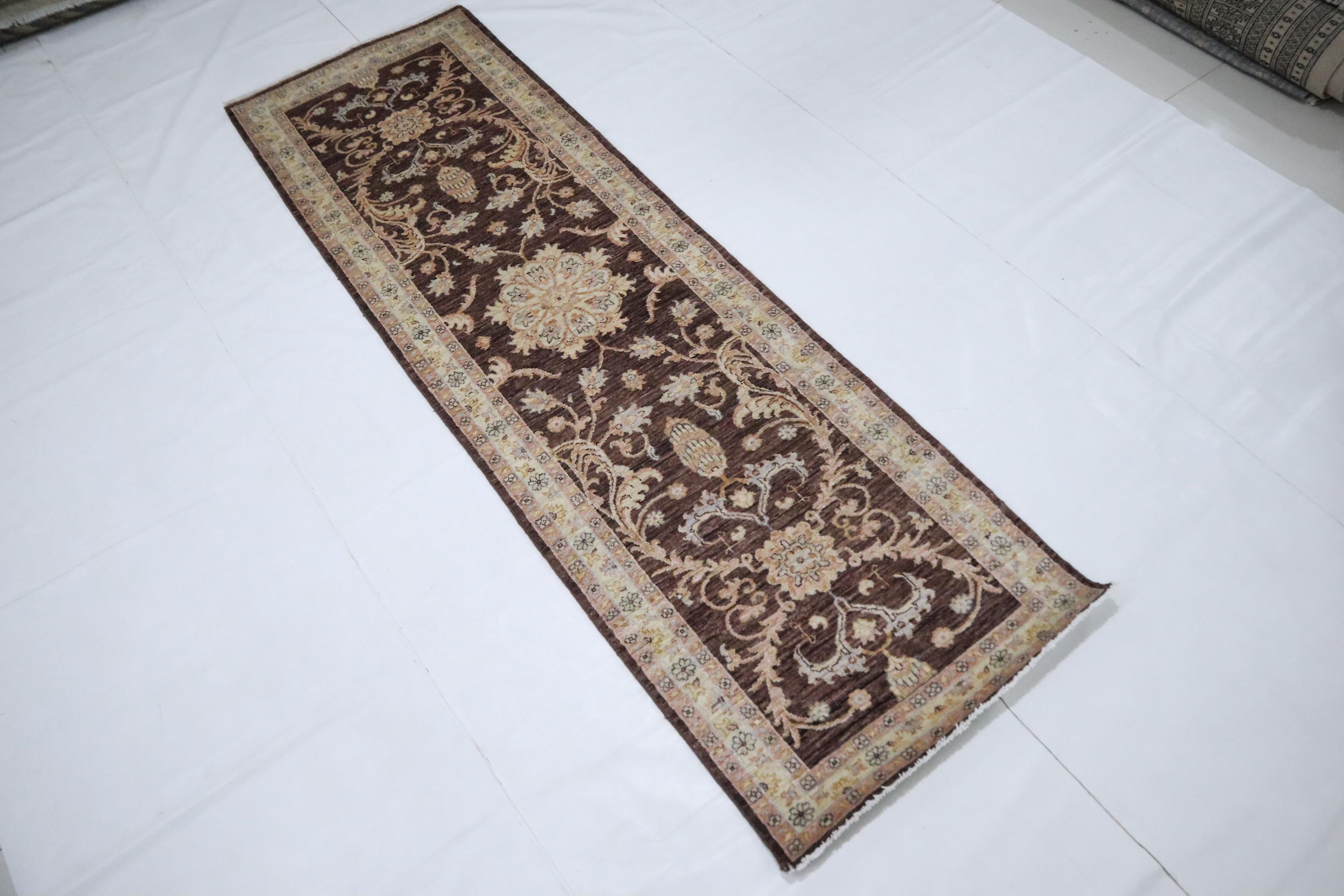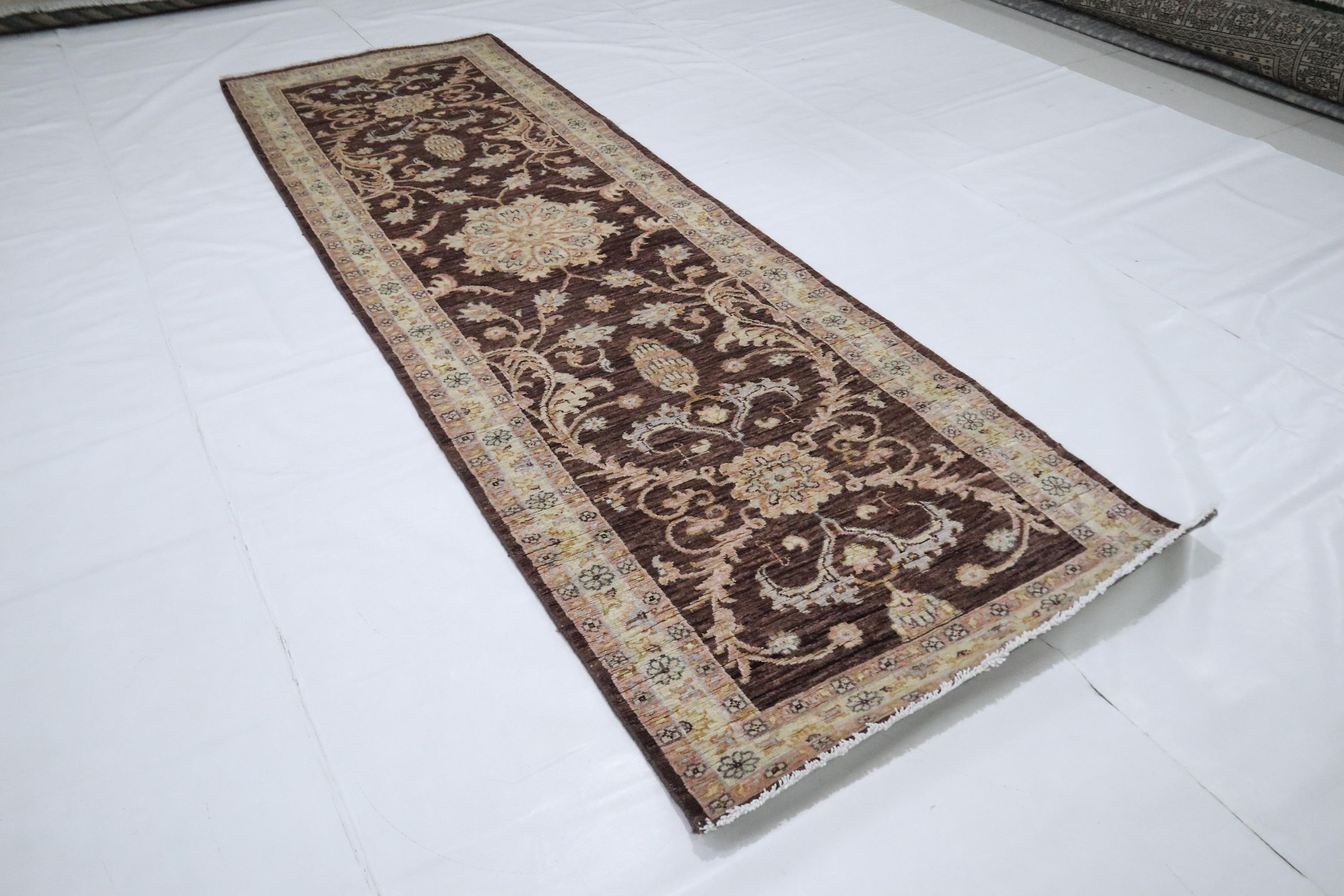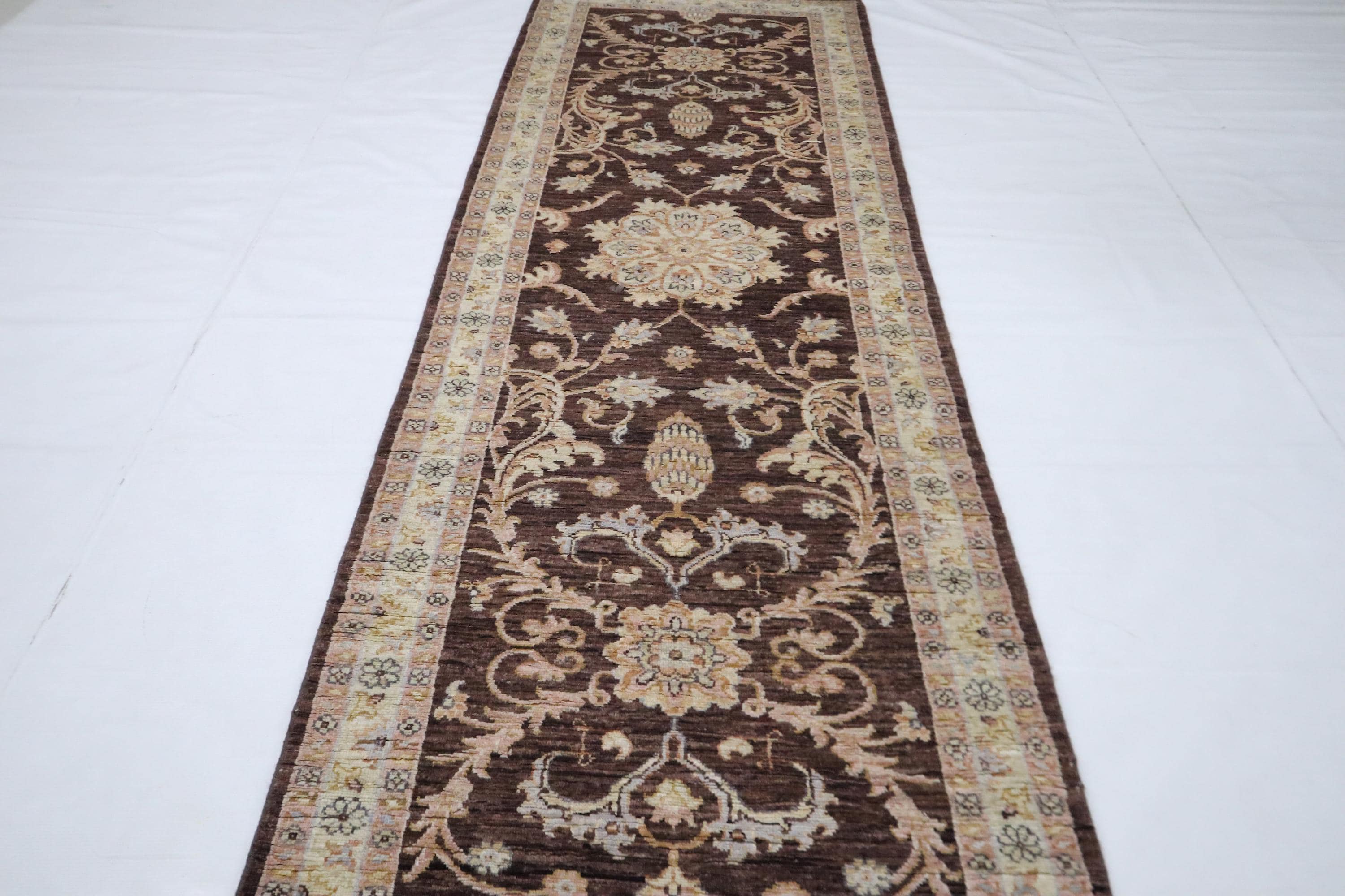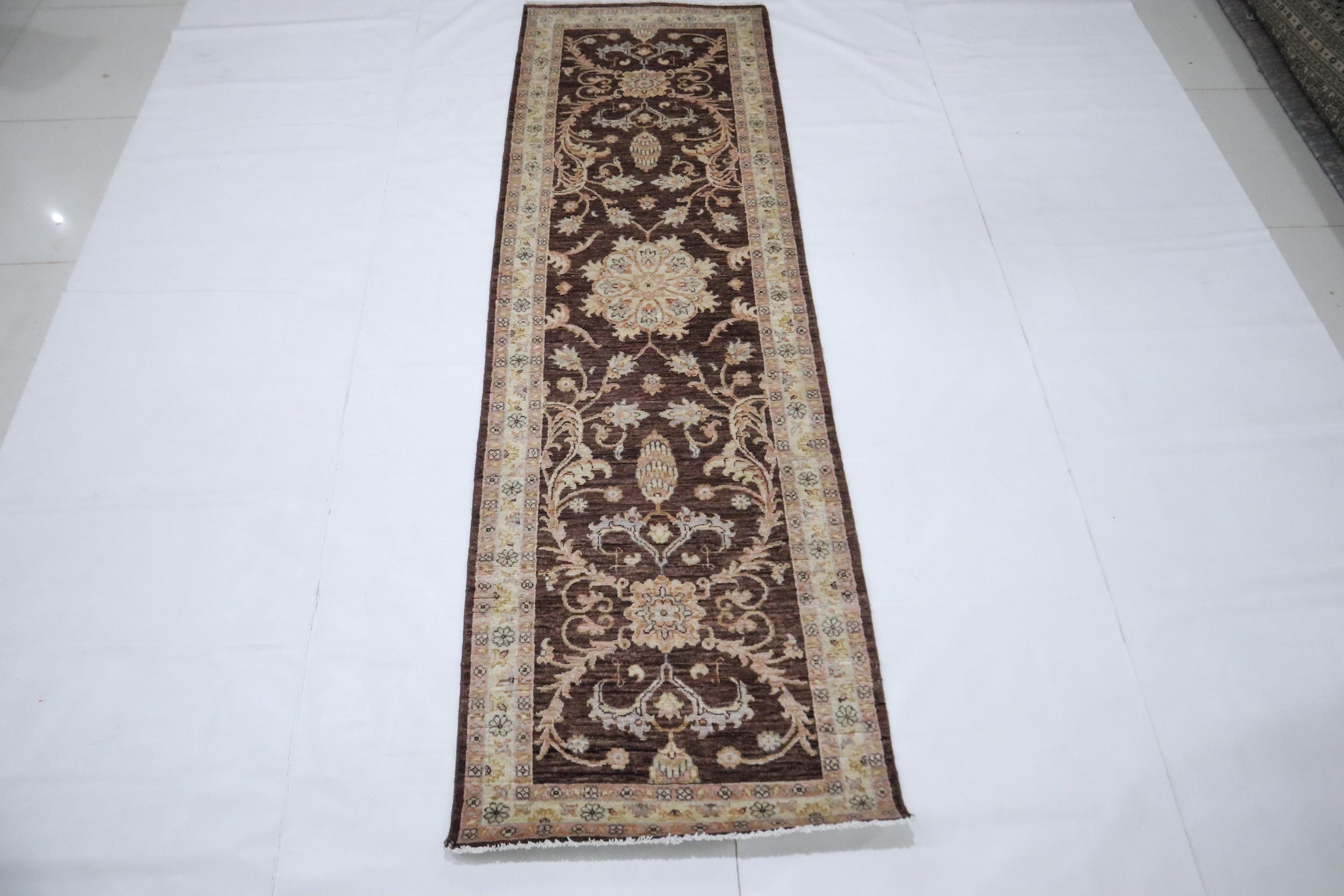 8 Ft Chobi Runner Rug, Choco Brown Afghan Hand Knotted Organic Dye Wool Runner, Floral Runner, Traditional Runner, Bedroom Runner, Runners