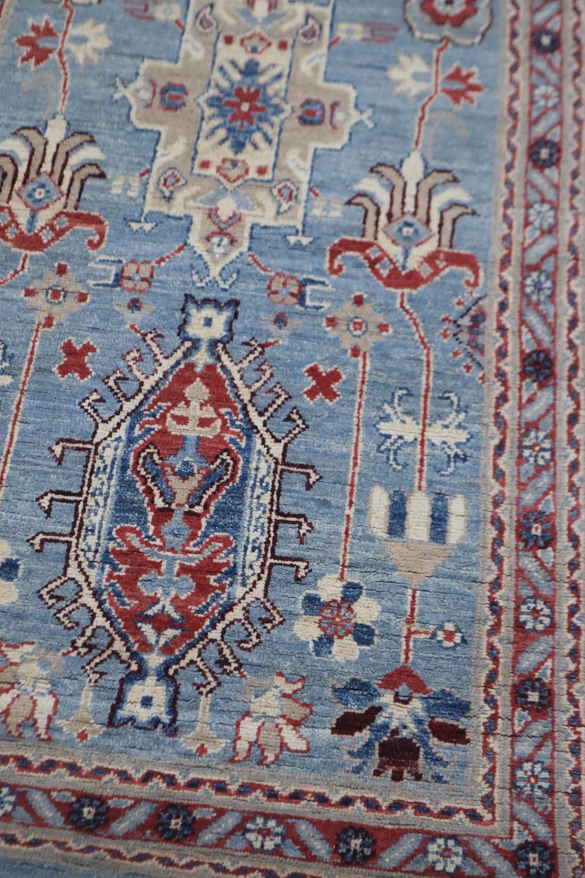 This hand-knotted pile rug is crafted using 100% natural dyes and handspun wool, giving it a rich texture and vibrant colors.