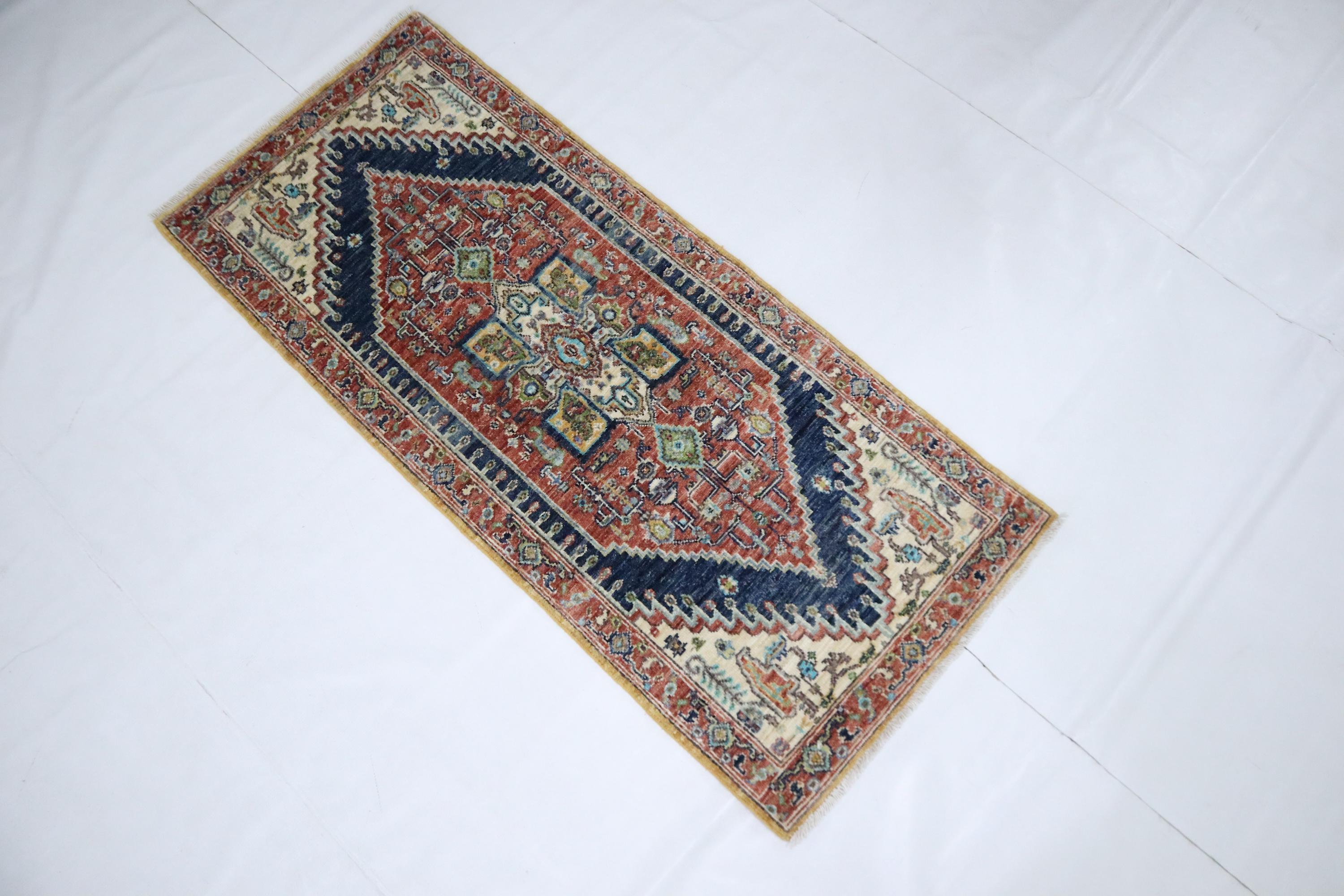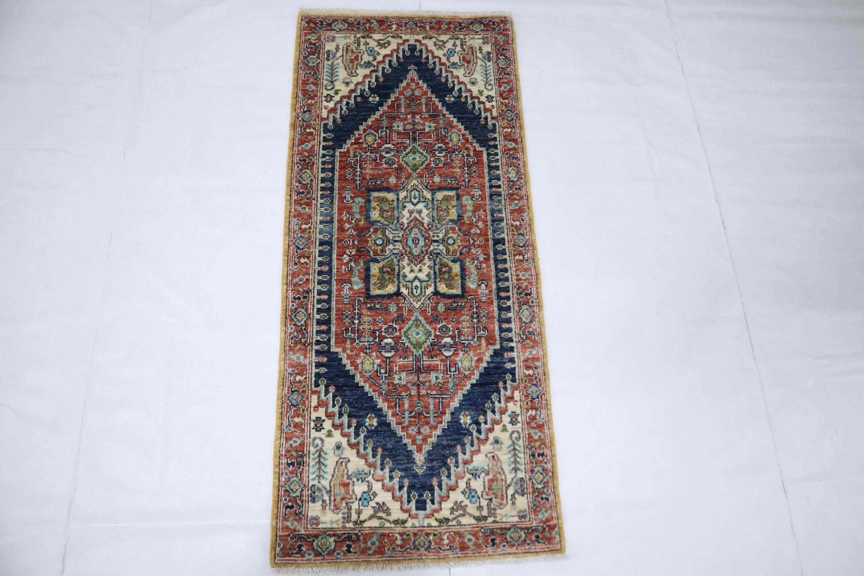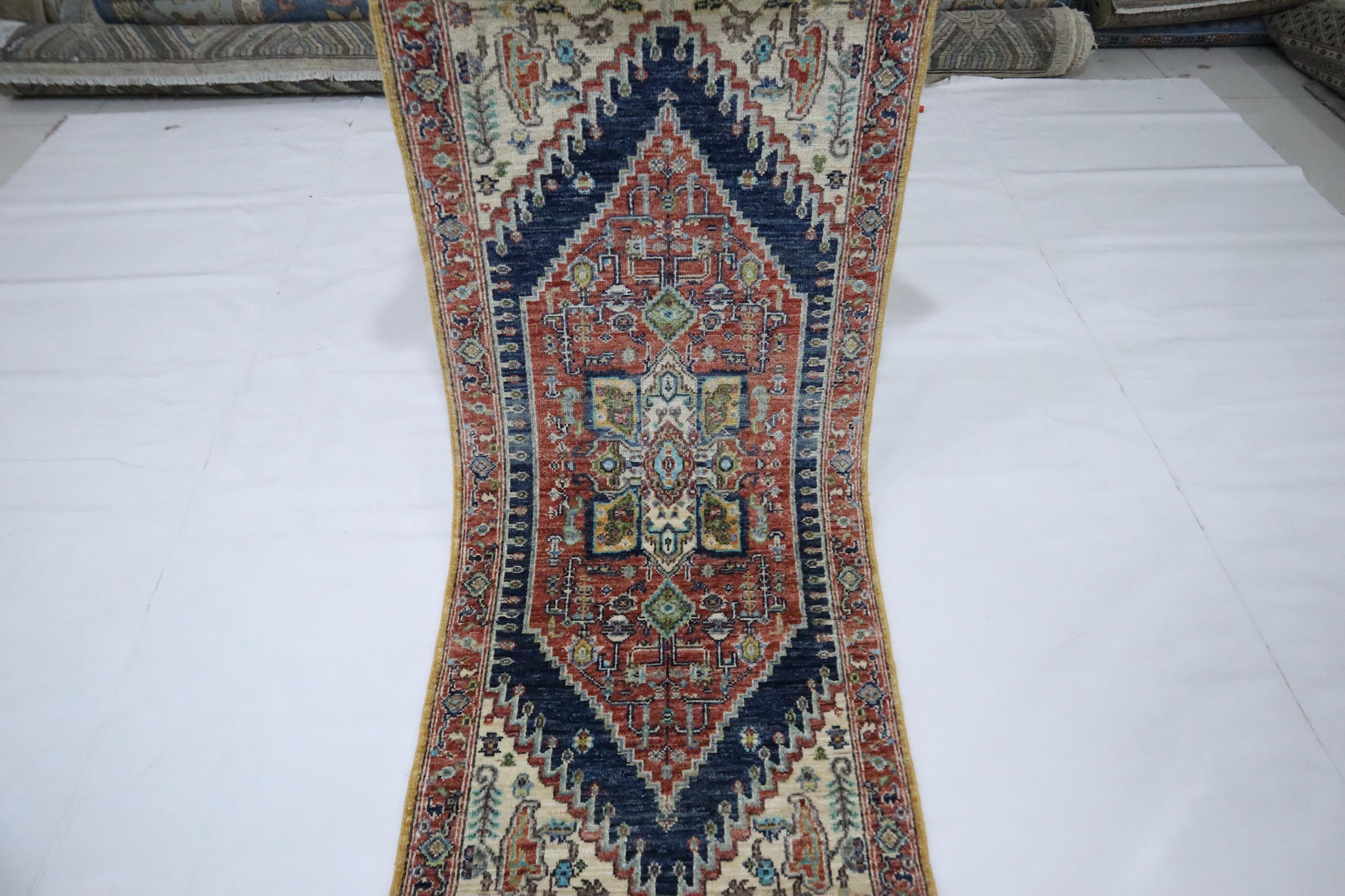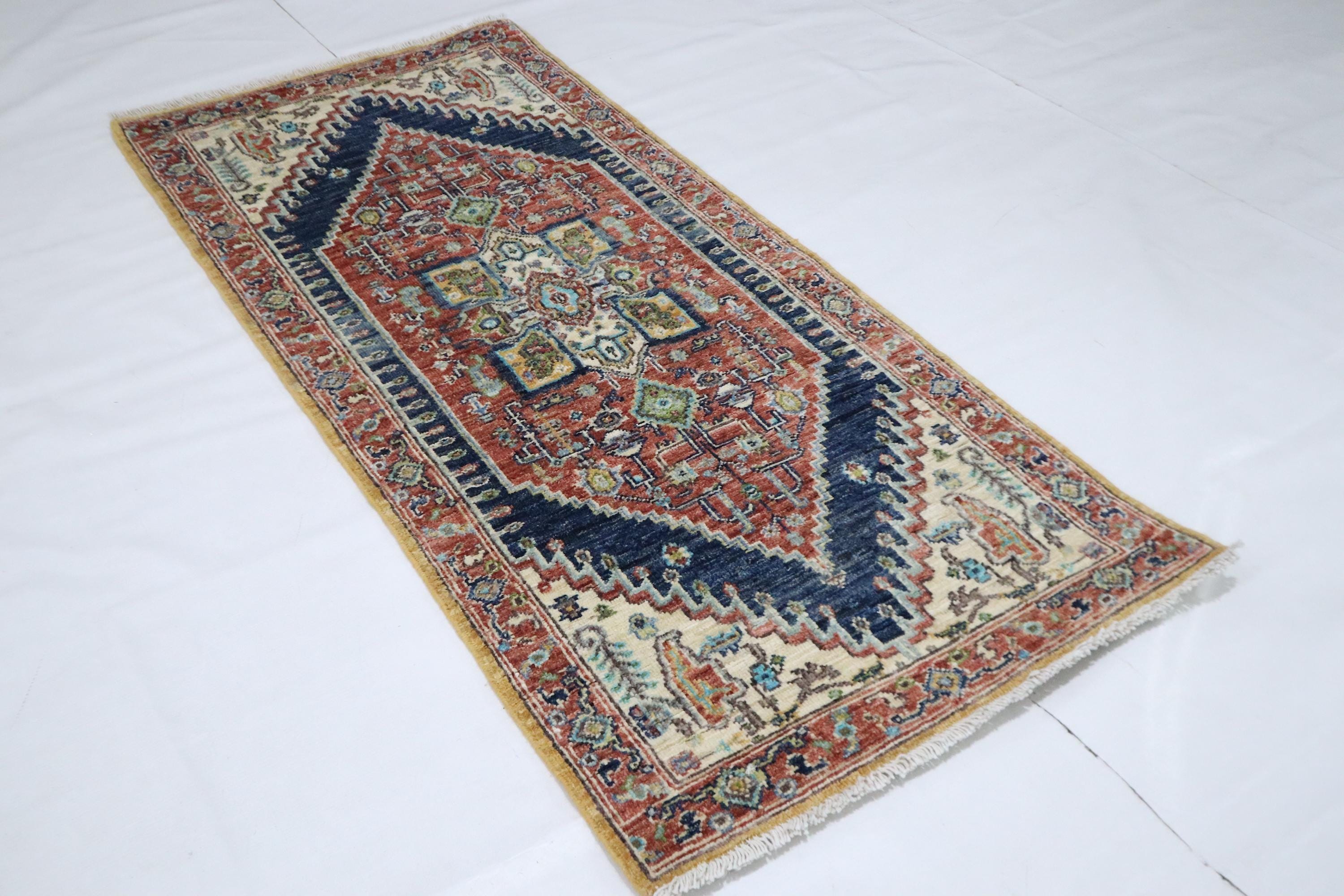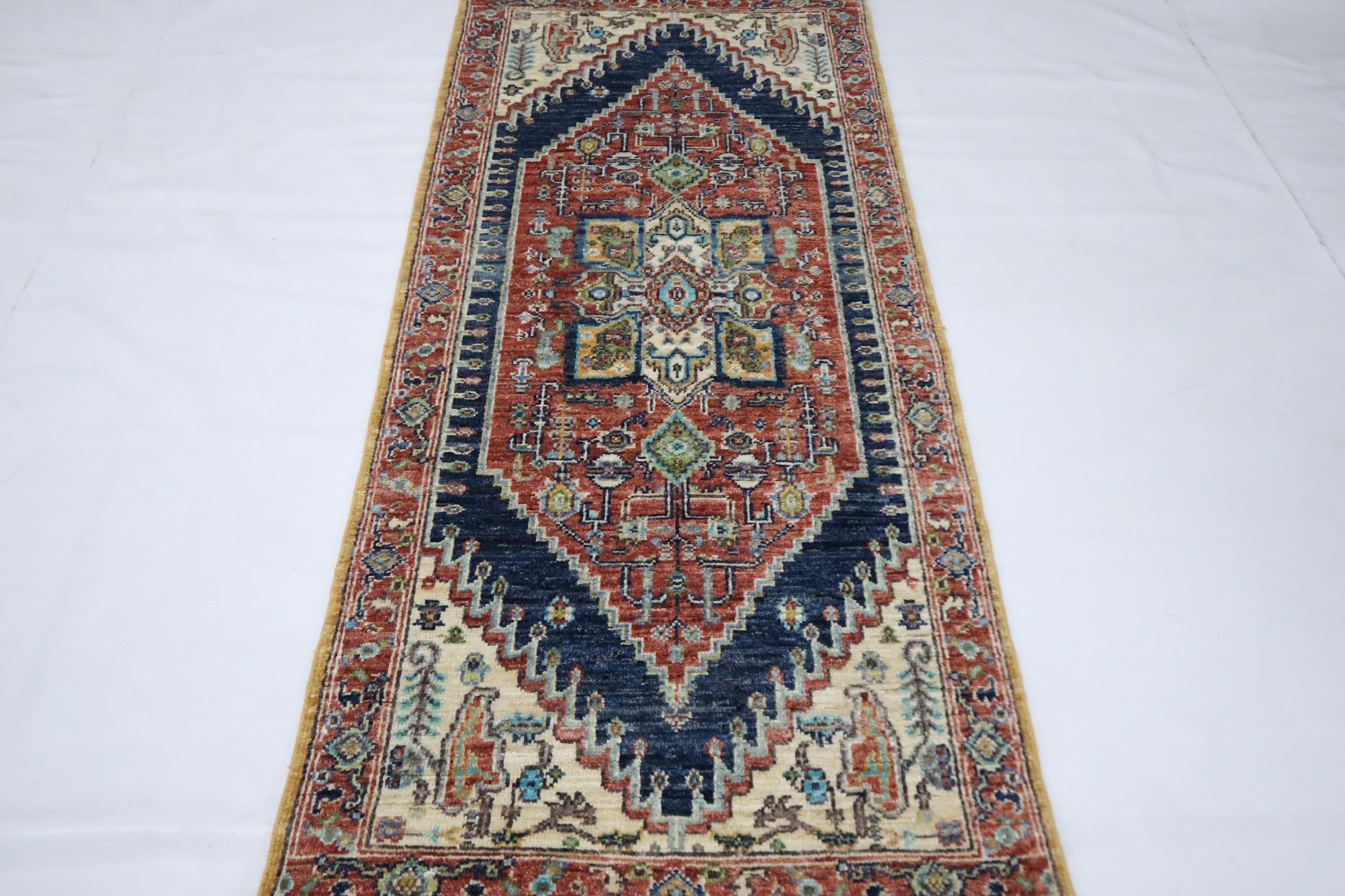 5 Ft Heriz Runner Rug, Rust Blue Persian Style Afghan Hand Knotted Traditional Veg Dye Wool Runner, Bedroom Runner, Entryway Runner, Runners