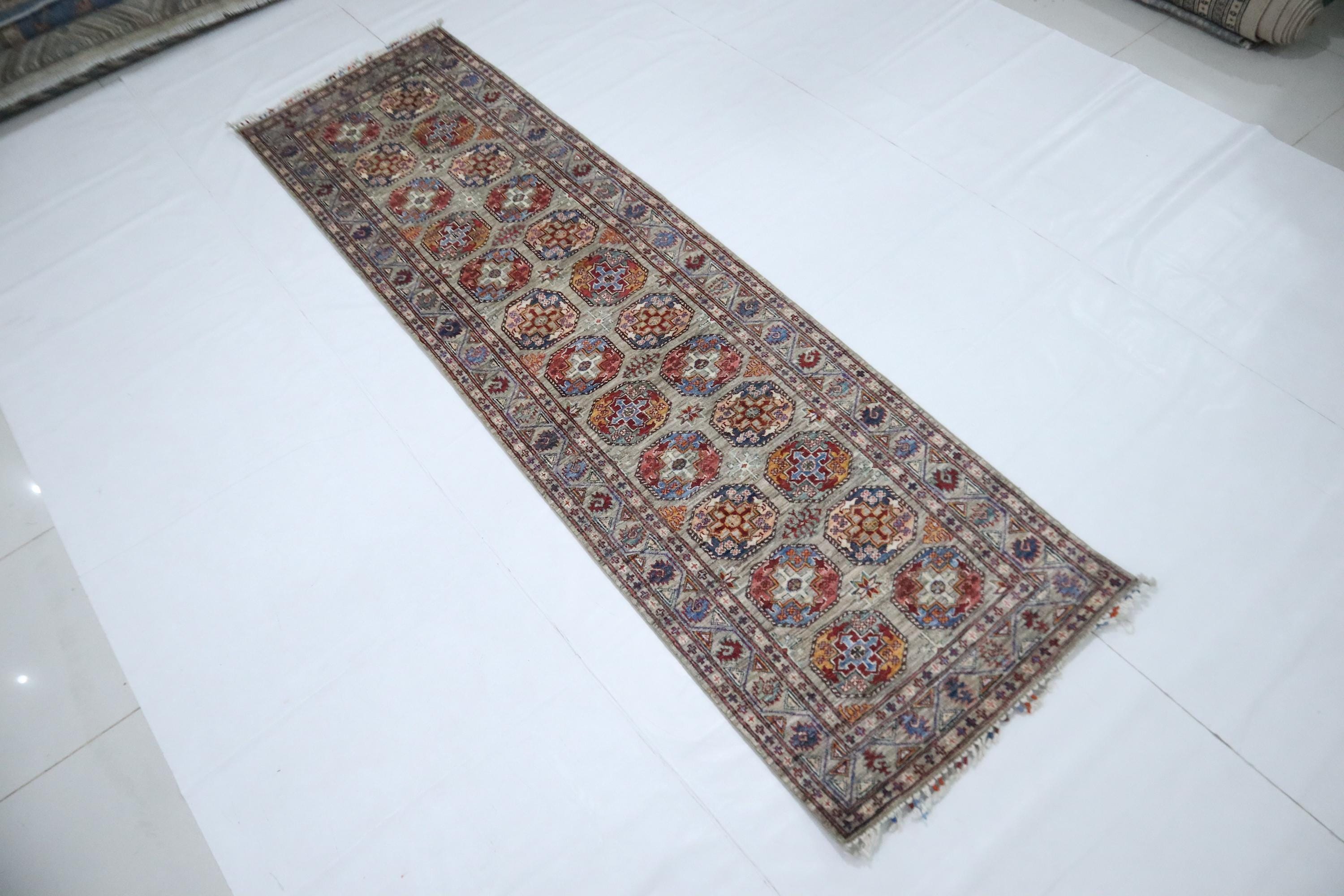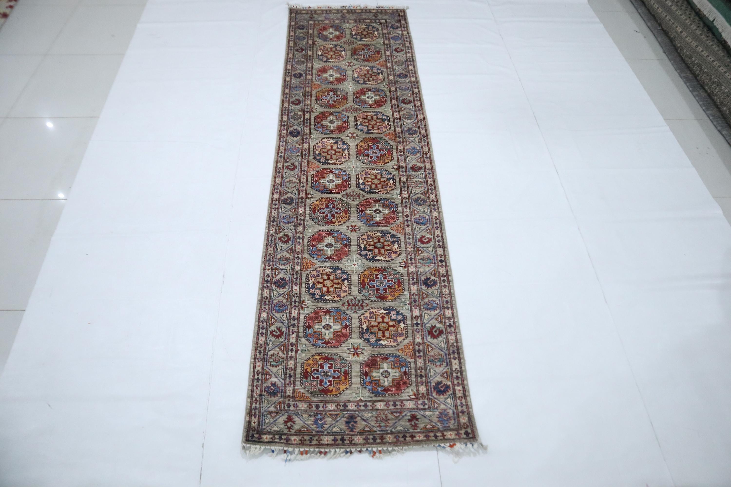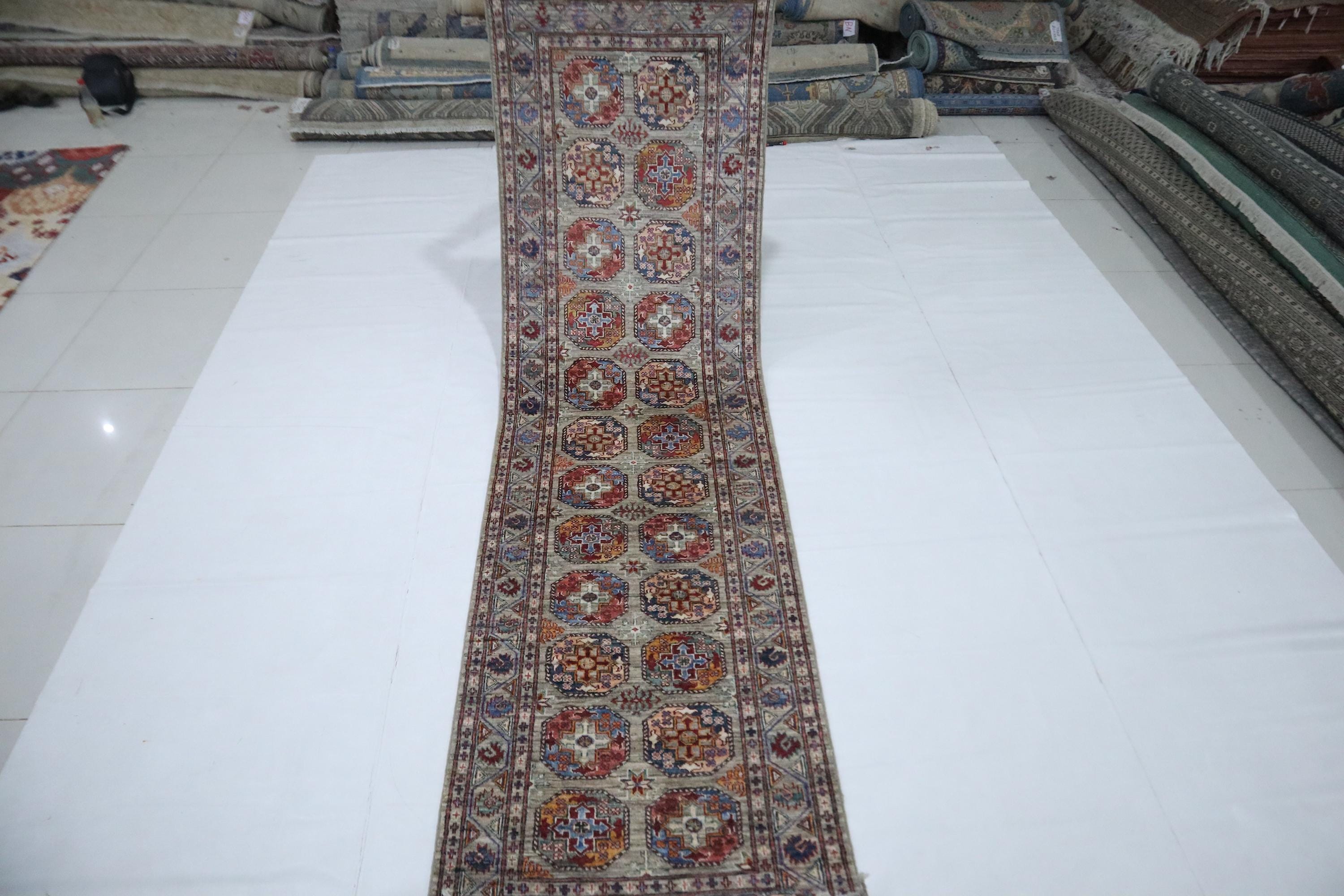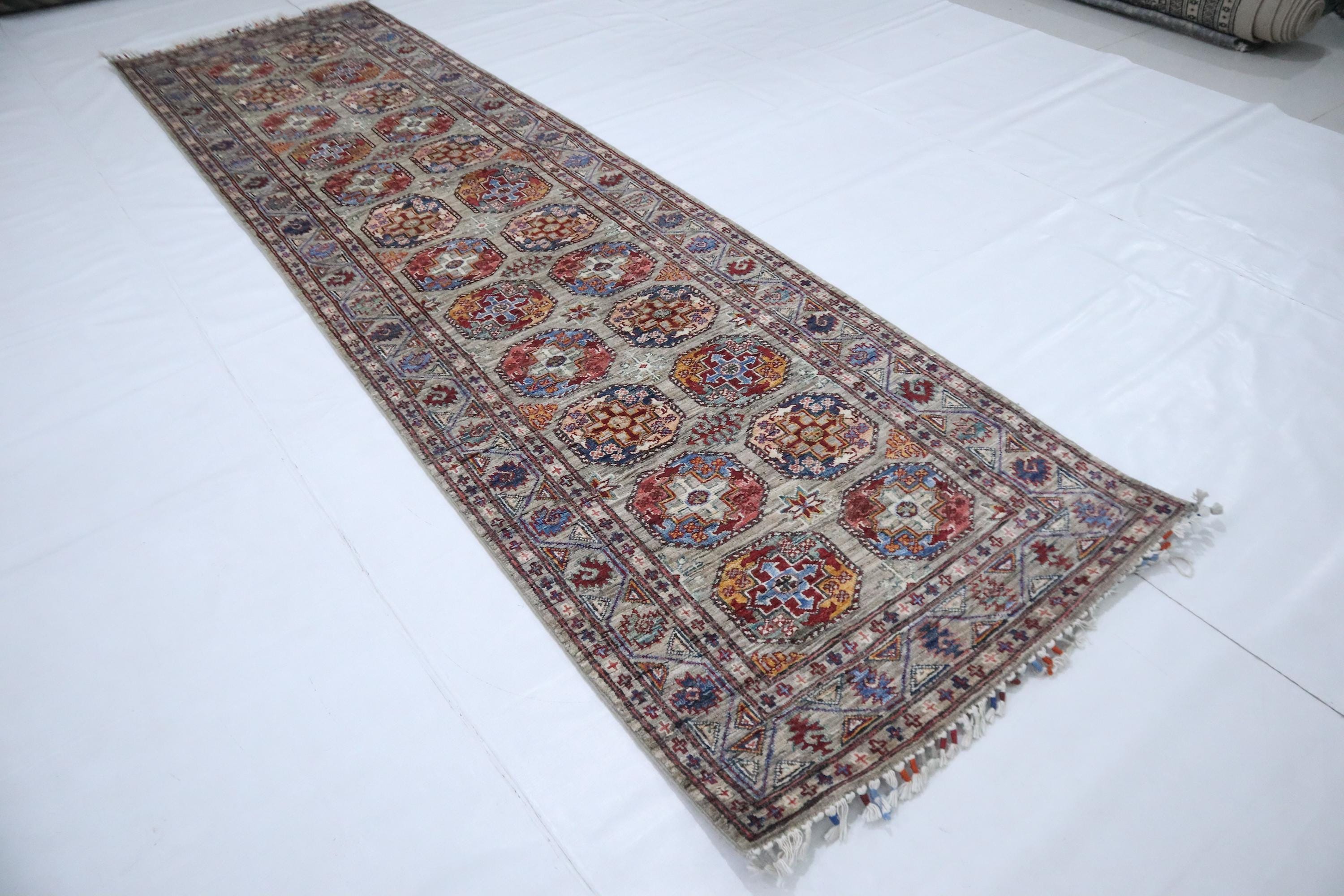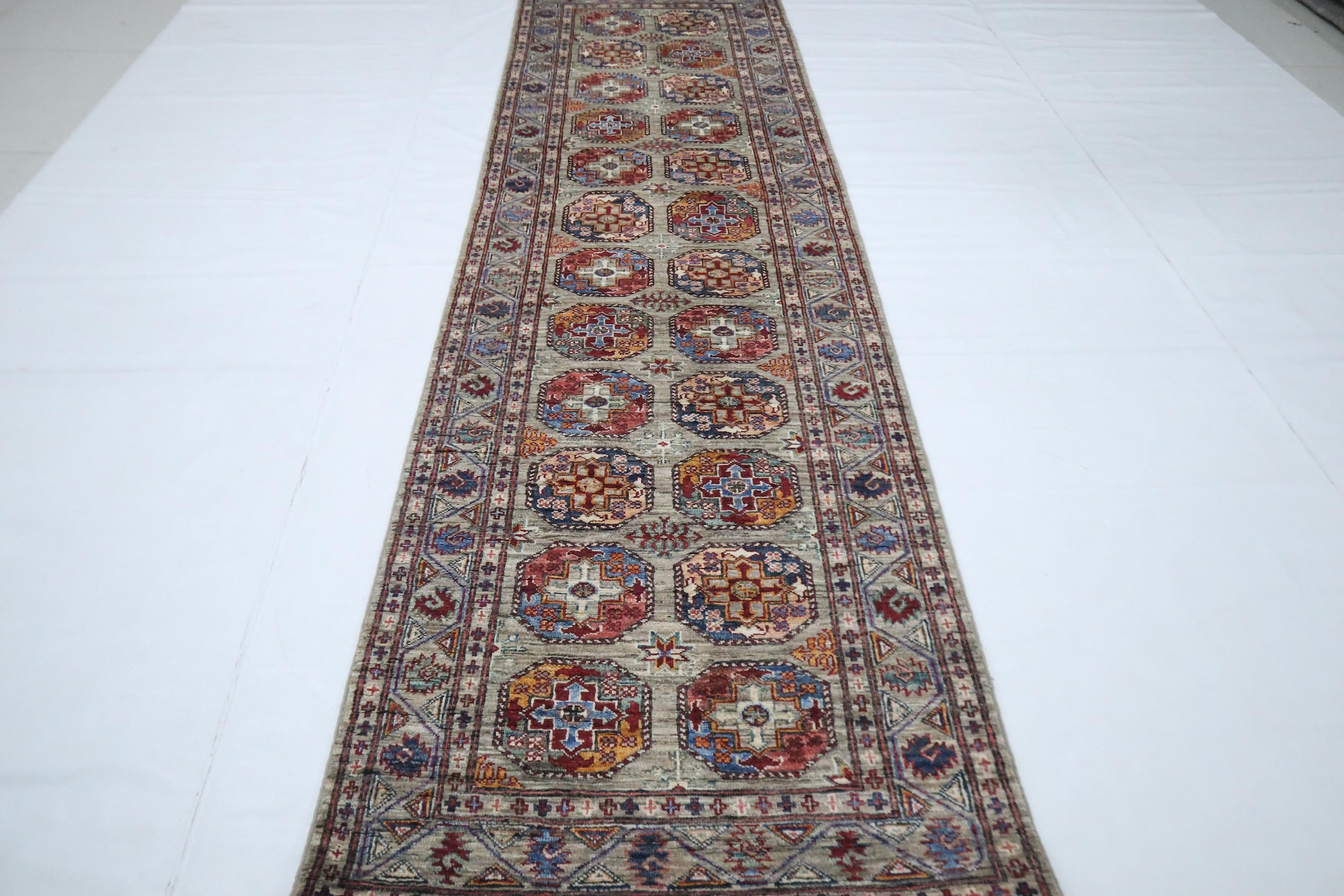 10 Ft Ersari Runner Rug, Gray Runner, Afghan Hand Knotted Veg Dye Wool Runner, Geometric Runner, Tribal Runner, Bedroom Runner, Runners