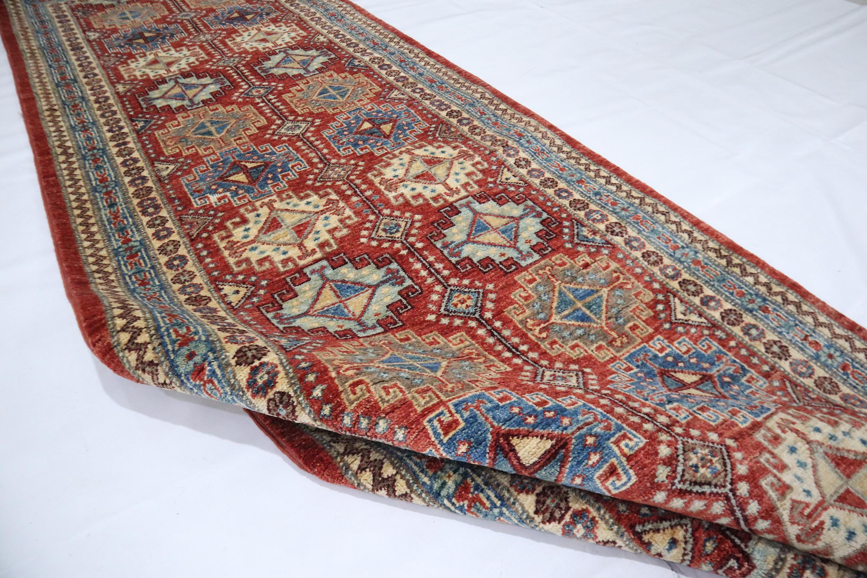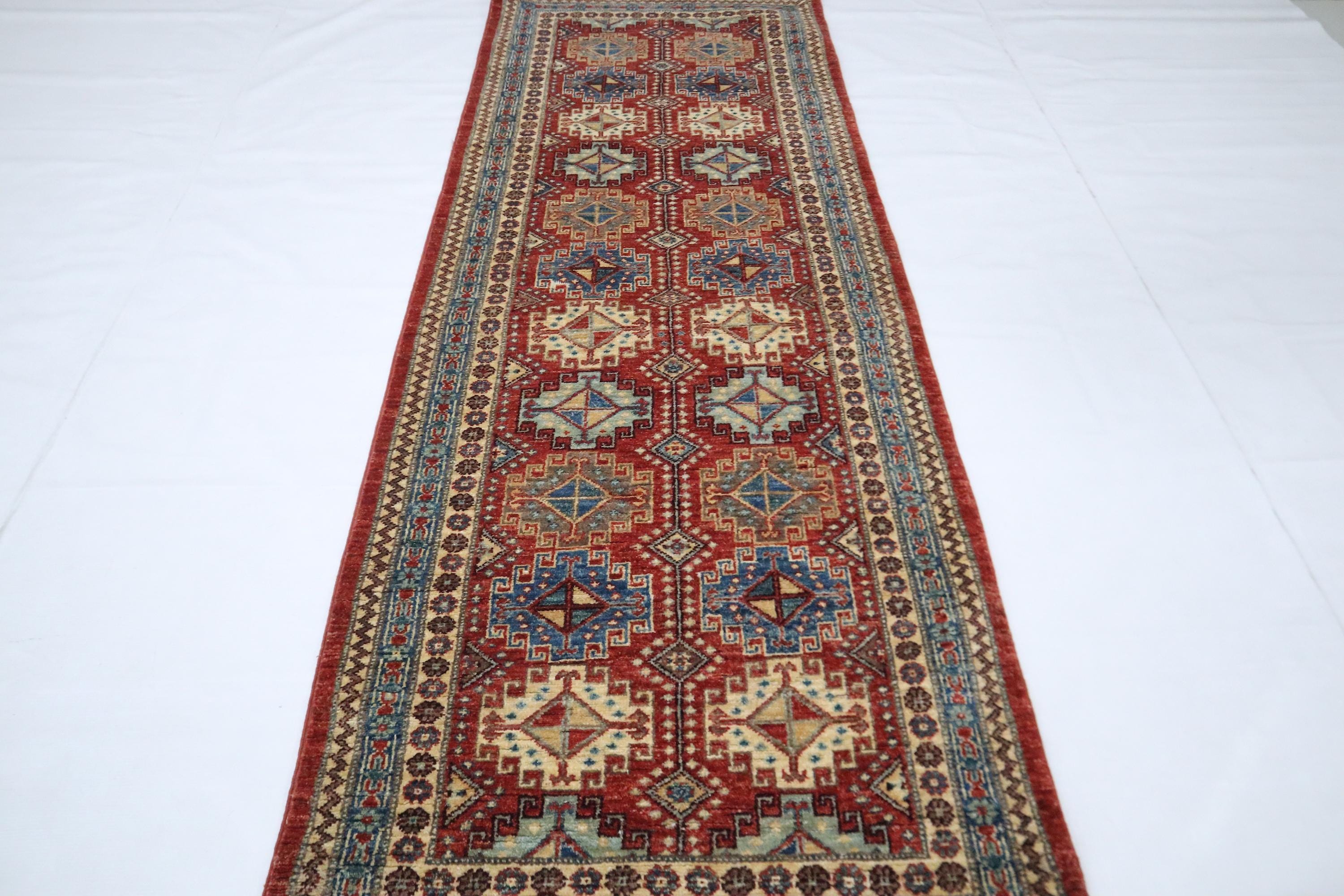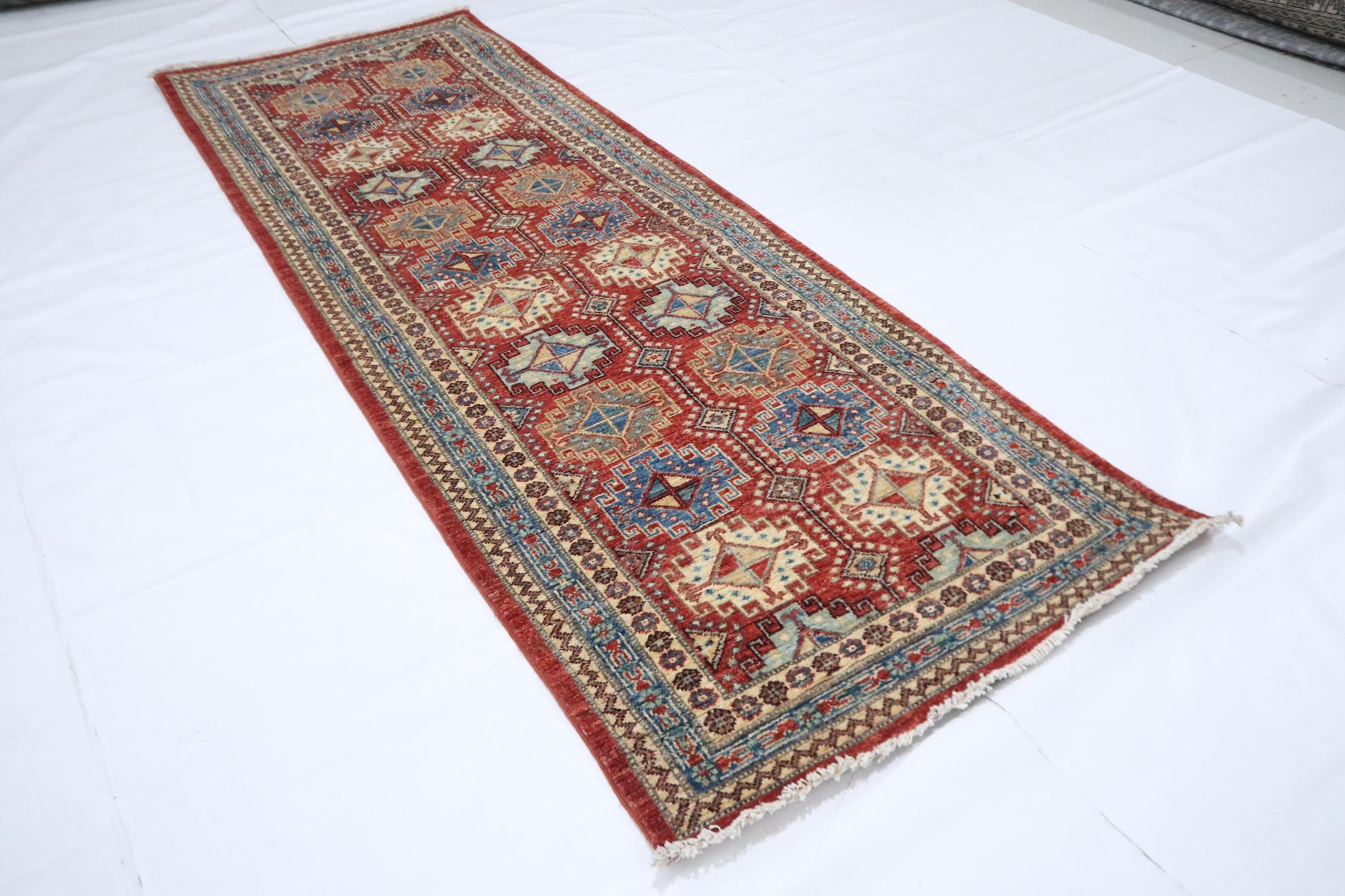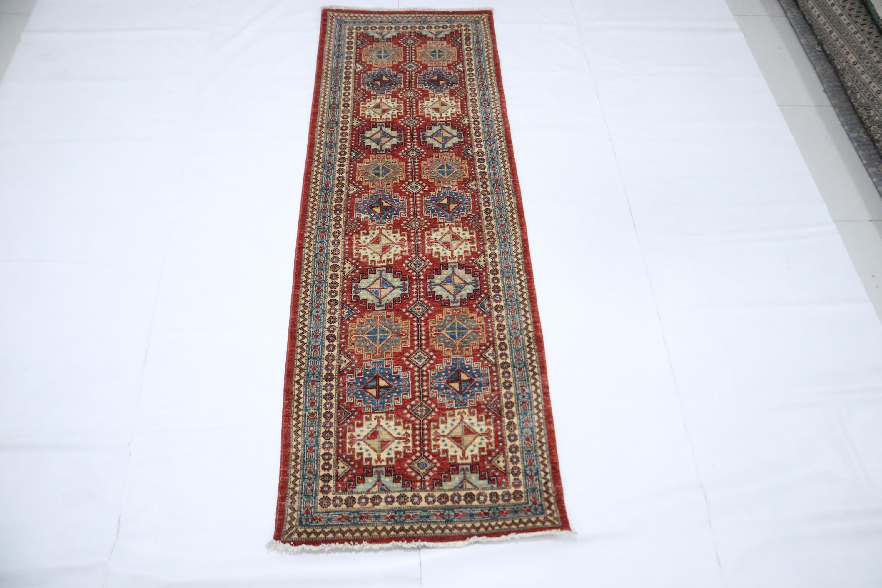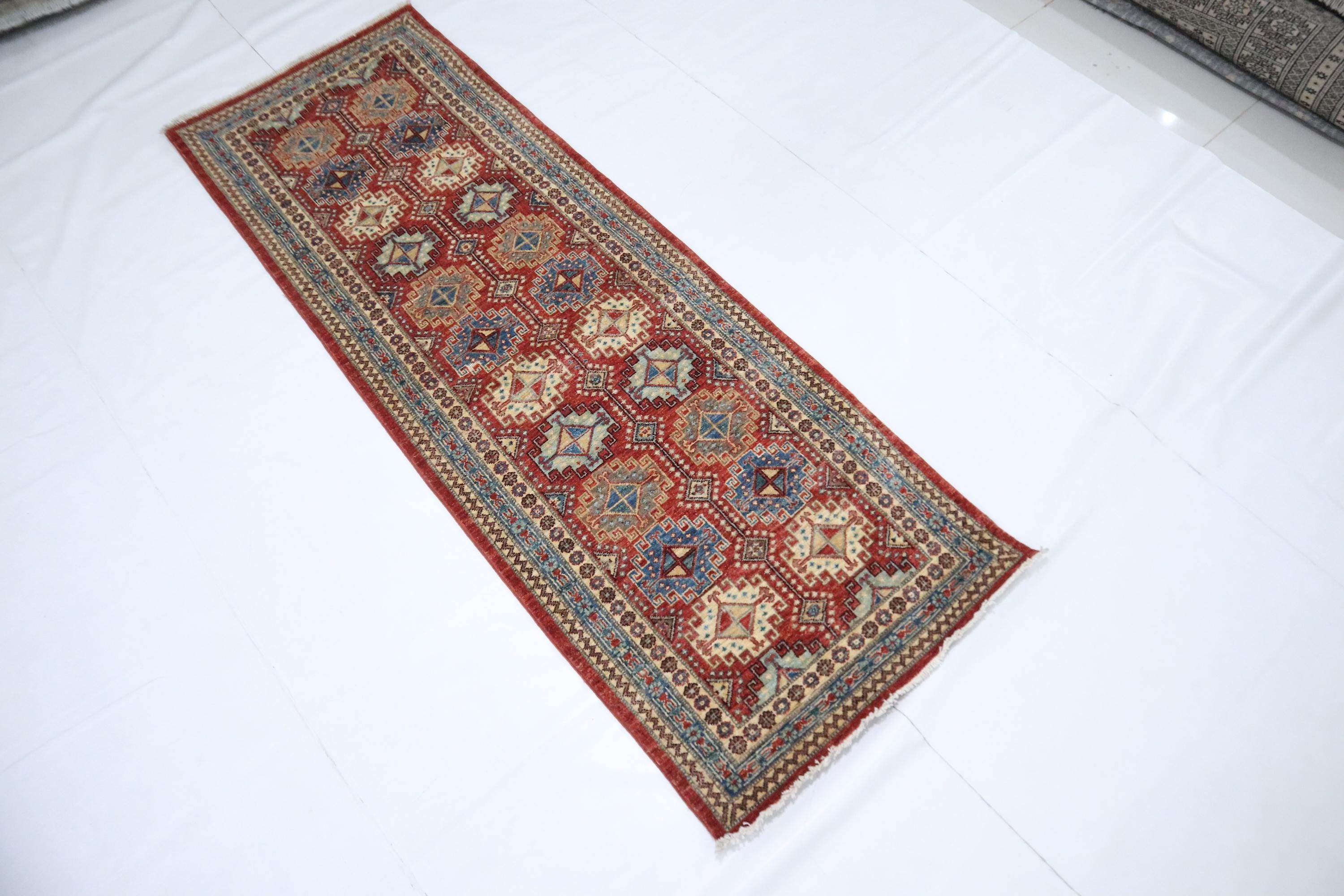 7 Ft Chobi Runner Rug, Rusty Red Afghan Hand Knotted Geometric Veg Dye Wool Runner, Traditional Runner, Entryway Runner, Bedroom Runner
