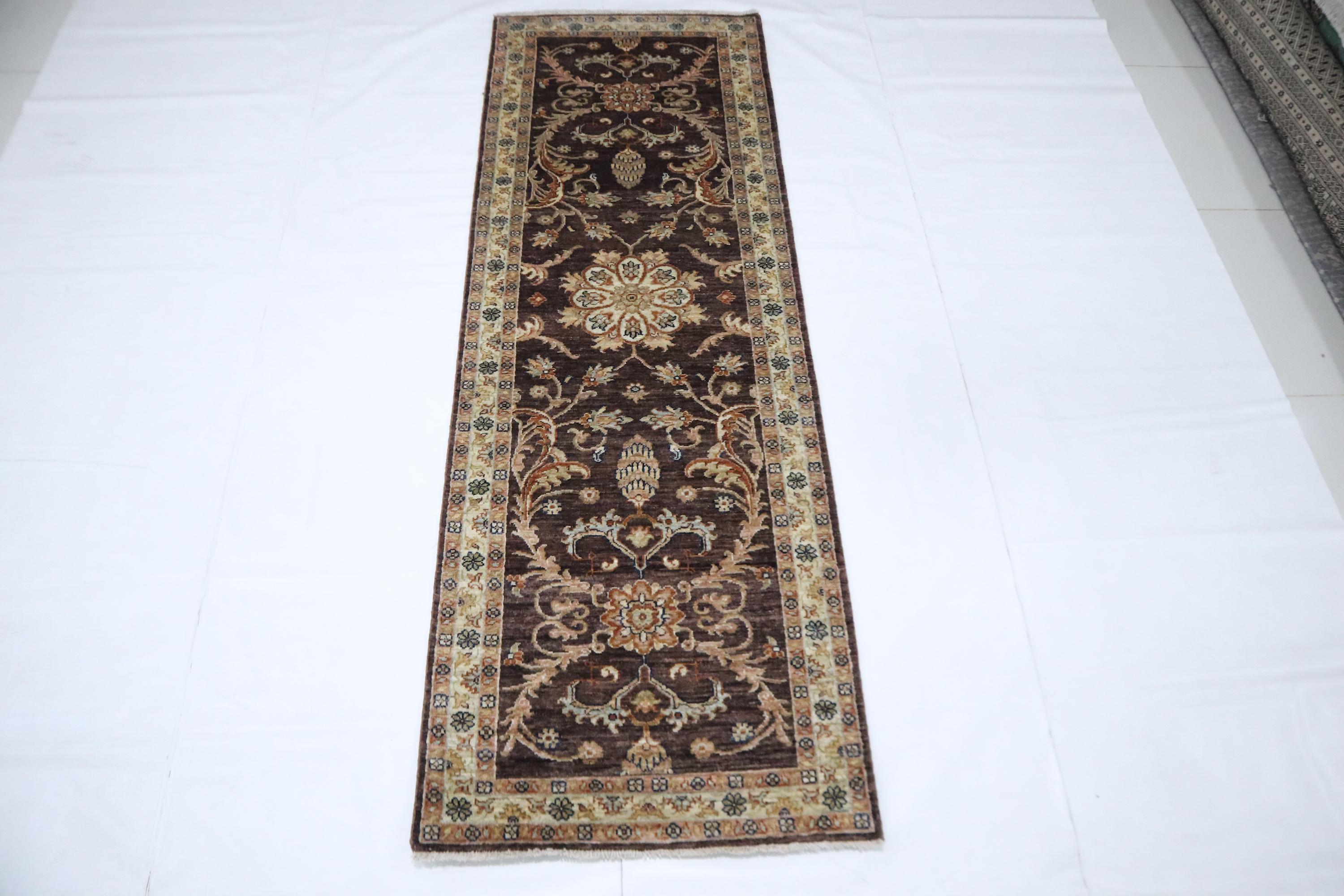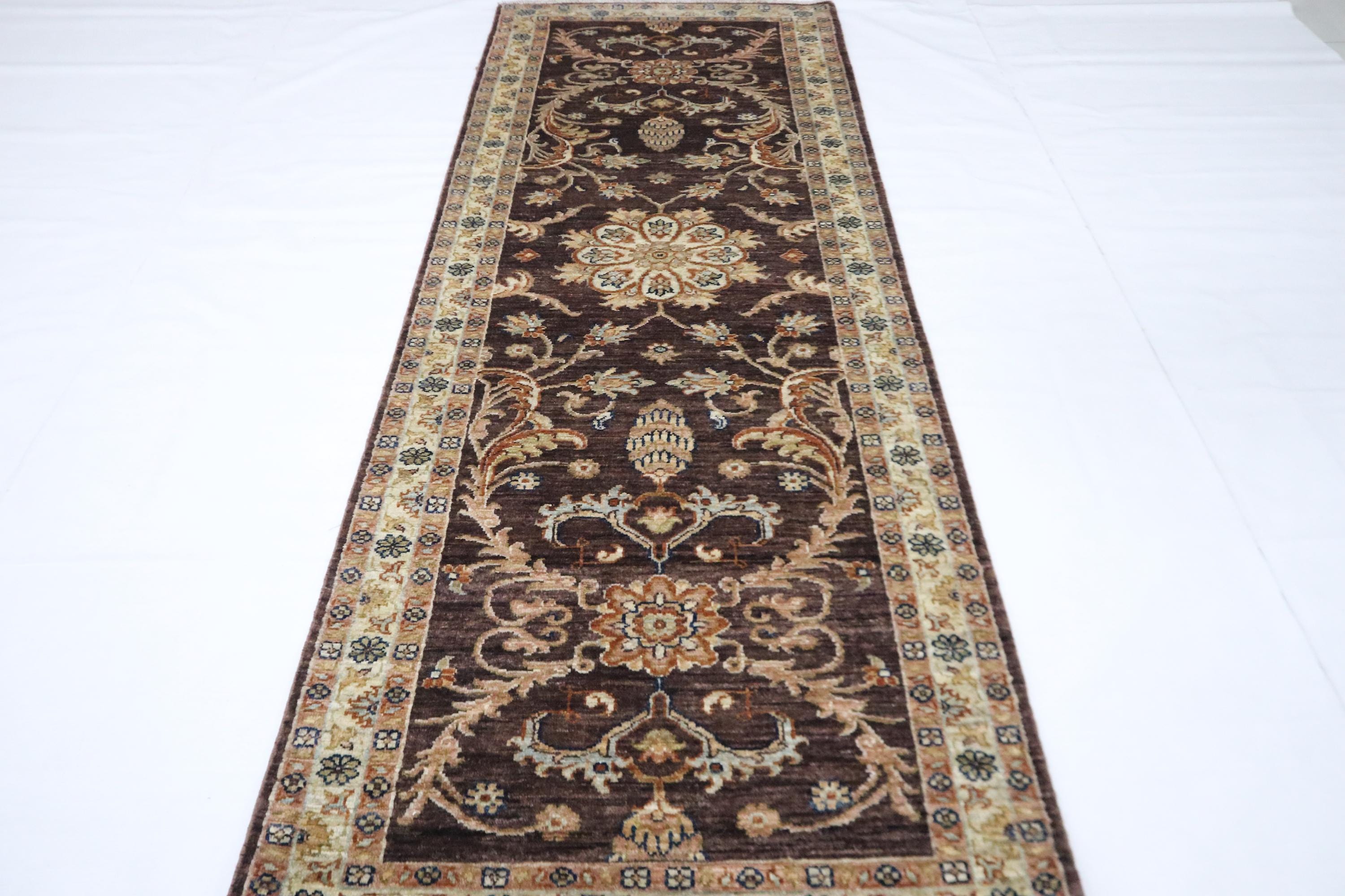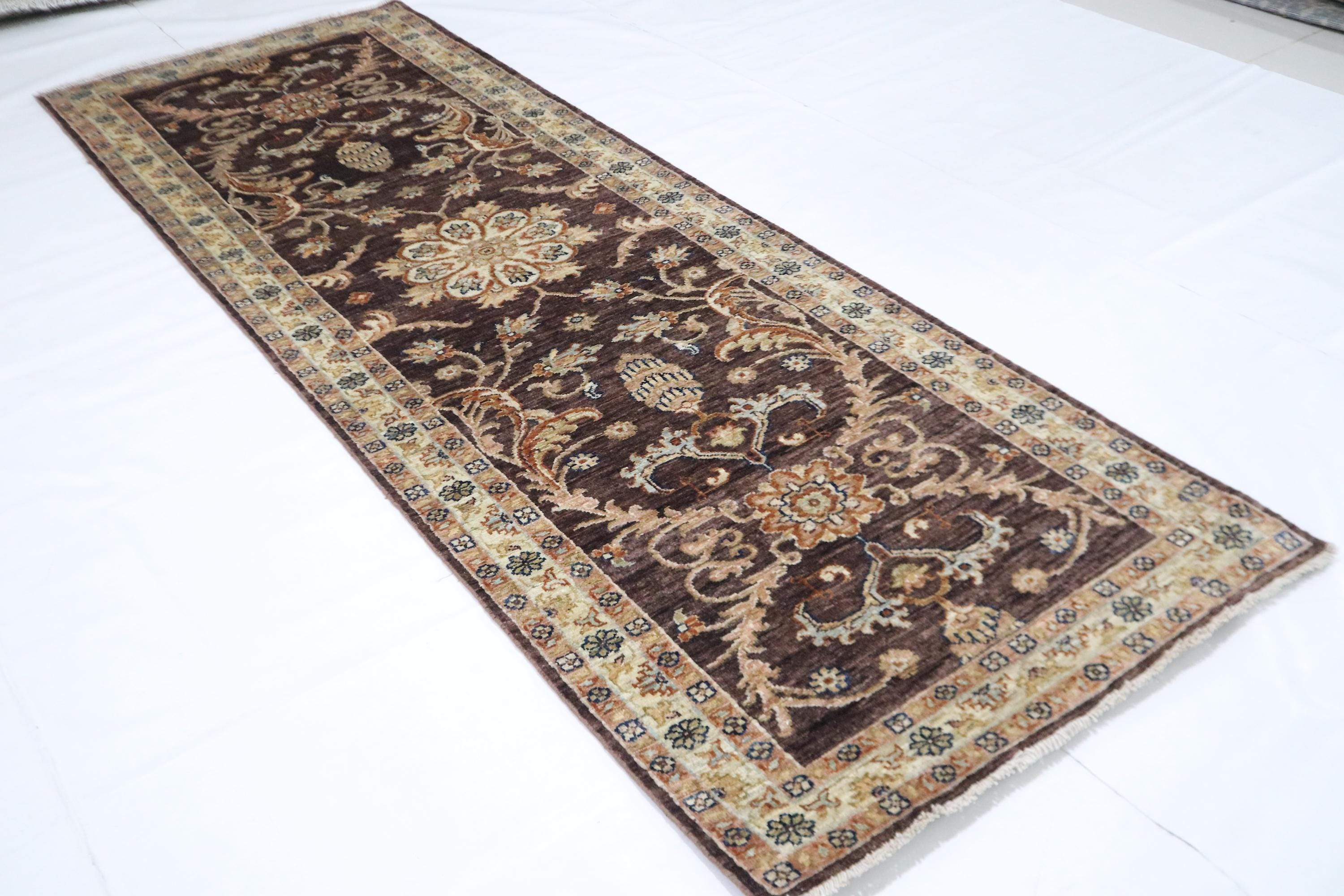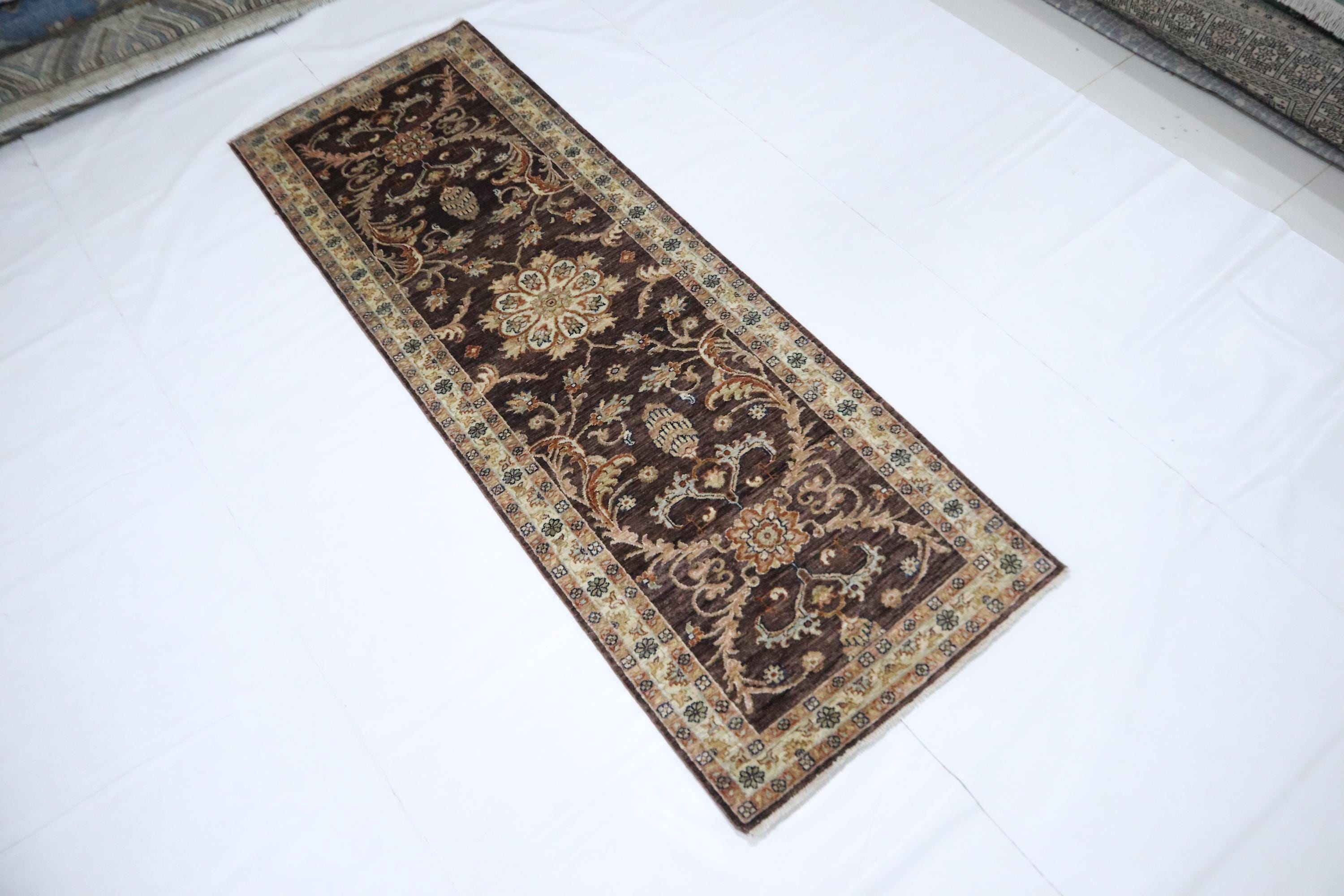 8 Ft Sultani Runner Rug, Choco Brown Runner, Afghan Hand Knotted Organic Dye Wool Runner, Floral Runner, Traditional Runner, Bedroom Runner