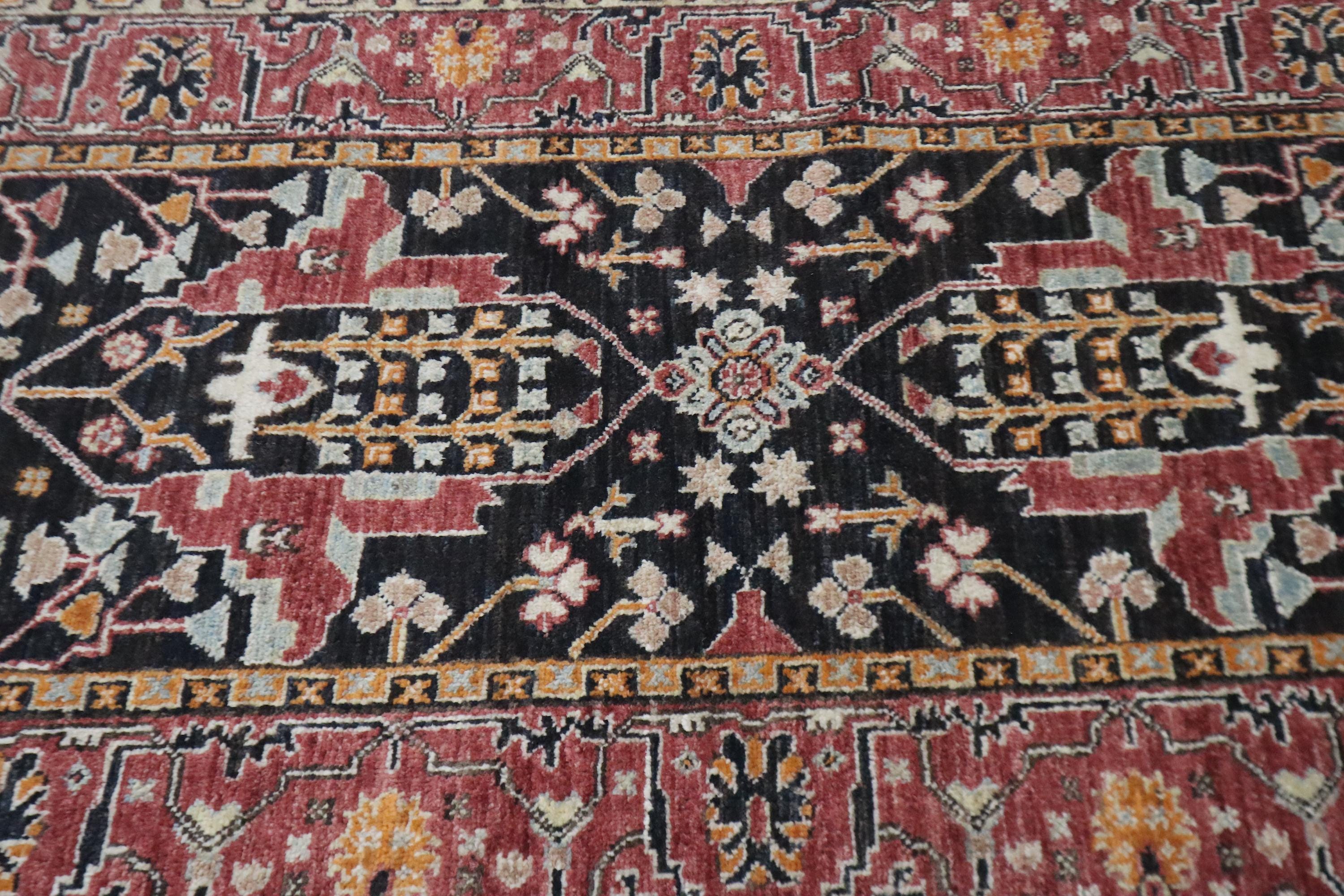 This hand-knotted pile rug is crafted using 100% natural dyes and handspun wool, giving it a rich texture and vibrant colors.