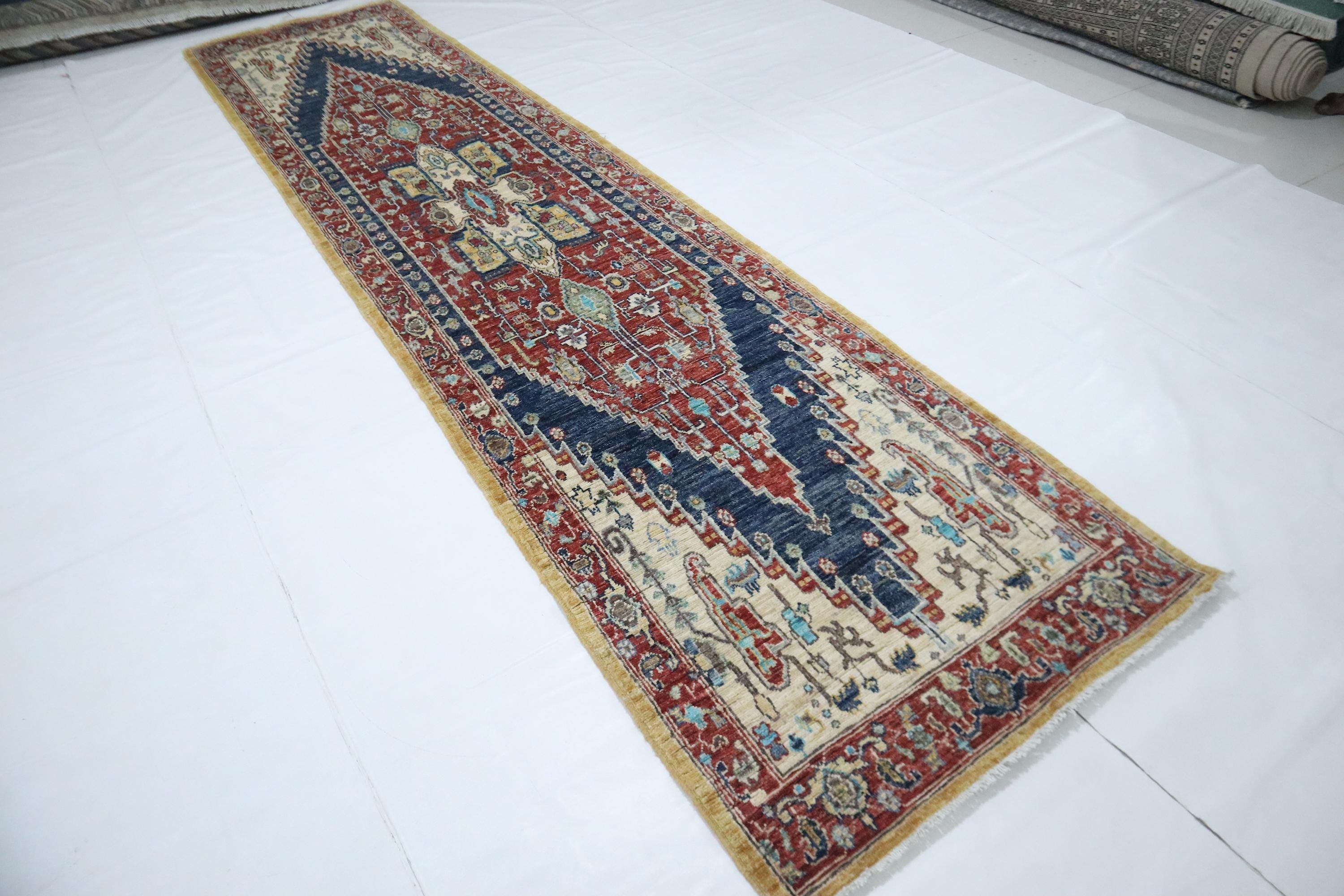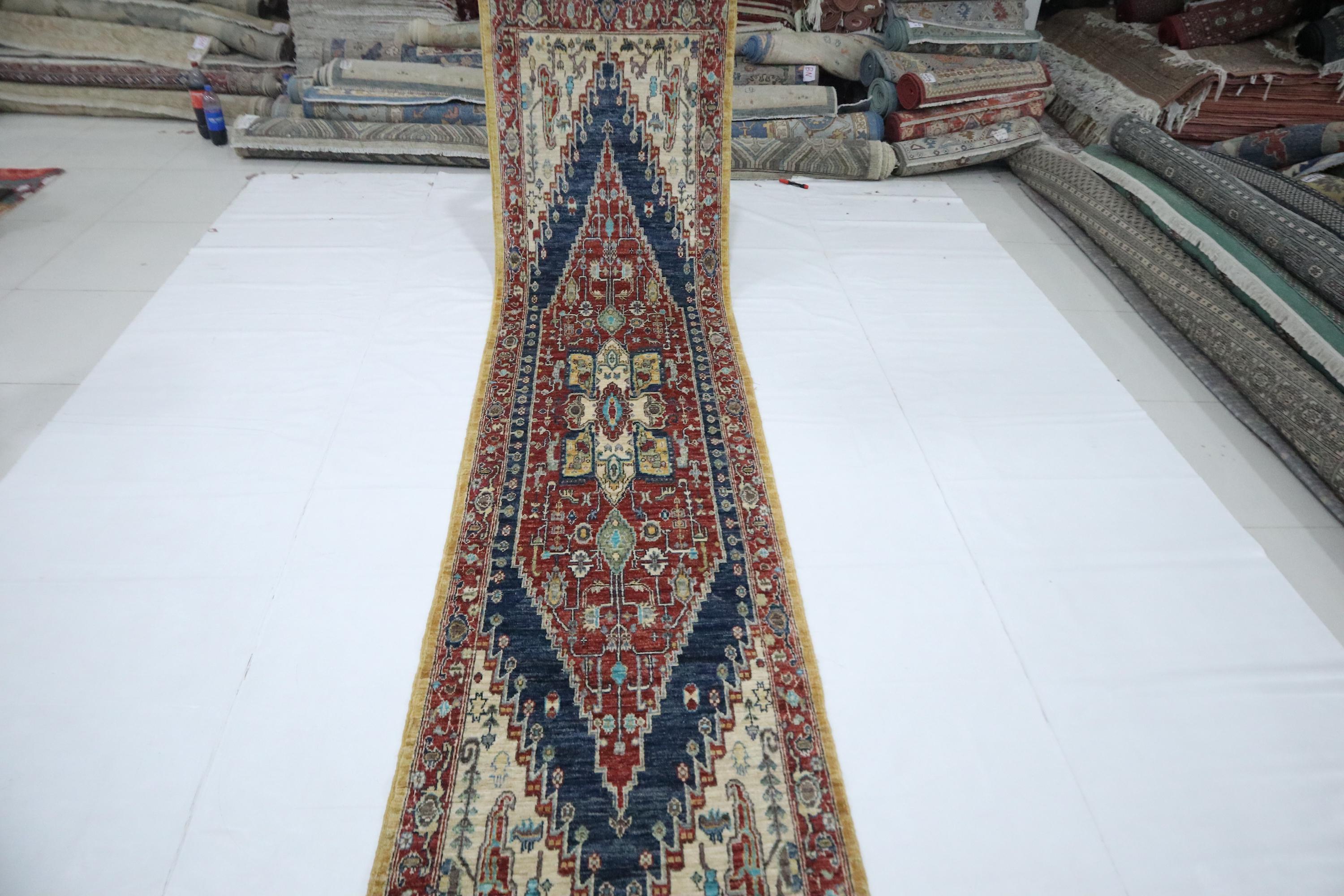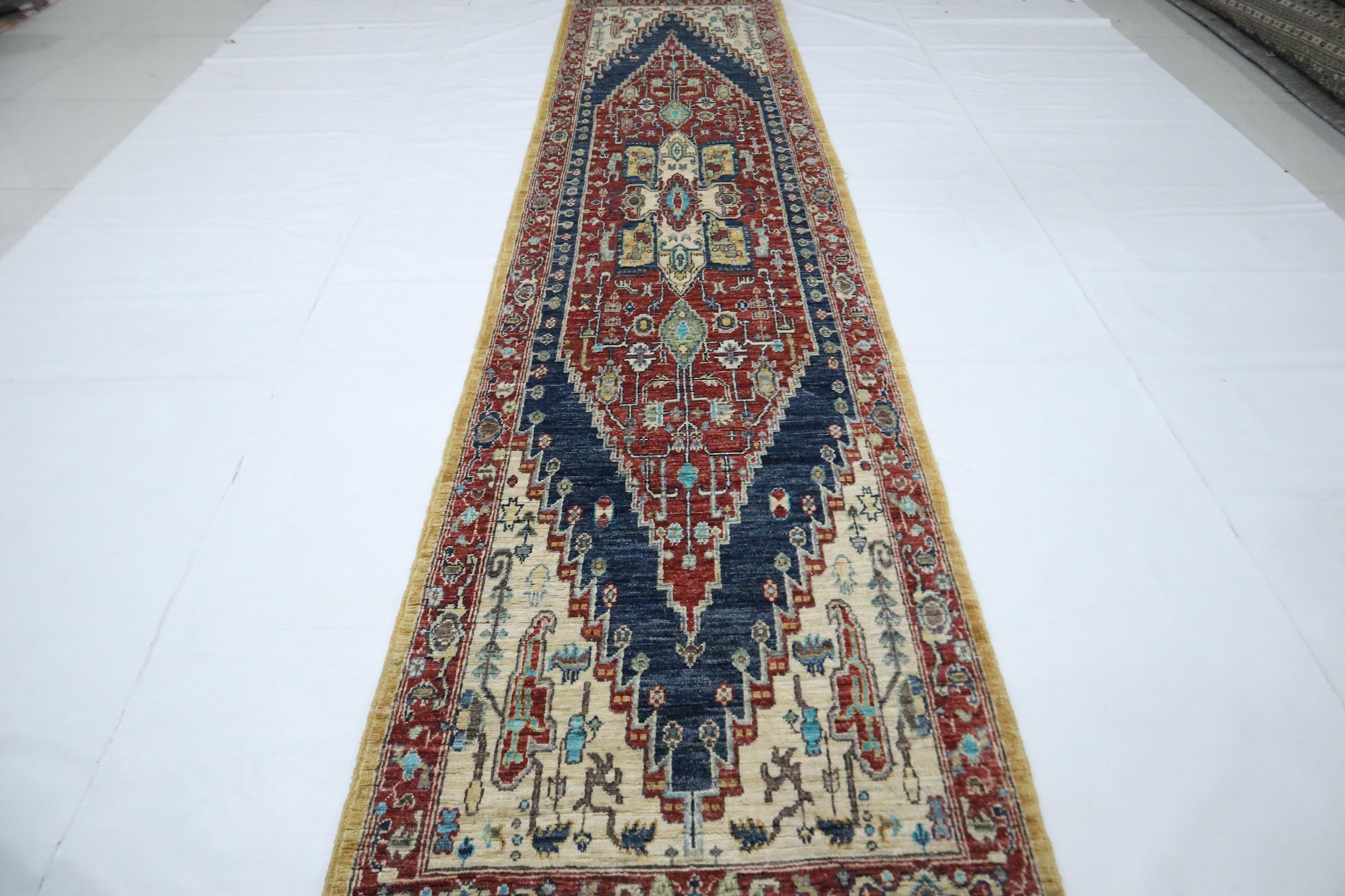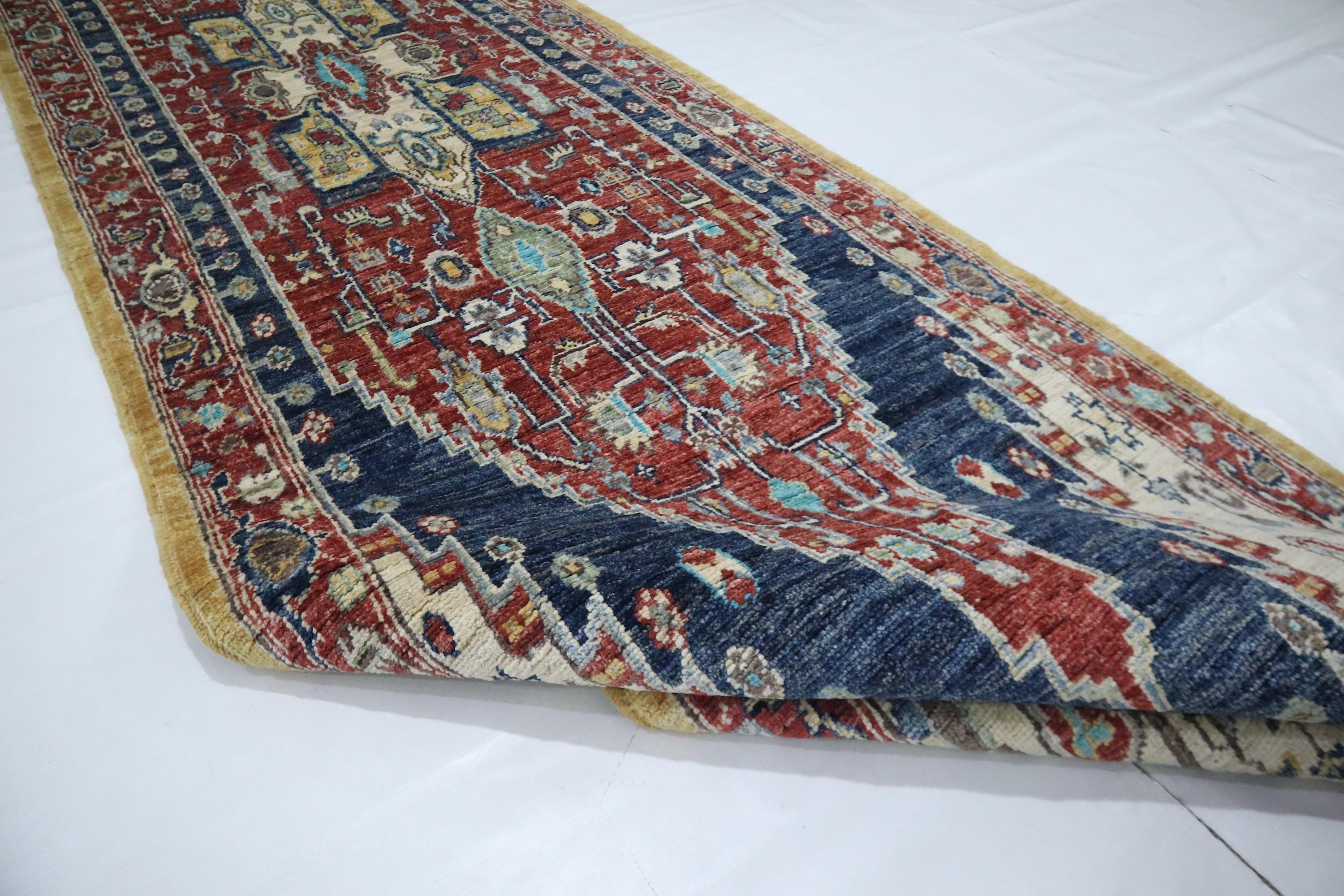 12 Ft Heriz Runner Rug, Red Blue Afghan Hand Knotted Medallion Veg Dye Wool Runner, Traditional Runner, Entryway Runner, Hallway Runner