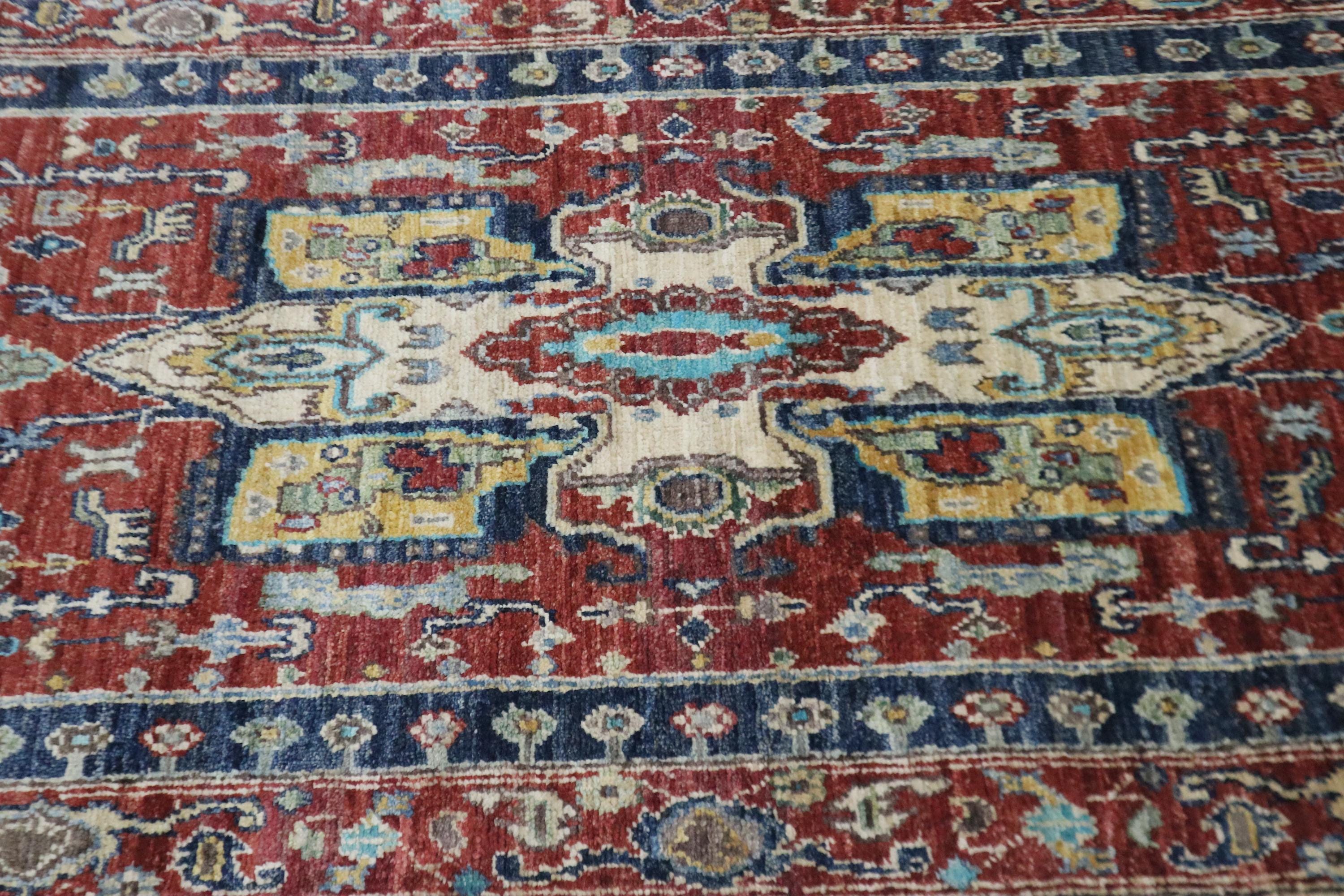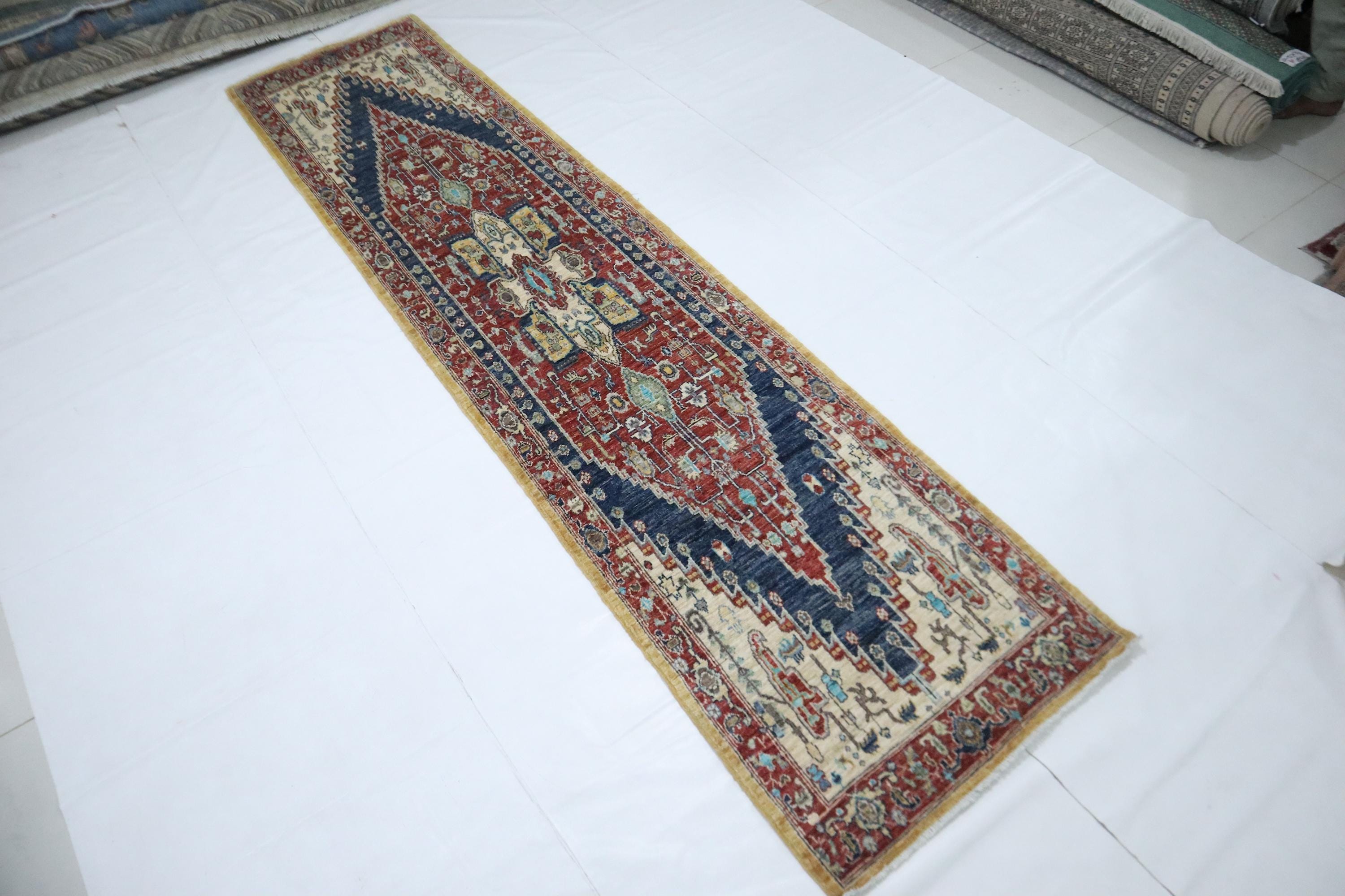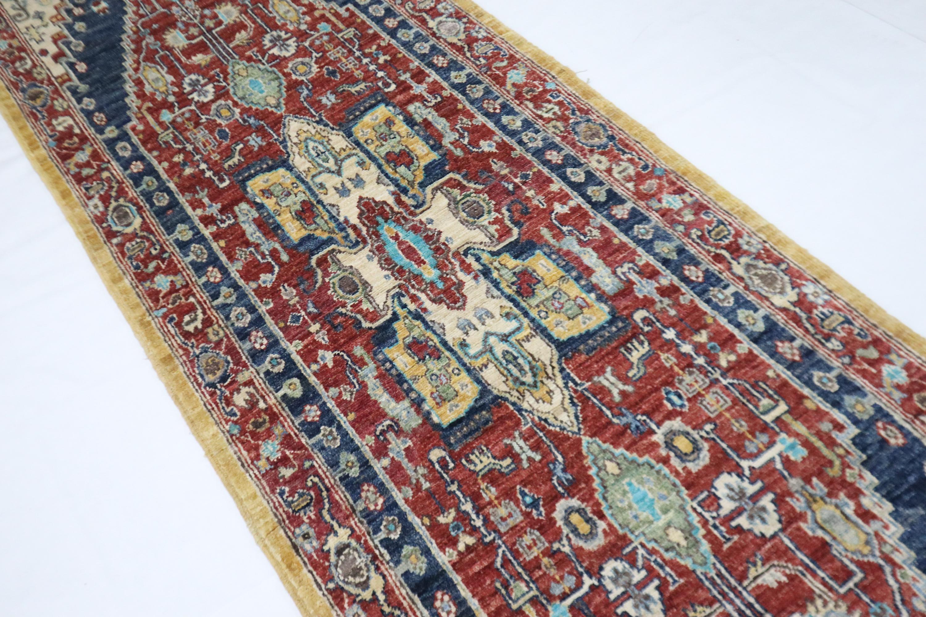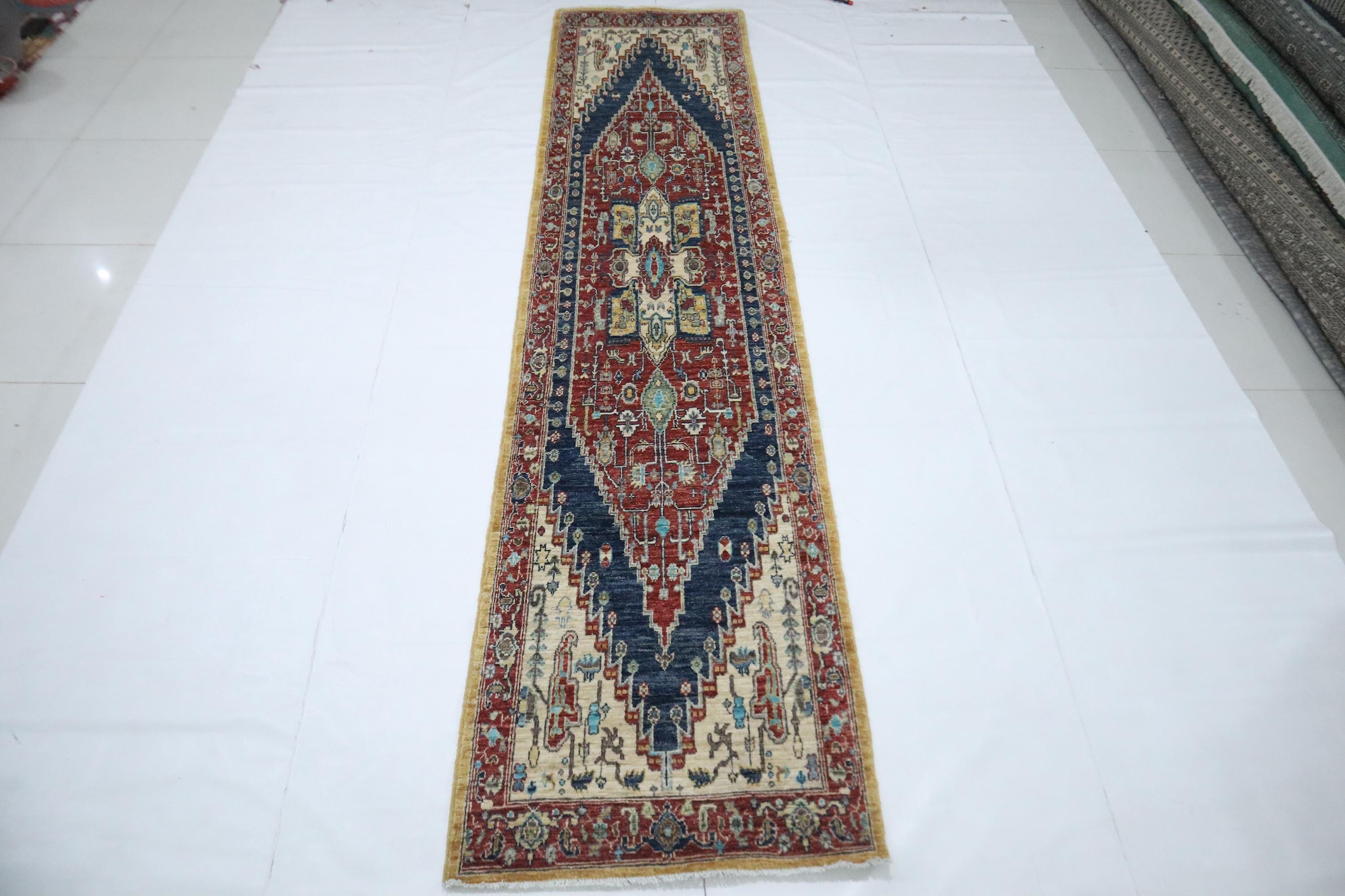 12 Ft Heriz Runner Rug, Red Blue Afghan Hand Knotted Medallion Veg Dye Wool Runner, Traditional Runner, Entryway Runner, Hallway Runner
