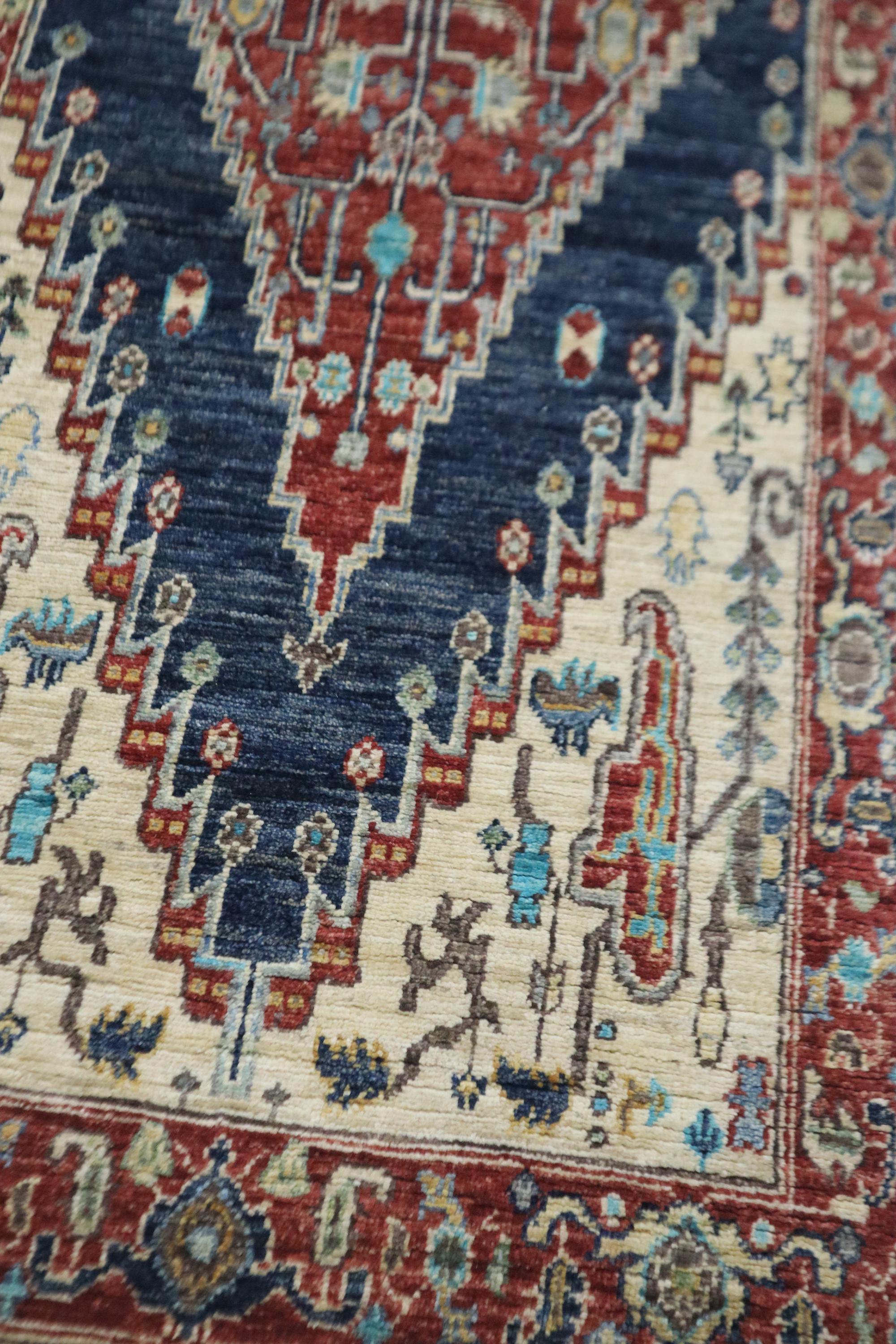 This hand-knotted pile rug is crafted using 100% natural dyes and handspun wool, giving it a rich texture and vibrant colors.