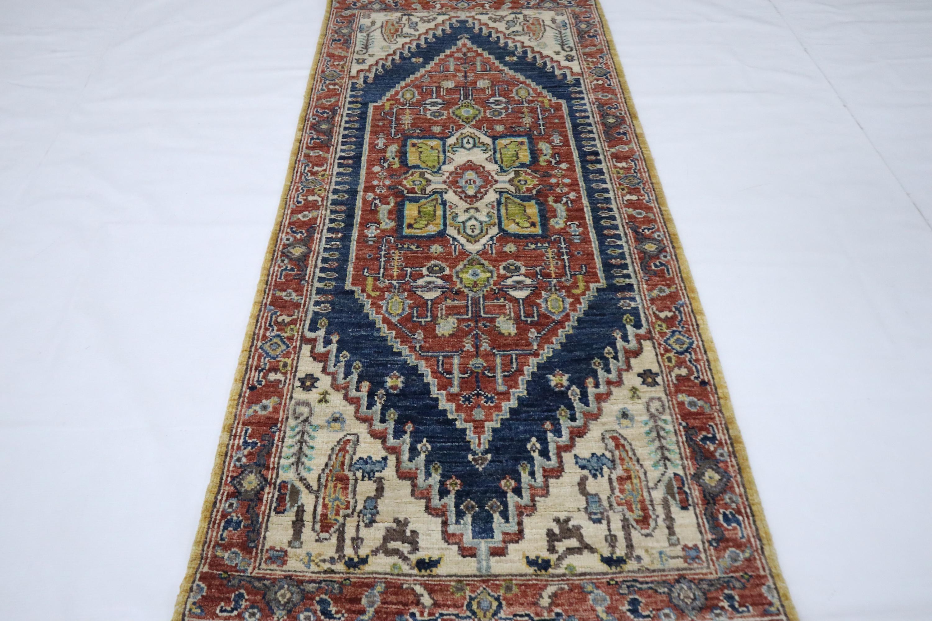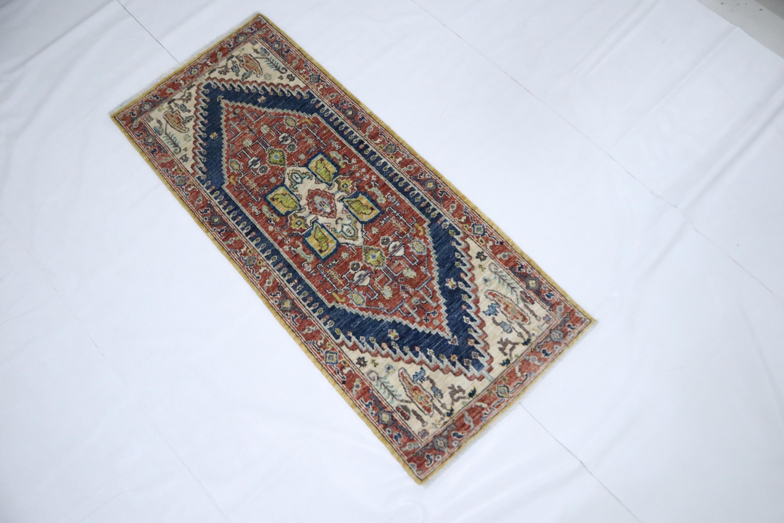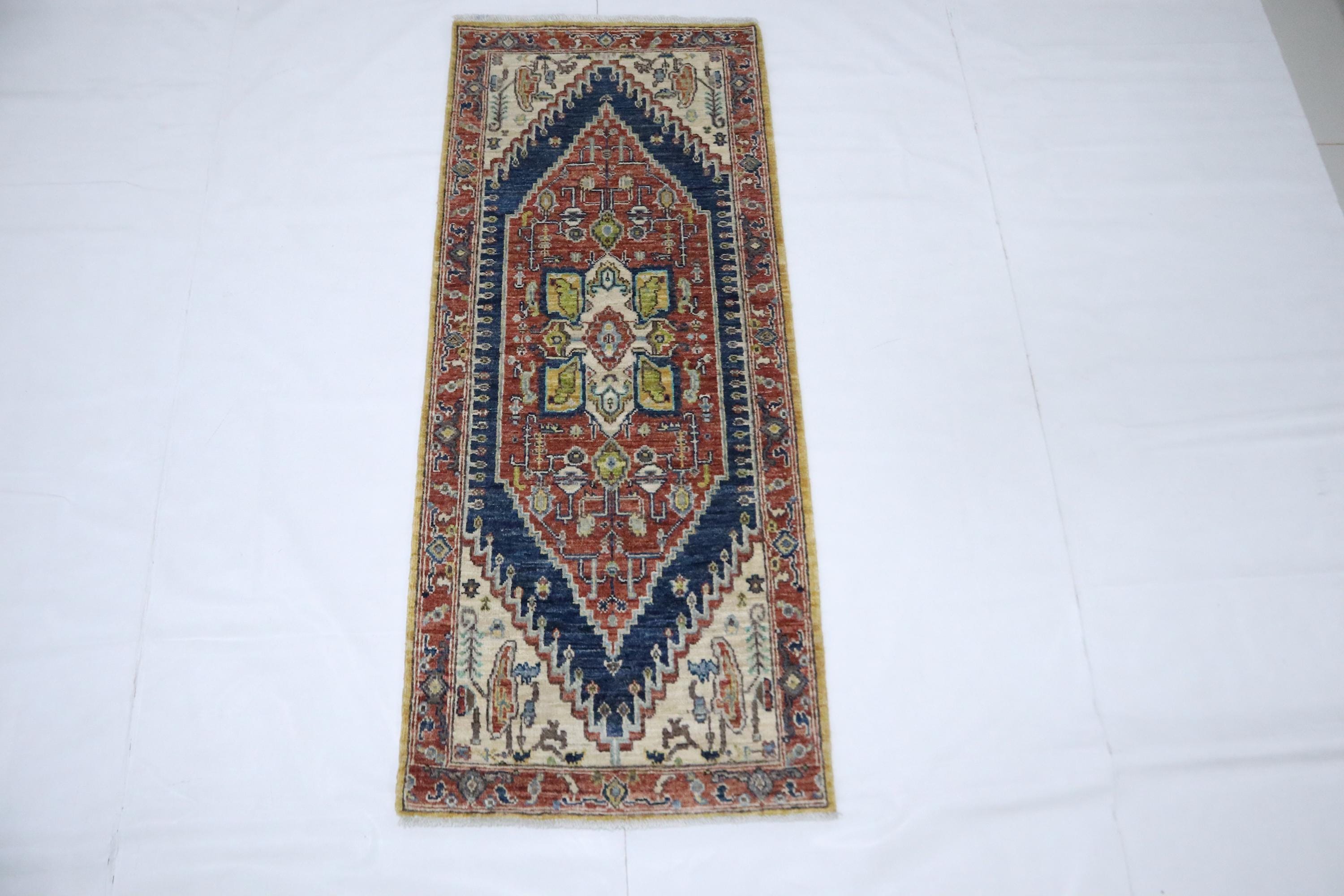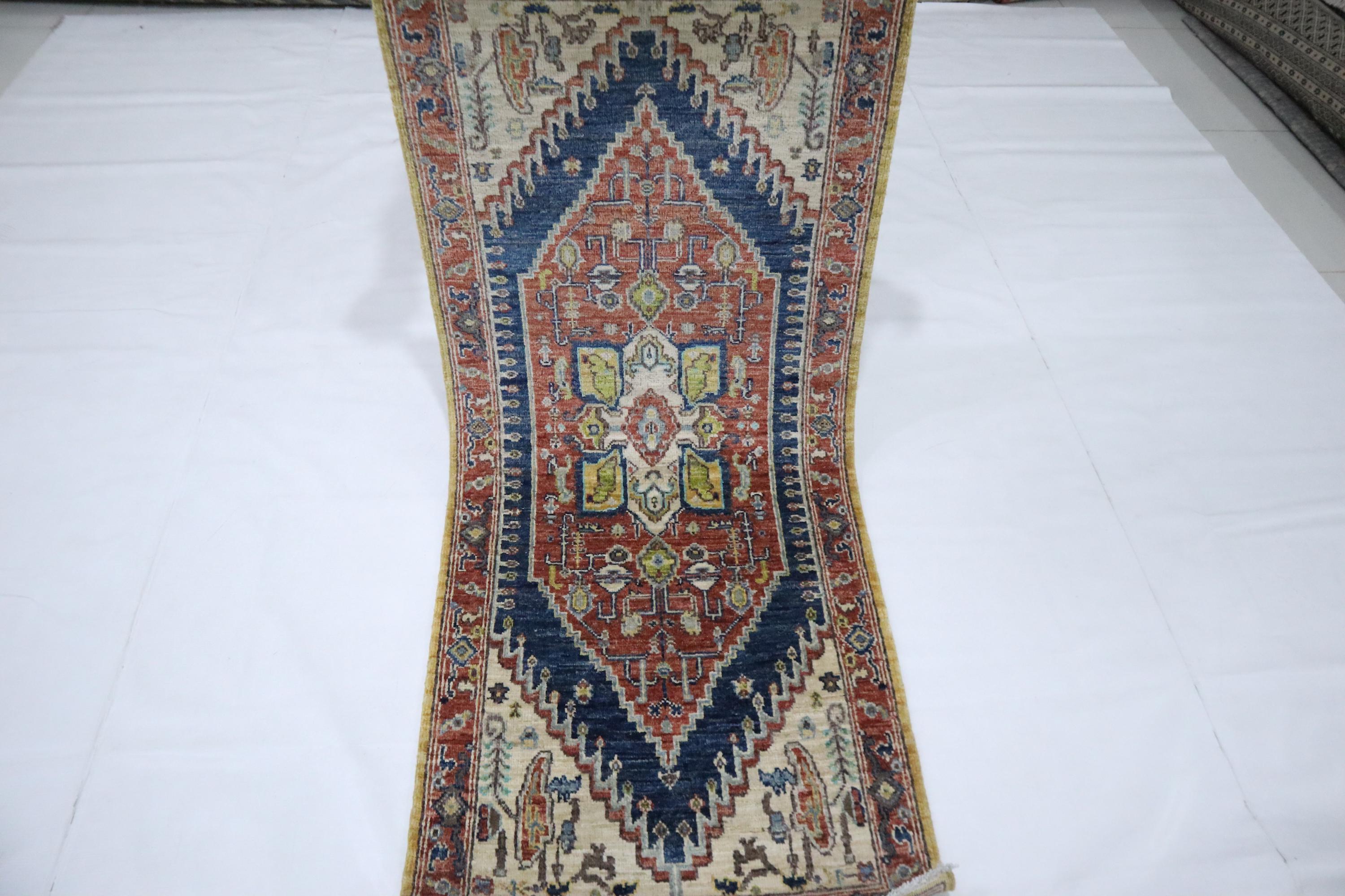 5 Ft Heriz Runner Rug, Rust Blue Runner, Afghan Hand Knotted Organic Dye Wool Runner, Traditional Runner, Oriental Runner, Bedroom Runner