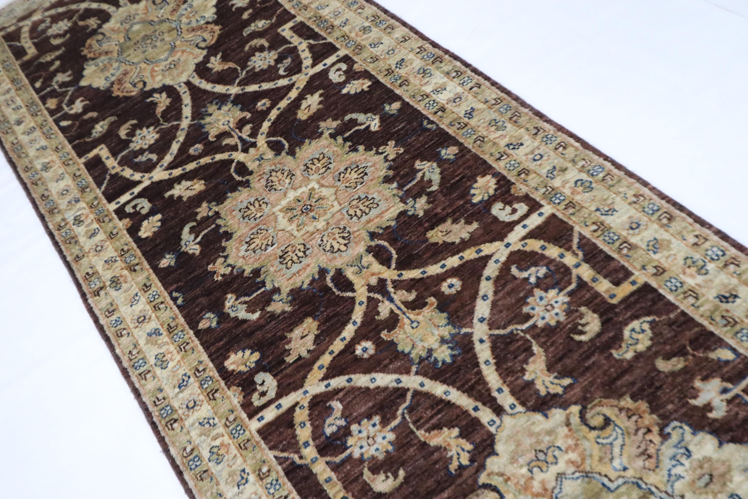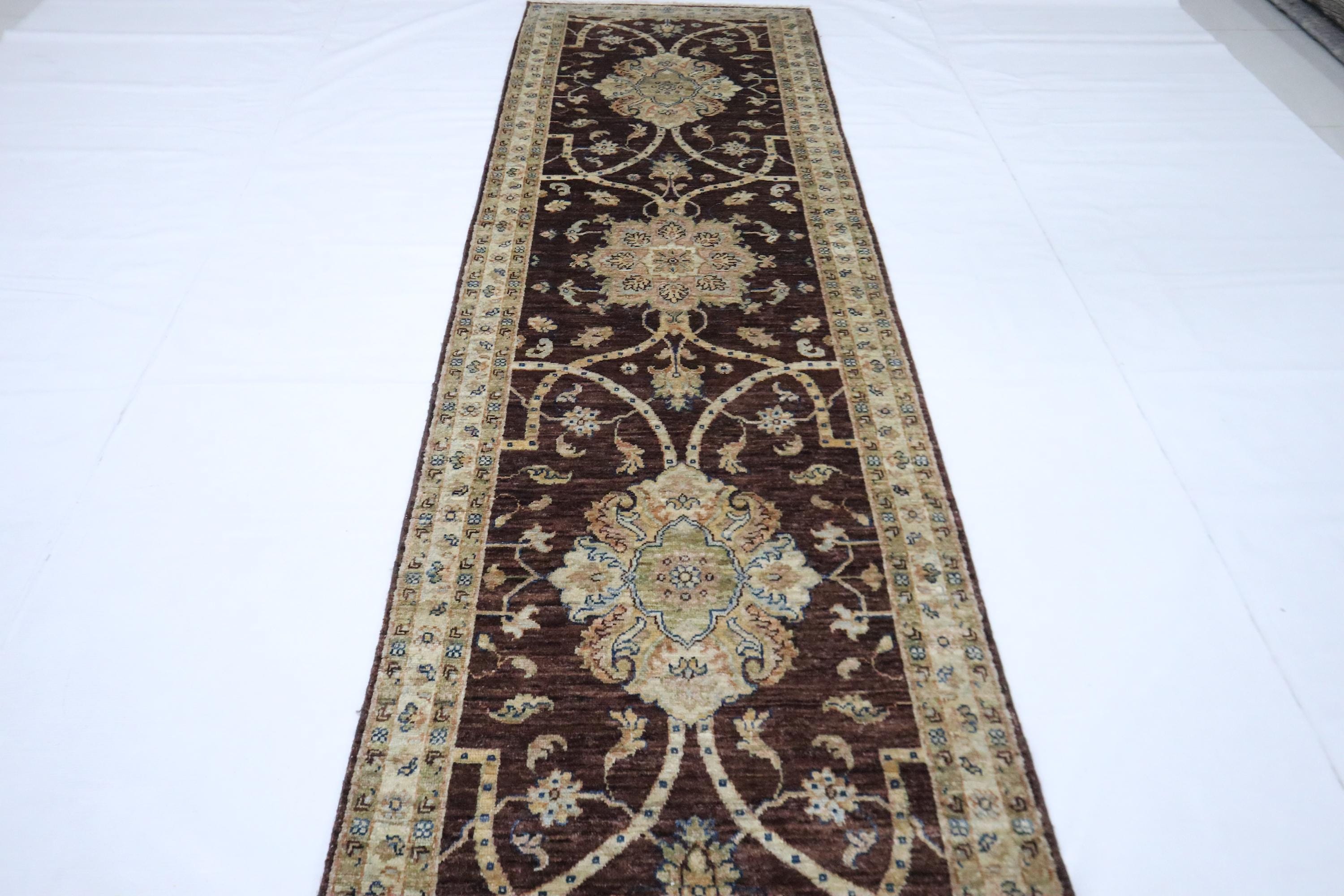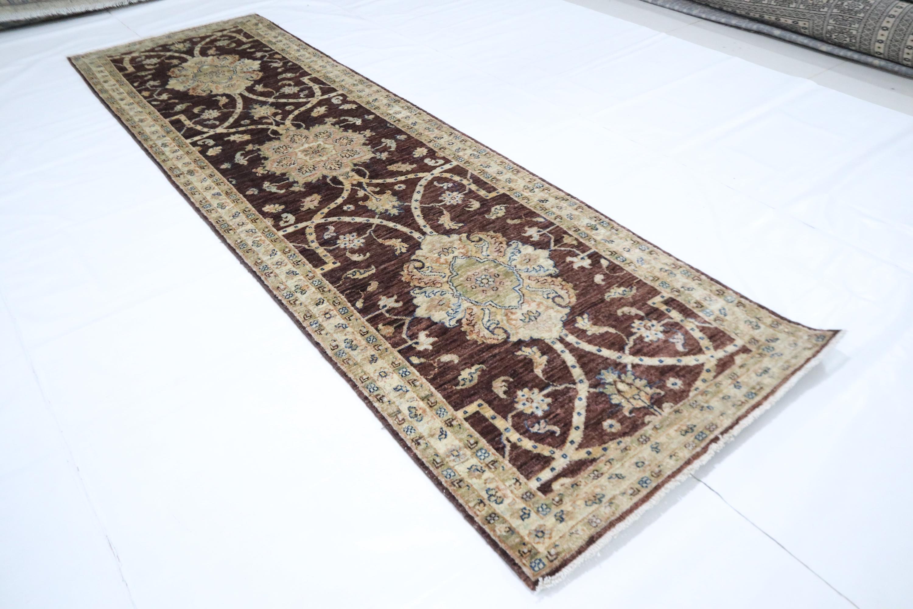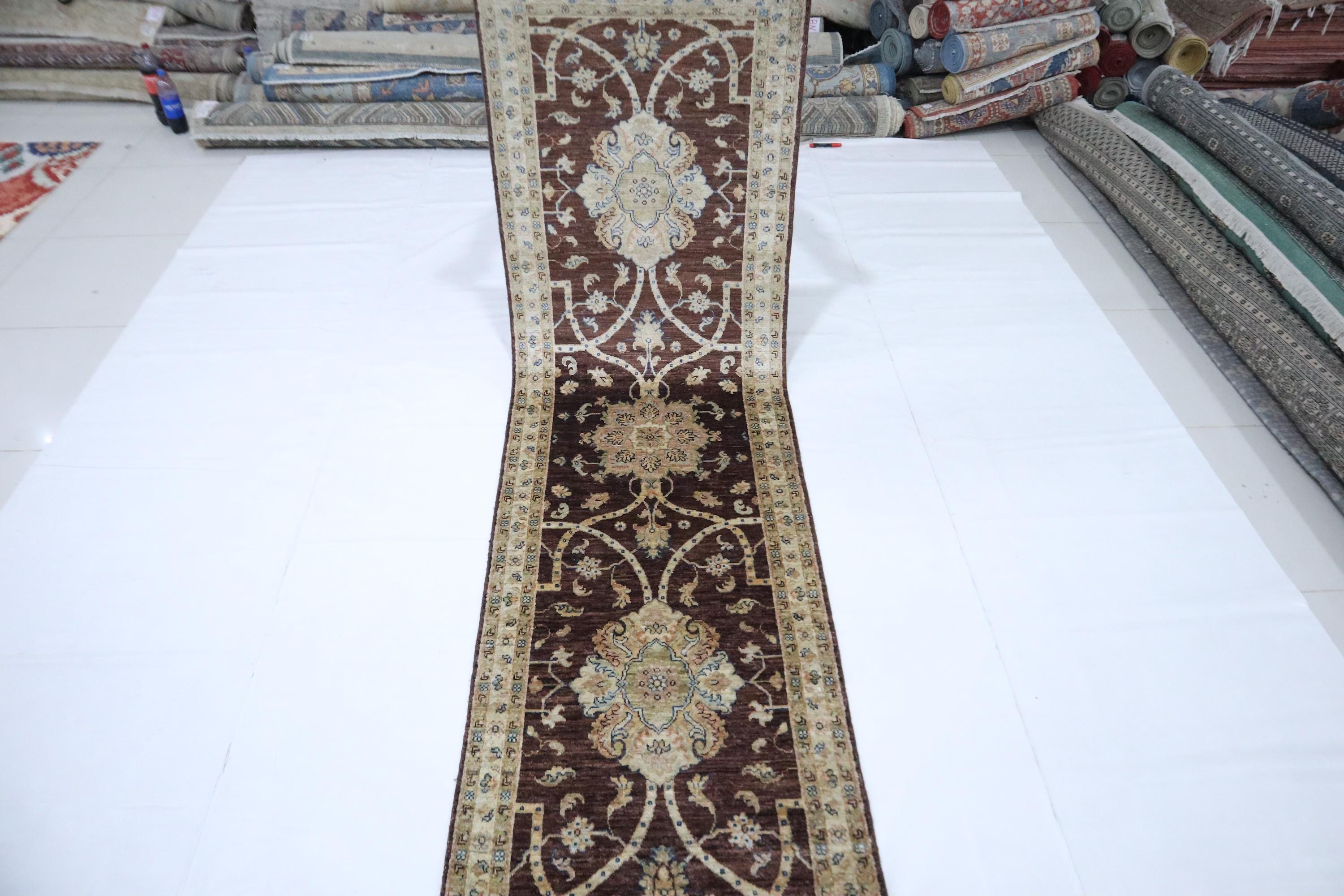 9 Ft Chobi Runner Rug, Choco Brown Afghan Hand Knotted Floral Veg Dye Wool Runner, Traditional Runner, Kitchen Runner, Entryway Runner