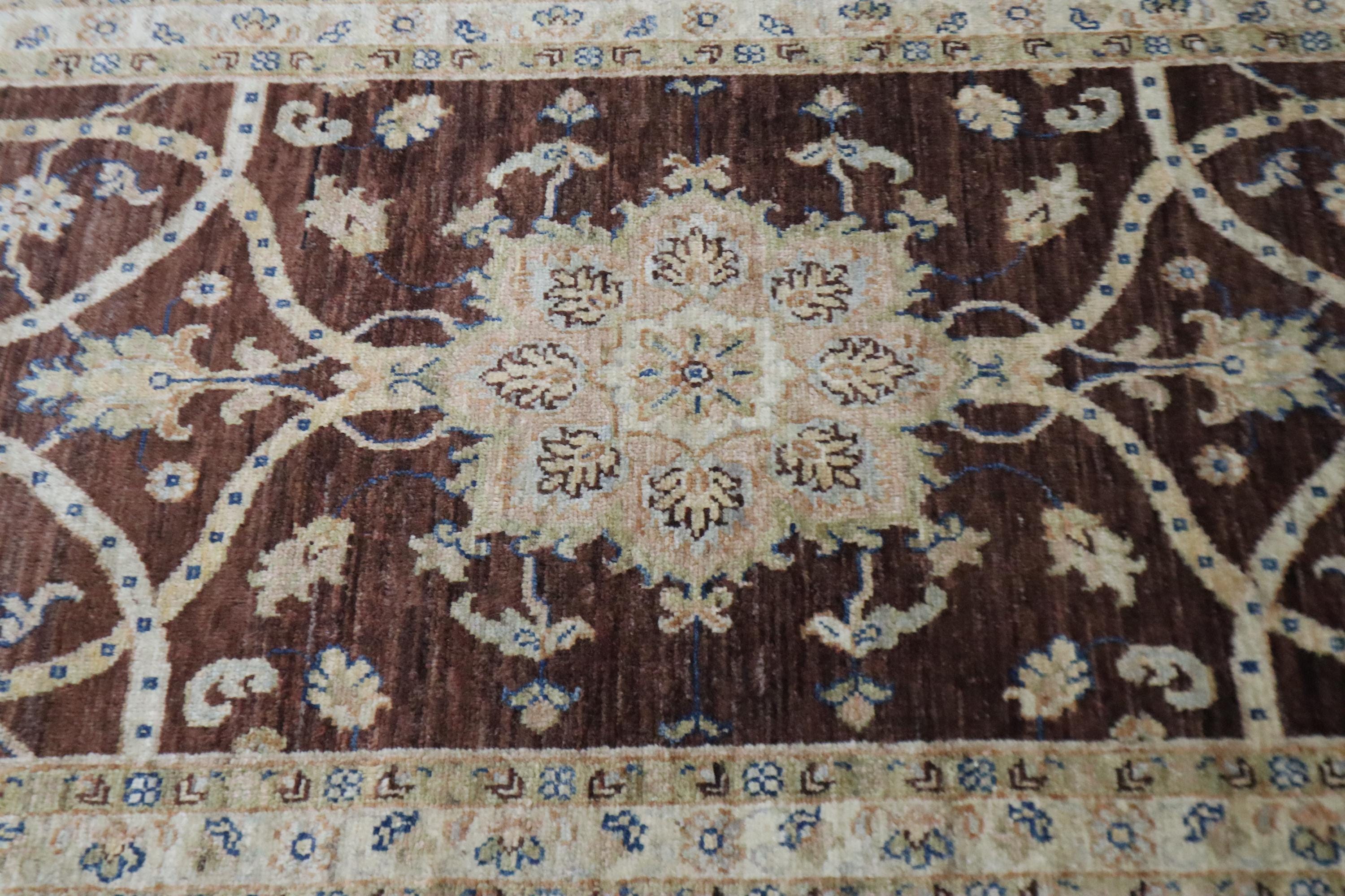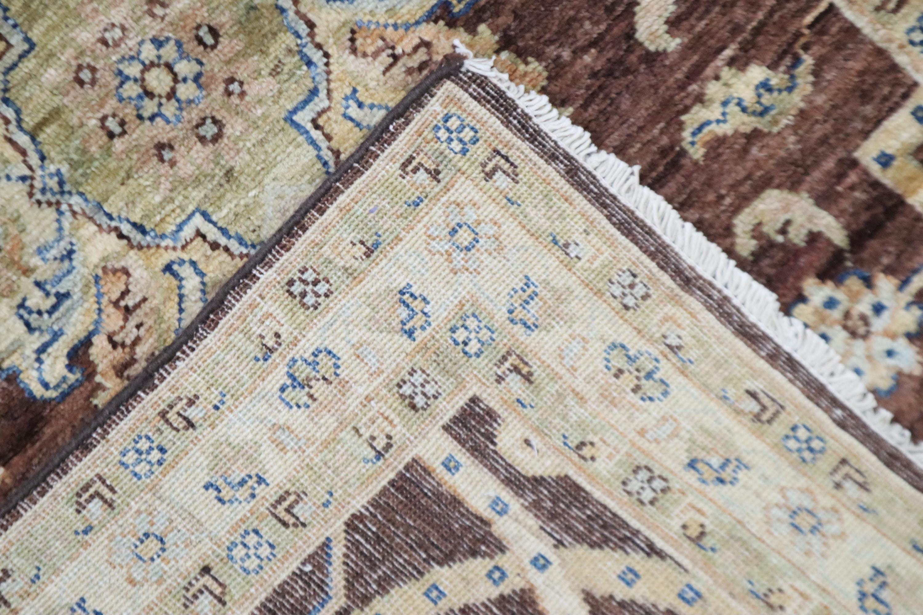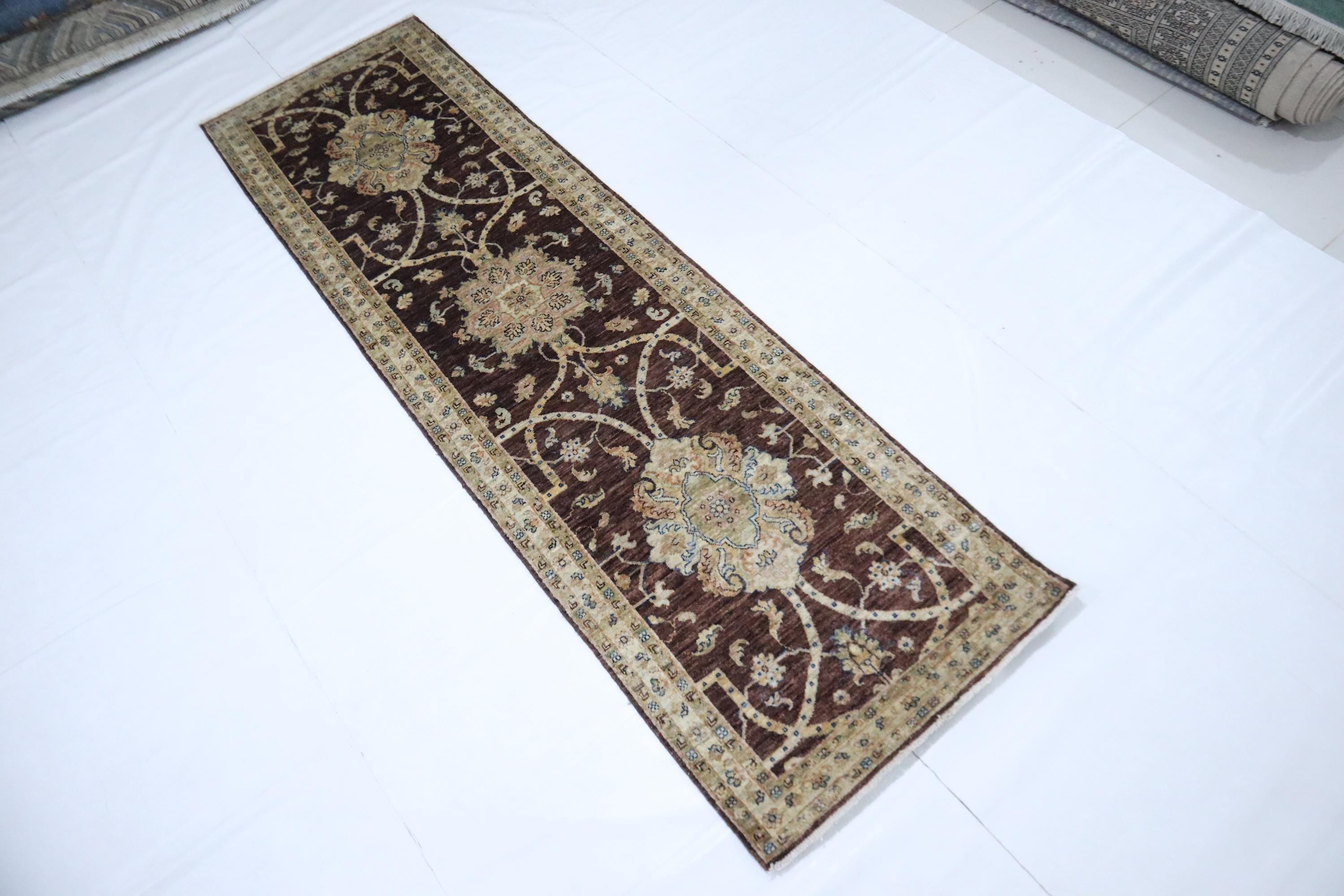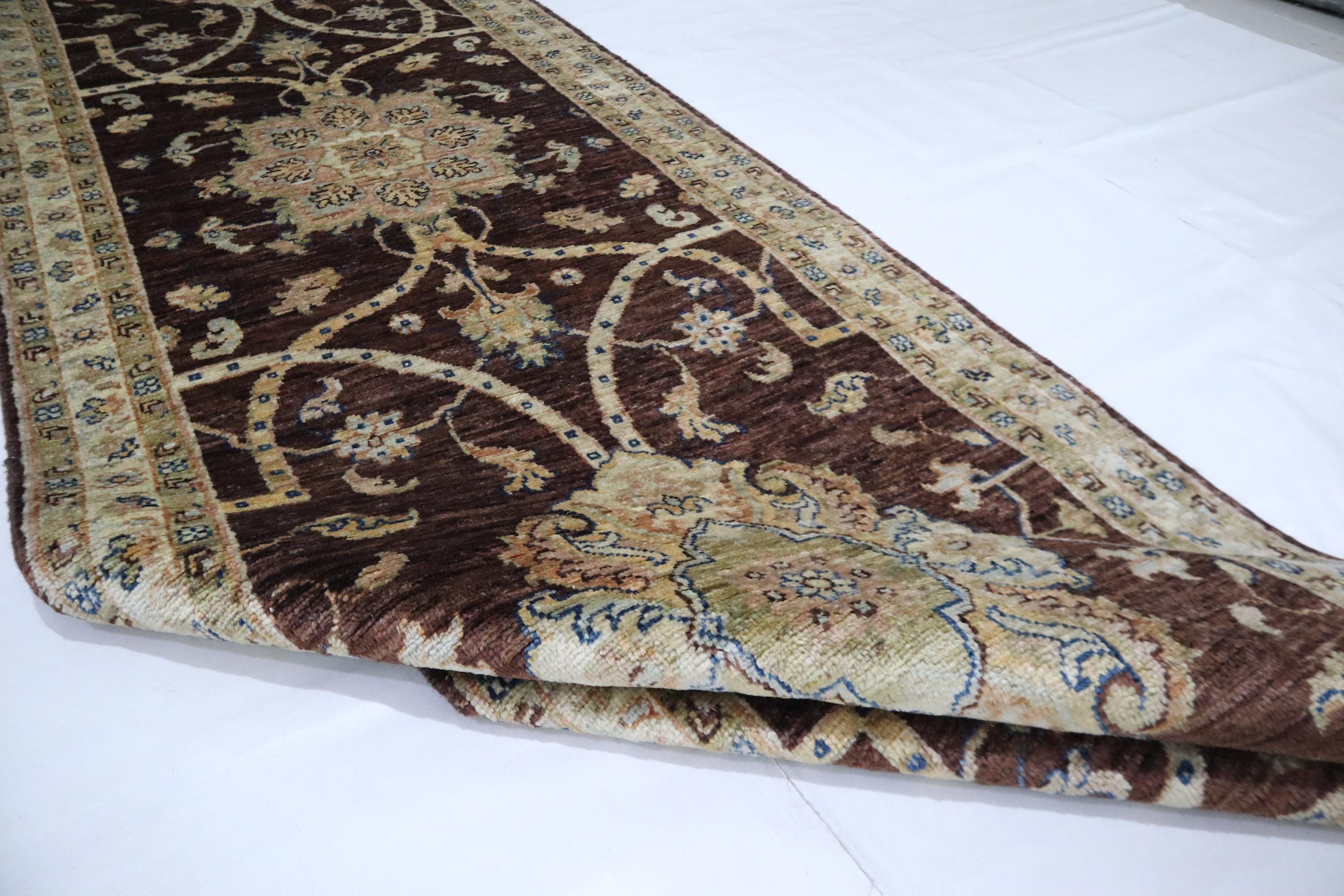 9 Ft Chobi Runner Rug, Choco Brown Afghan Hand Knotted Floral Veg Dye Wool Runner, Traditional Runner, Kitchen Runner, Entryway Runner