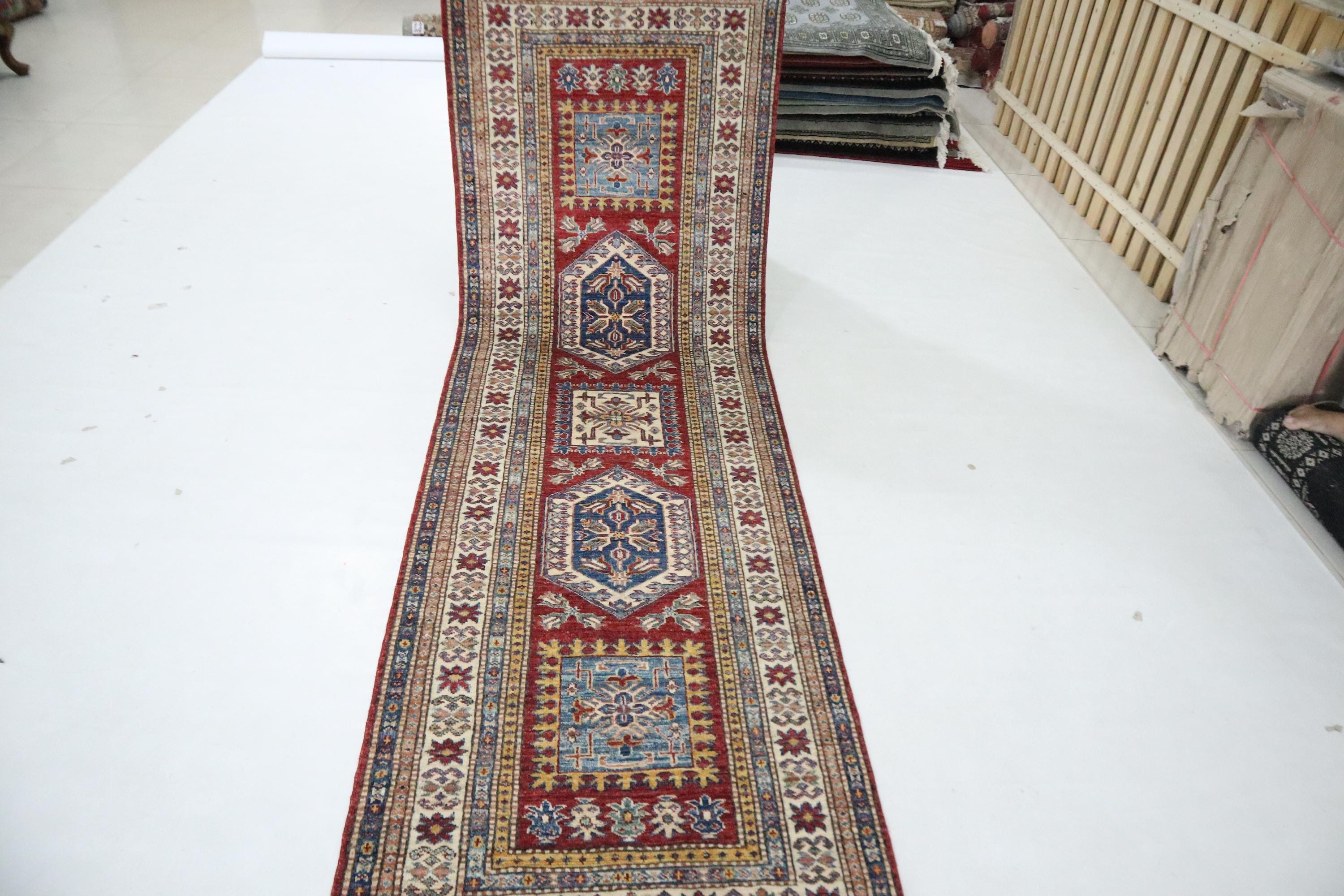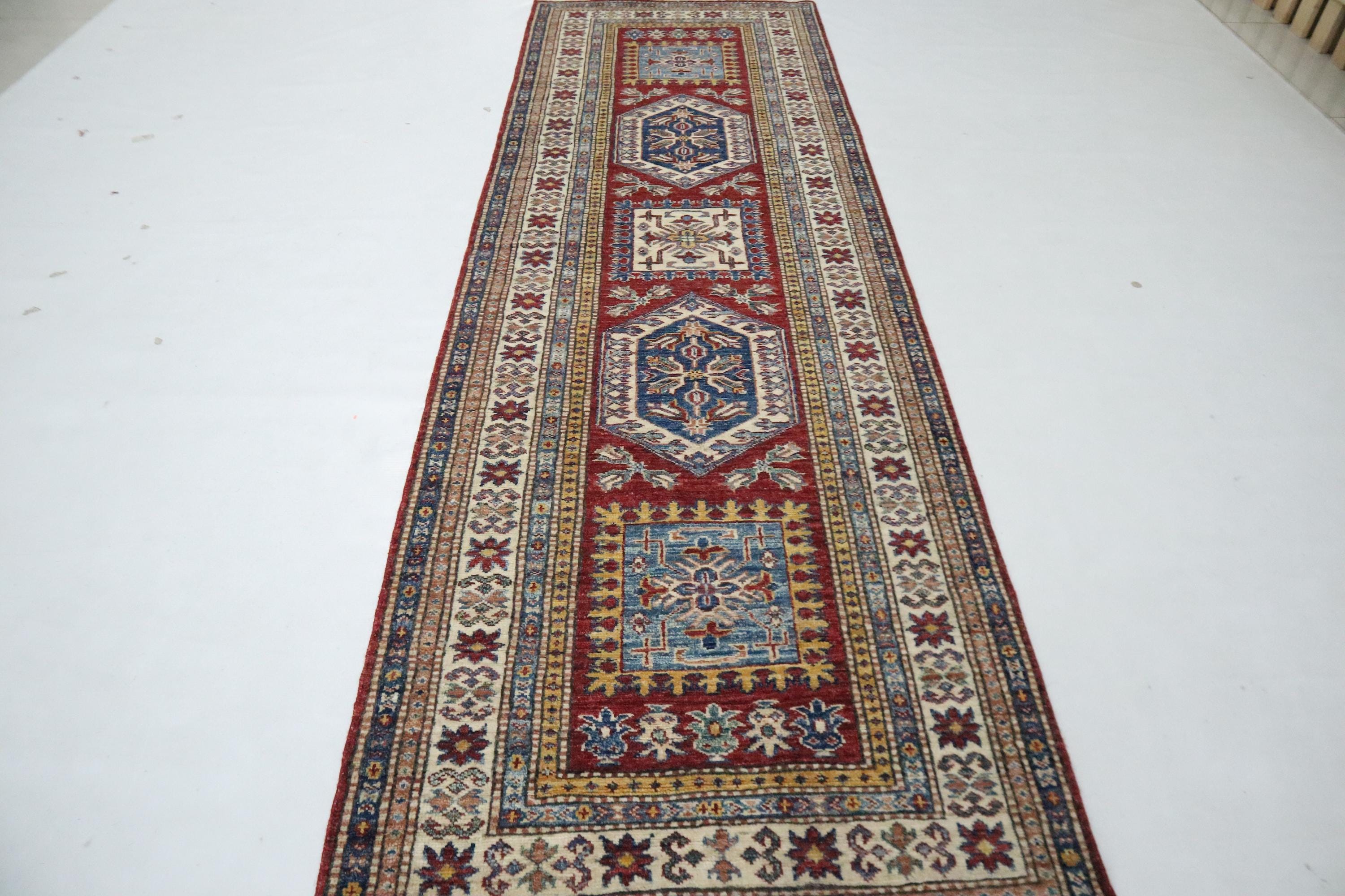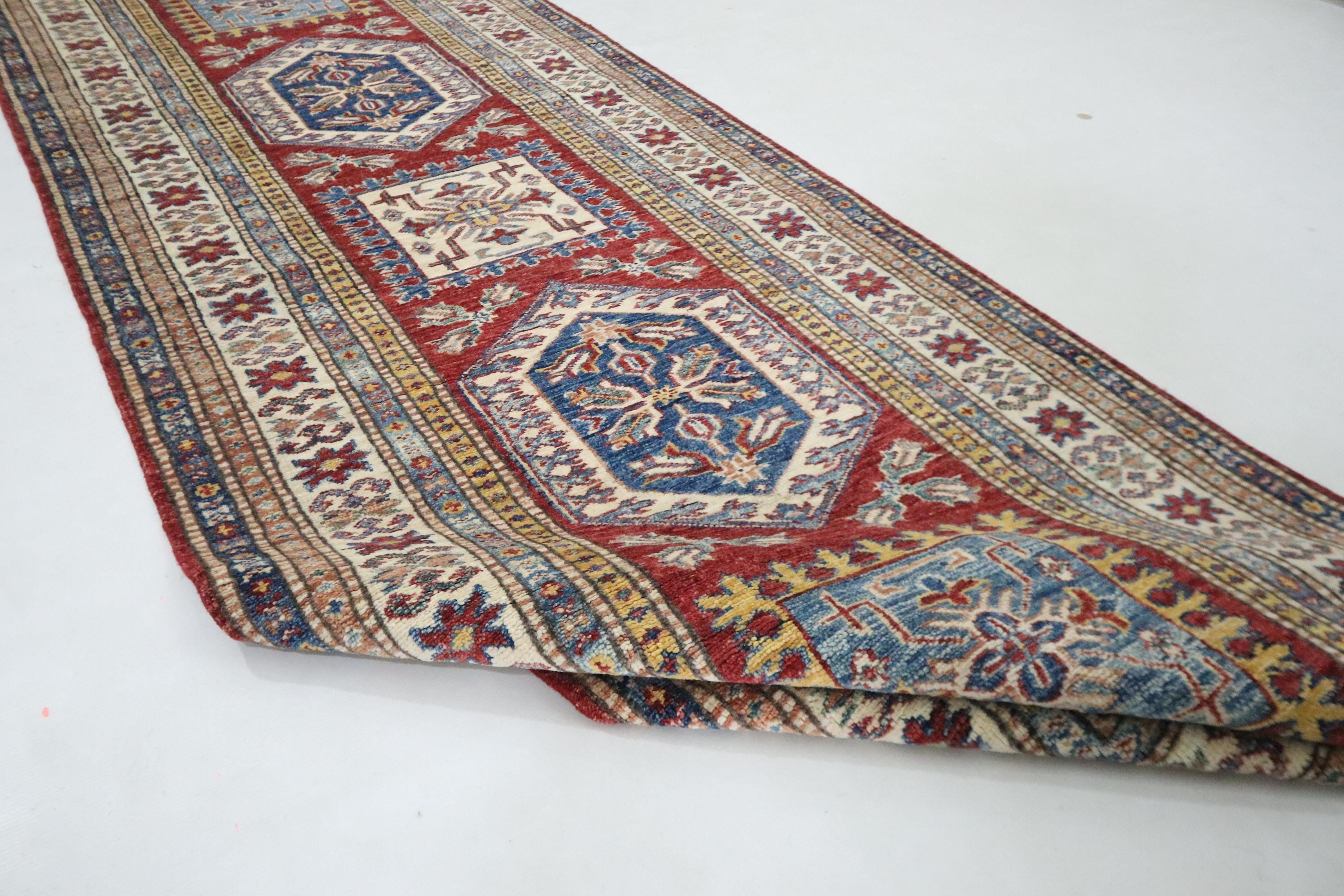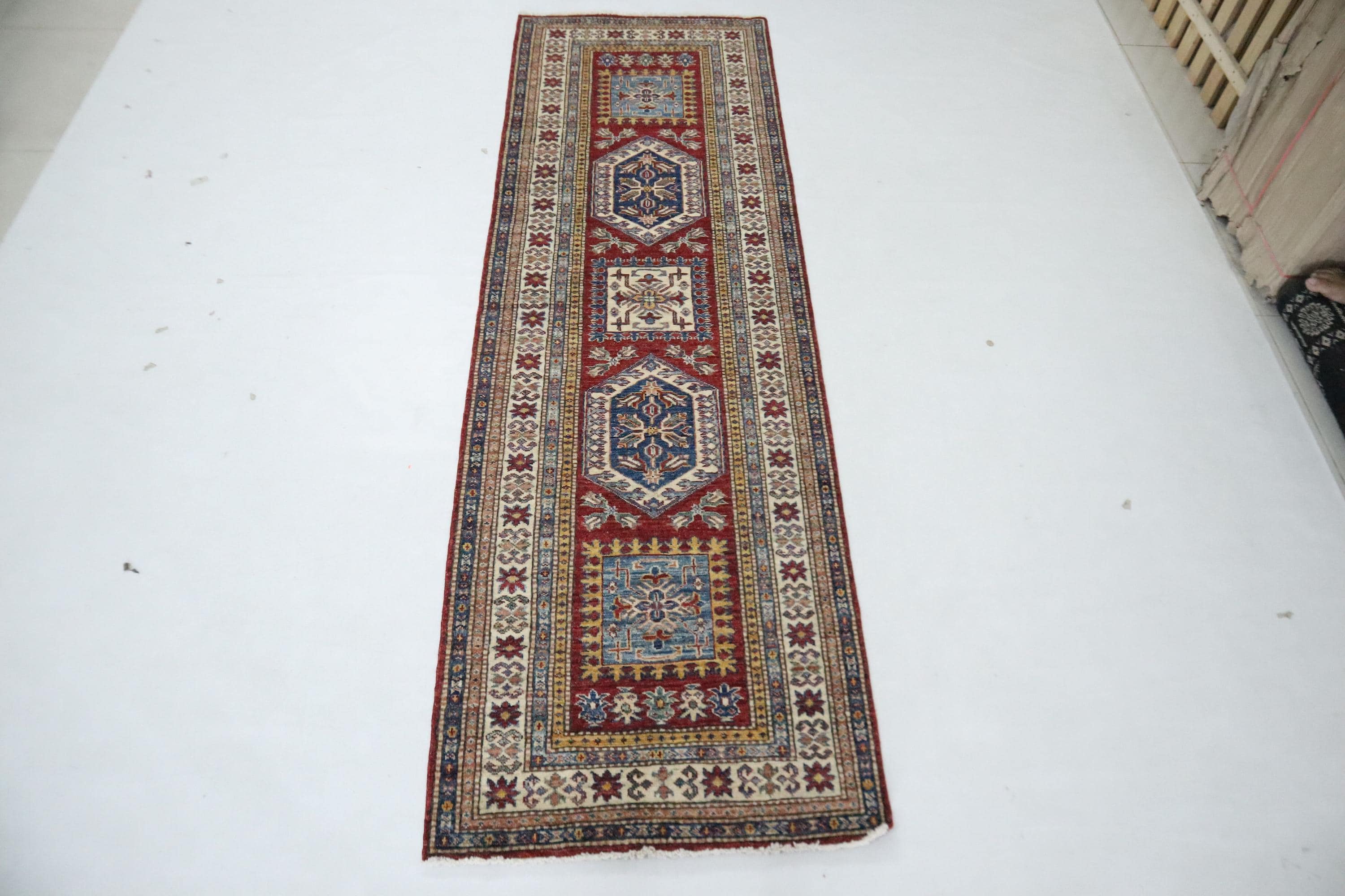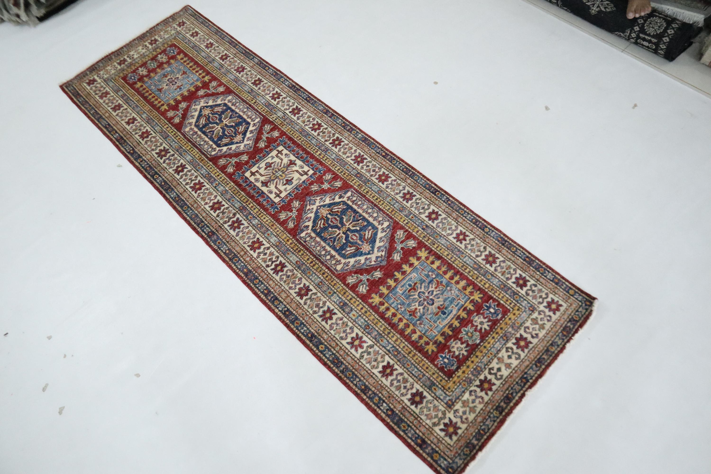 8 Ft Kazak Runner Rug, Red Afghan Hand Knotted Caucasian Veg Dye Wool Runner, Geometric Runner, Entryway Runner, Hallway Runner, Runners