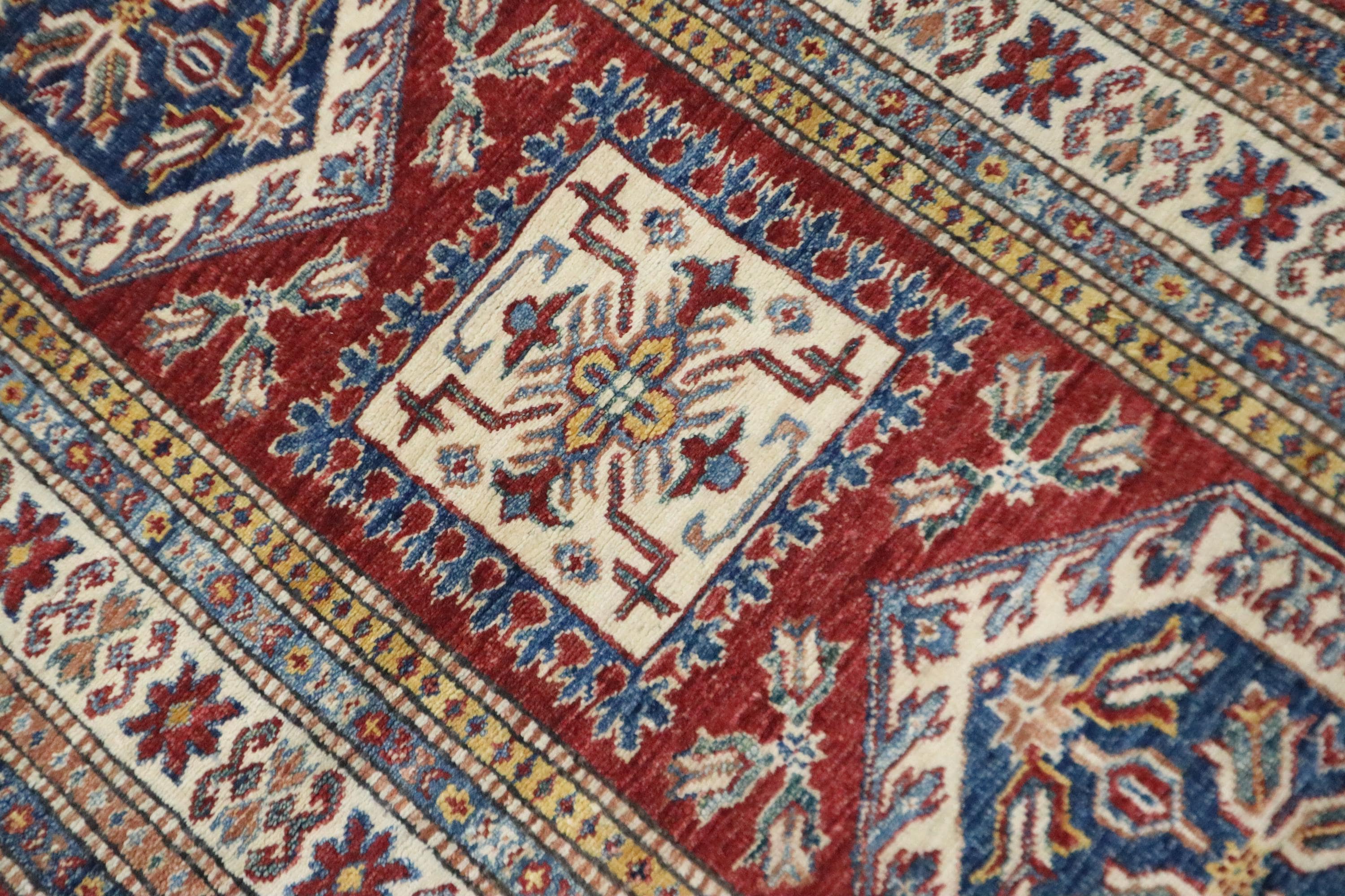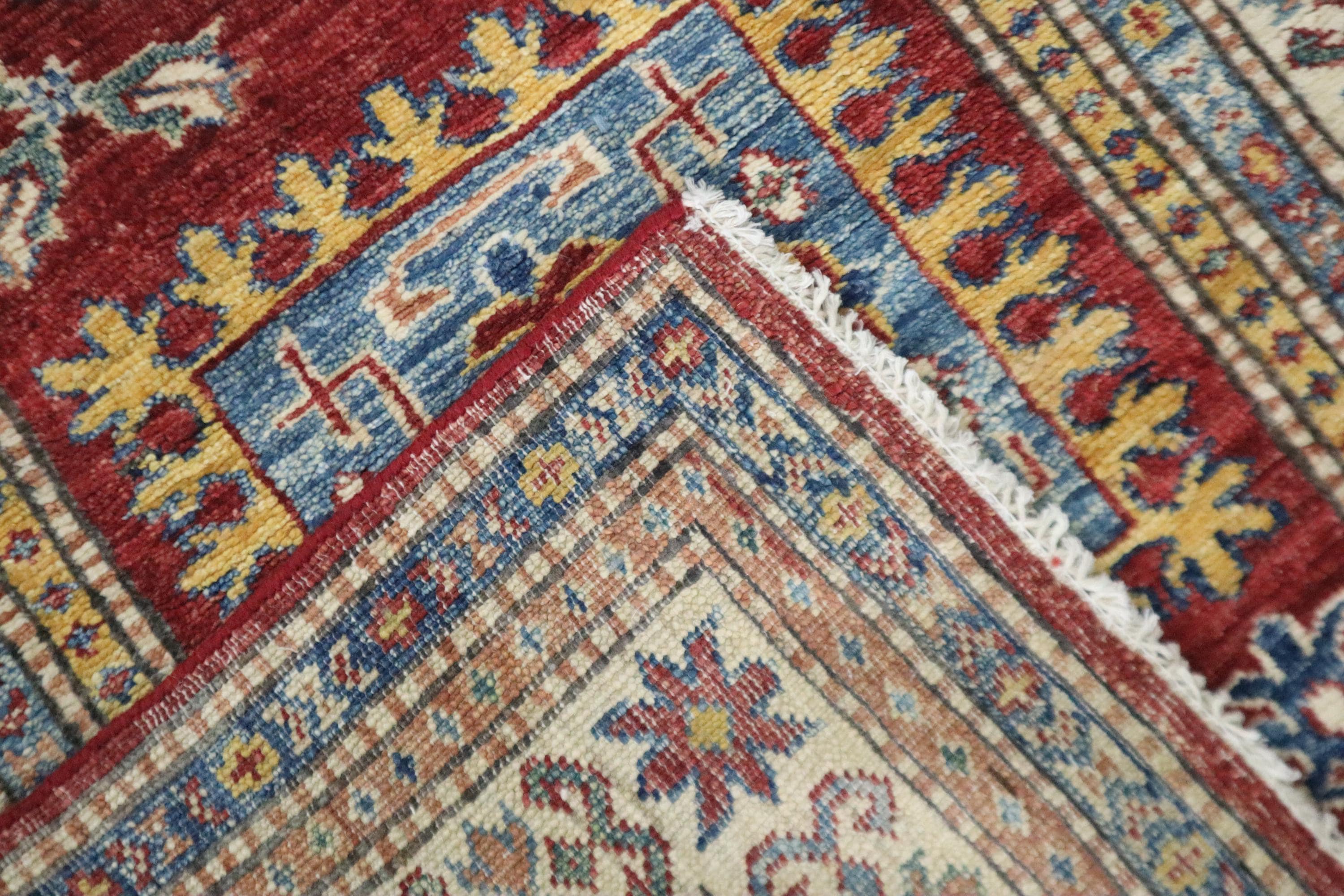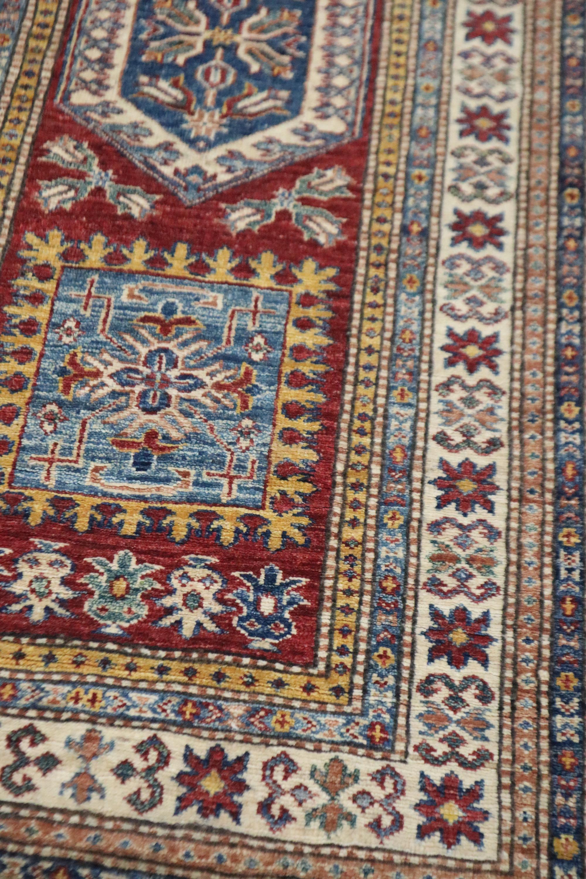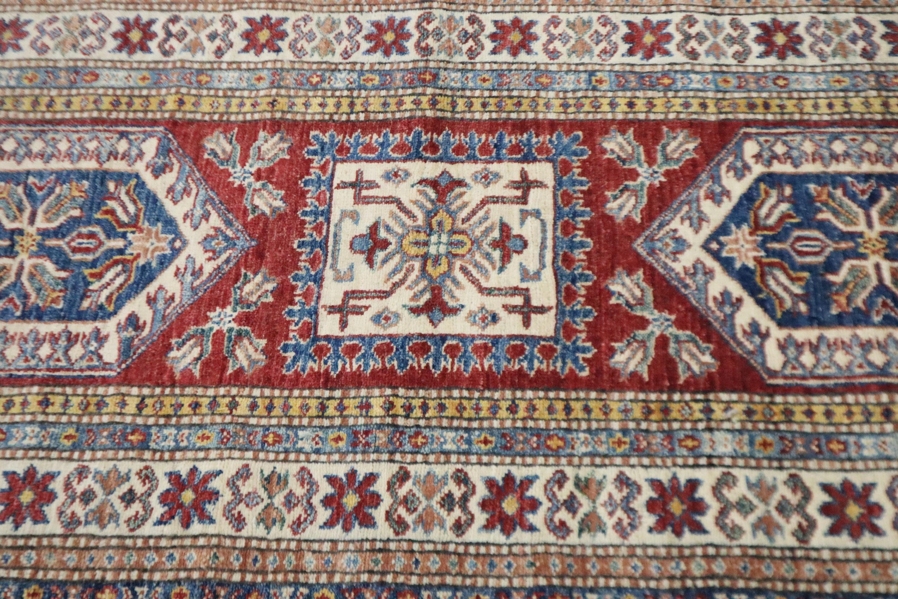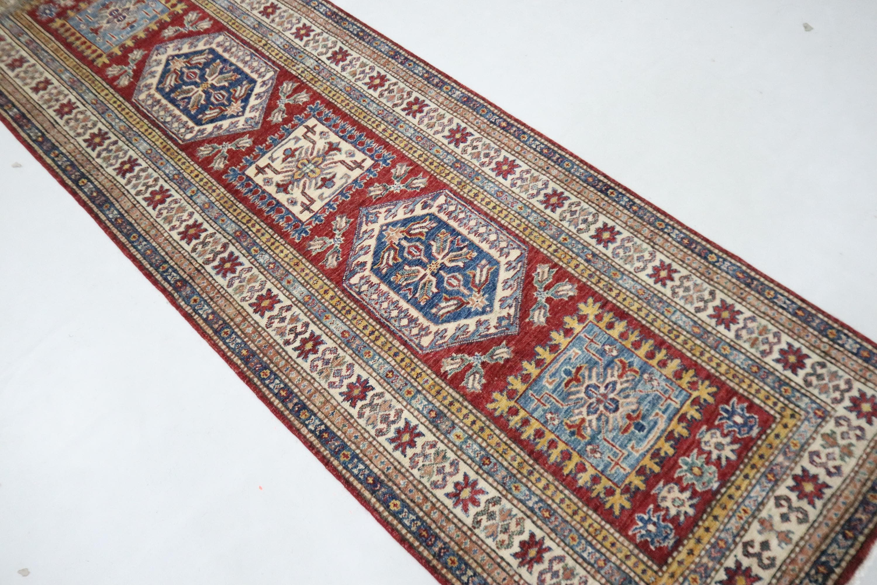8 Ft Kazak Runner Rug, Red Afghan Hand Knotted Caucasian Veg Dye Wool Runner, Geometric Runner, Entryway Runner, Hallway Runner, Runners