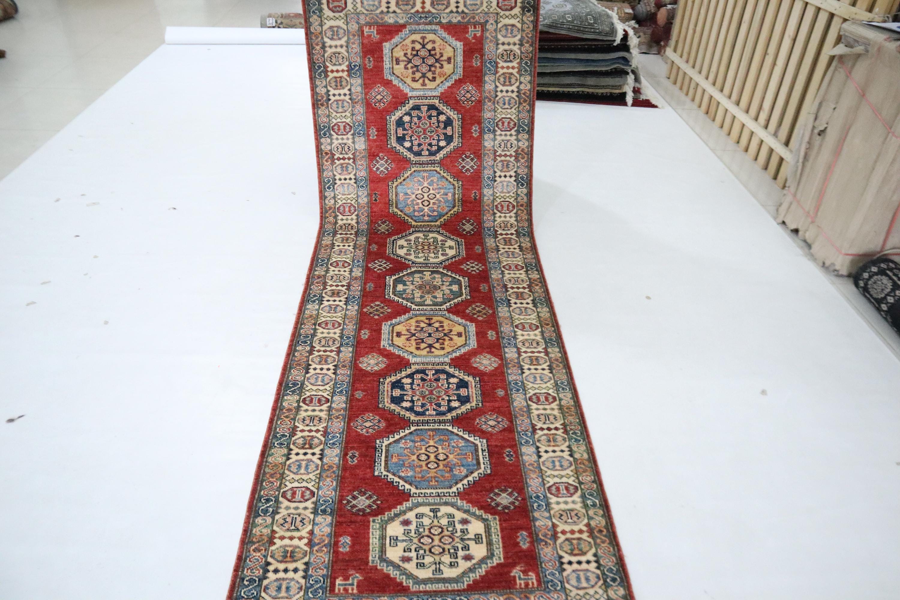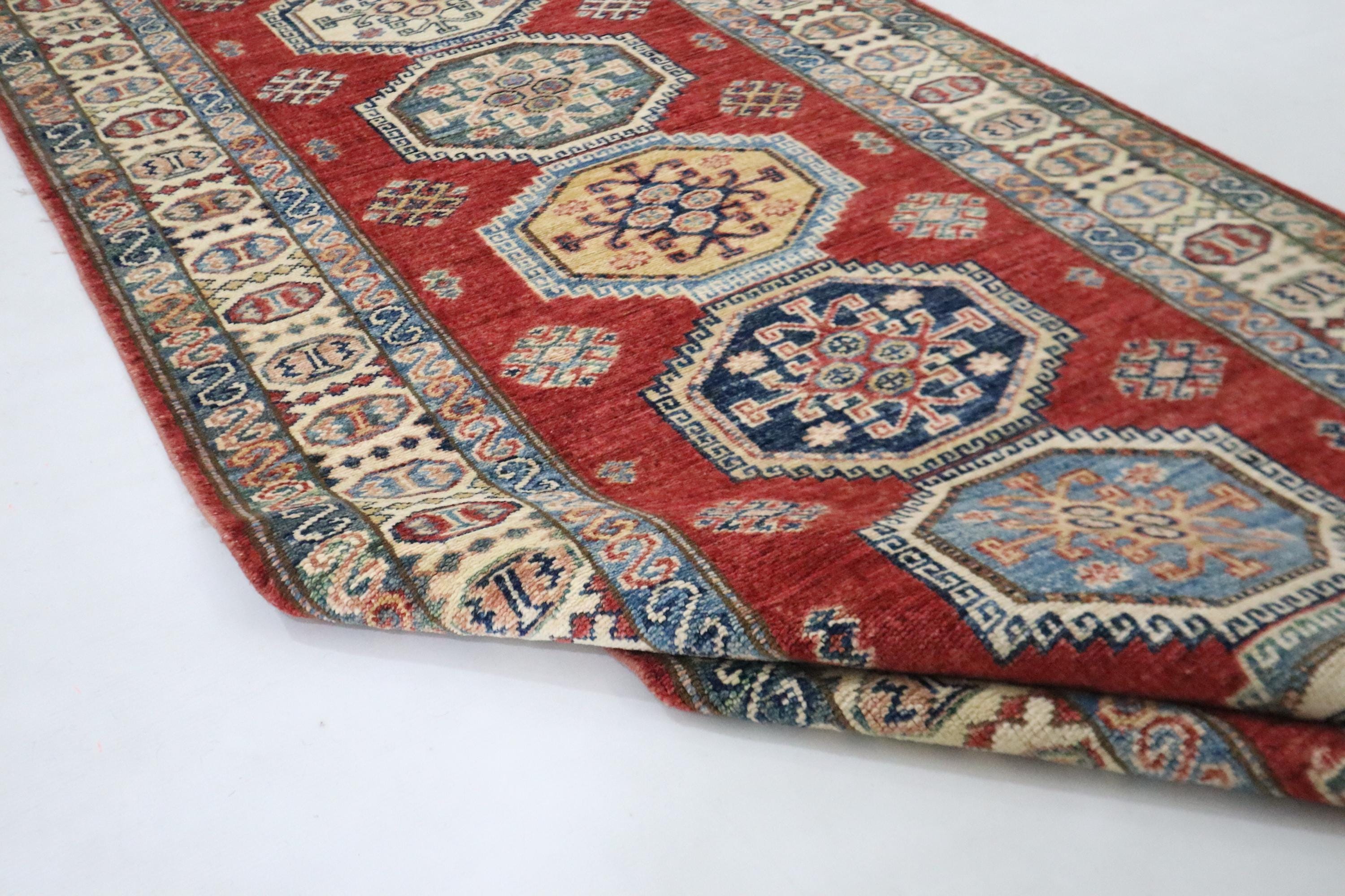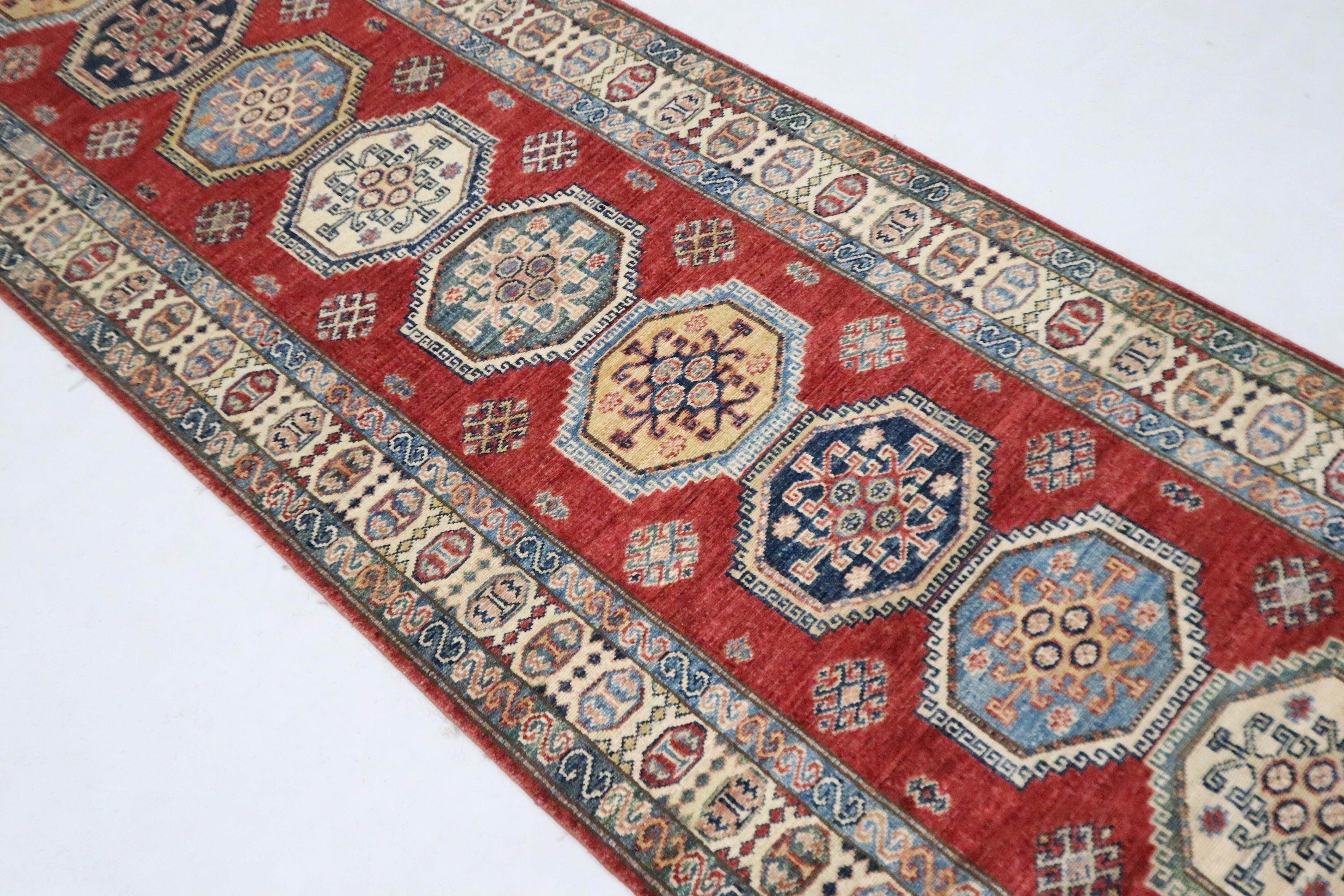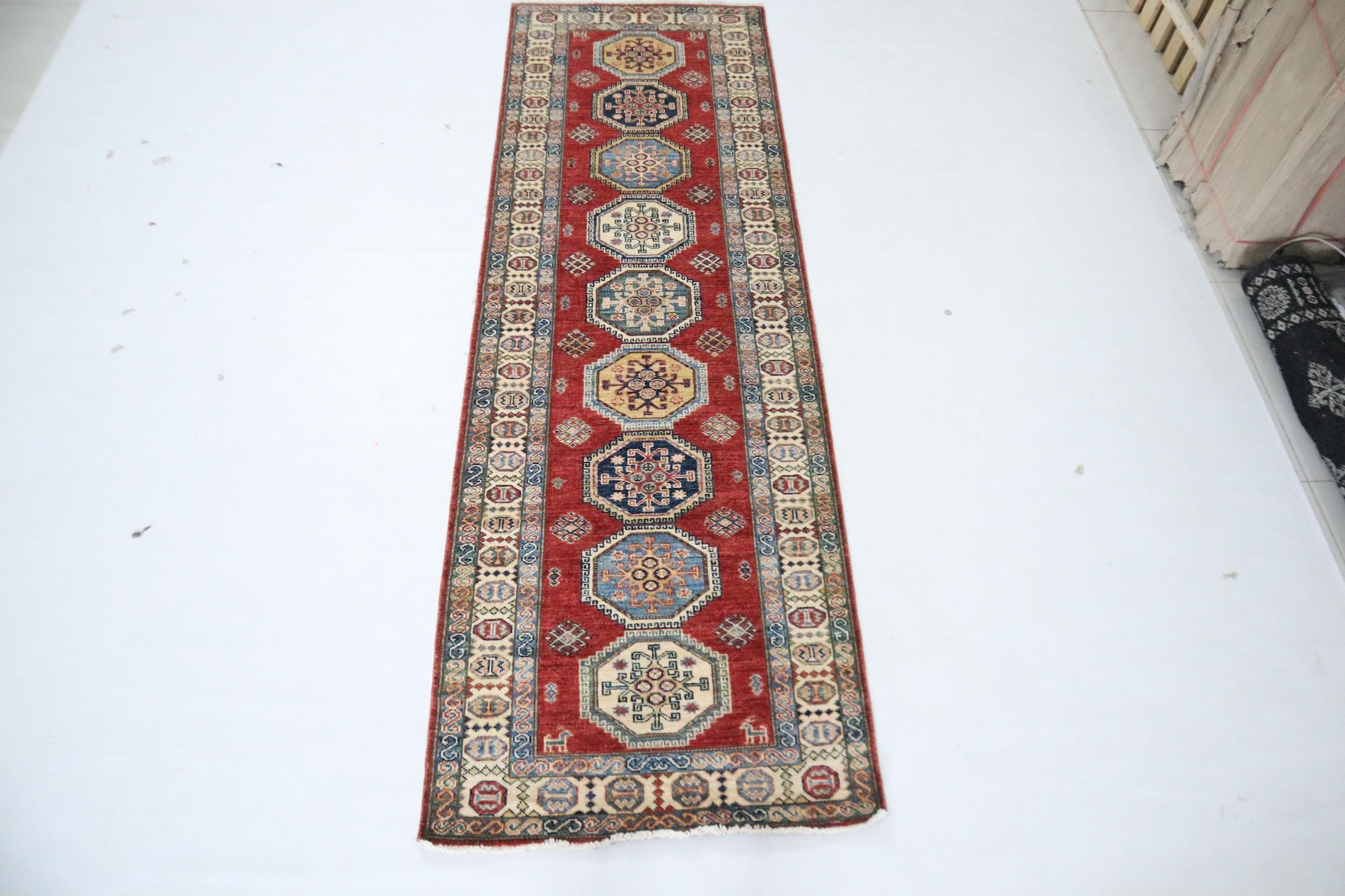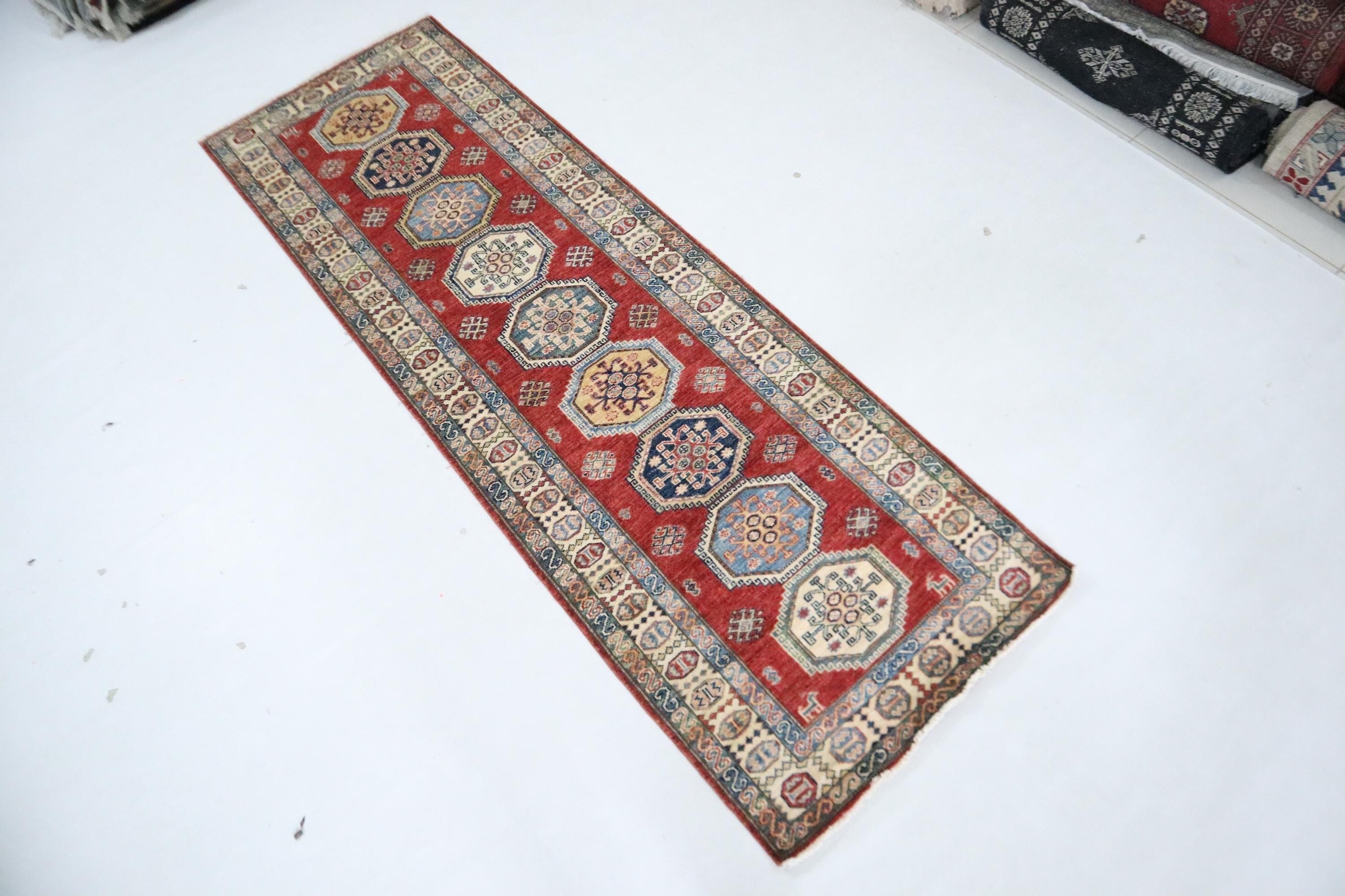 8 Ft Red Kazak Runner Rug, Afghan Hand Knotted Geometric Organic Dye Wool Runner, Caucasian Runner, Entryway Runner, Hallway Runner, Runners