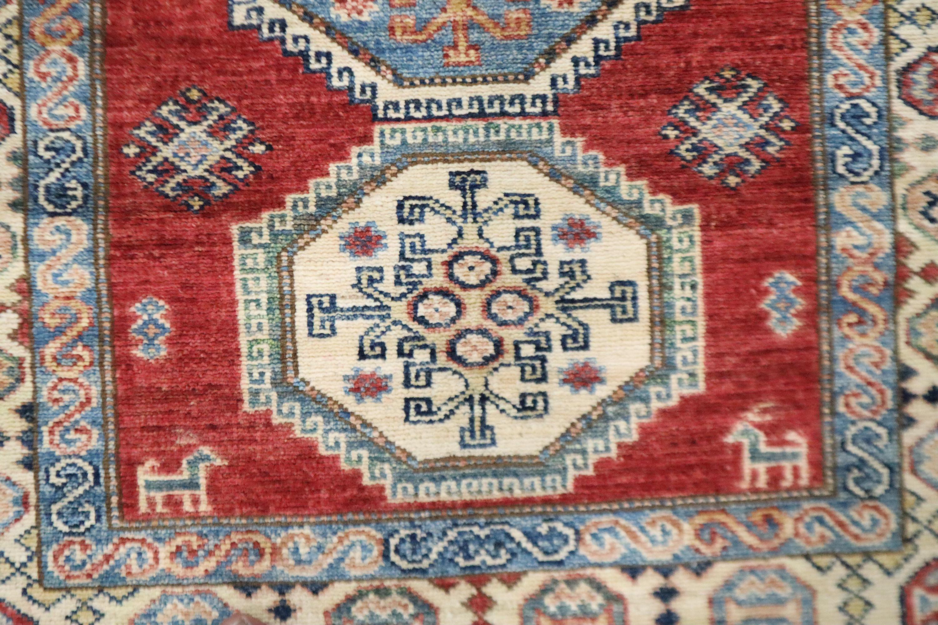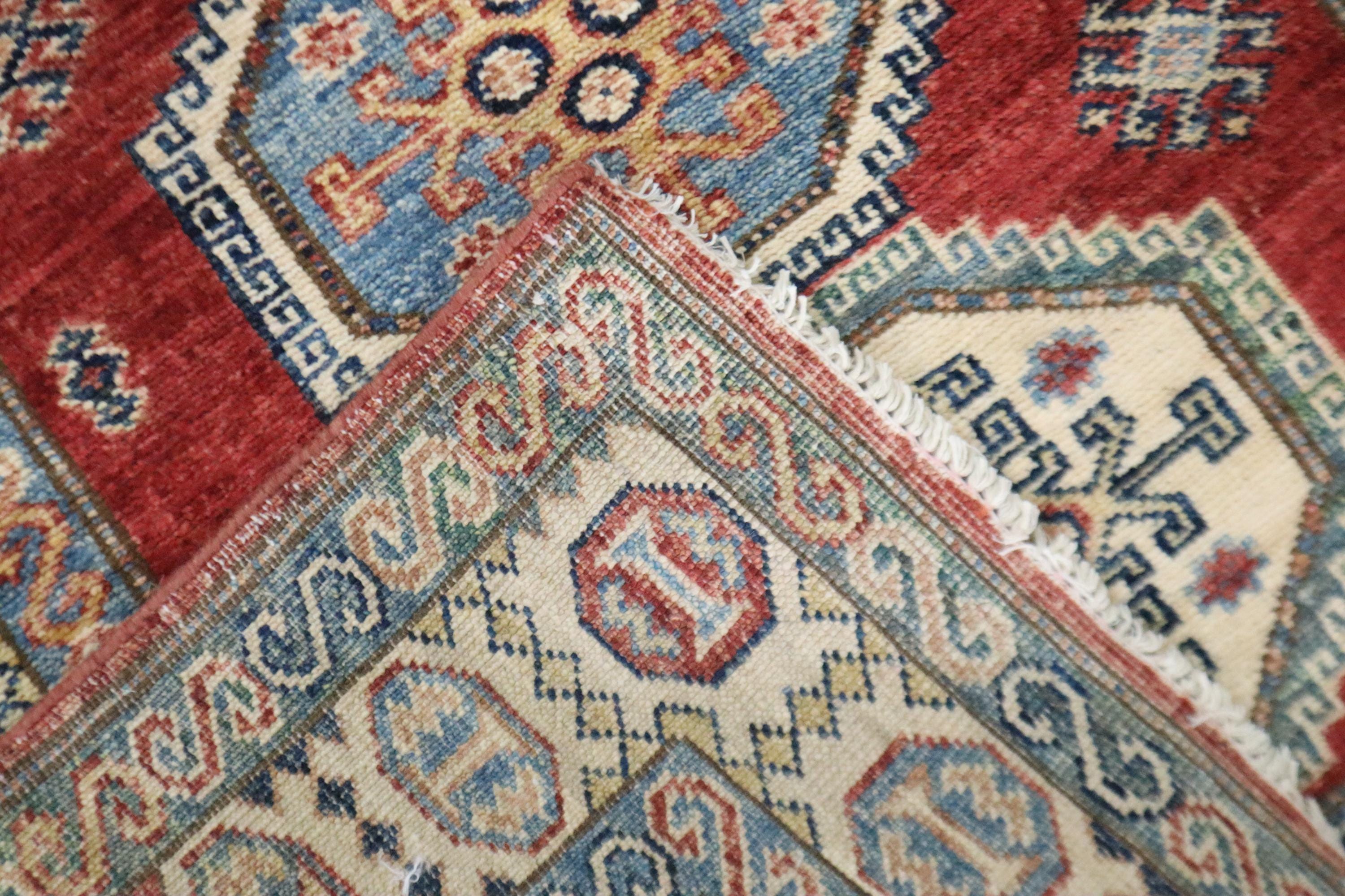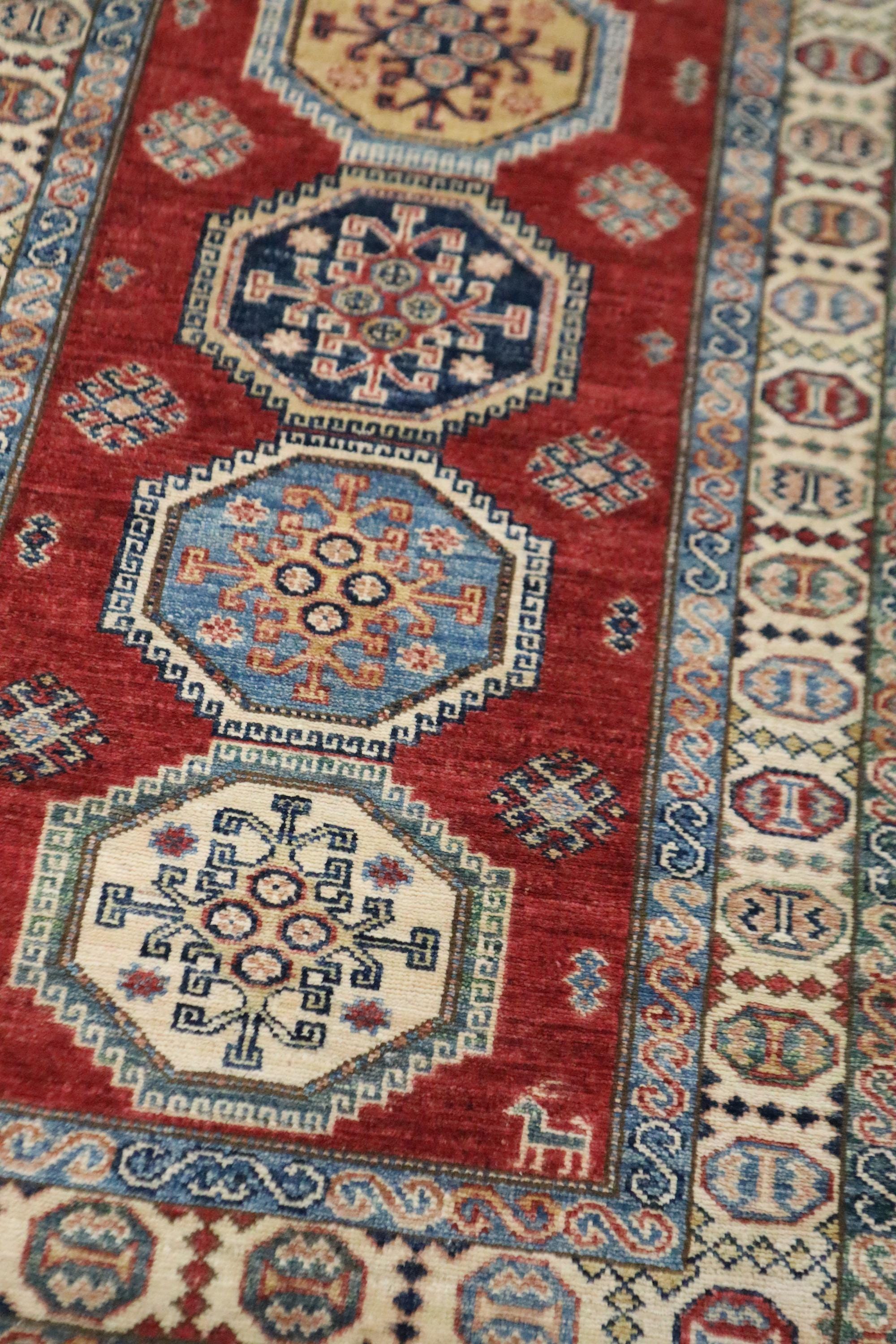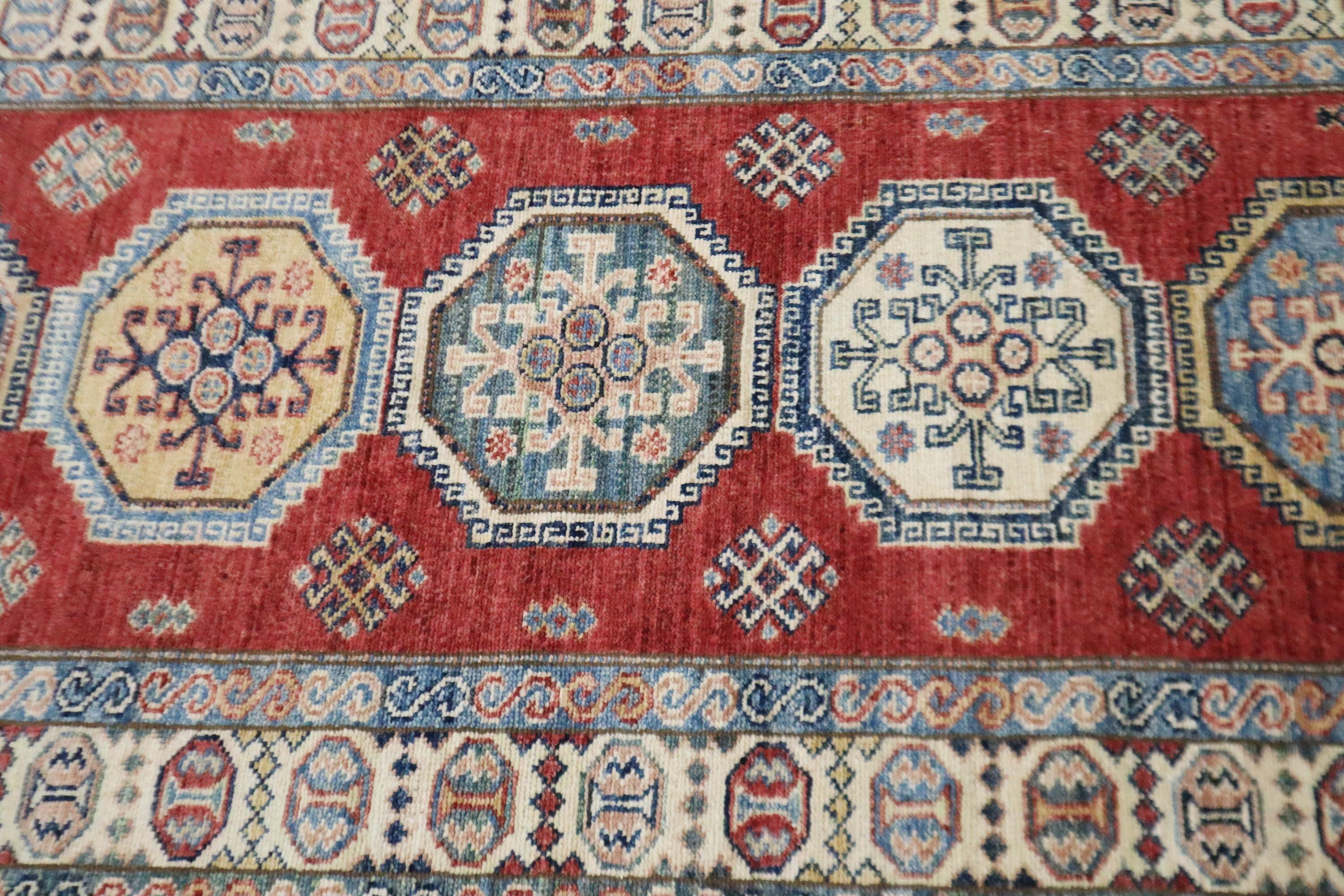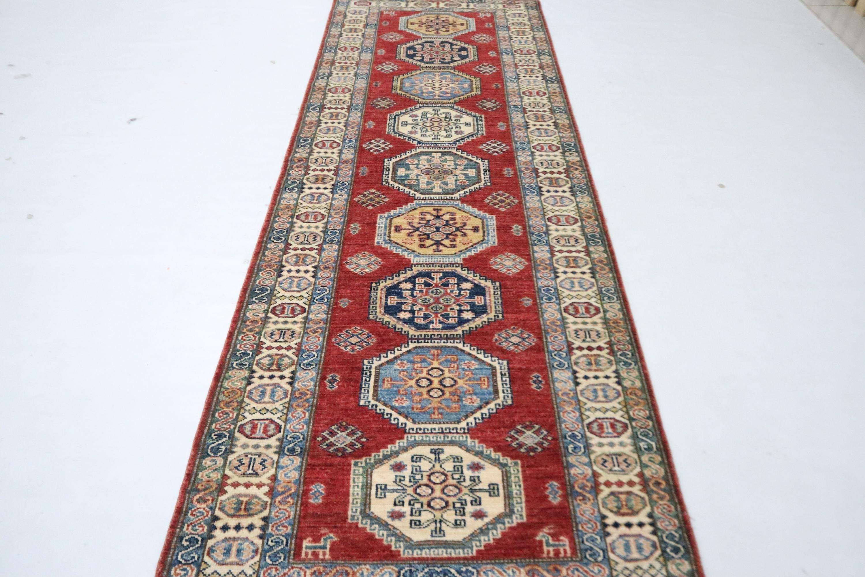 8 Ft Red Kazak Runner Rug, Afghan Hand Knotted Geometric Organic Dye Wool Runner, Caucasian Runner, Entryway Runner, Hallway Runner, Runners