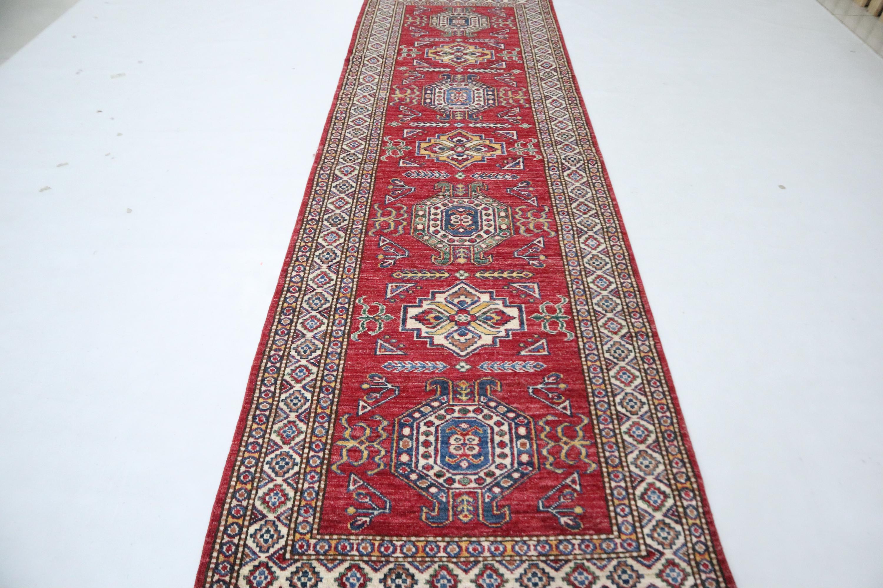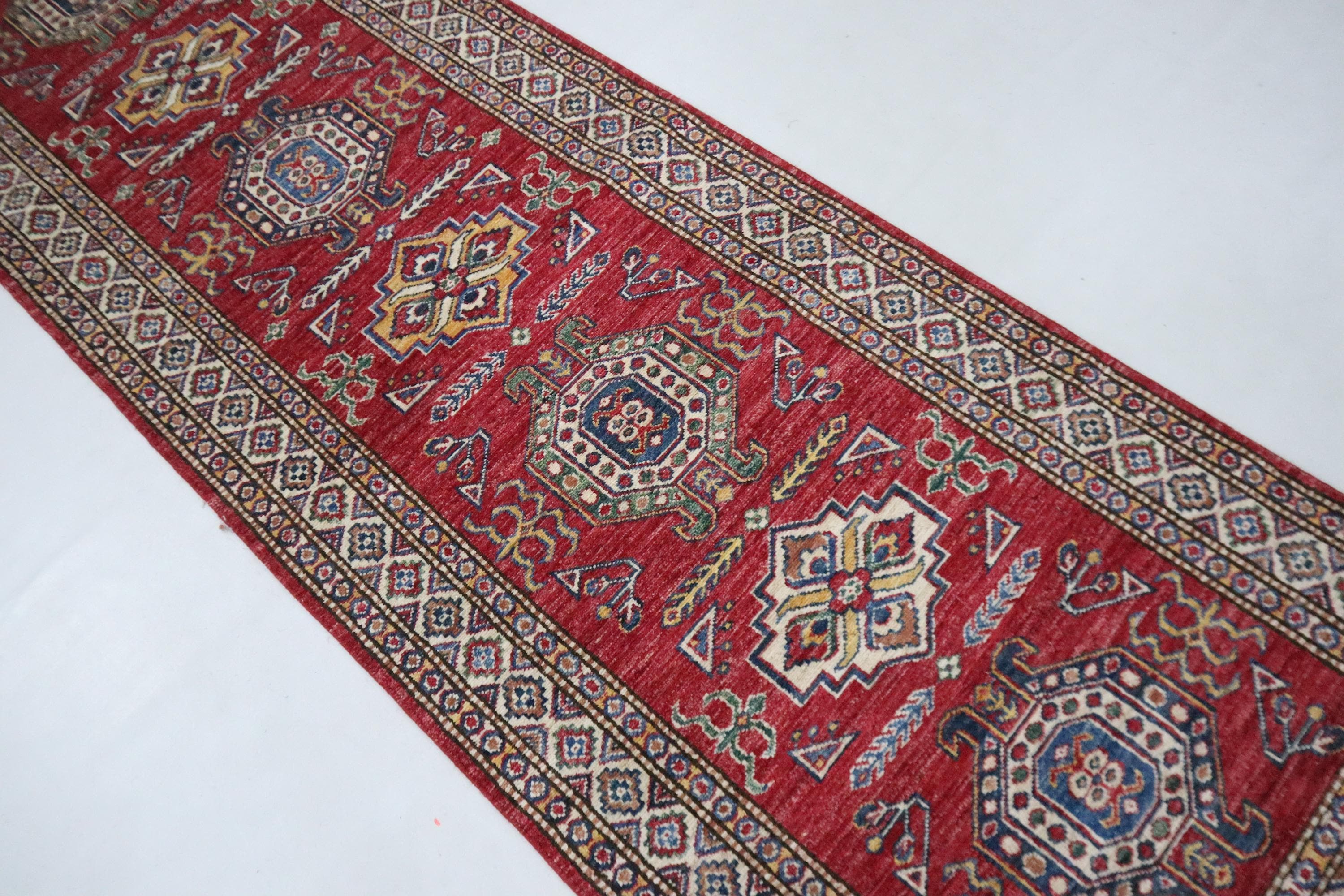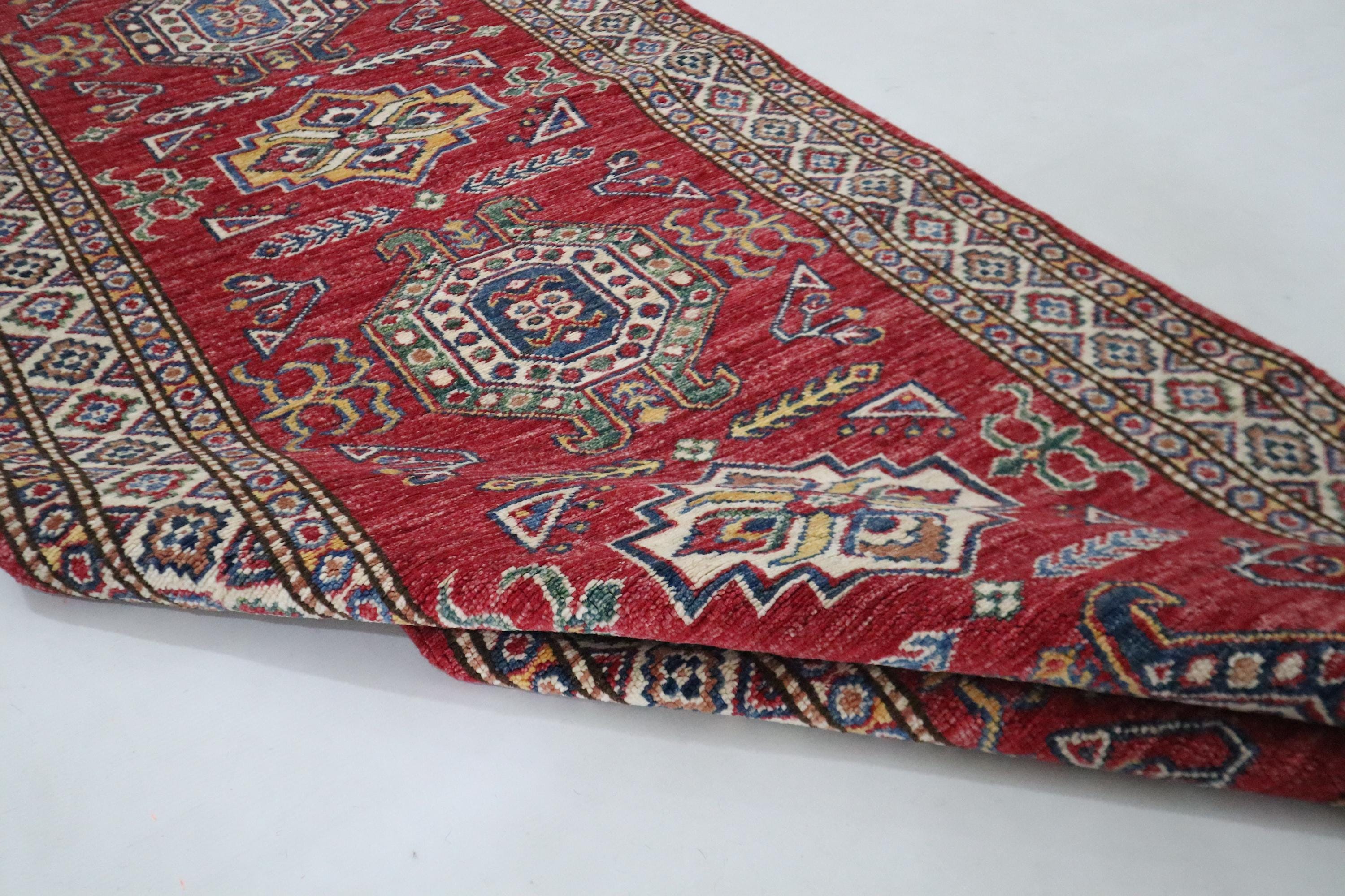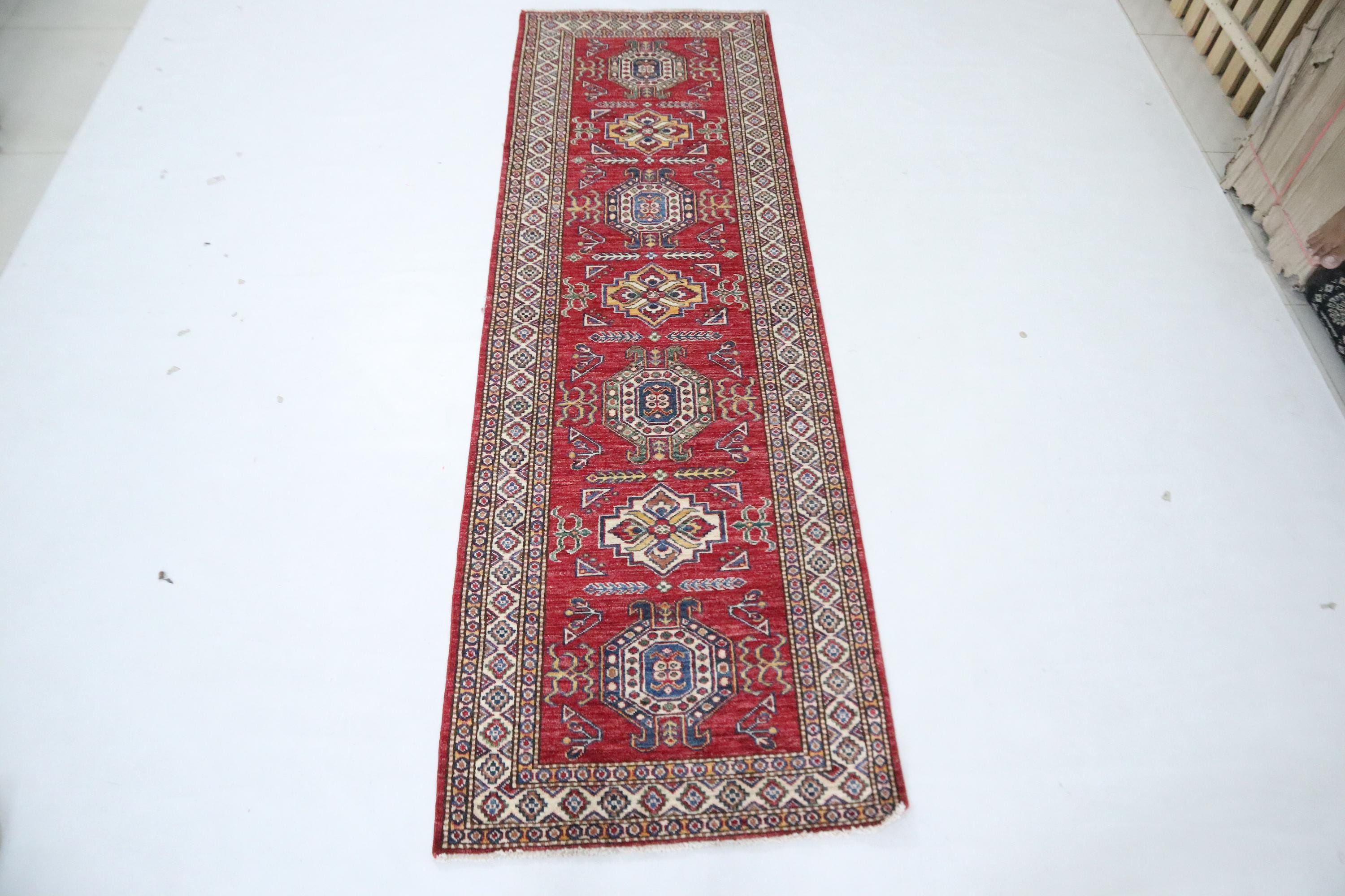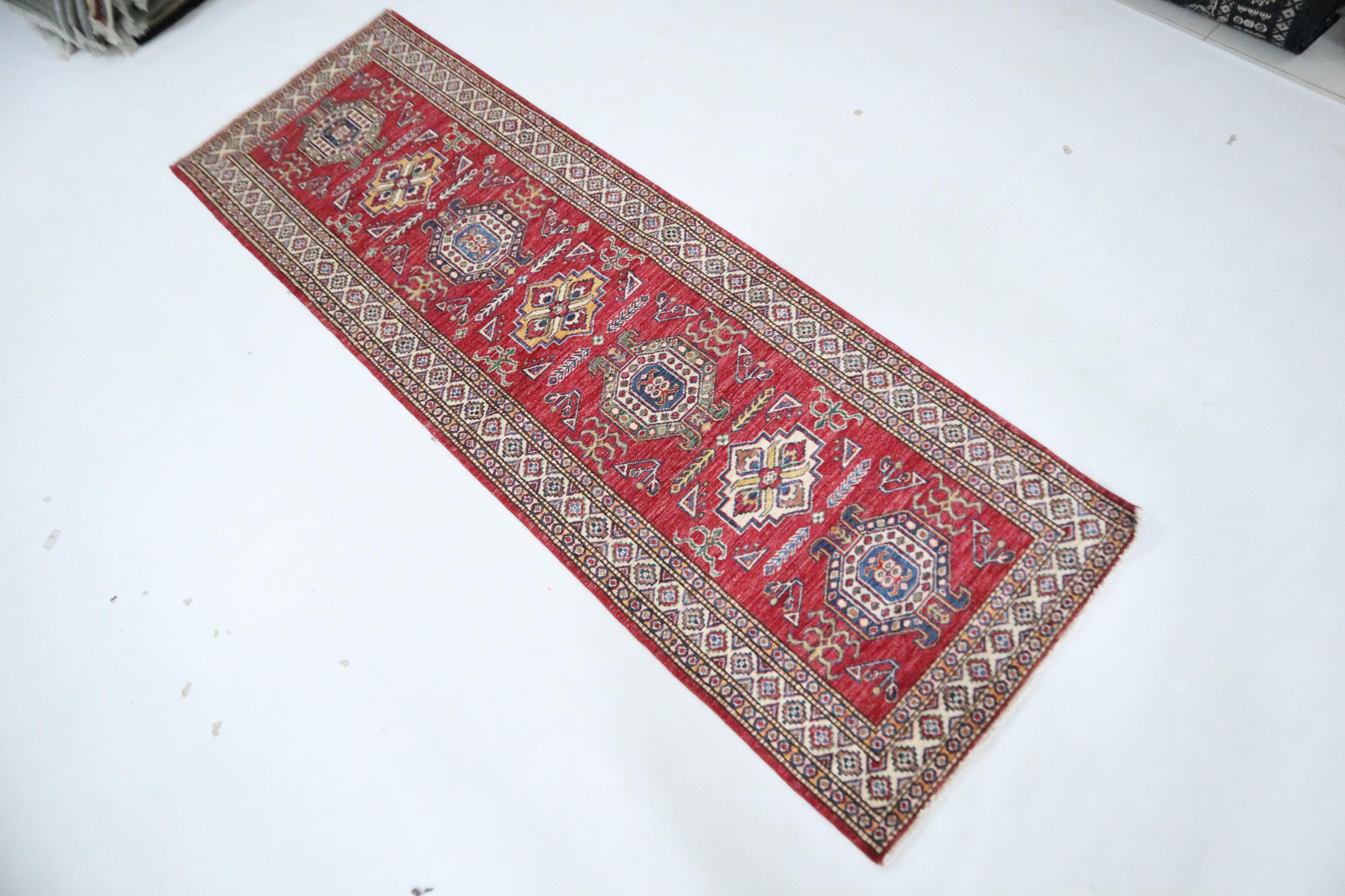 8 Ft Kazak Runner, Red Afghan Hand Knotted Caucasian Organic Wool Runner, Geometric Runner, Entryway Runner, Kitchen Runner, Hallway Runner