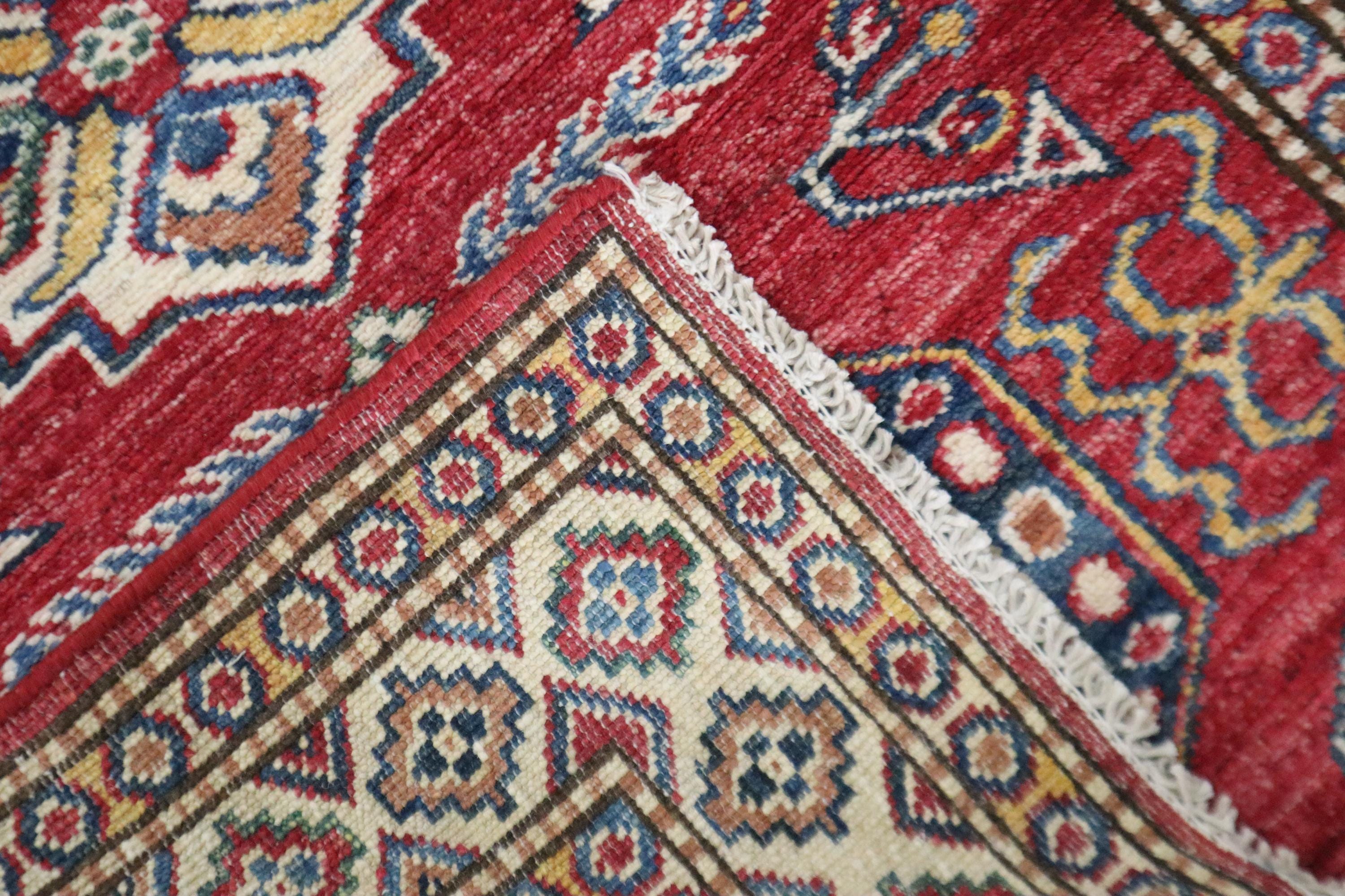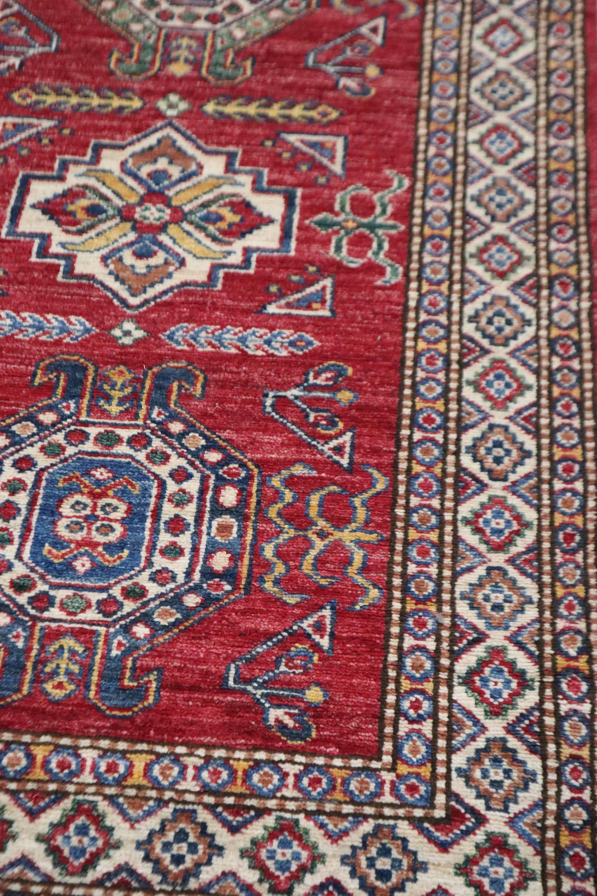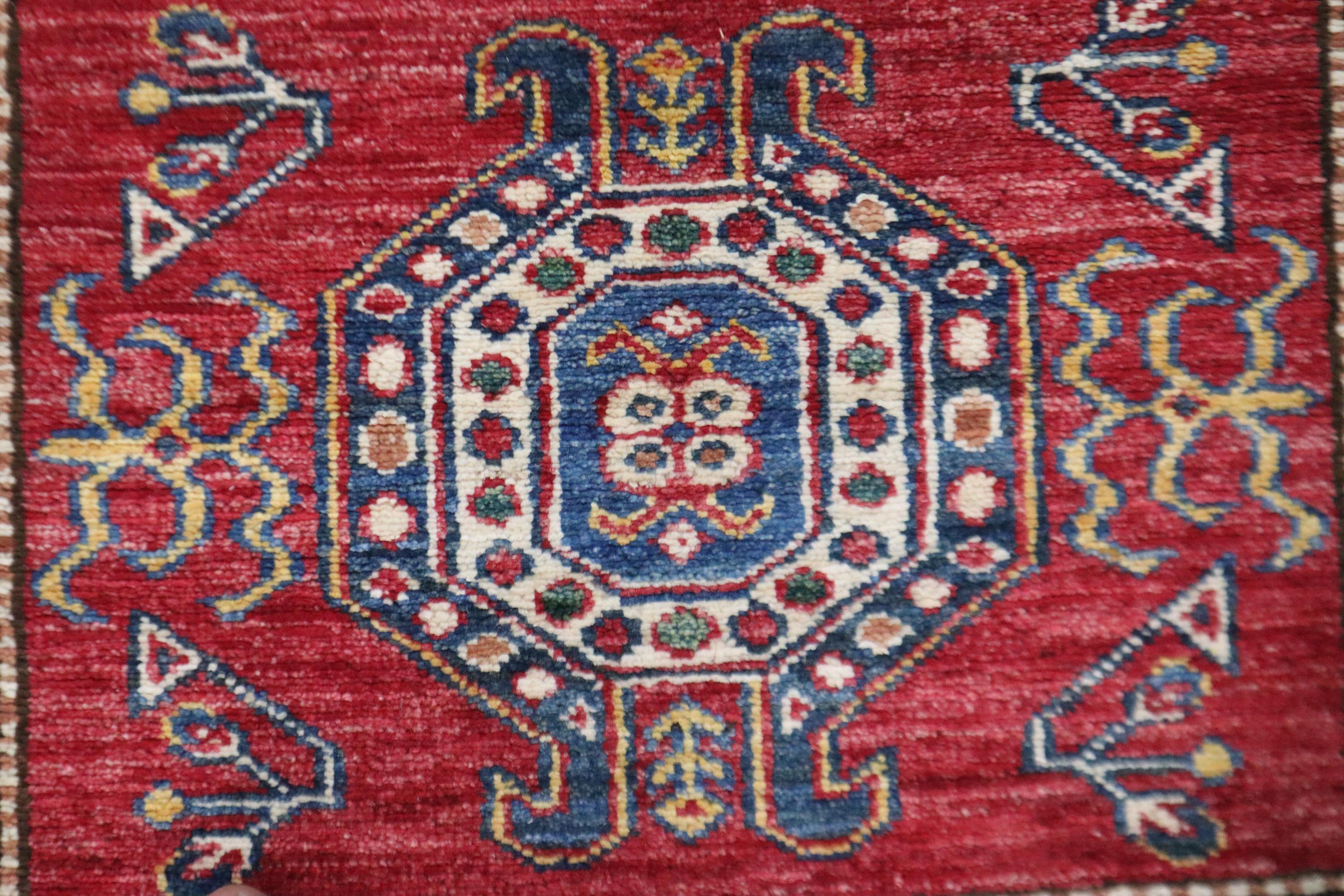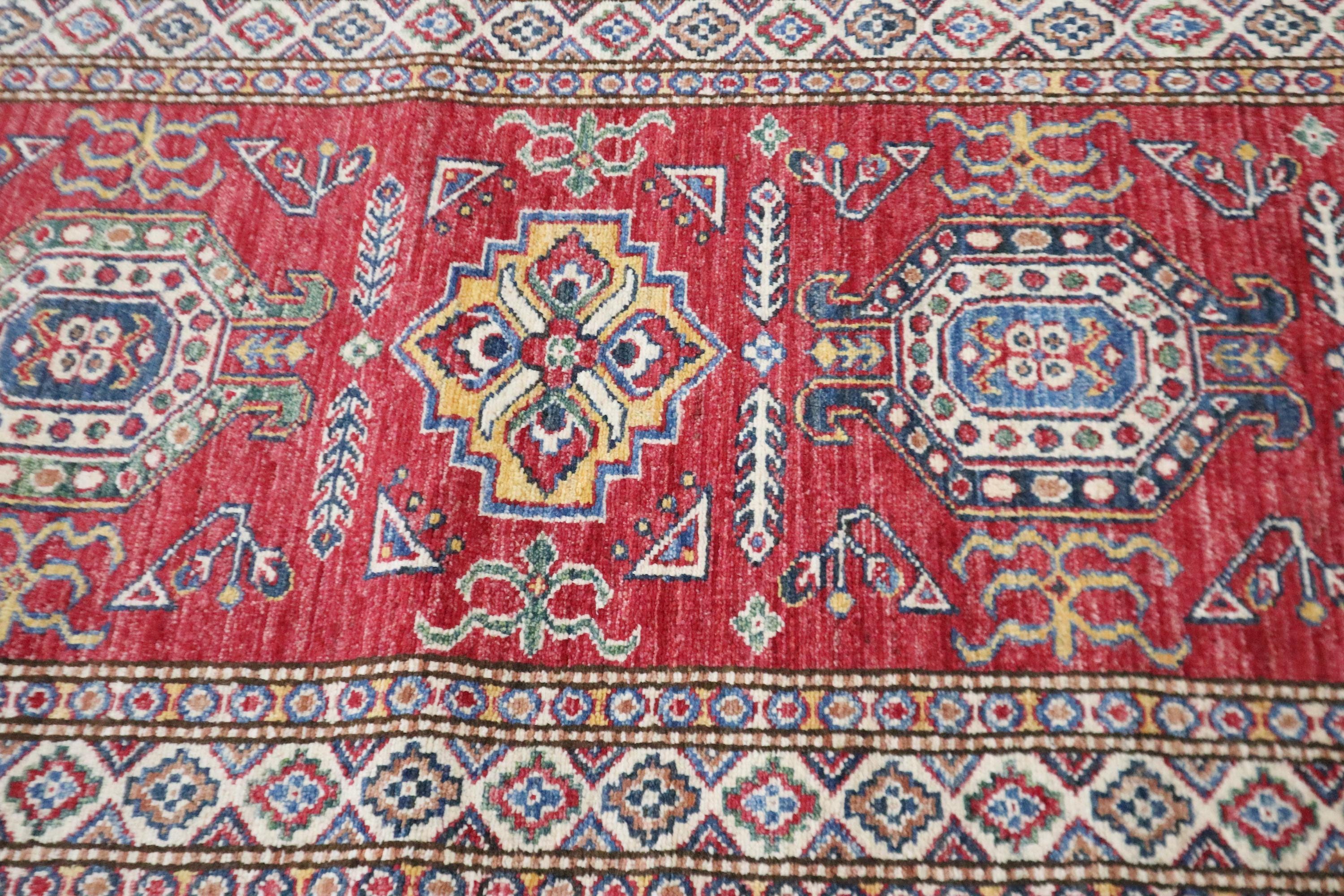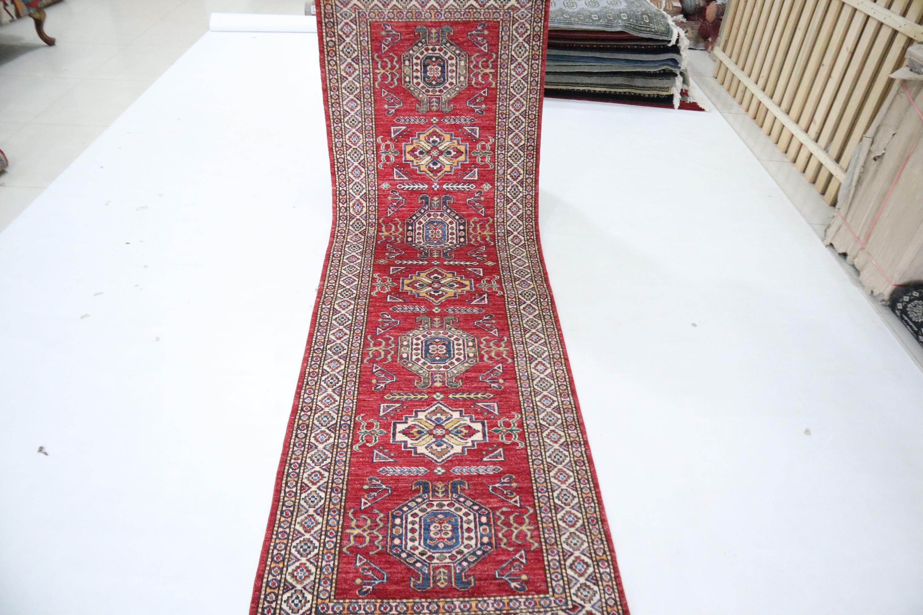 8 Ft Kazak Runner, Red Afghan Hand Knotted Caucasian Organic Wool Runner, Geometric Runner, Entryway Runner, Kitchen Runner, Hallway Runner